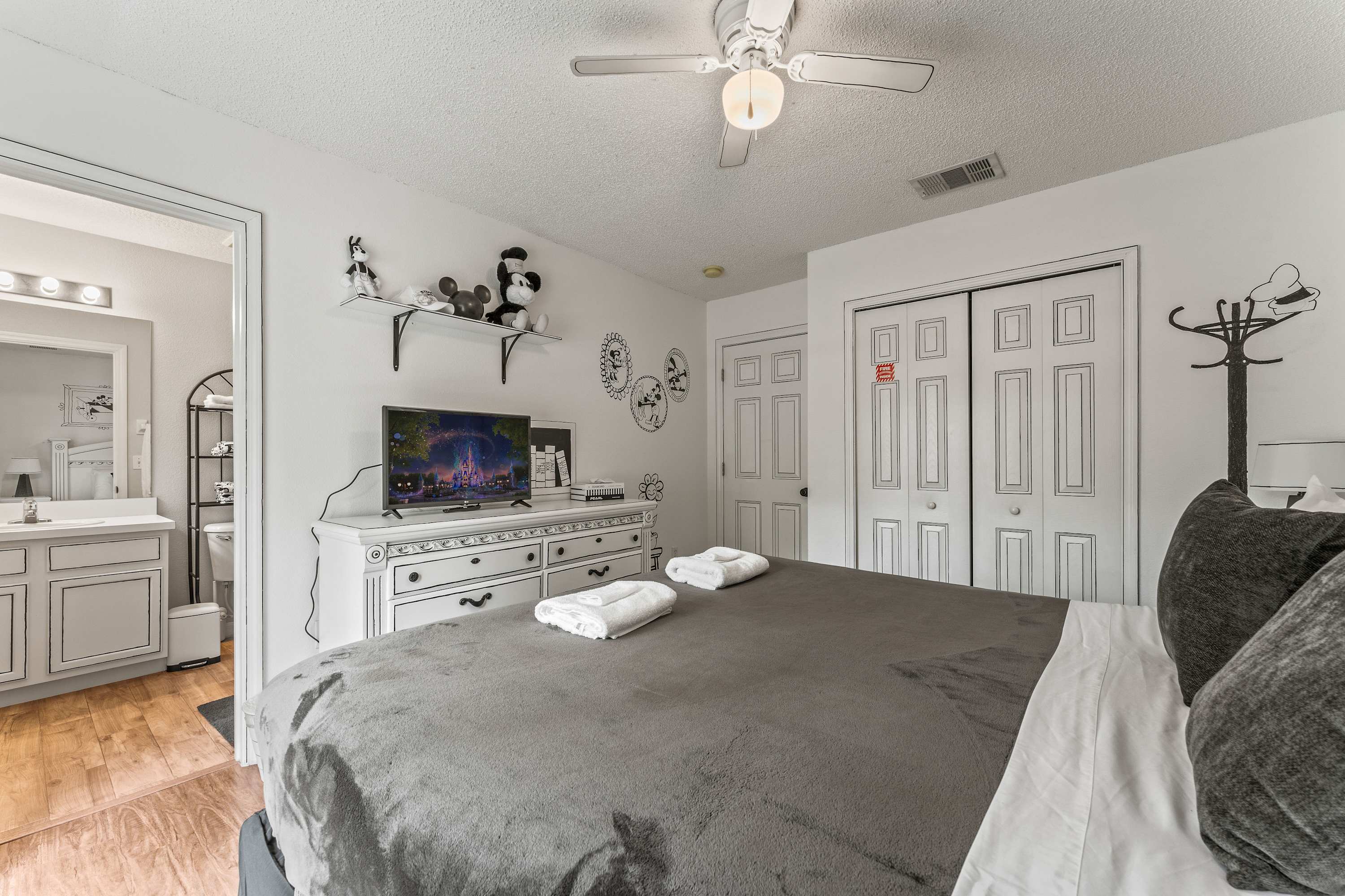 Bedroom #3 is Mickey Mouse themed and includes a king size bed, a smart TV, double doors leading to a balcony with a small table for 3, and an ensuite bathroom with a single vanity and a walk-in shower.