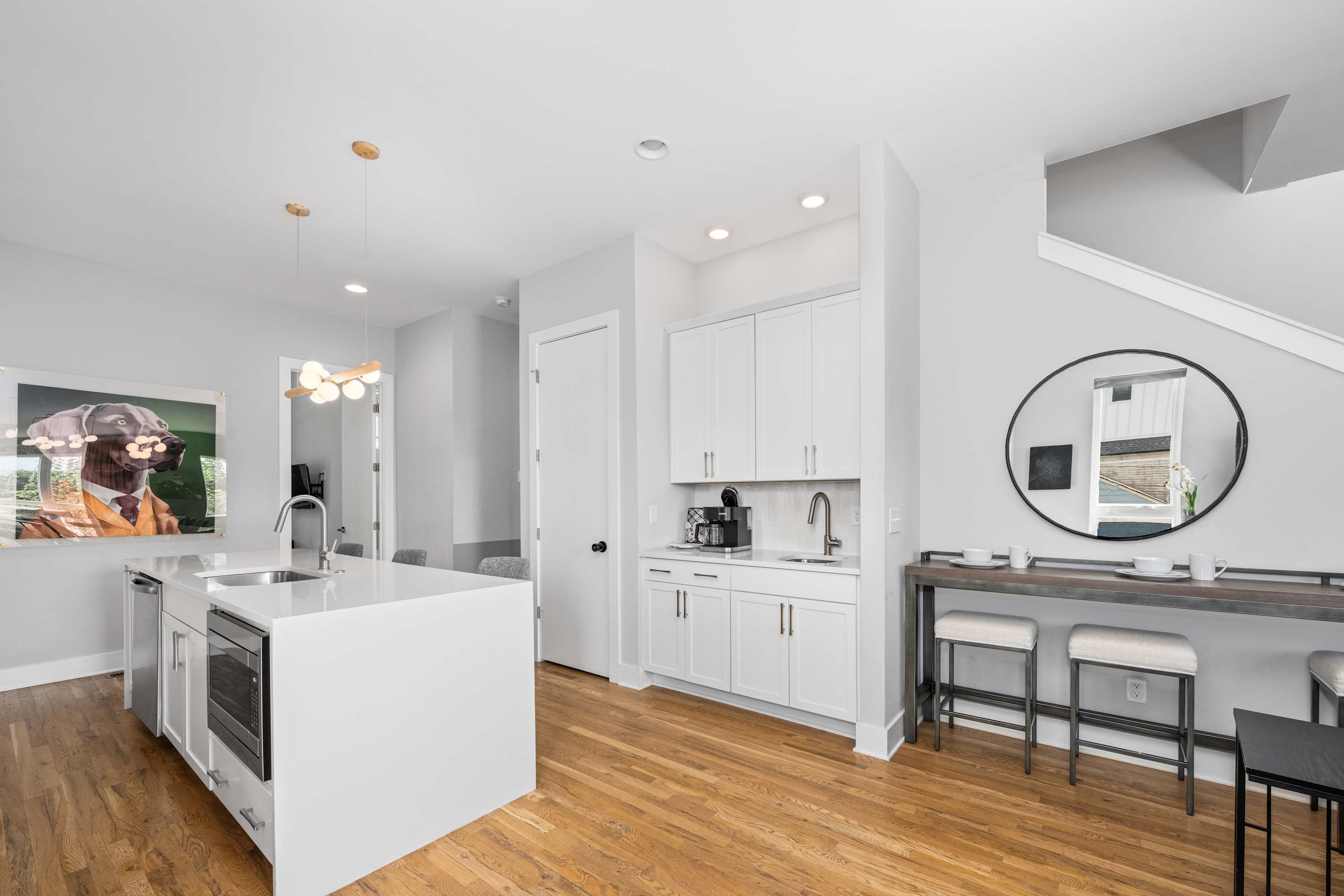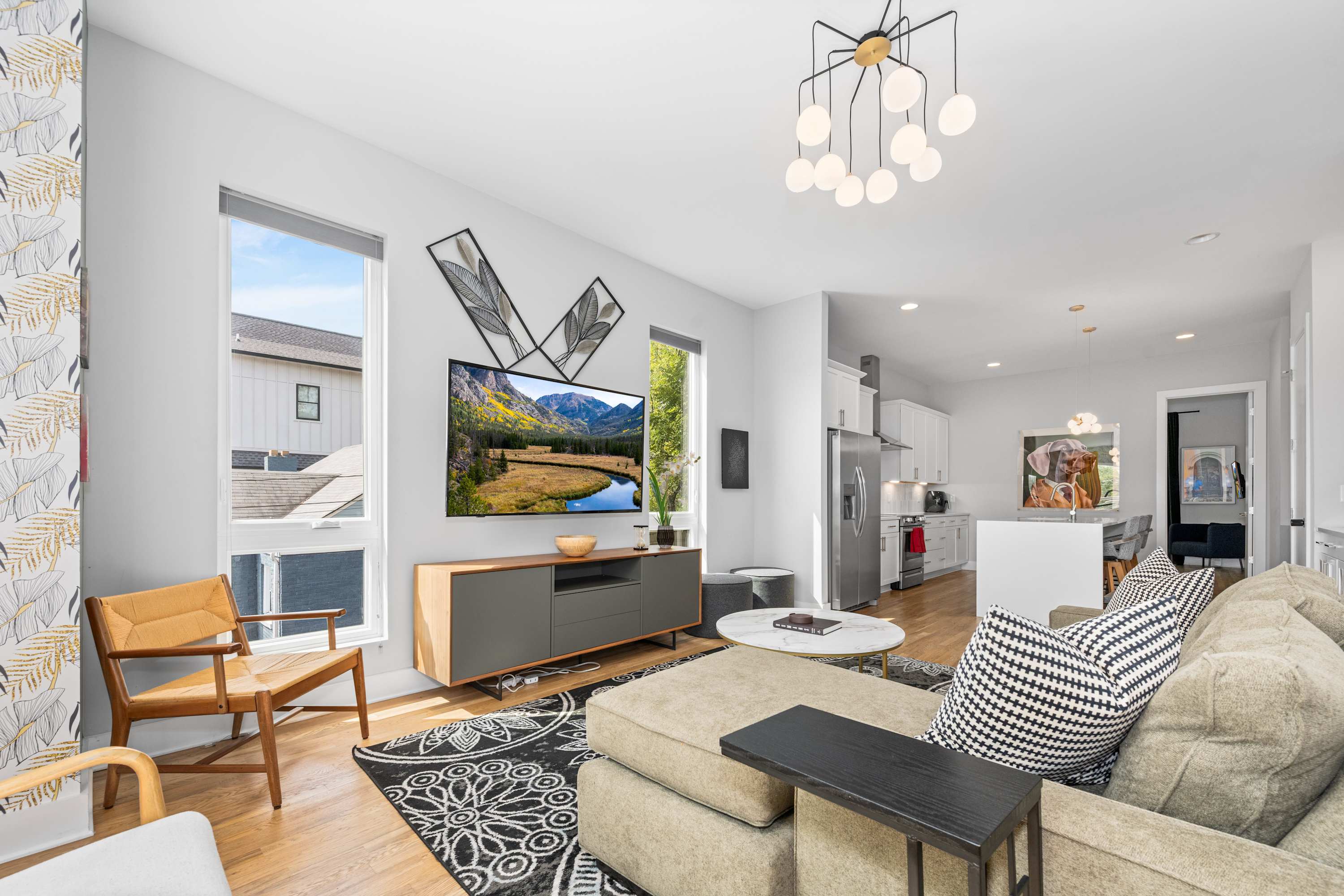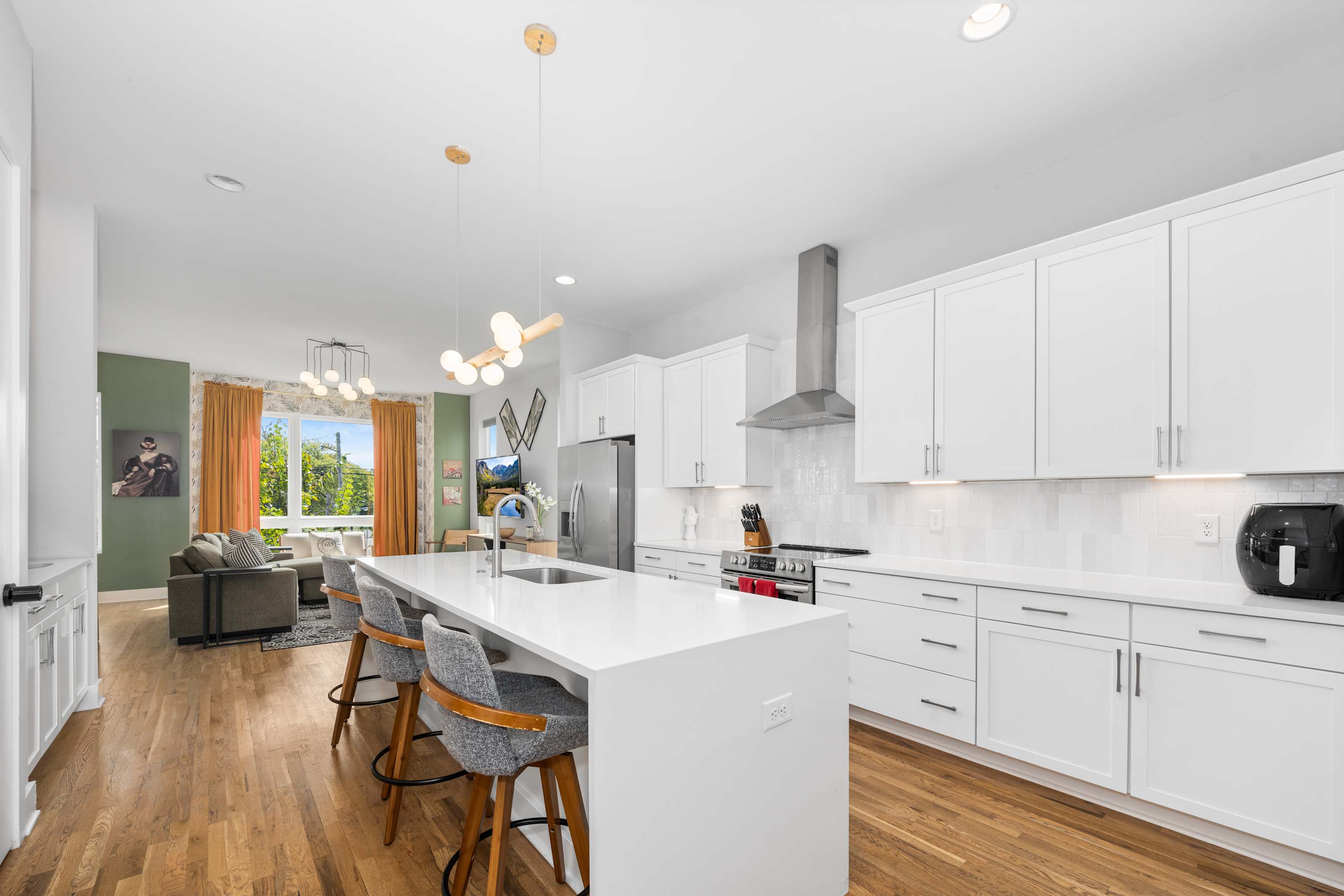 Whip up anything from brunch to late-night snacks in the fully stocked kitchen with stainless steel appliances, stone countertops, and a breakfast bar. The open-concept living area features designer furnishings and a Smart TV—perfect for relaxing after a day out in Nashville.