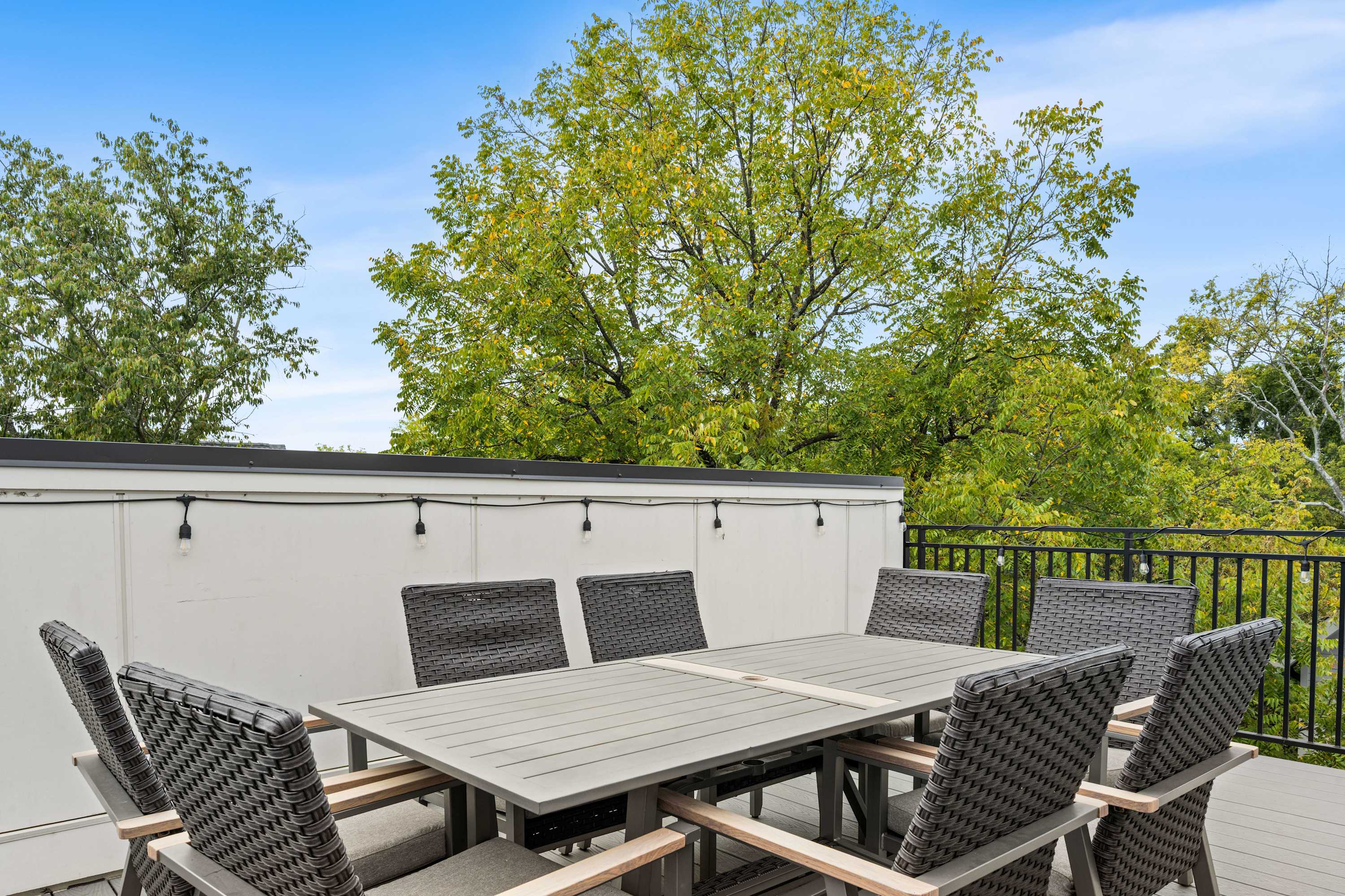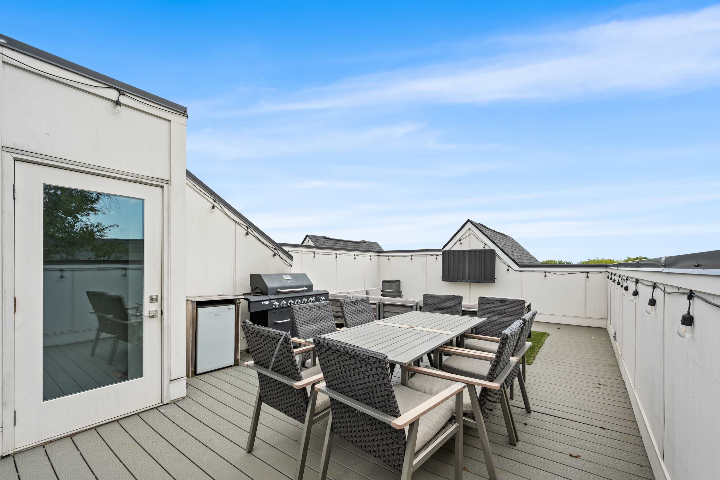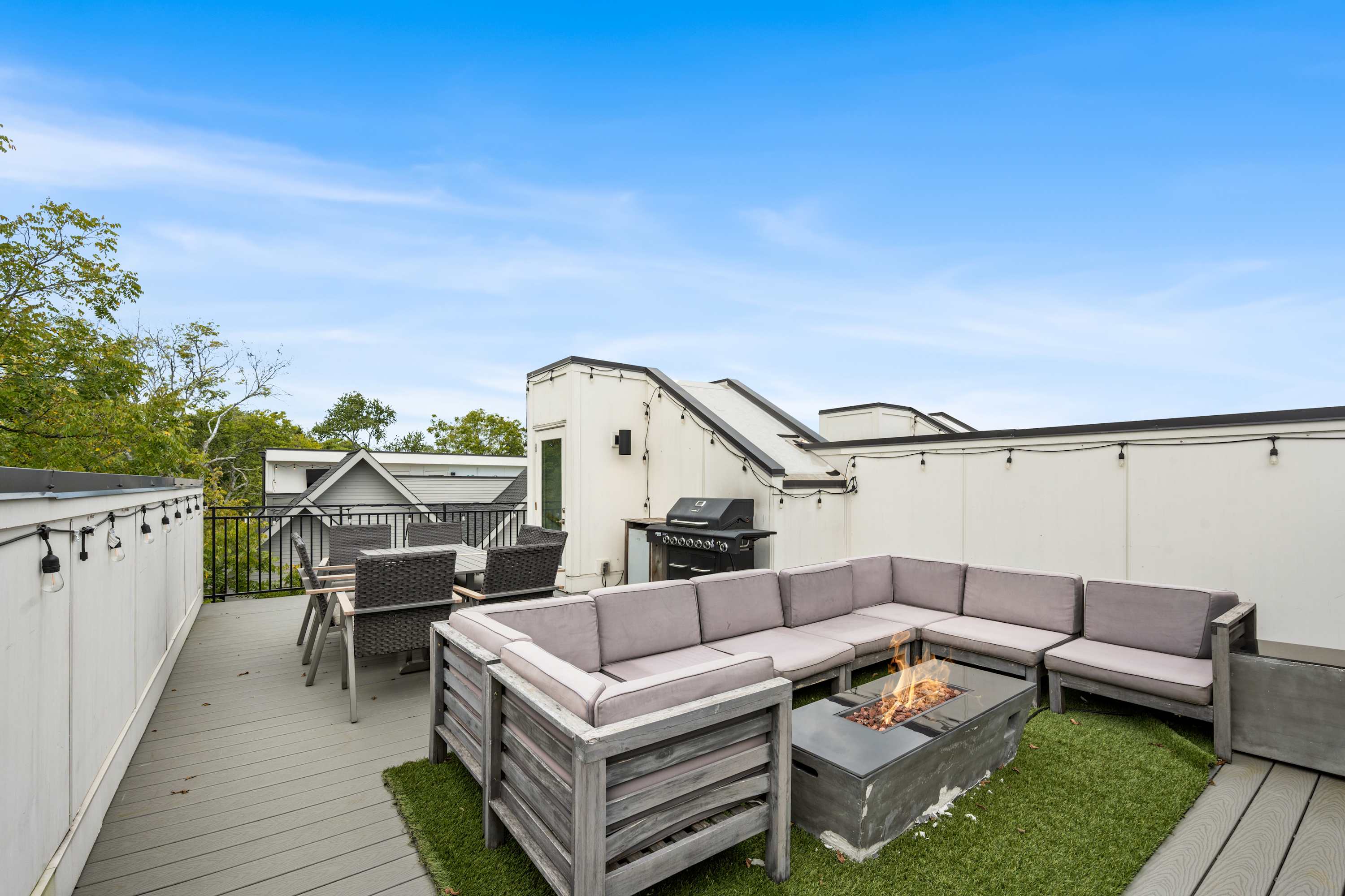 Head up to the private rooftop deck, your go-to hangout spot with skyline views. Grill out, dine under bistro lights, stream the game on the outdoor Smart TV, or gather around the cozy fire pit.