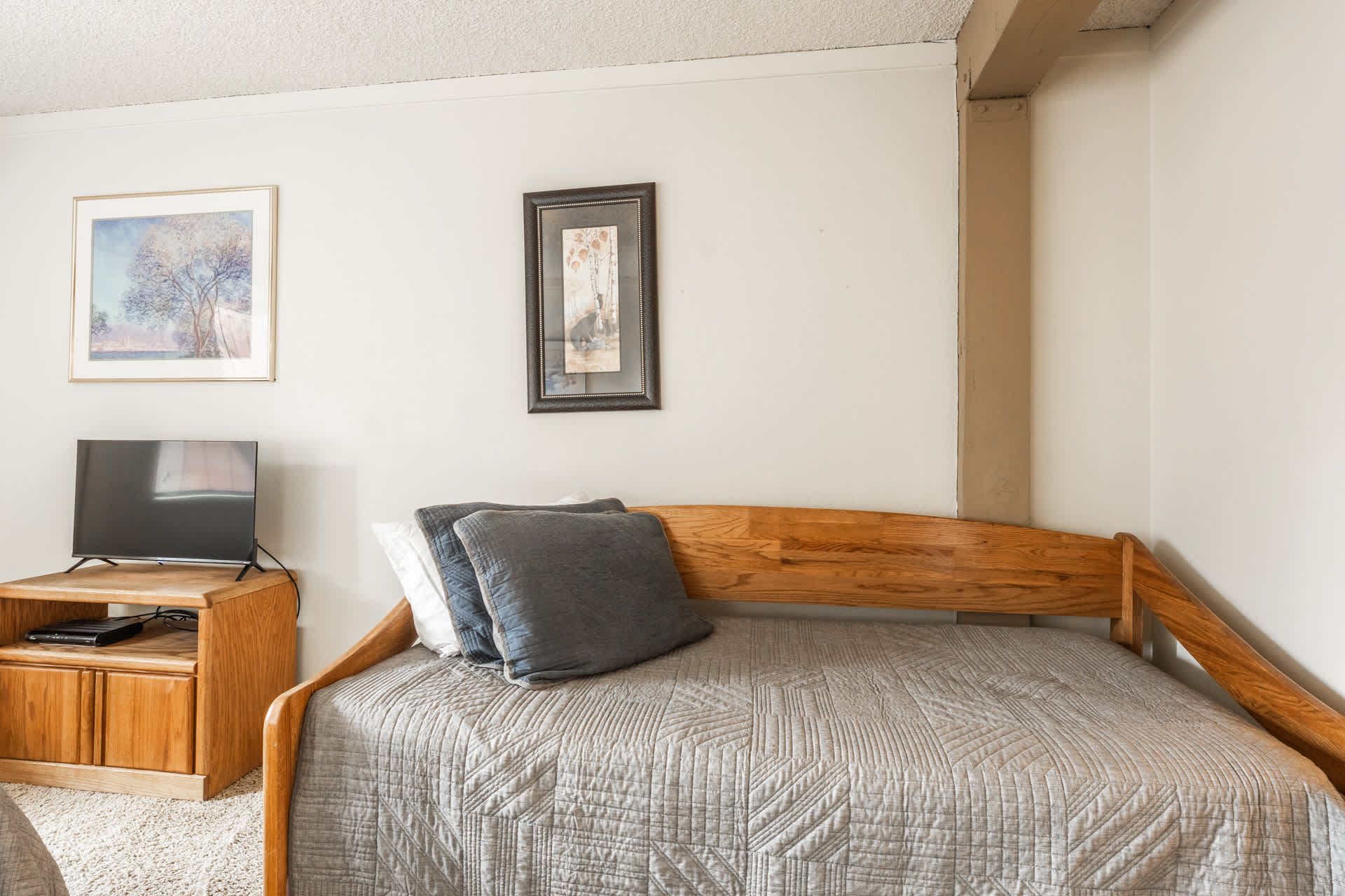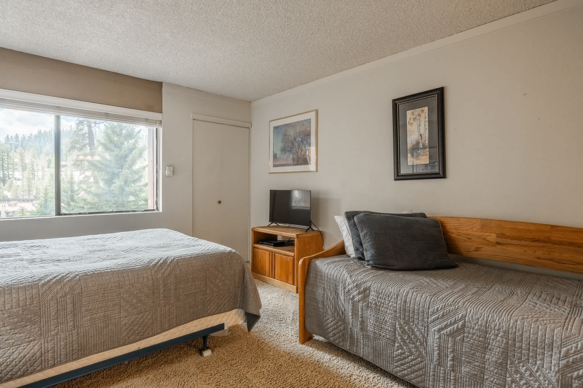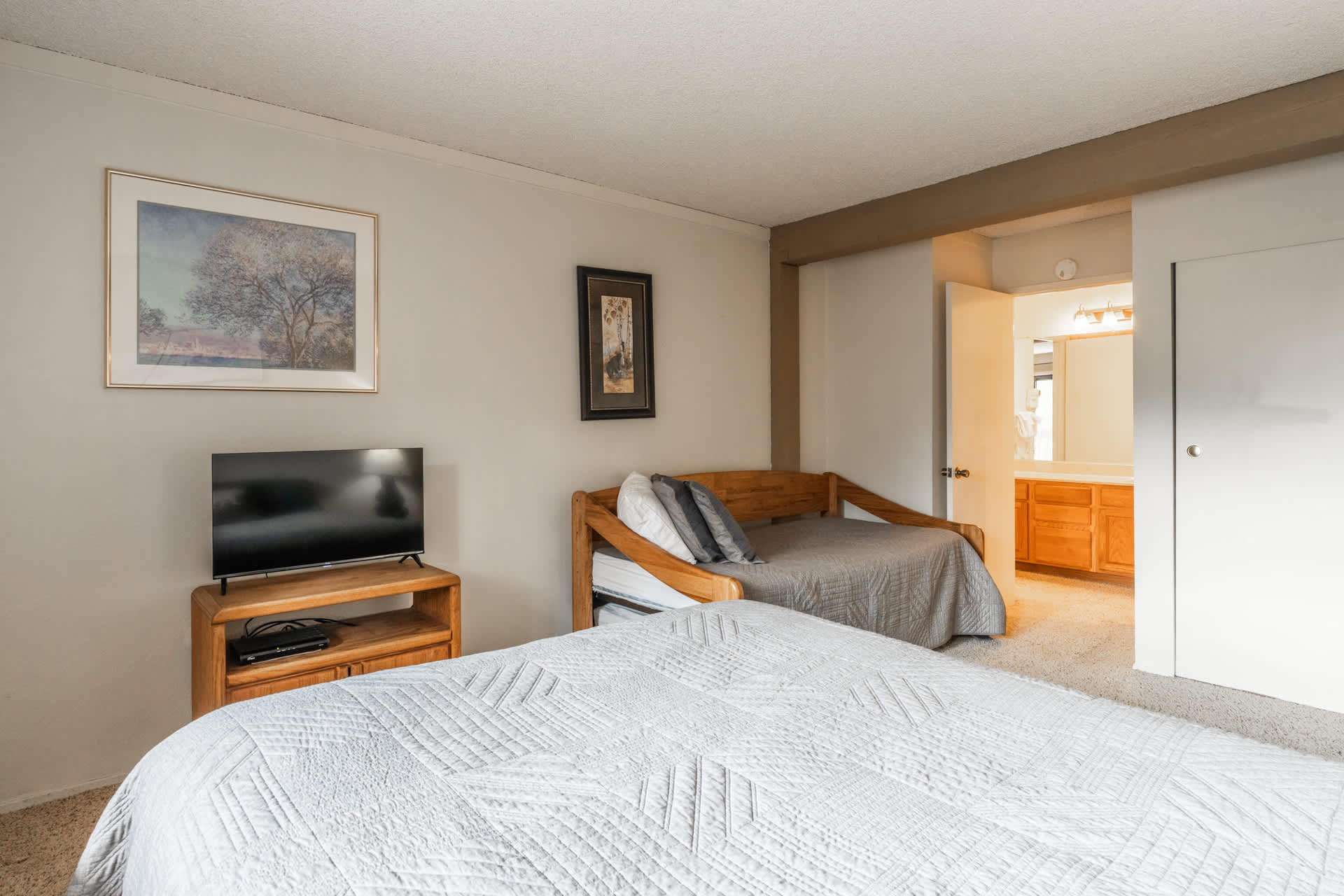 • Bedroom 2: Queen bed + twin daybed with twin trundle (sleeps up to 4); smart TV; ensuite bathroom with shower/tub combo