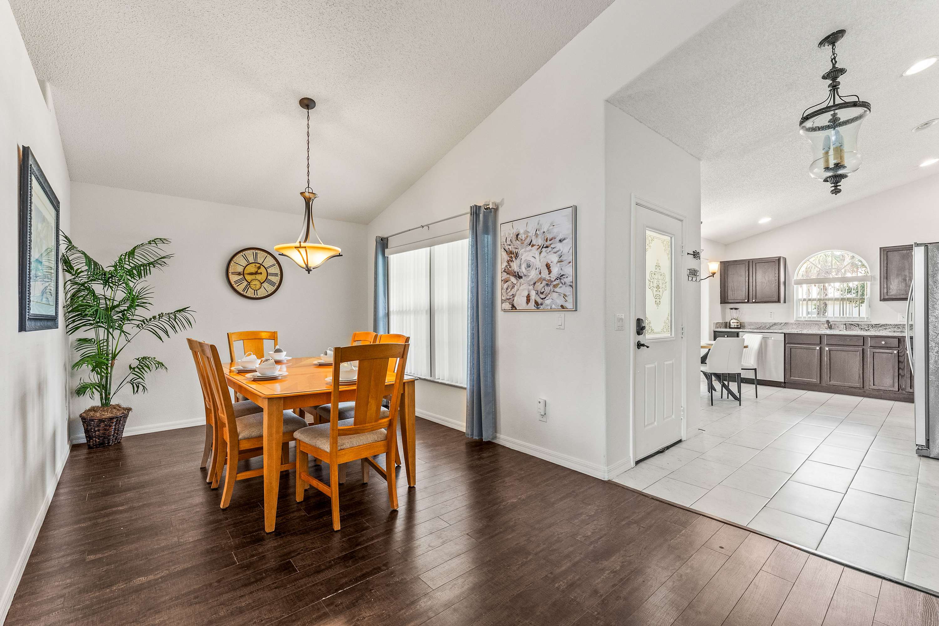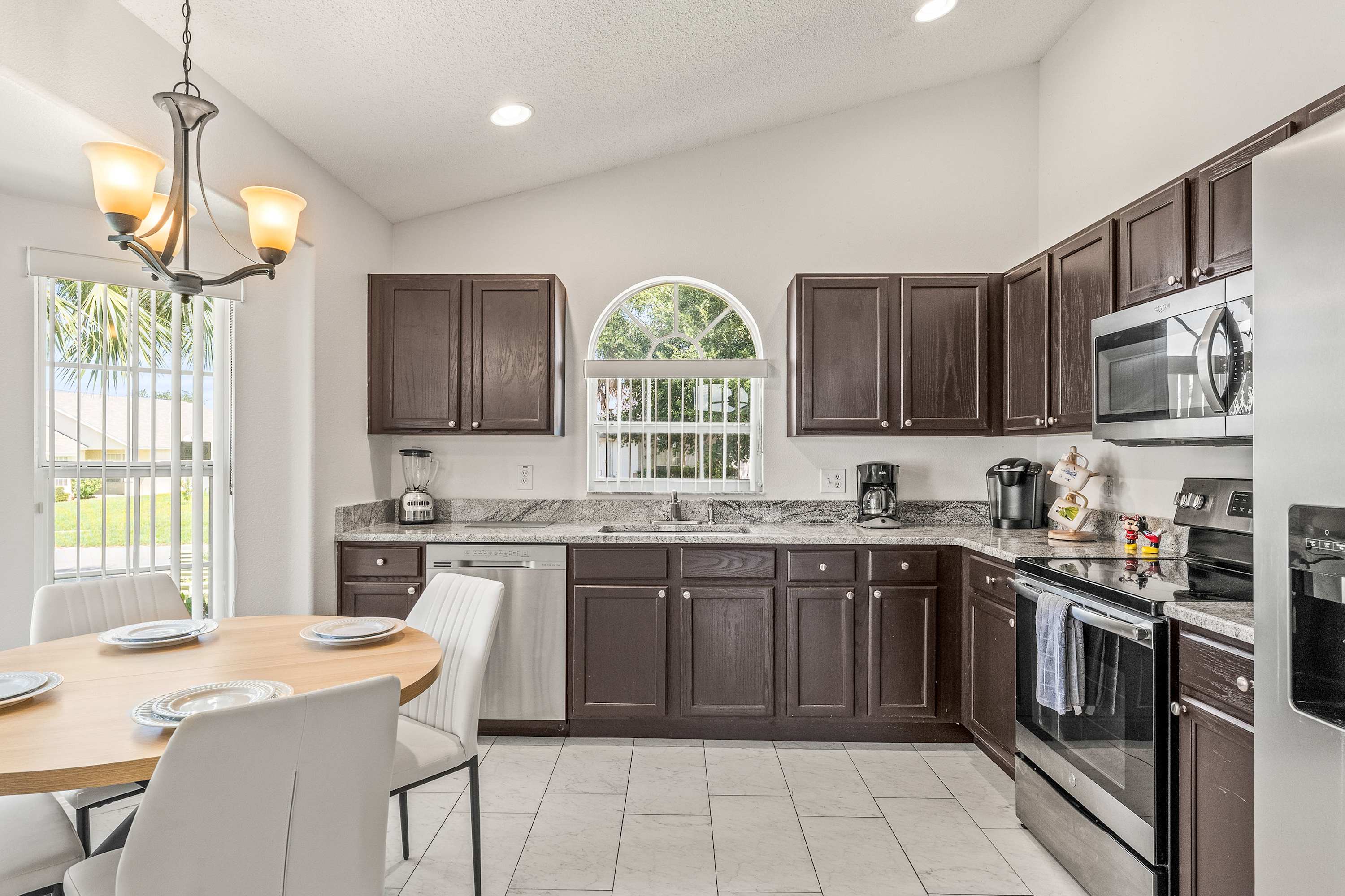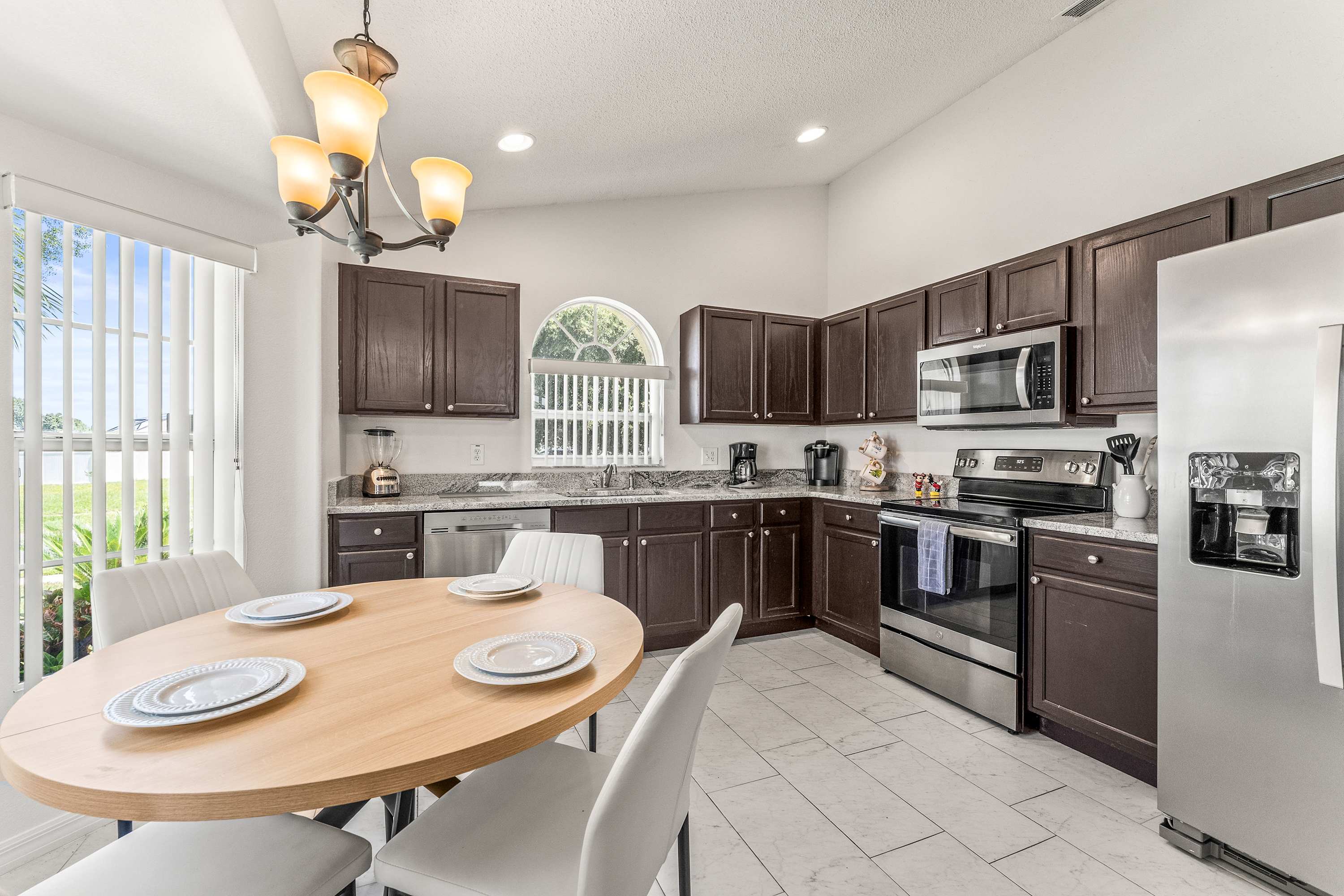 Step inside Magical Family Getaway, thoughtfully designed on one level for comfort and convenience. The kitchen features stainless steel appliances, rich dark wood cabinetry, a cozy nook table for four, and a coffee station with both drip and on-demand options. A dining table for six makes group meals effortless, while the living room welcomes you with cathedral ceilings, an oversized sectional for six with a built-in chaise, and a smart TV—perfect for family movie nights. From here, sliding glass doors open to the lanai, where a shaded seating area for four and a high-top table for two overlook a sparkling pool with spa that gently cascades into the water, plus a chaise lounger framed by privacy panels.