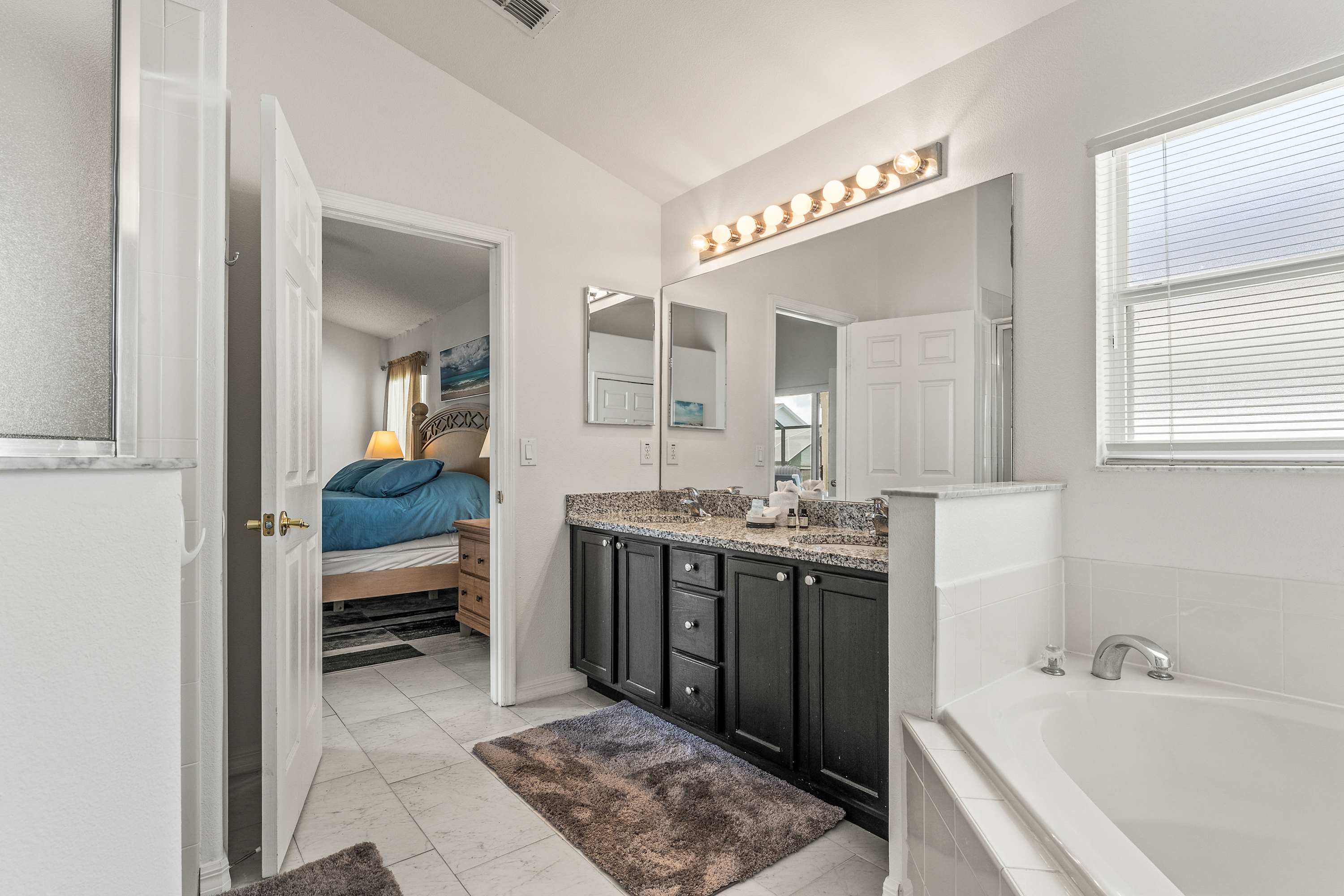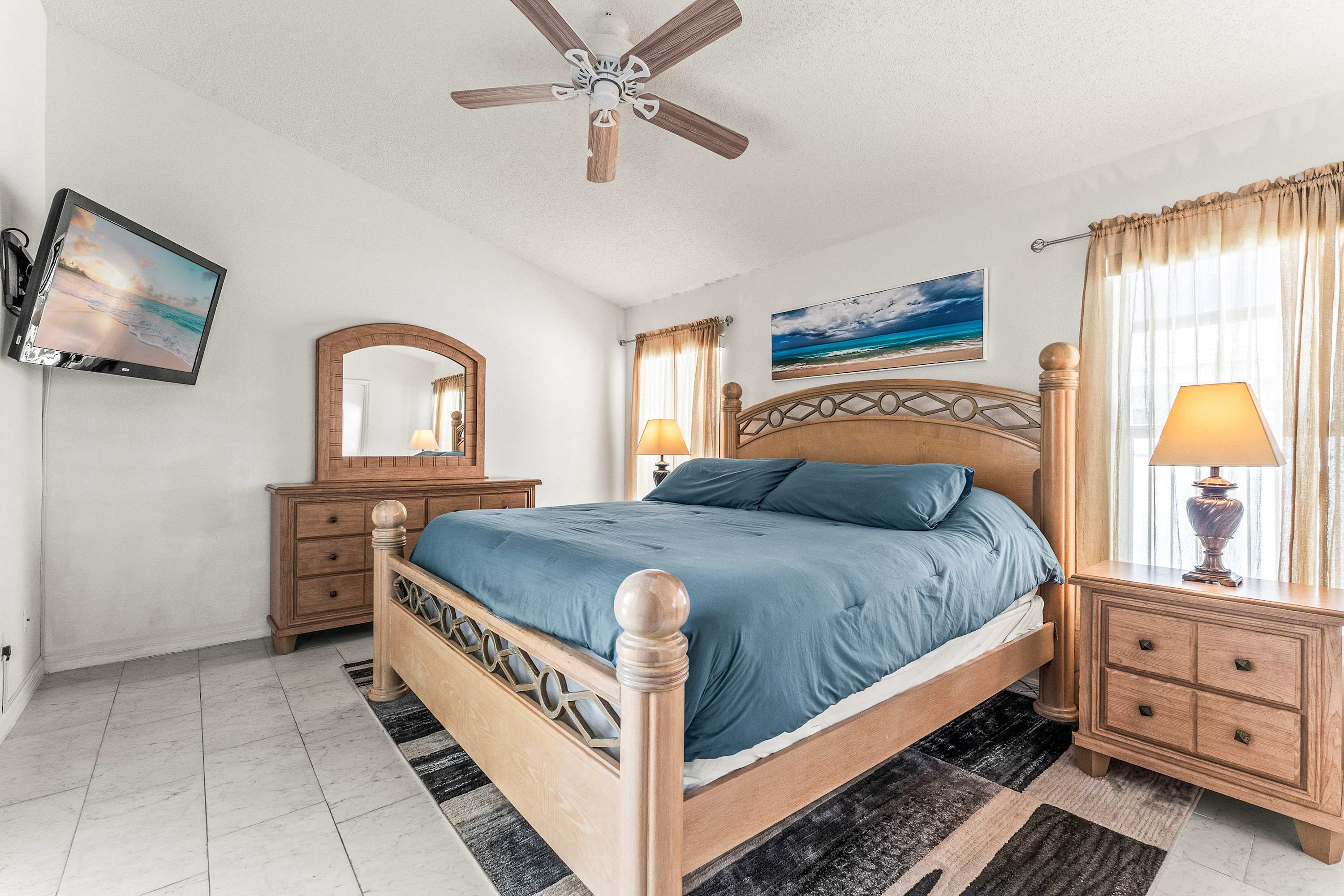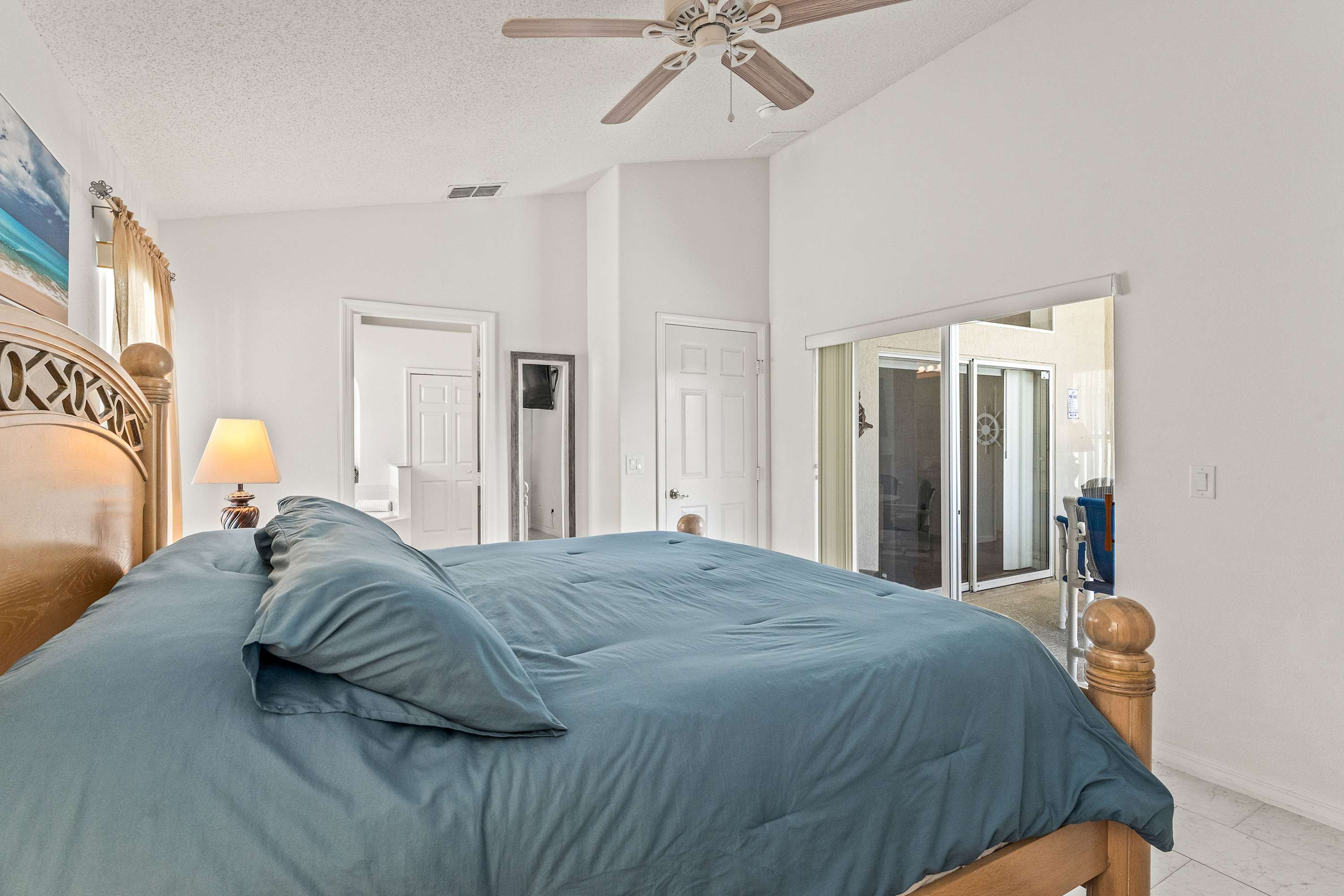 Bedroom #1 includes a king size bed, a smart TV, access to the lanai, and an ensuite bathroom with a dual vanity, an oversized soaking tub, and a walk-in shower.