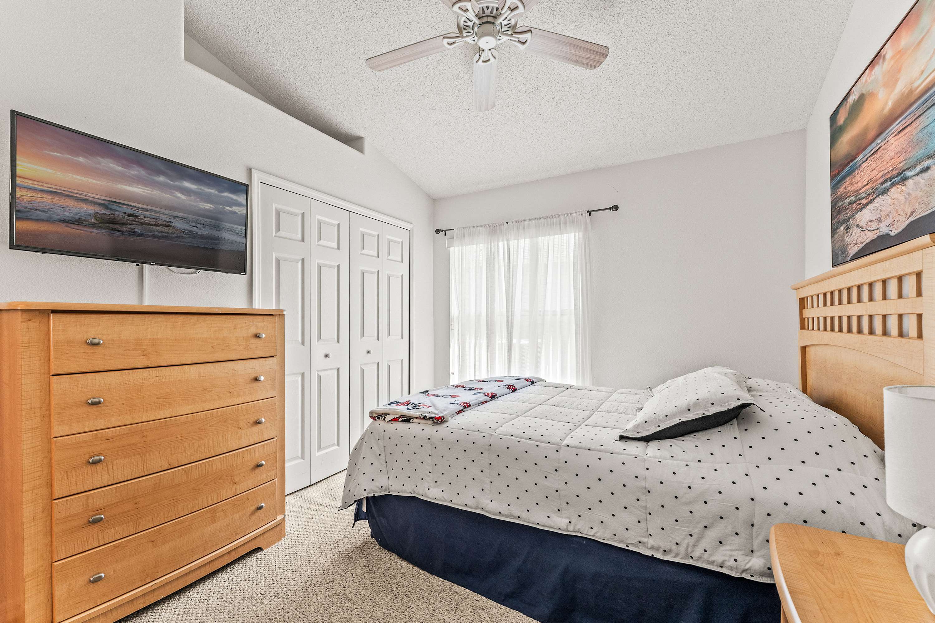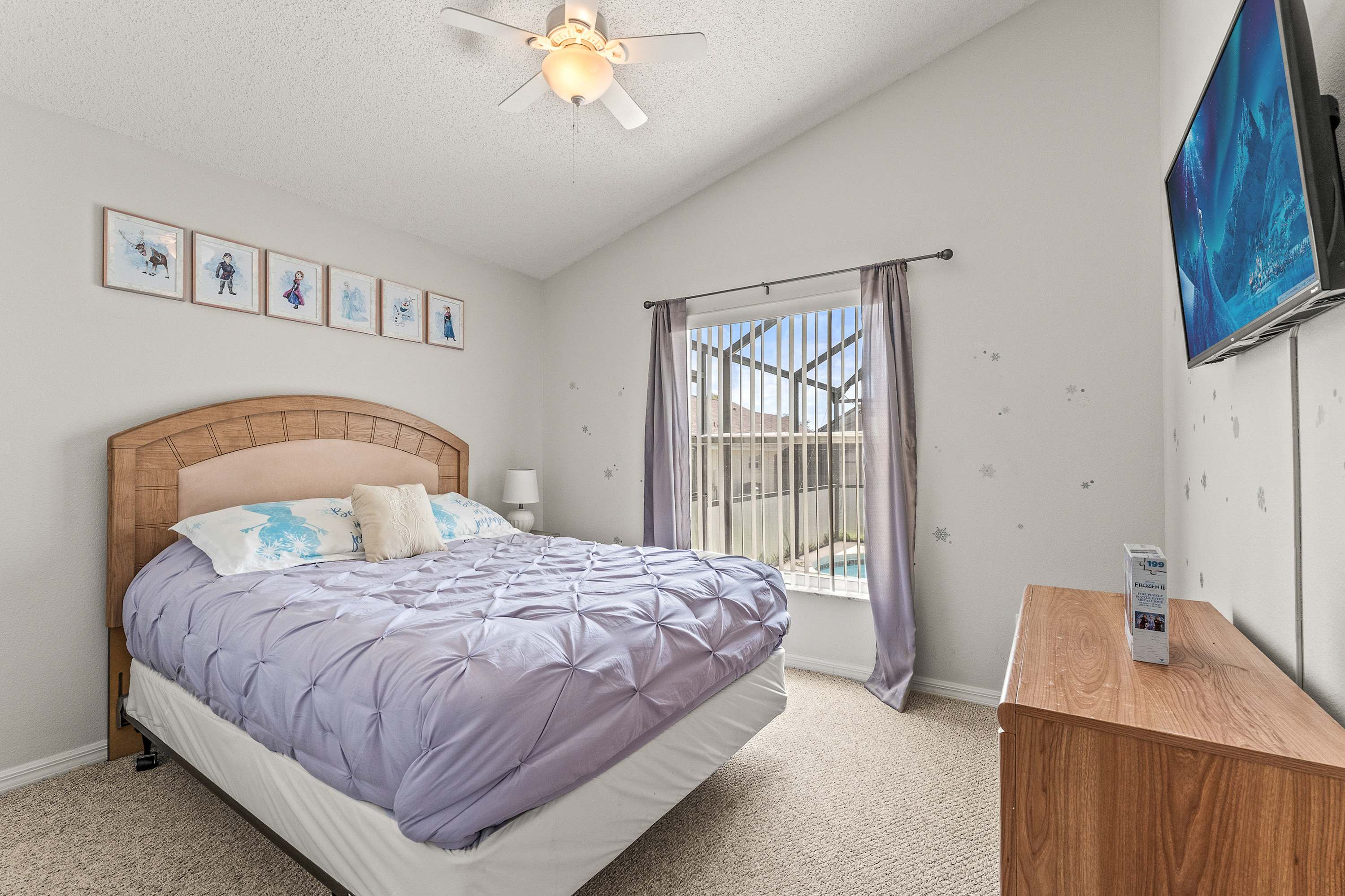 Bedroom #2 is Frozen themed and includes a queen size bed, a smart TV, and access to the lanai area.
