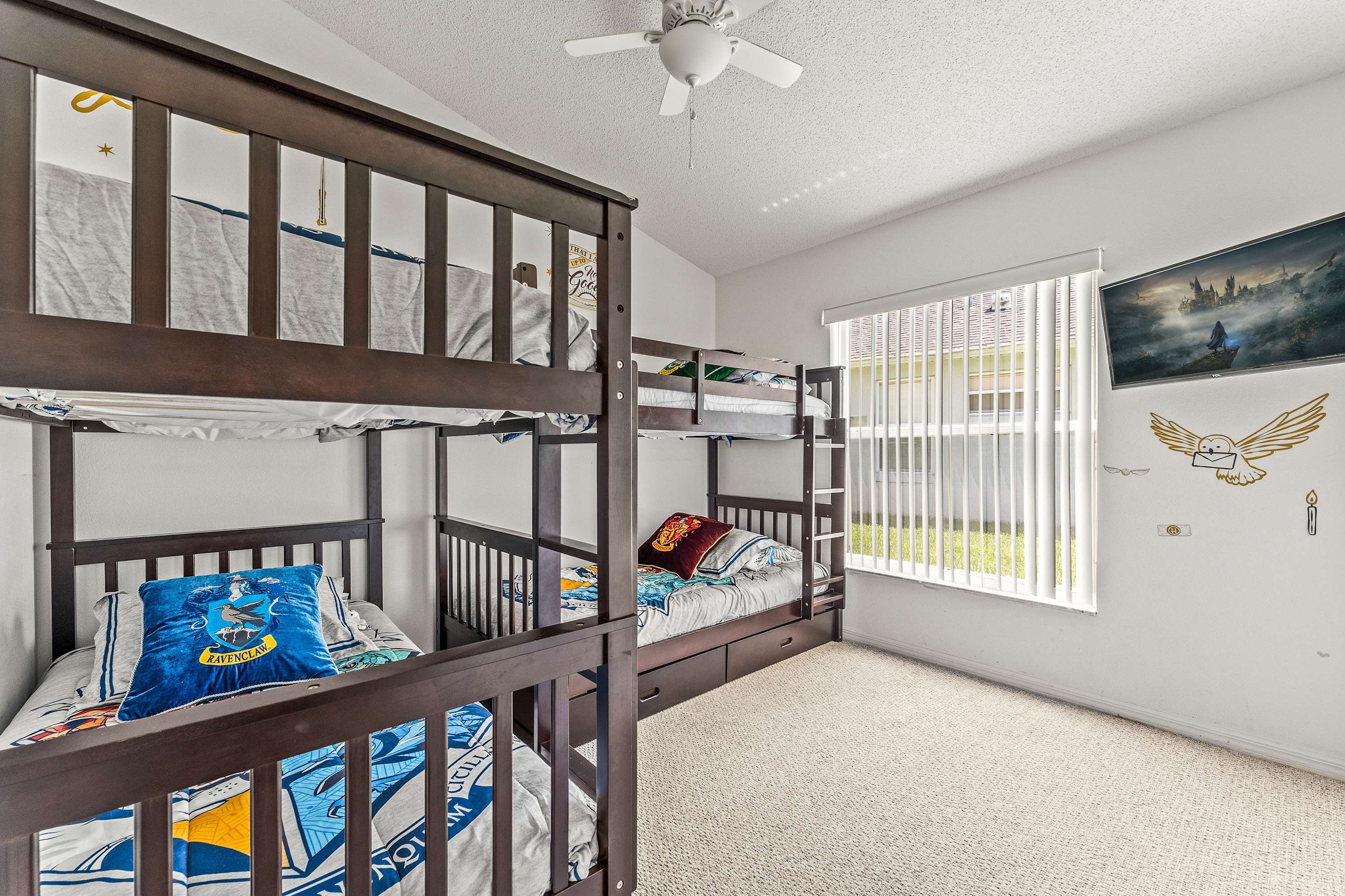 Bedroom #3 is Harry Potter themed and includes 2 sets of twin-over-twin bunk beds and a smart TV.