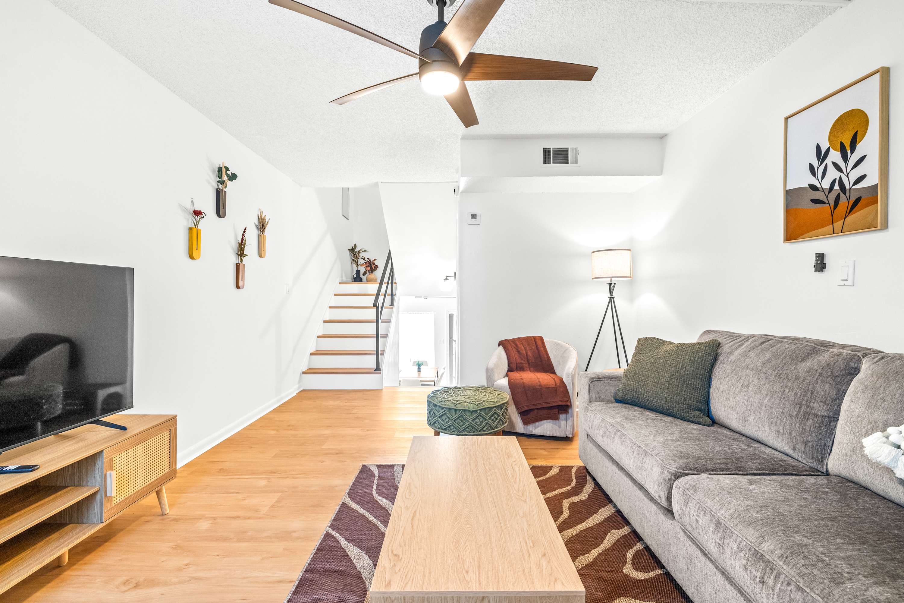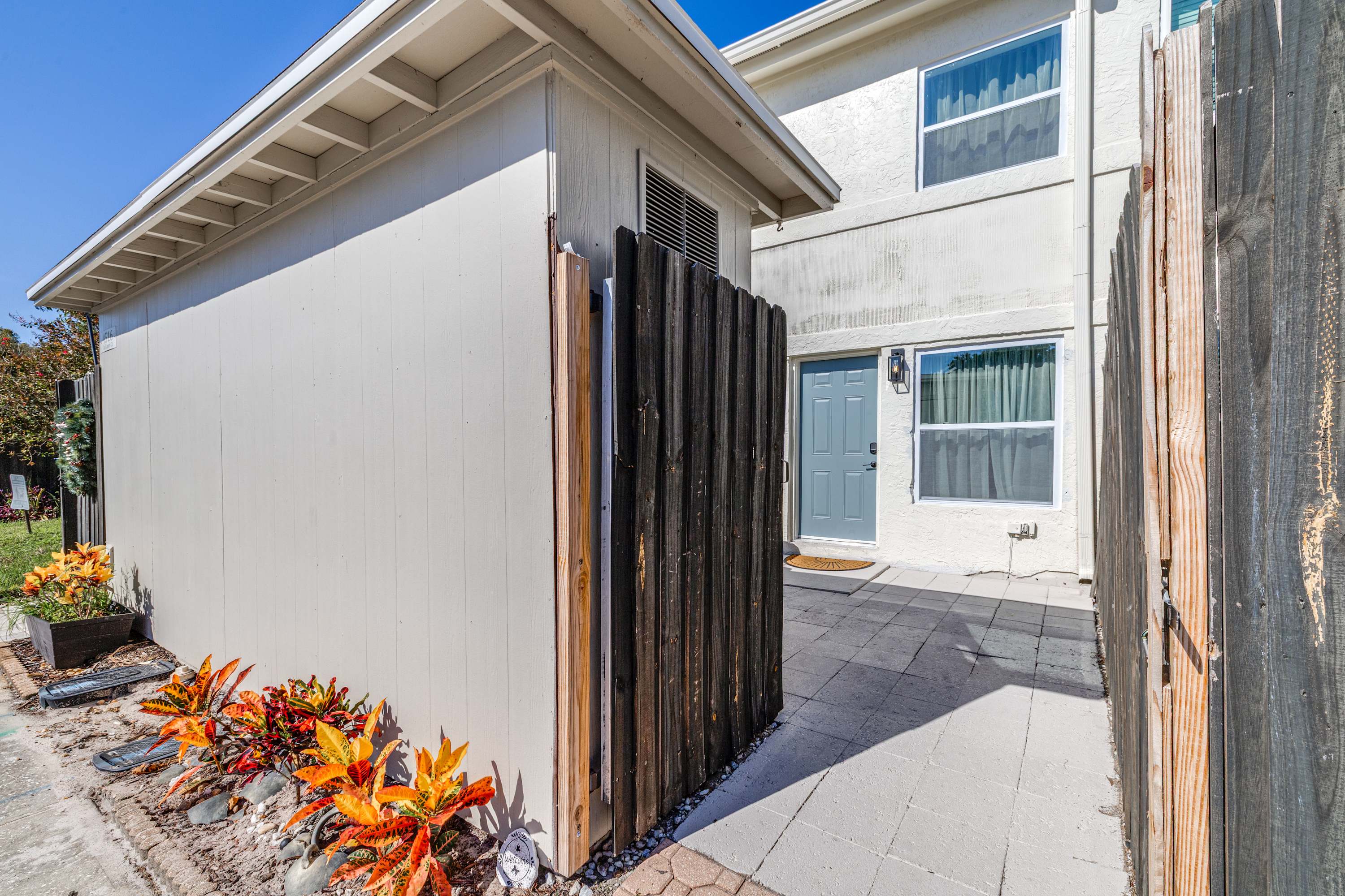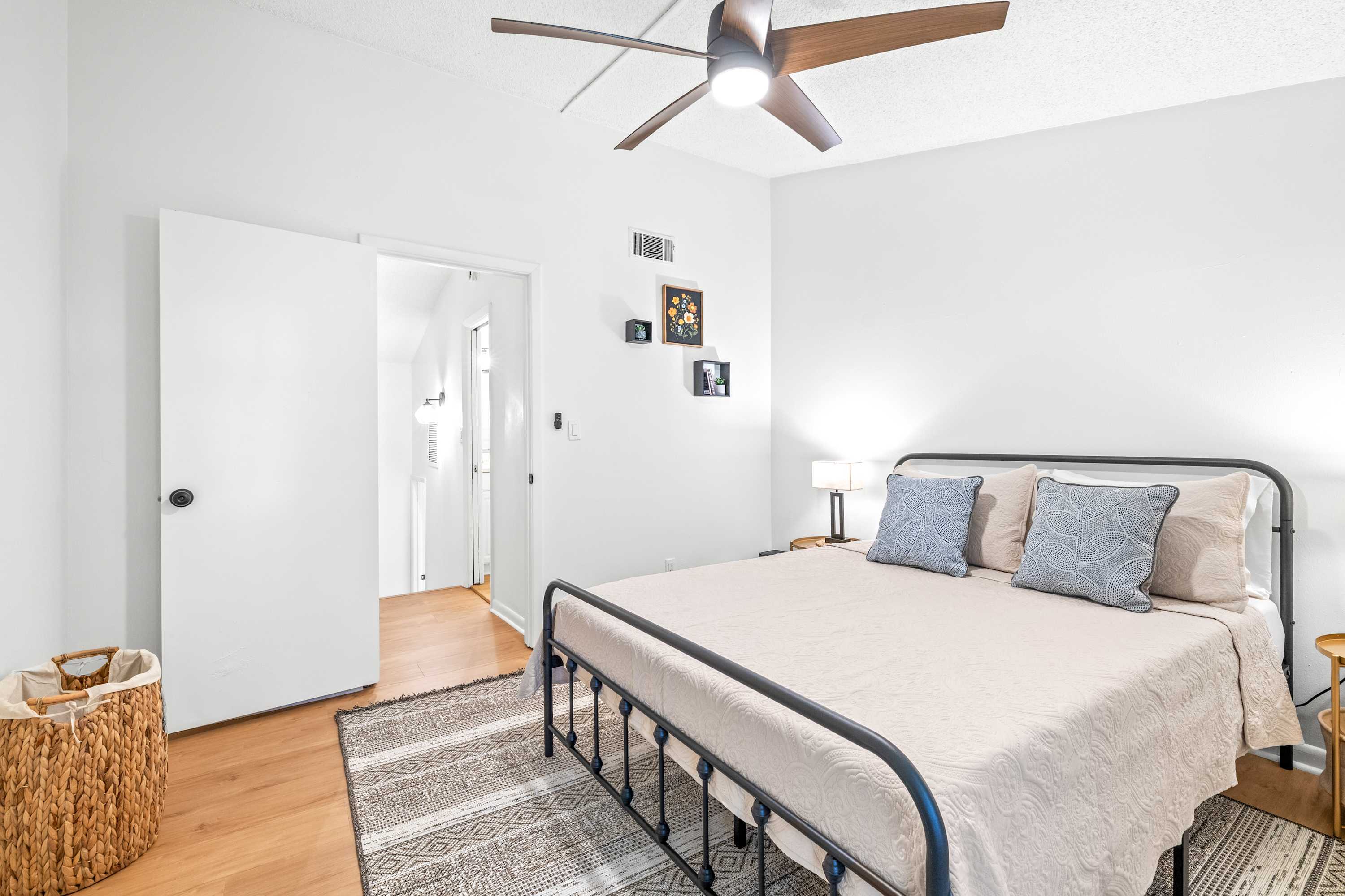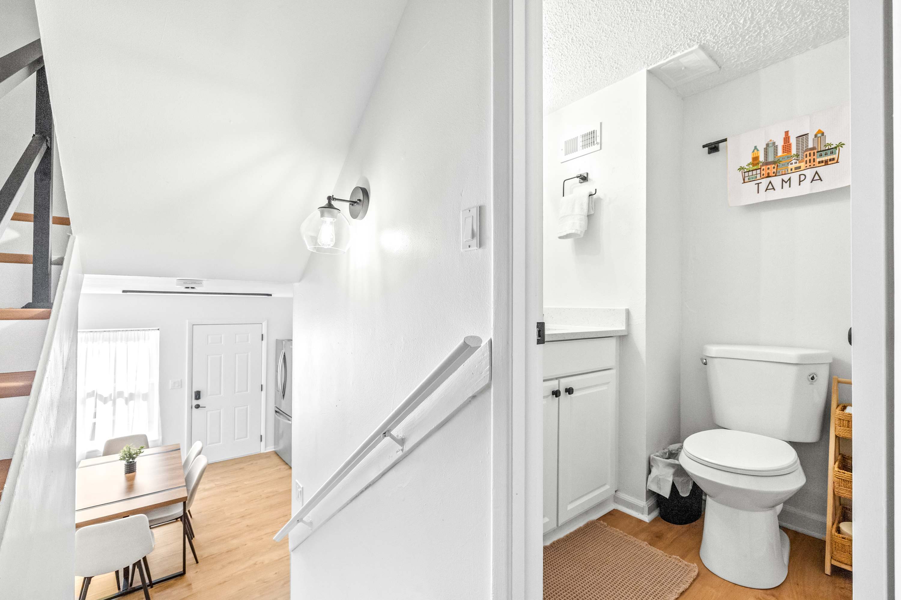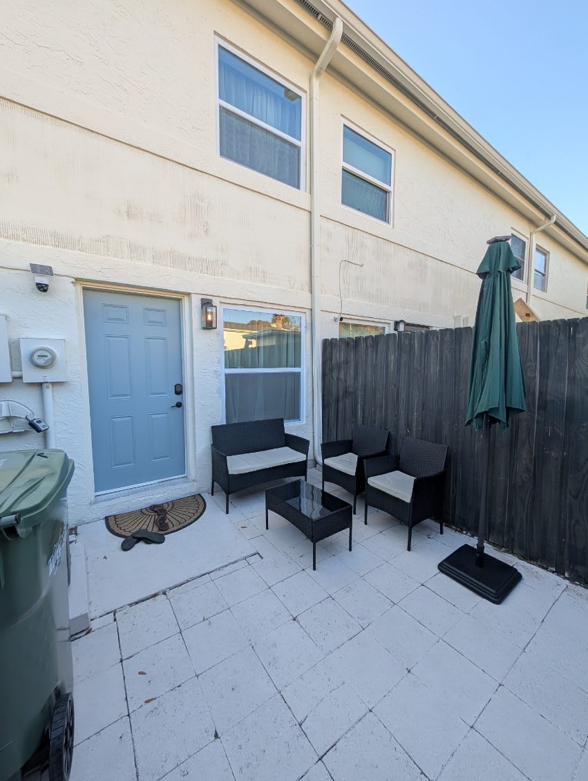 Inside, this inviting home is designed for relaxation and convenience. The living room greets you with a comfortable sofa, smart TV, and a cozy armchair, ideal for winding down after a day of exploring. The kitchen is warm and bright, fully stocked with essentials and equipped with stainless steel appliances and a kettle for tea lovers. With enough space for everyone, prepare your home-cooked meals together then gather at the dining table for six to enjoy conversation. Before the evening comes to an end, be sure to step out to your small private patio where you can savor the fresh Florida air. Every detail makes The Capri Villa a welcoming retreat for your Tampa stay.