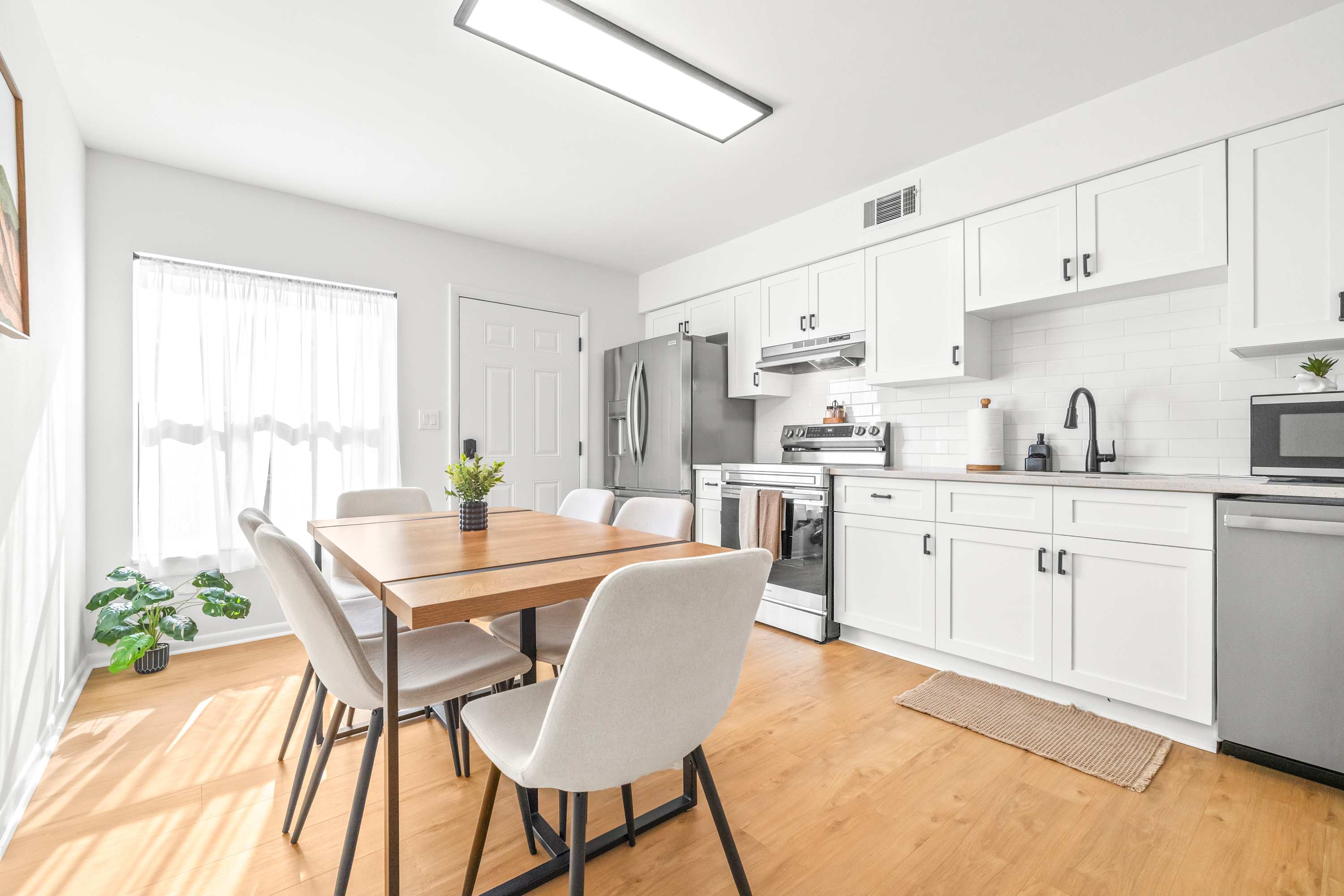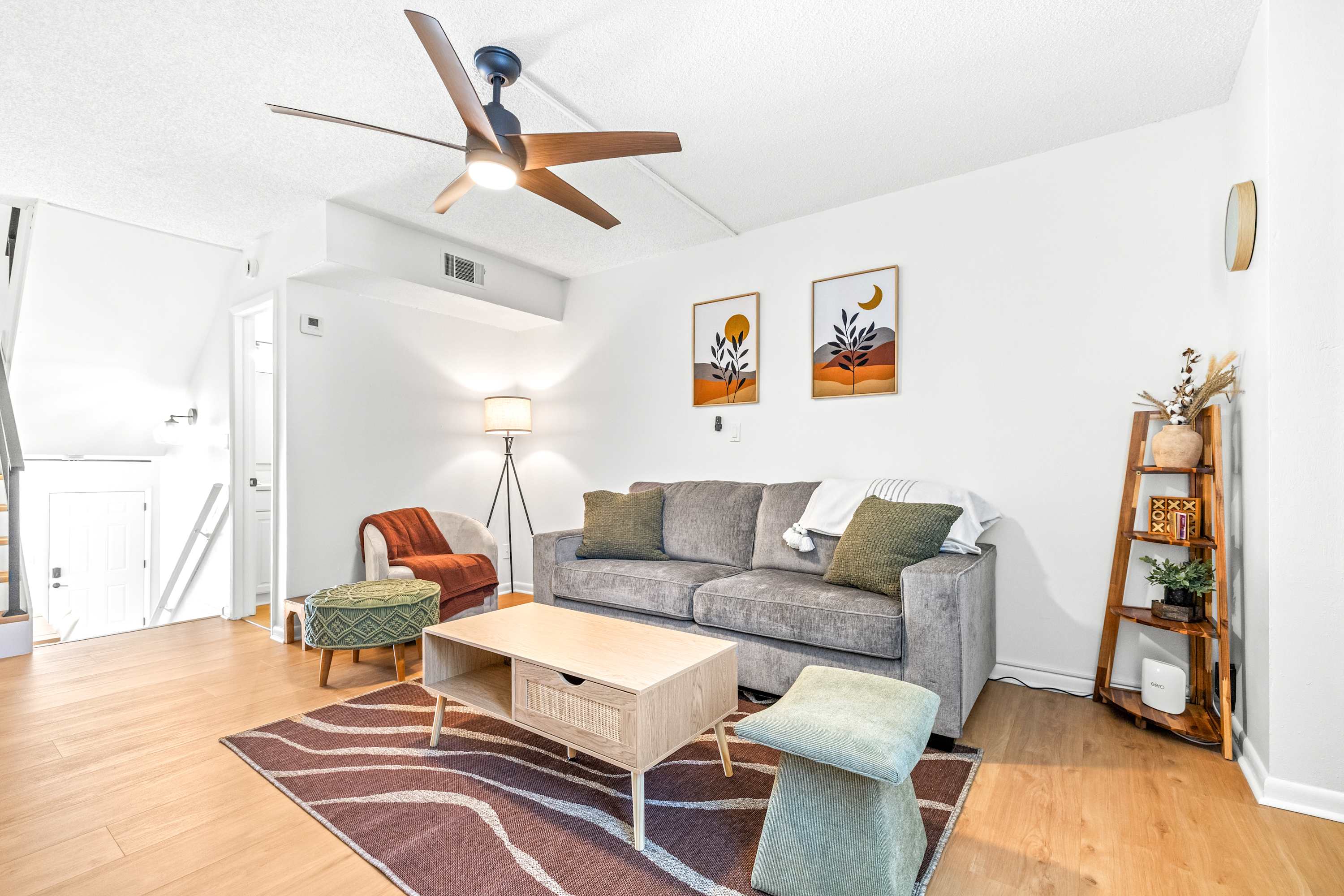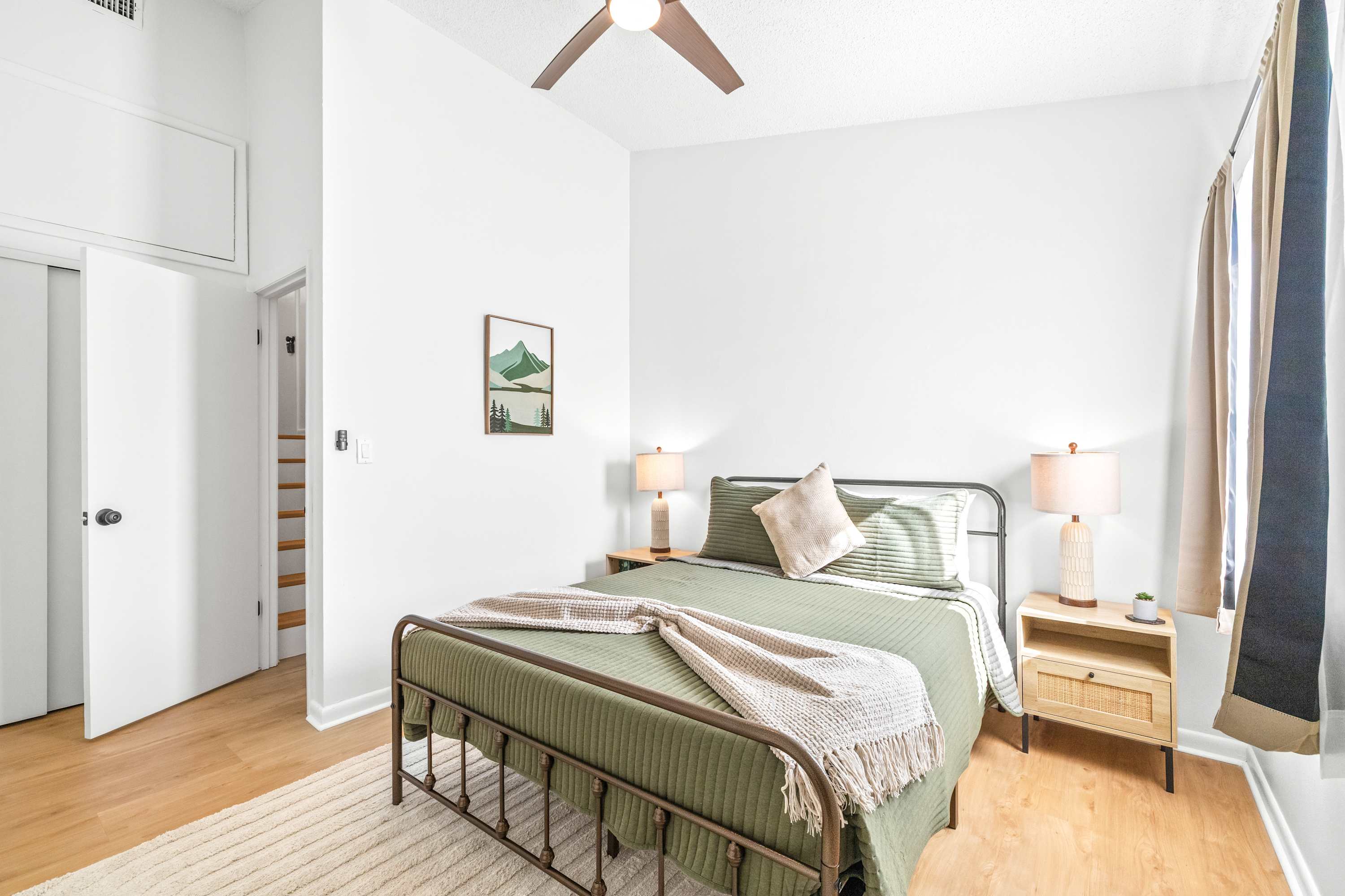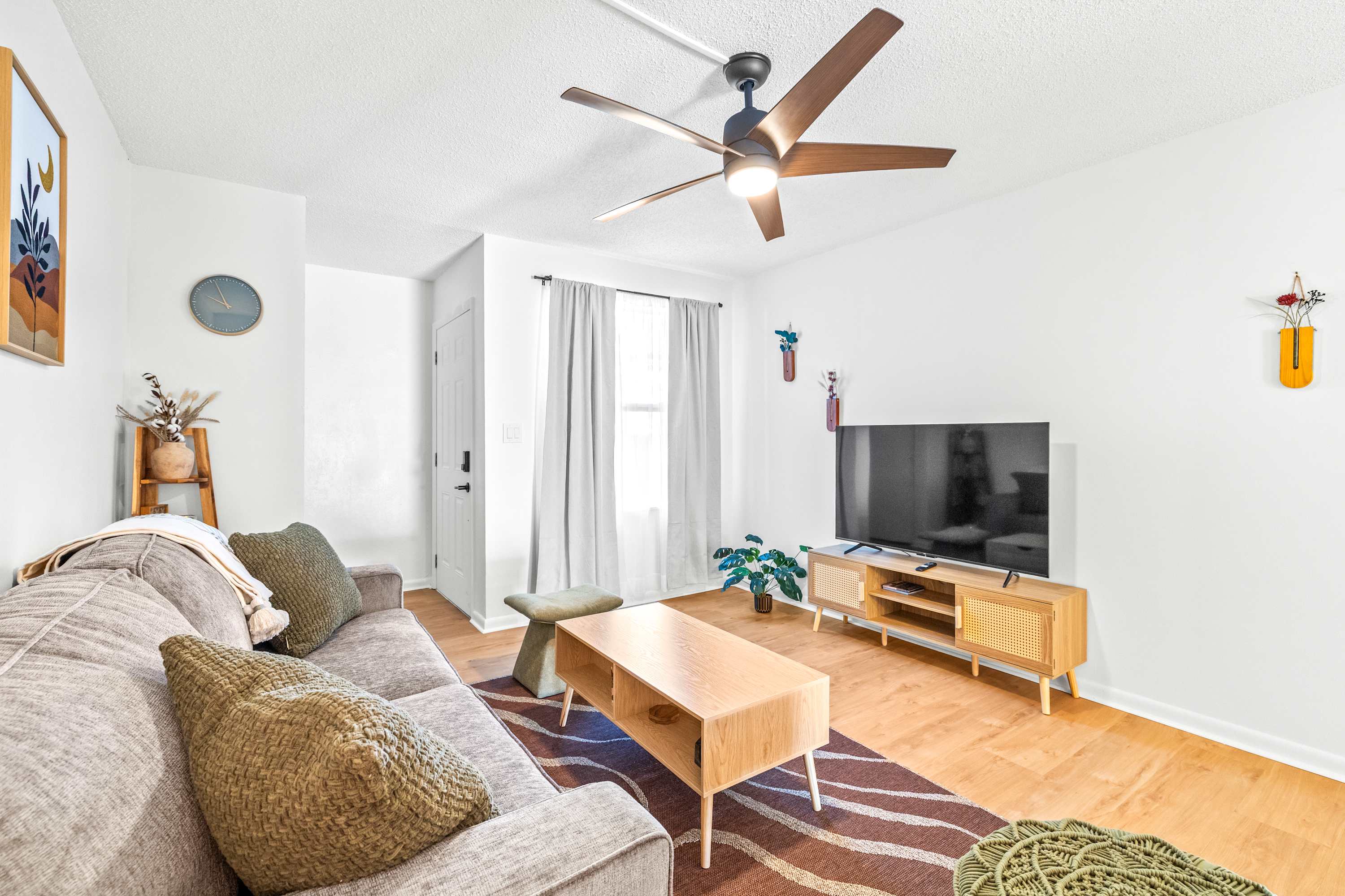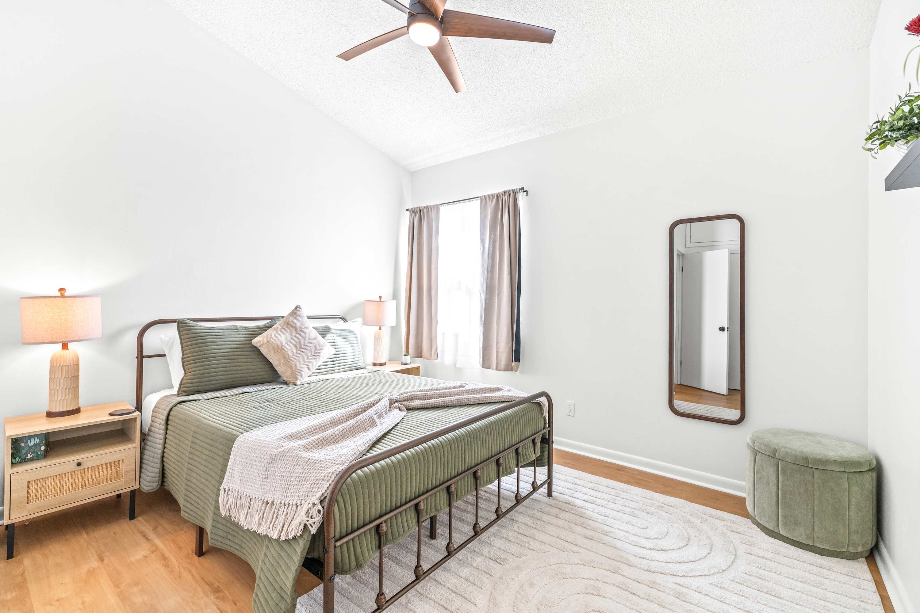 Inside, this inviting home is designed for relaxation and convenience. The living room greets you with a comfortable sofa, smart TV, and a cozy armchair, ideal for winding down after a day of exploring. The kitchen is warm and bright, fully stocked with essentials and equipped with stainless steel appliances and a kettle for tea lovers. With enough space for everyone, prepare your home-cooked meals together then gather at the dining table for six to enjoy conversation. Before the evening comes to an end, be sure to step out to your small private patio where you can savor the fresh Florida air. Every detail makes The Capri Villa a welcoming retreat for your Tampa stay.