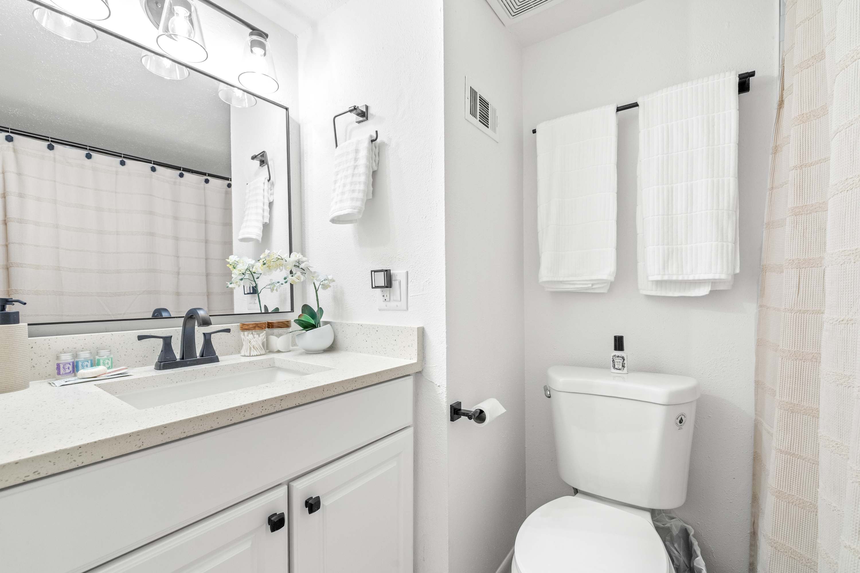 This home also includes a half bathroom and a full guest bathroom with a single vanity and a shower/tub combo.
