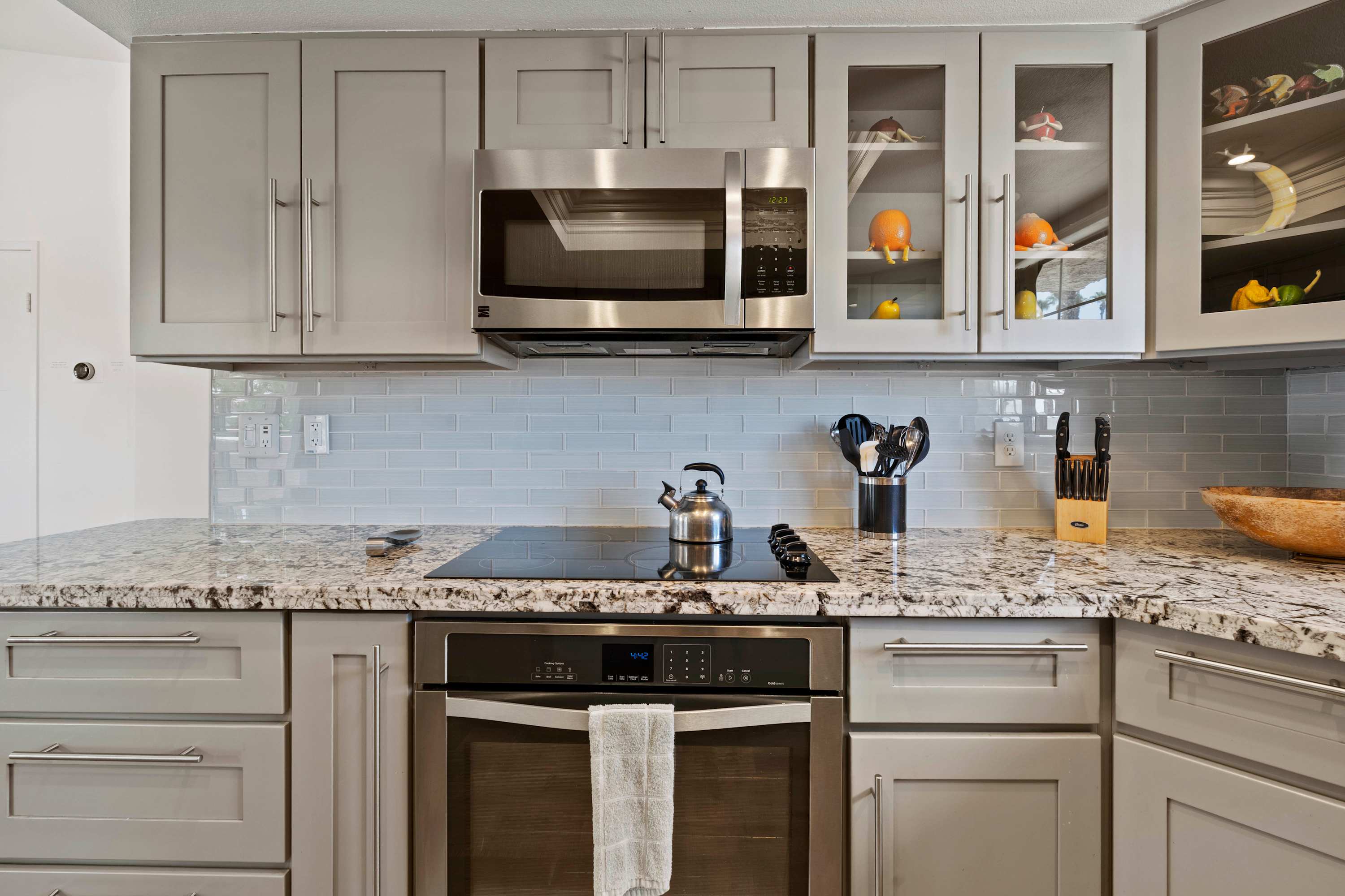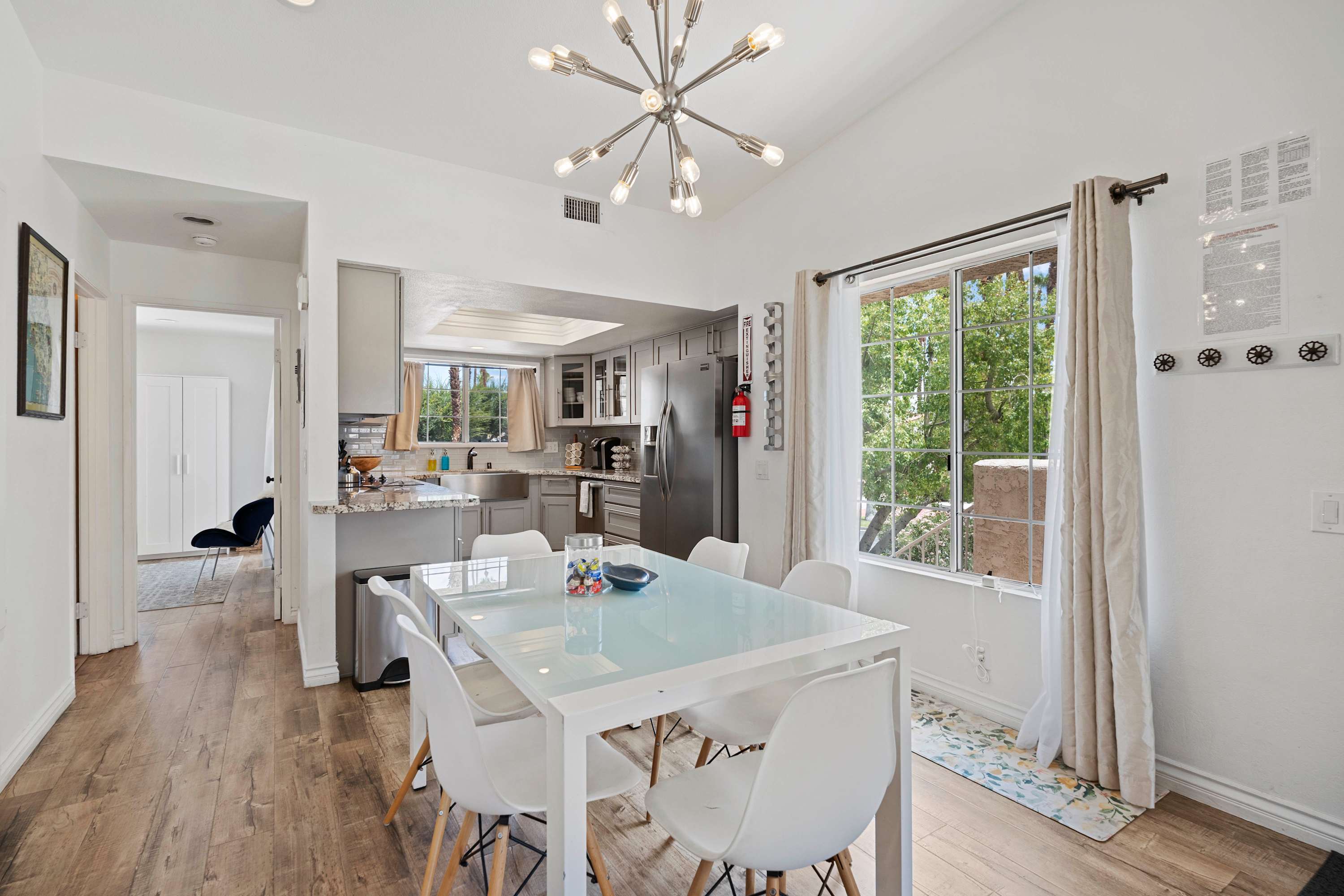 Back at the condo, you can enjoy the beauty of the outdoors from the partially shaded back patio, perfect for al fresco dining while taking in the mountain air. Inside, the spacious living room flows seamlessly into the dining area and kitchen, creating an open, inviting layout. Relax on the sofa while streaming your favorite shows on the smart TV, gather for meals at the stylish dining table with seating for six, or whip up something delicious in the full galley kitchen, equipped with sleek finishes, stainless steel appliances, and a convenient K-Cup coffee maker for your morning brew.