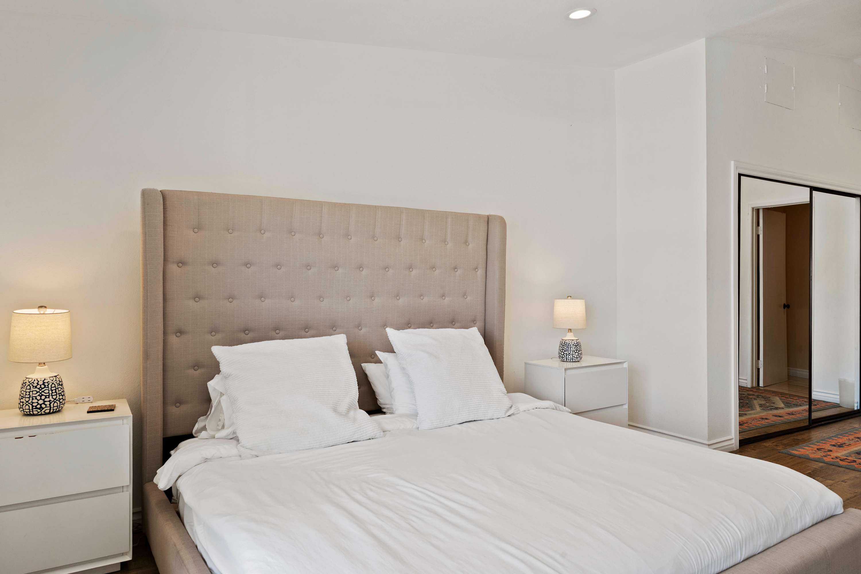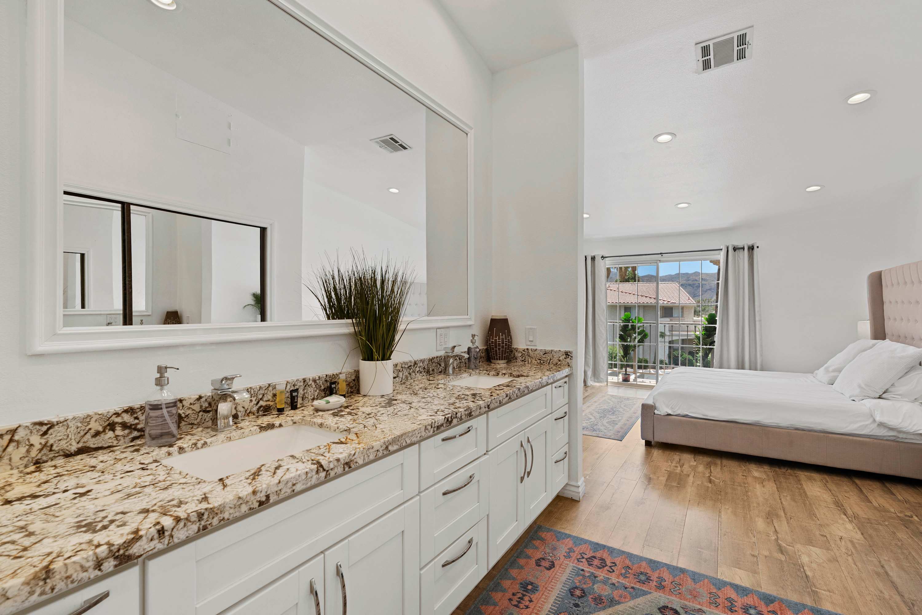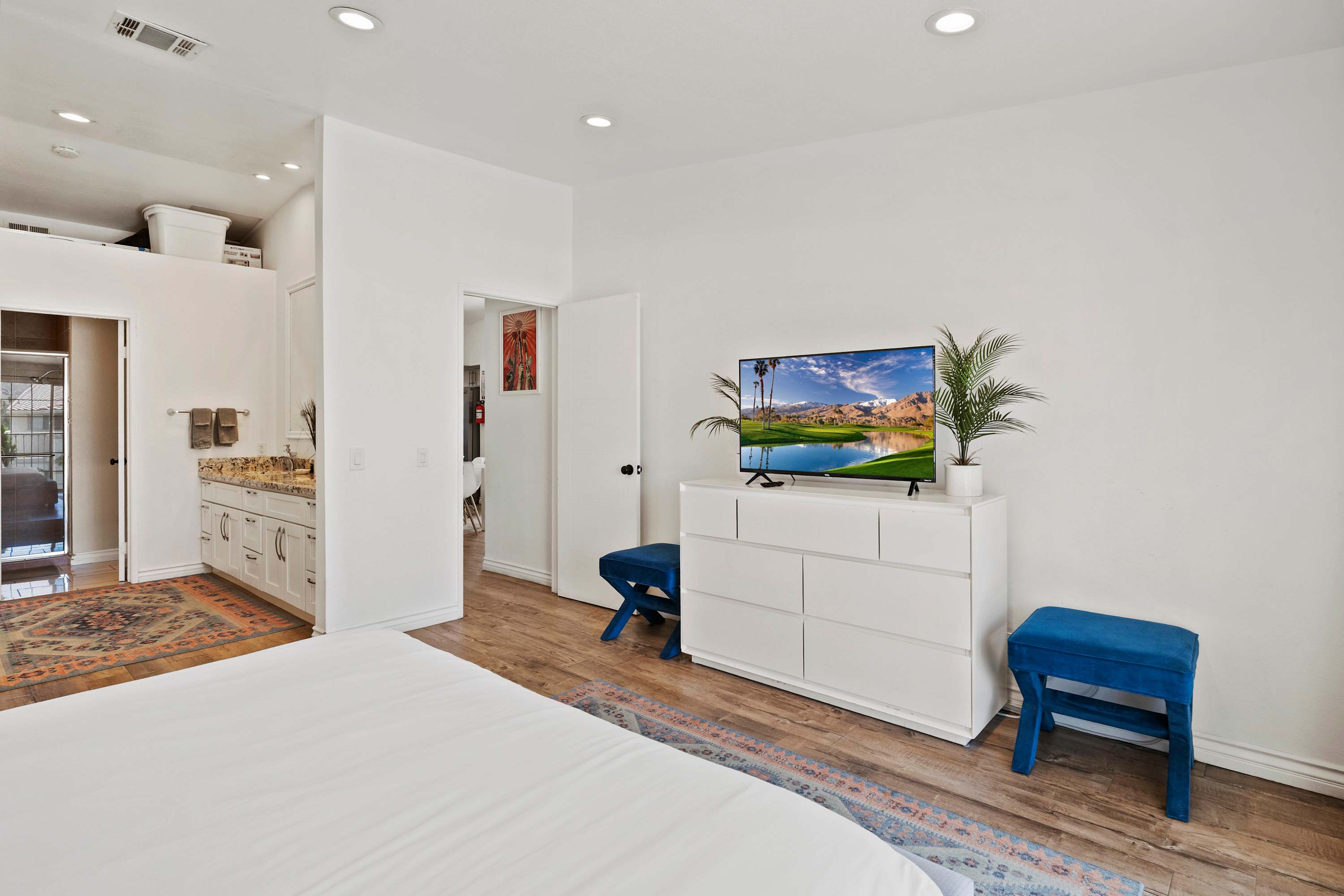 Bedroom #1 includes a California king size bed, a smart TV, patio access, and ensuite bathroom with a dual vanity and a walk-in shower.