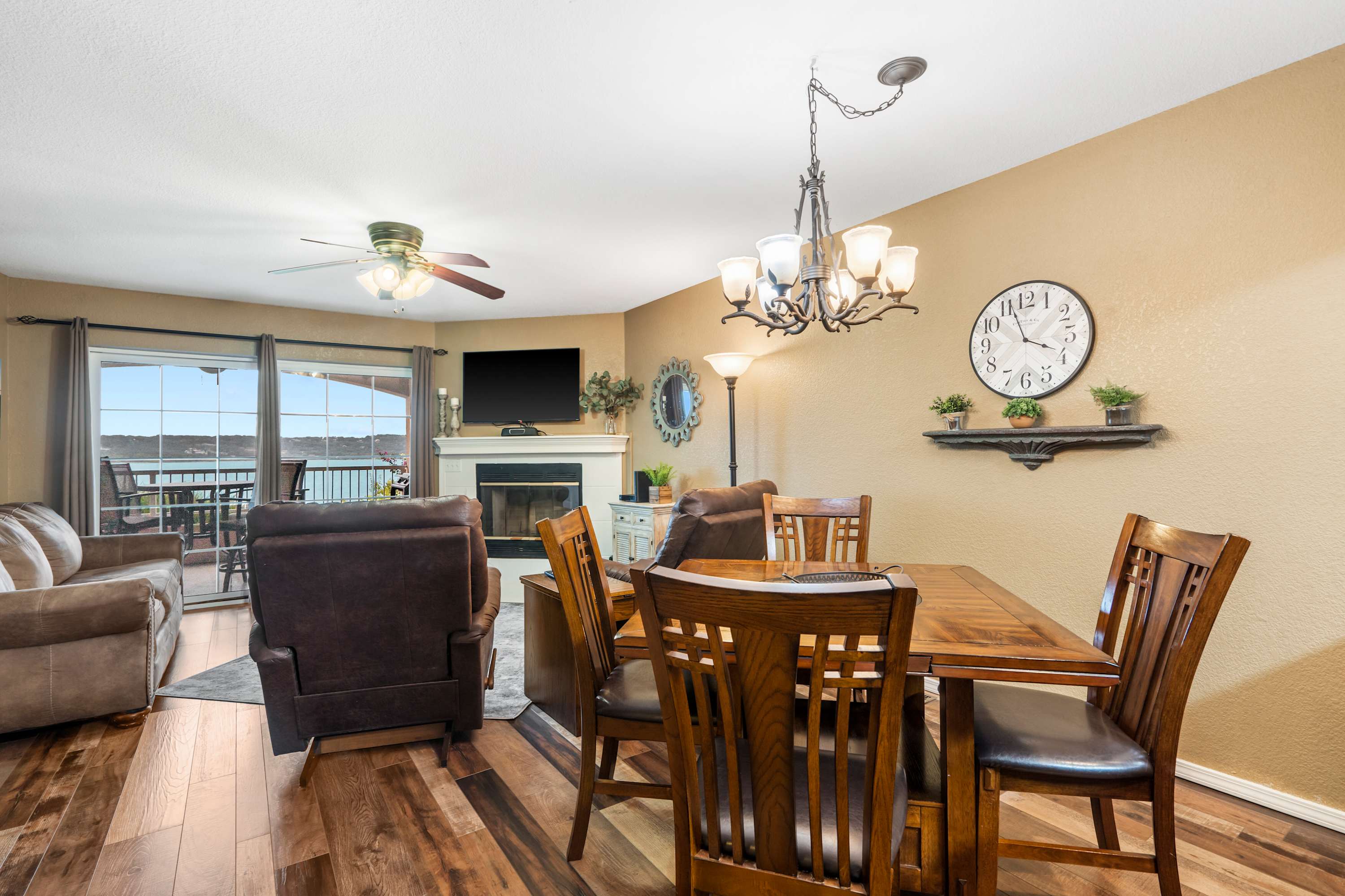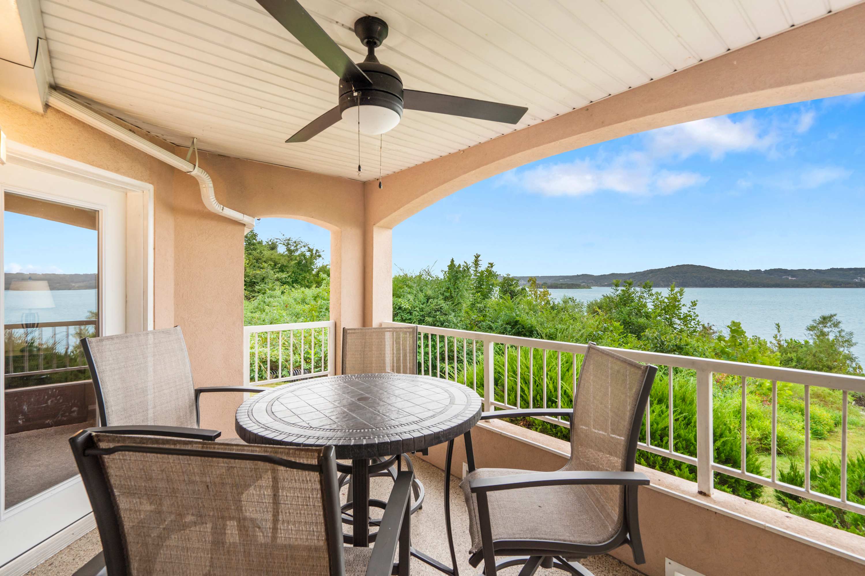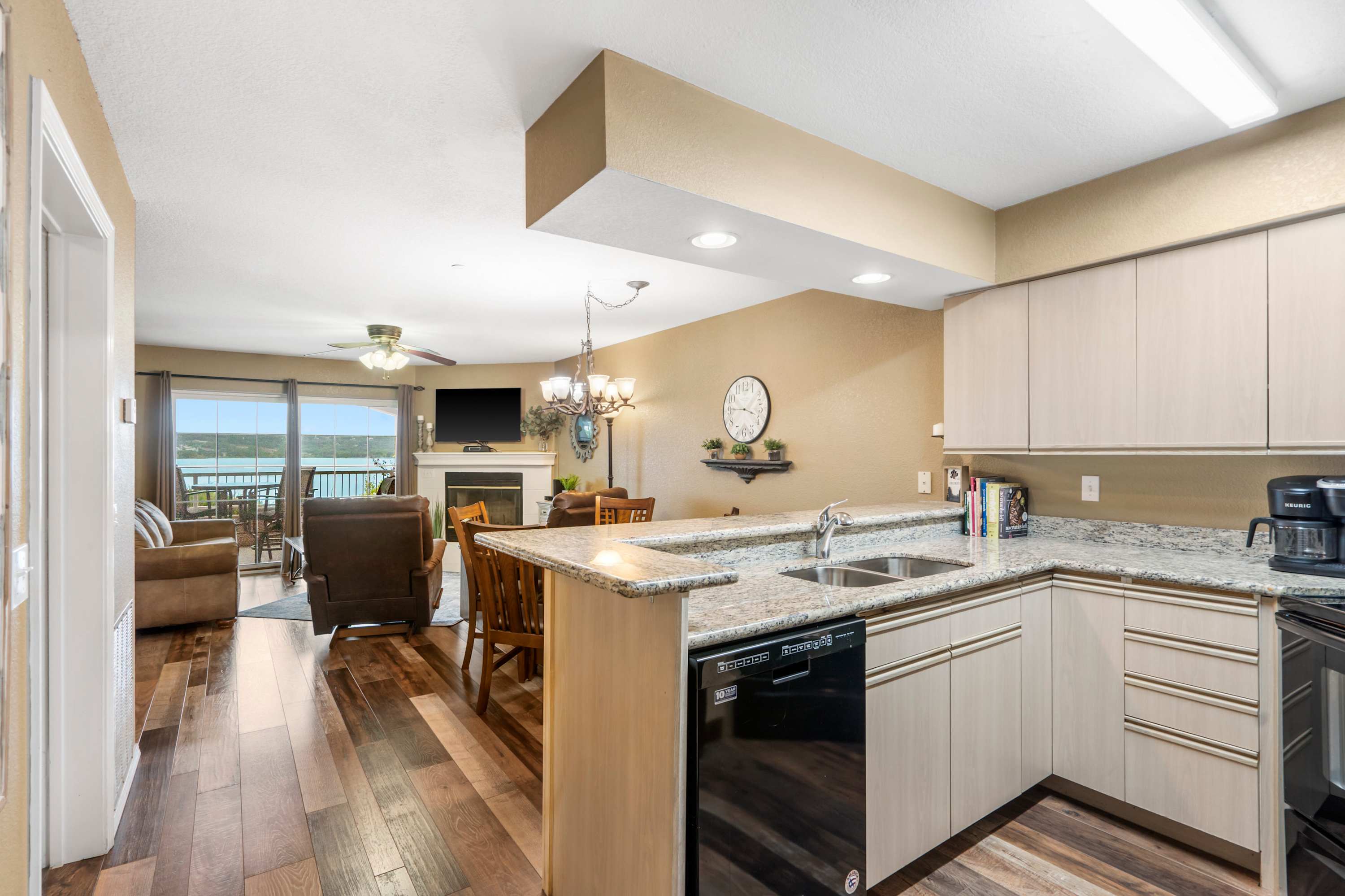 Step inside and let your vacation unfold. The kitchen greets you with sleek black appliances, stone countertops, and a drip/Keurig combo coffee maker, with counter seating for three that’s ideal for casual breakfasts or evening chats while dinner is being prepared. Just beyond, a dining table for four offers the perfect spot for more formal meals. The living room invites you to settle in with a cozy couch, two armchairs, and a smart TV, while sliding glass doors frame sweeping lake views. Step out onto the deck, where a table for four sets the stage for al fresco dining against the breathtaking backdrop of Table Rock Lake—sunsets here are truly unforgettable.
