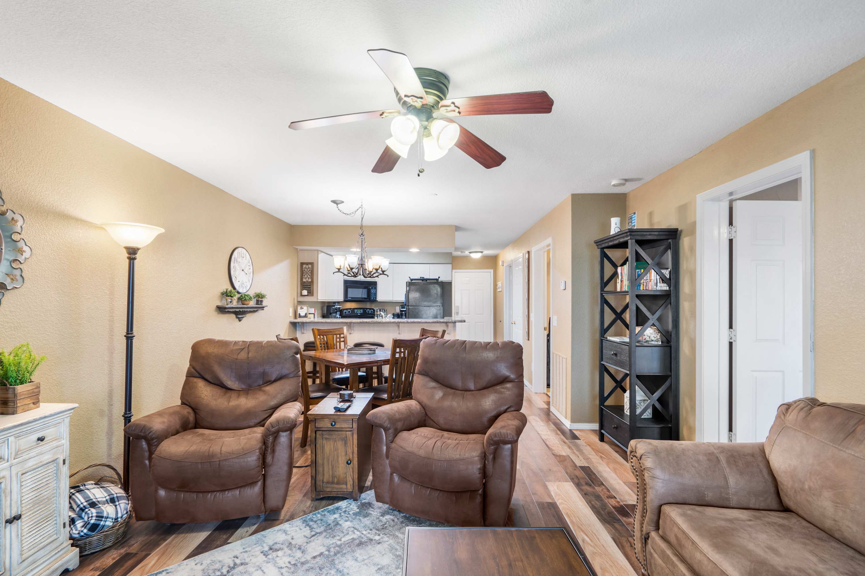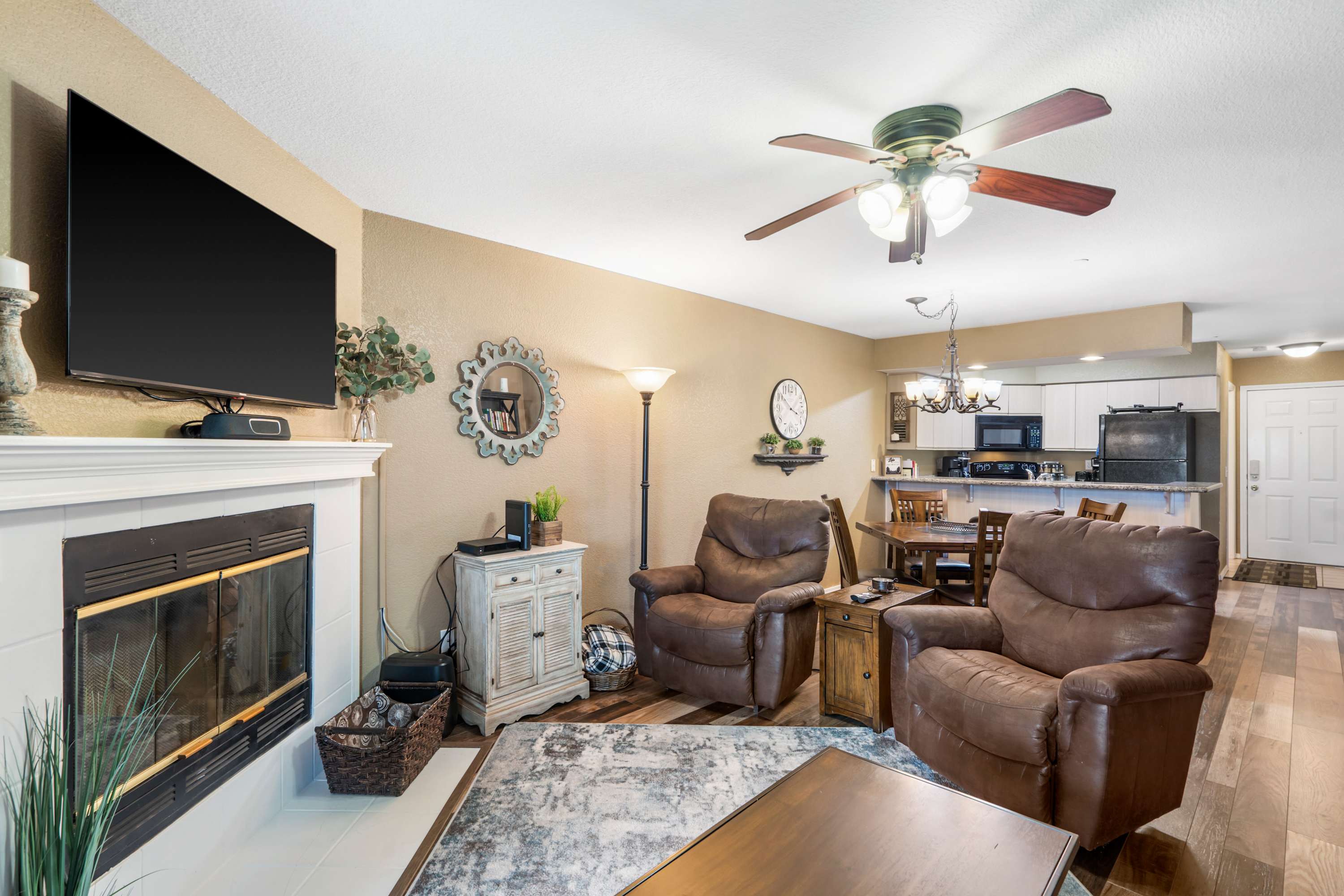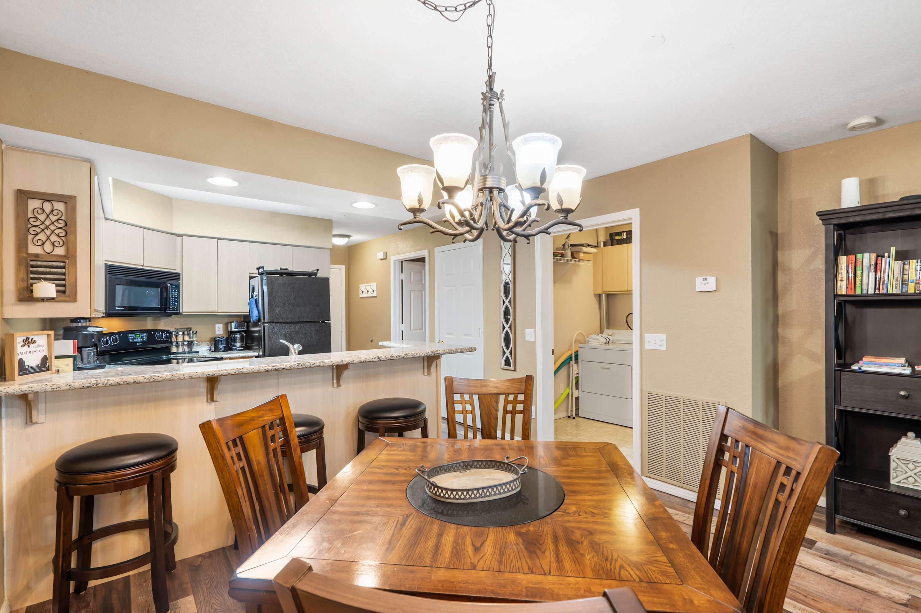 Step inside and let your vacation unfold. The kitchen greets you with sleek black appliances, stone countertops, and a drip/Keurig combo coffee maker, with counter seating for three that’s ideal for casual breakfasts or evening chats while dinner is being prepared. Just beyond, a dining table for four offers the perfect spot for more formal meals. The living room invites you to settle in with a cozy couch, two armchairs, and a smart TV, while sliding glass doors frame sweeping lake views. Step out onto the deck, where a table for four sets the stage for al fresco dining against the breathtaking backdrop of Table Rock Lake—sunsets here are truly unforgettable.