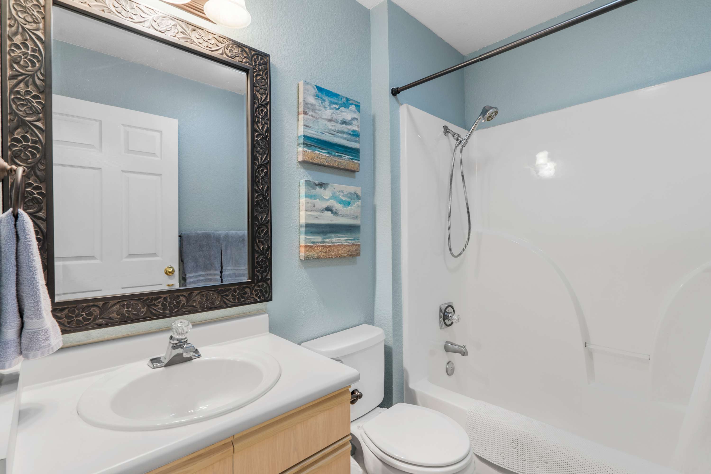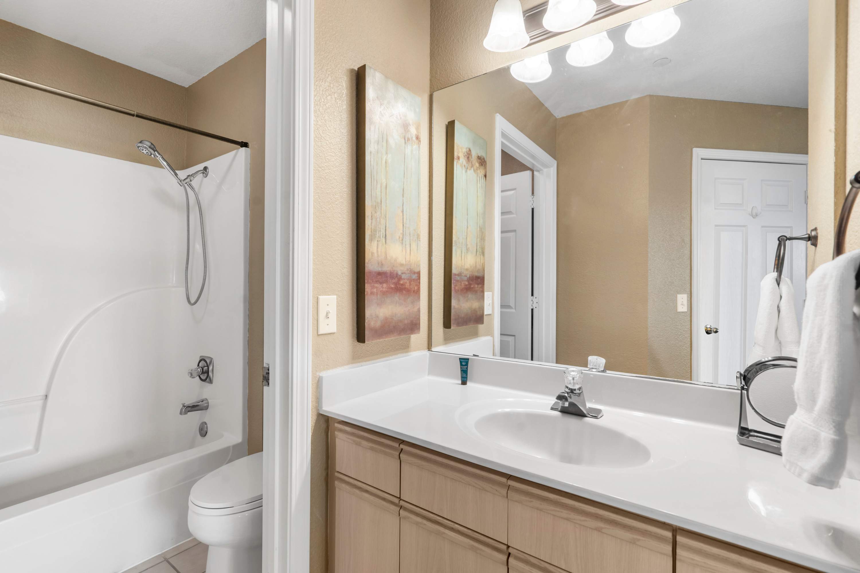 This home also includes an additional full guest bathroom with a single vanity and a shower/tub combo.