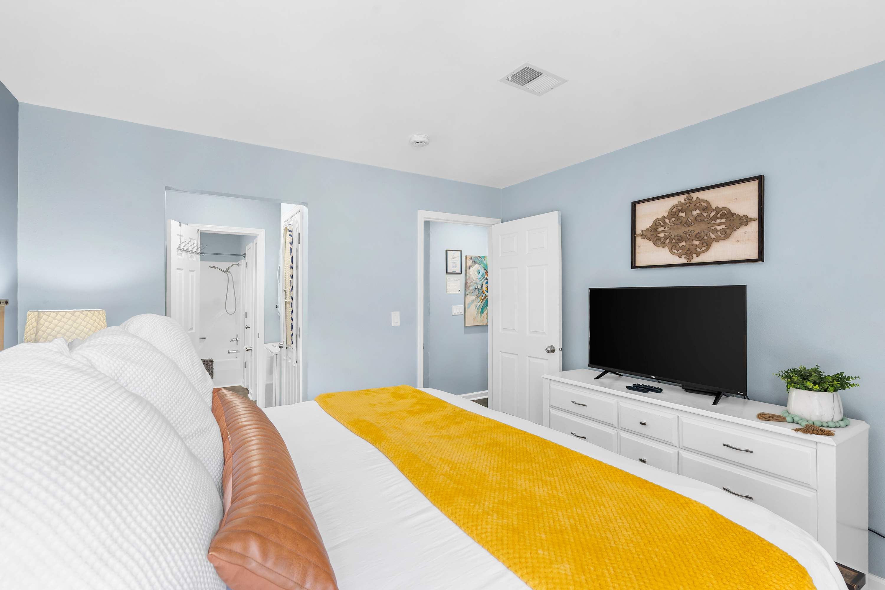 Bedroom #1 includes a king-size bed, a smart TV, and an ensuite bathroom with a single vanity and a shower/tub combo.