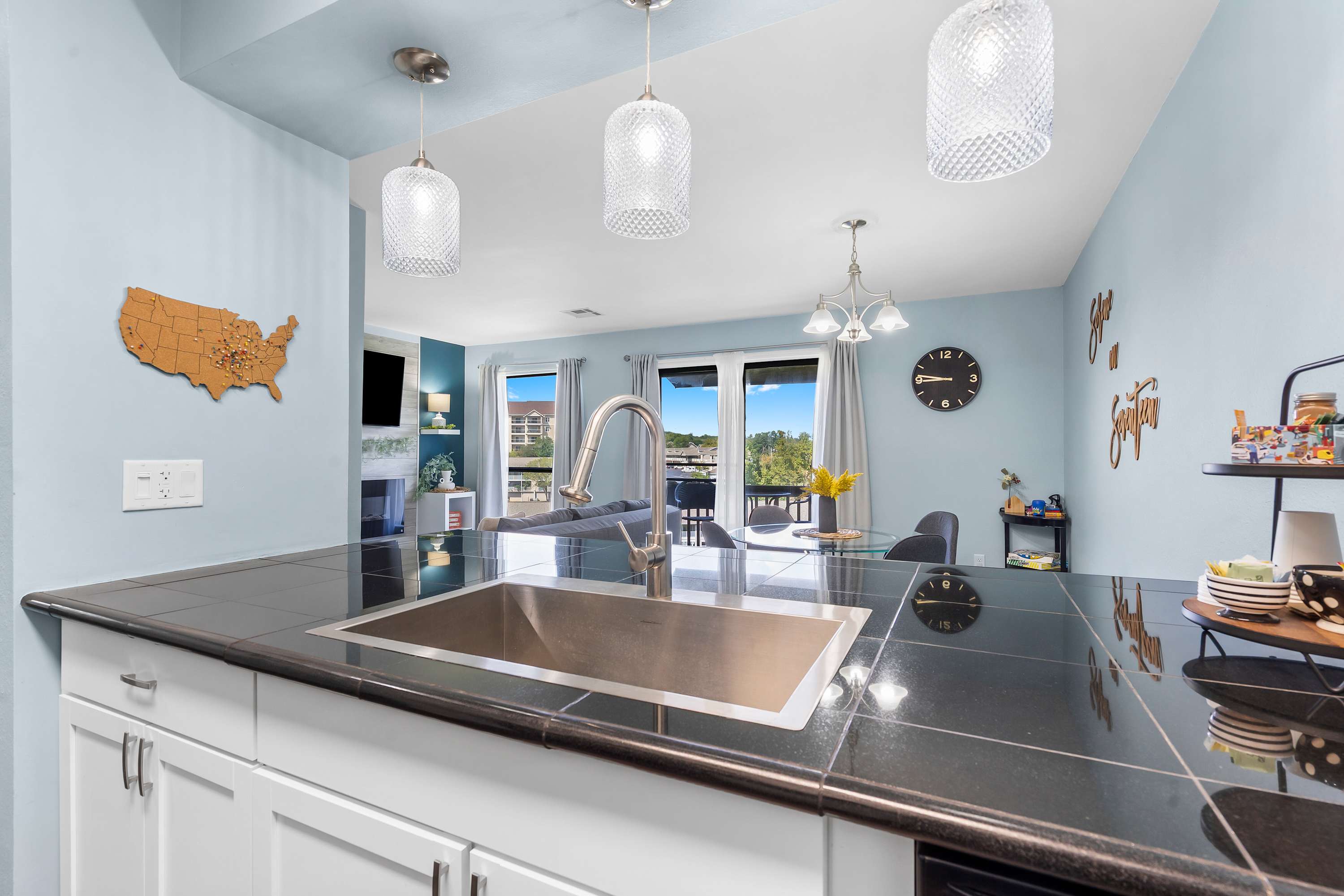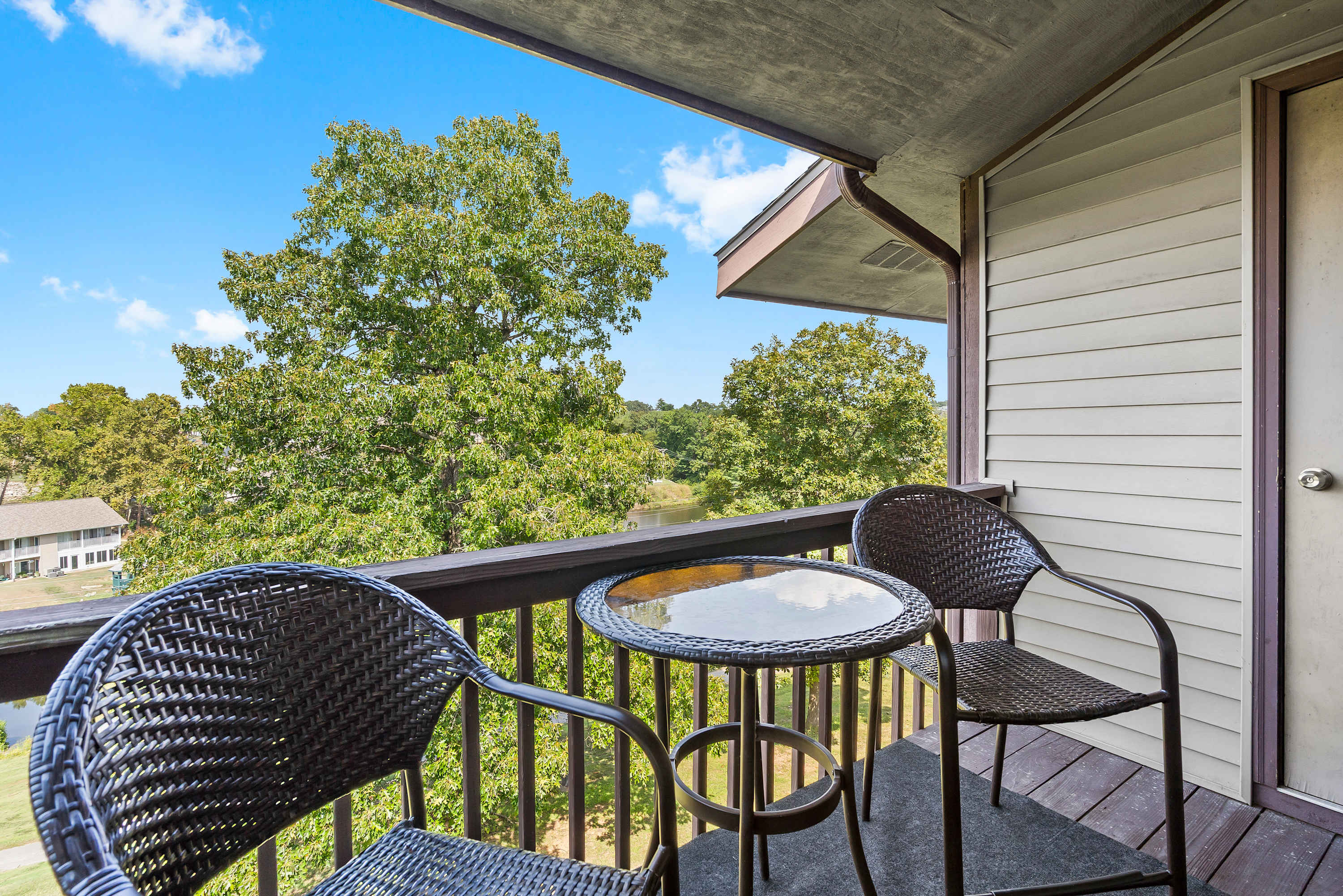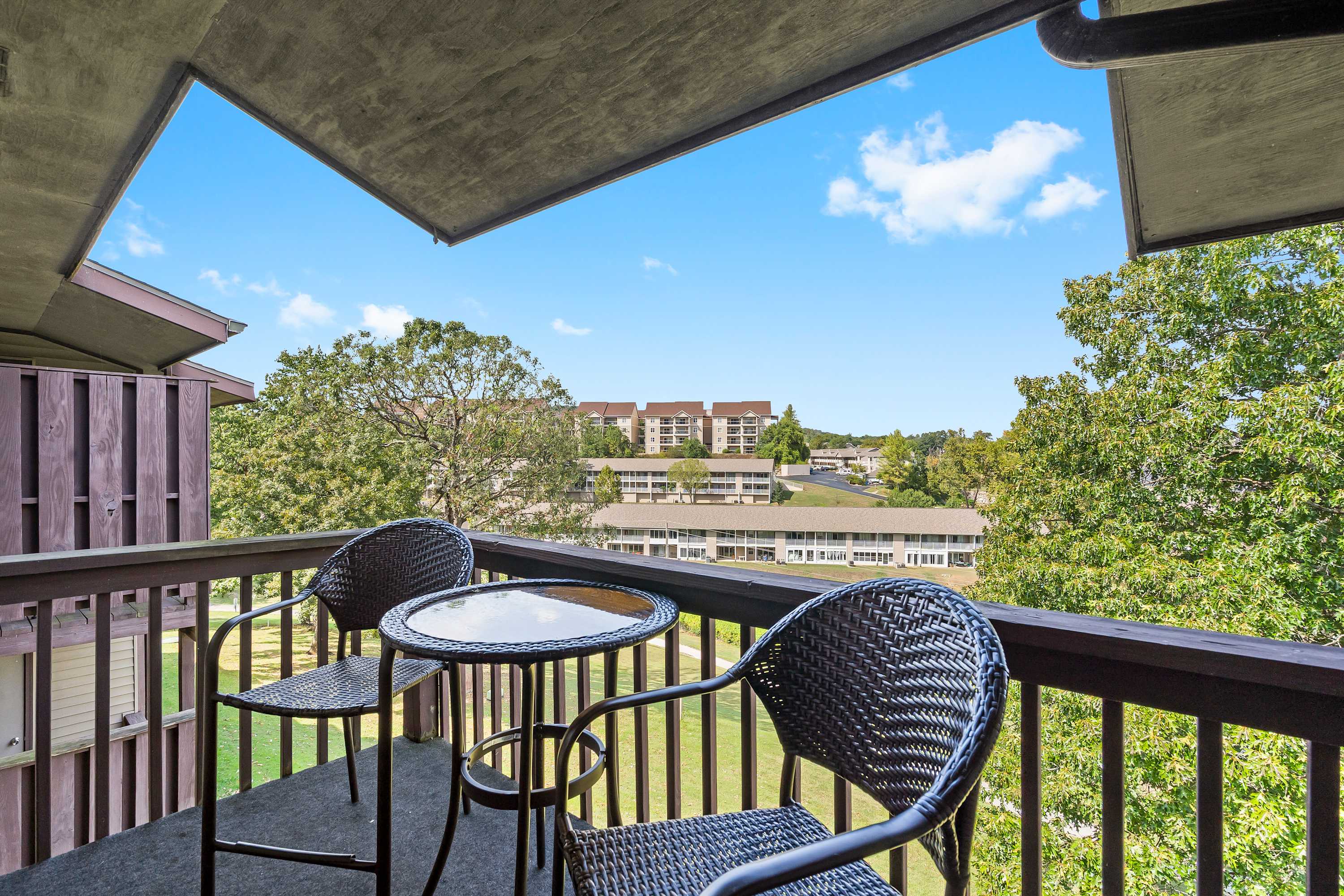 Inside, this home is designed with both couples and small groups in mind, comfortably accommodating up to four guests. The open kitchen makes cooking a pleasure, complete with a Keurig, dark countertops, and counter seating for four, plus all the comforts of home. Gather around the dining table for four to share a meal before heading into the sunlit living room, where a smart TV invites you to kick back and relax. Large doors open to your private covered balcony, where a cozy table for two sets the stage for al fresco dining with serene views—a perfect way to start or end your Branson adventures.