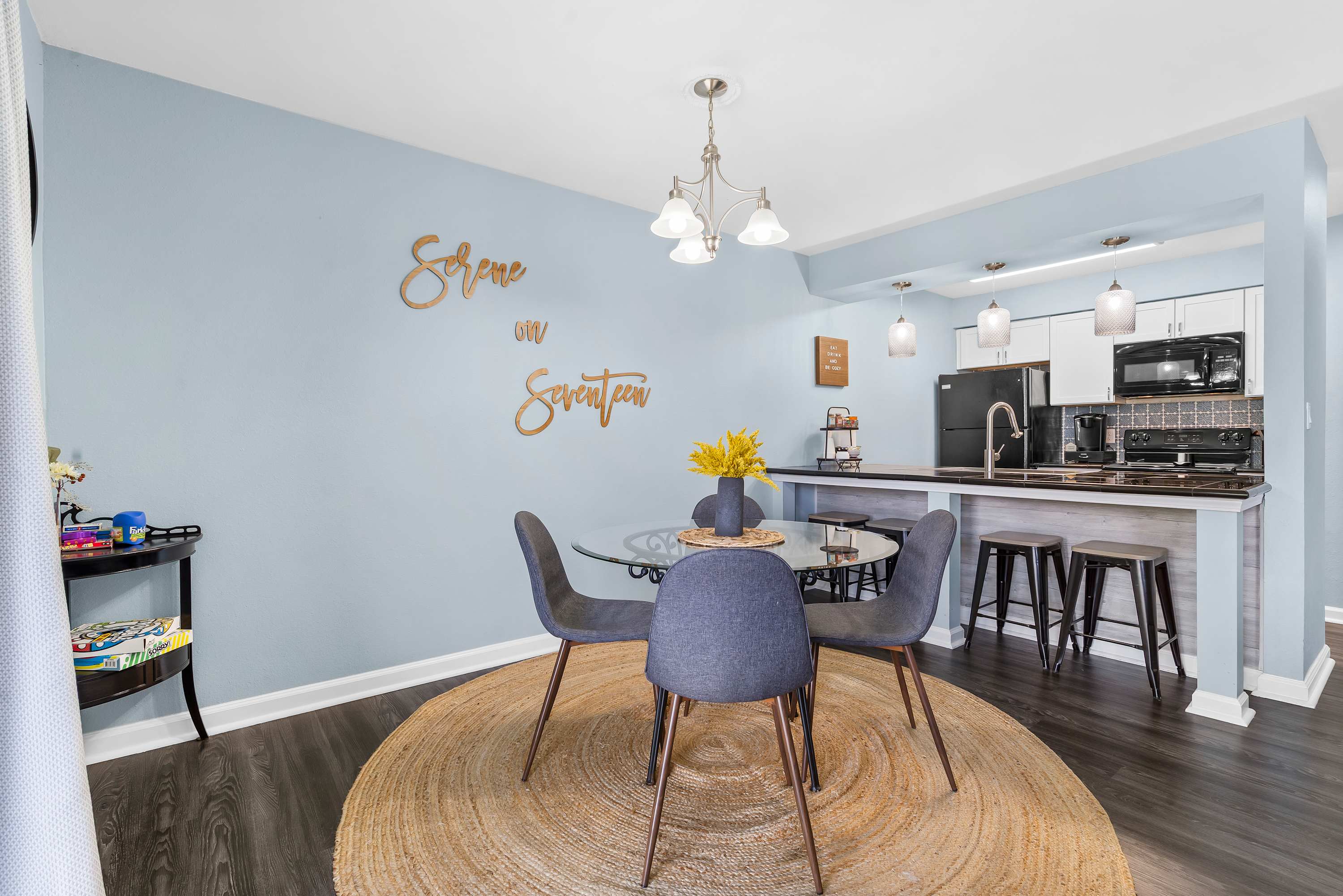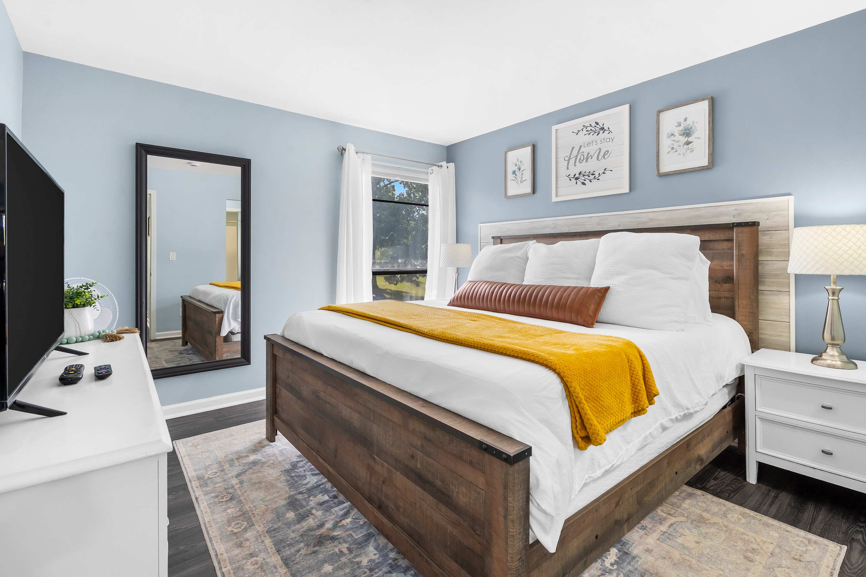 This home comfortably sleeps 4 guests between a private bedroom and a queen-size sleeper sofa in the living room.