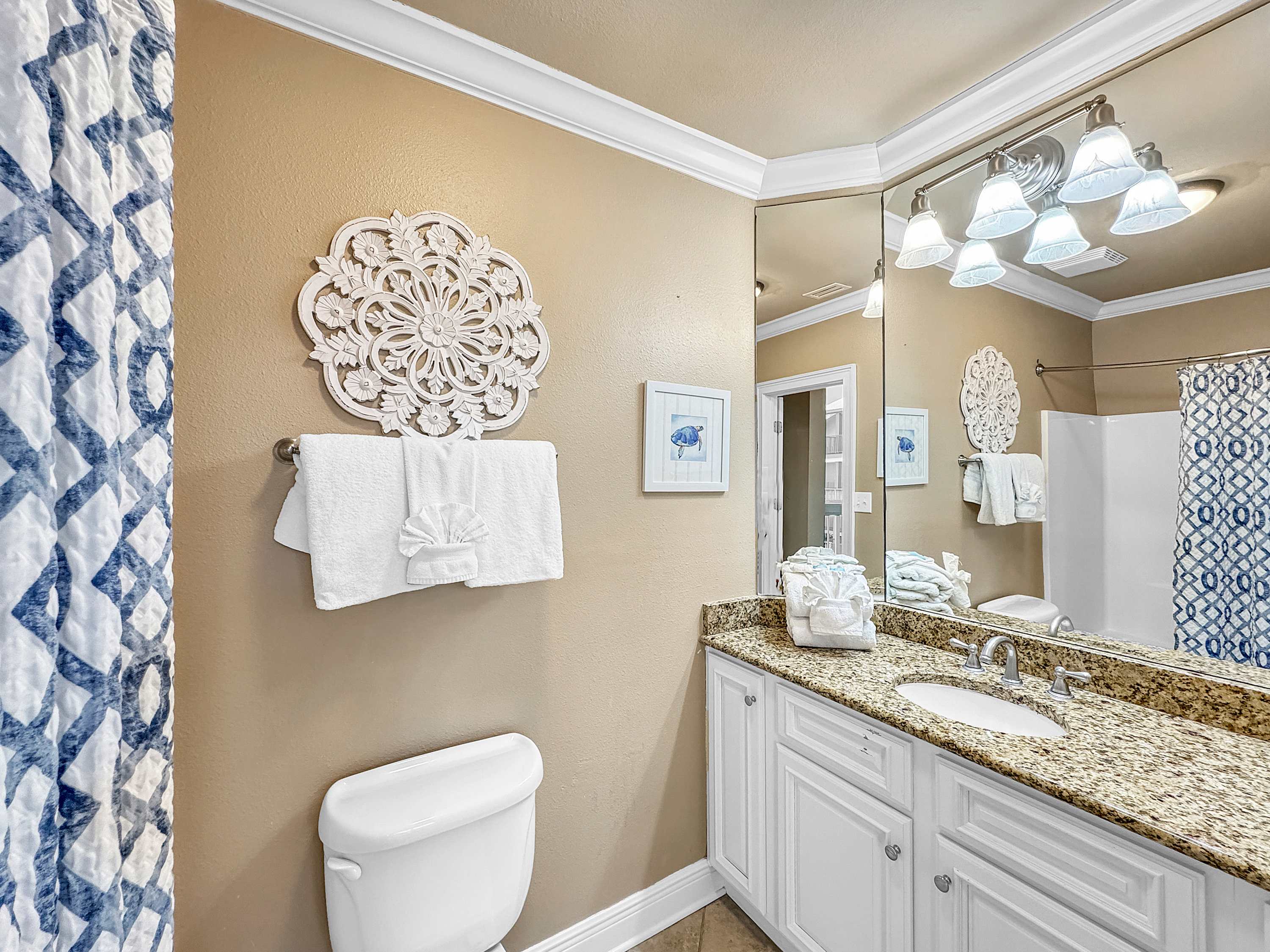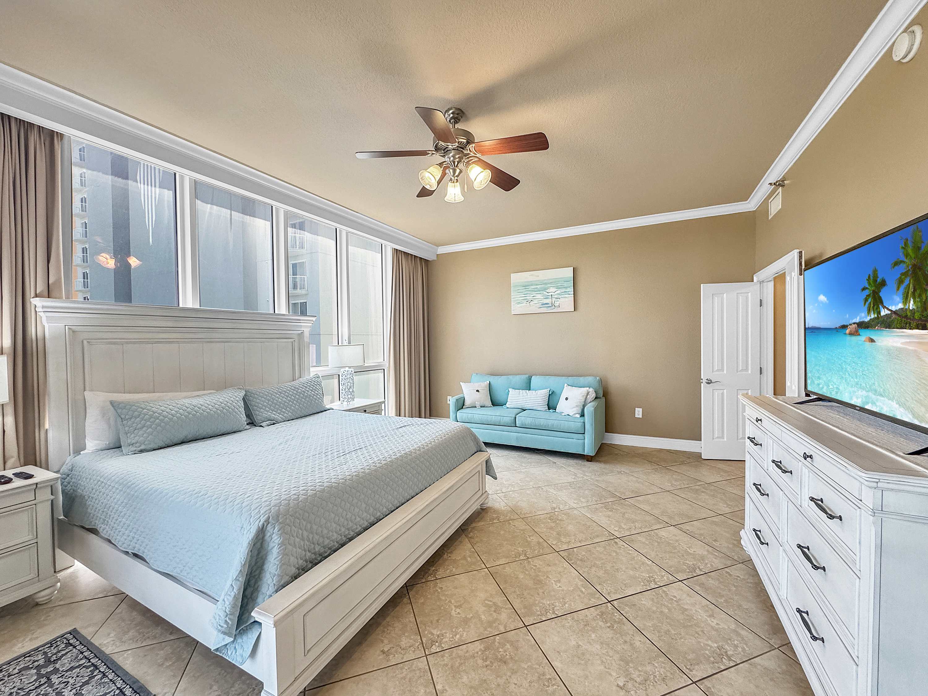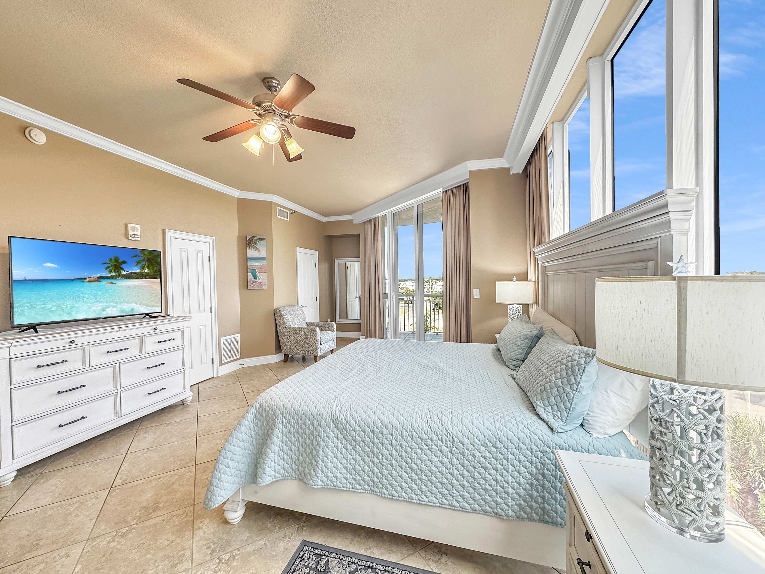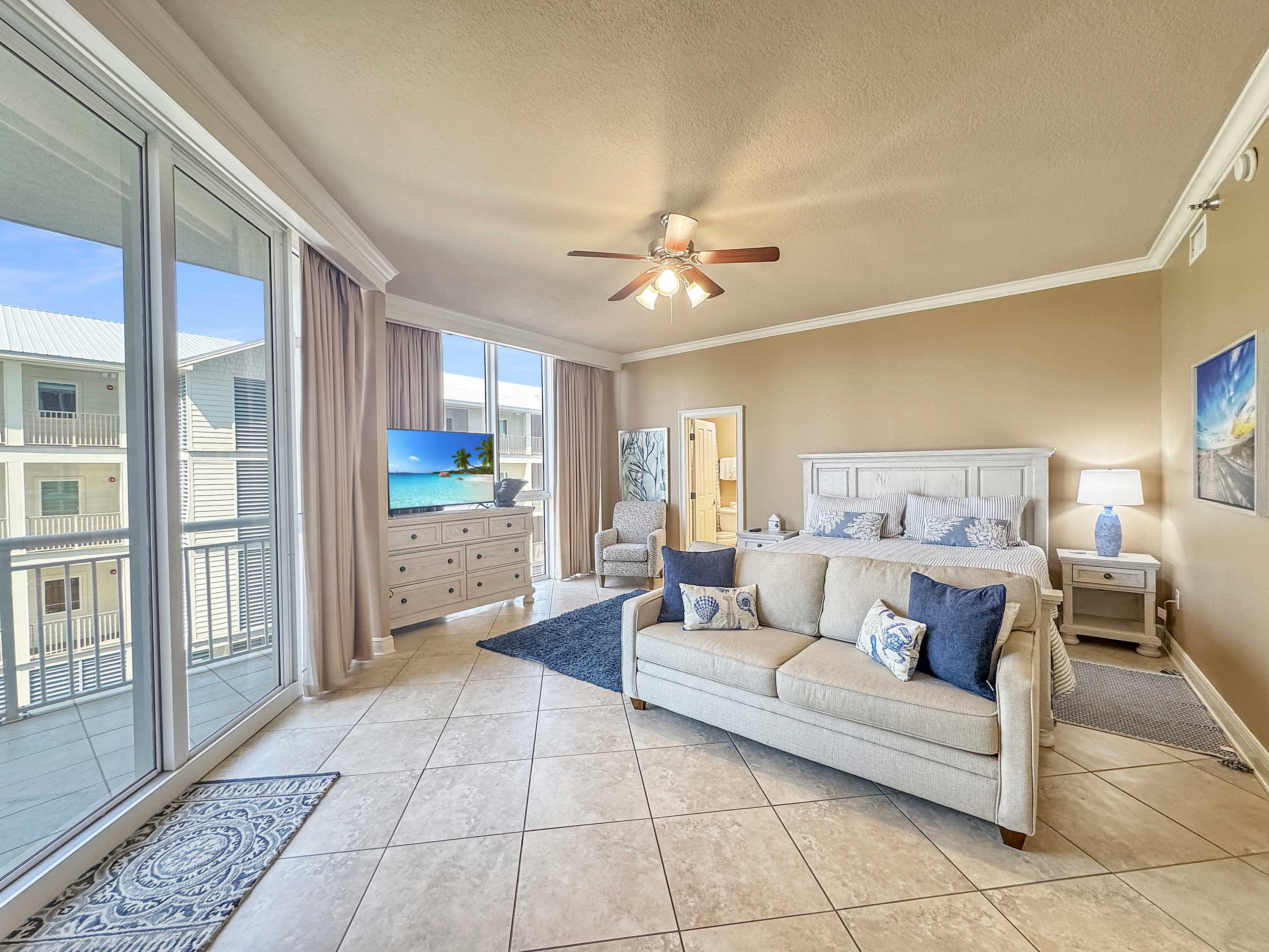 • Bedroom #4: King bed, full-size sleeper sofa, smart TV, balcony access, ensuite bathroom with shower/tub combo