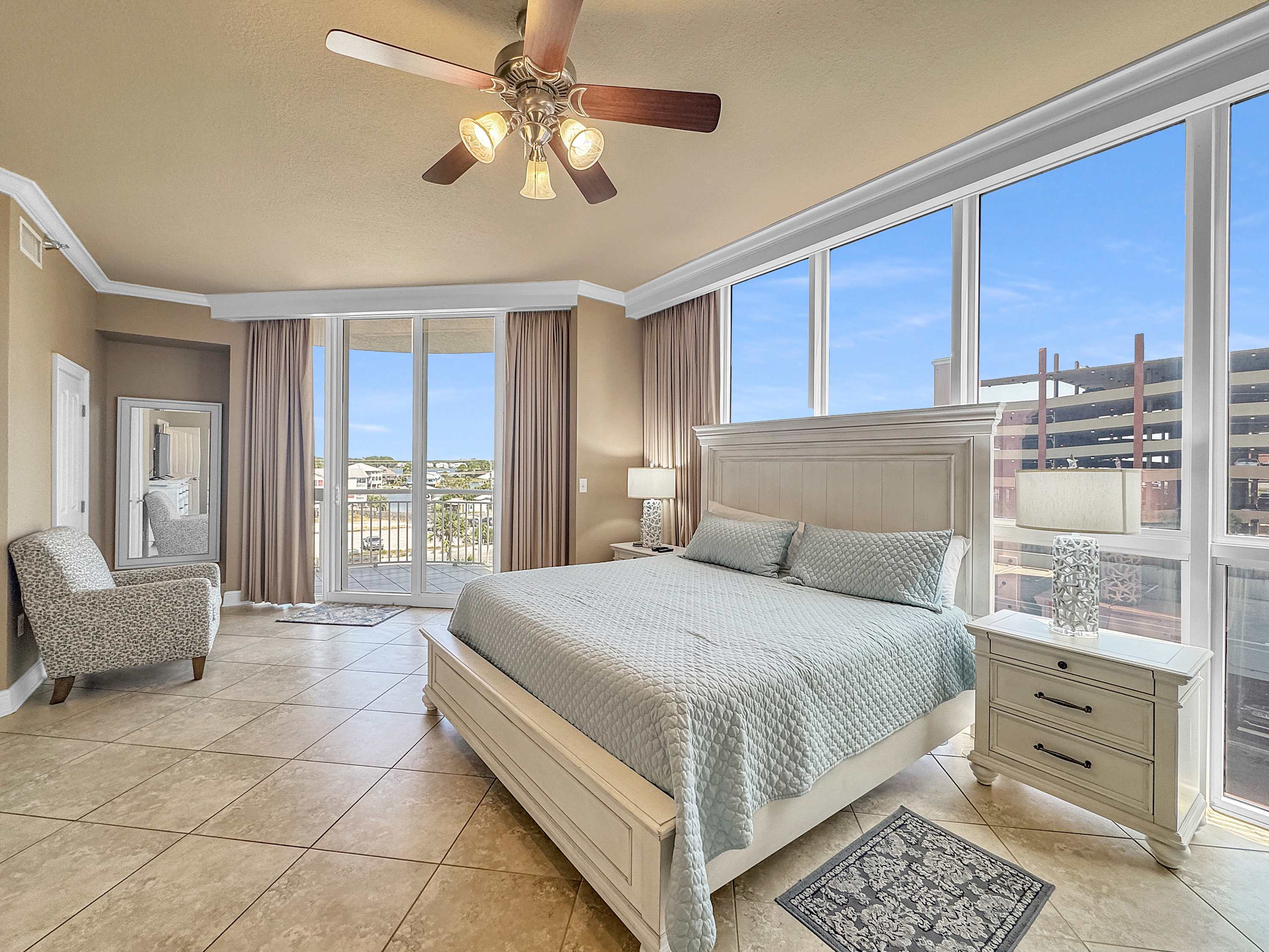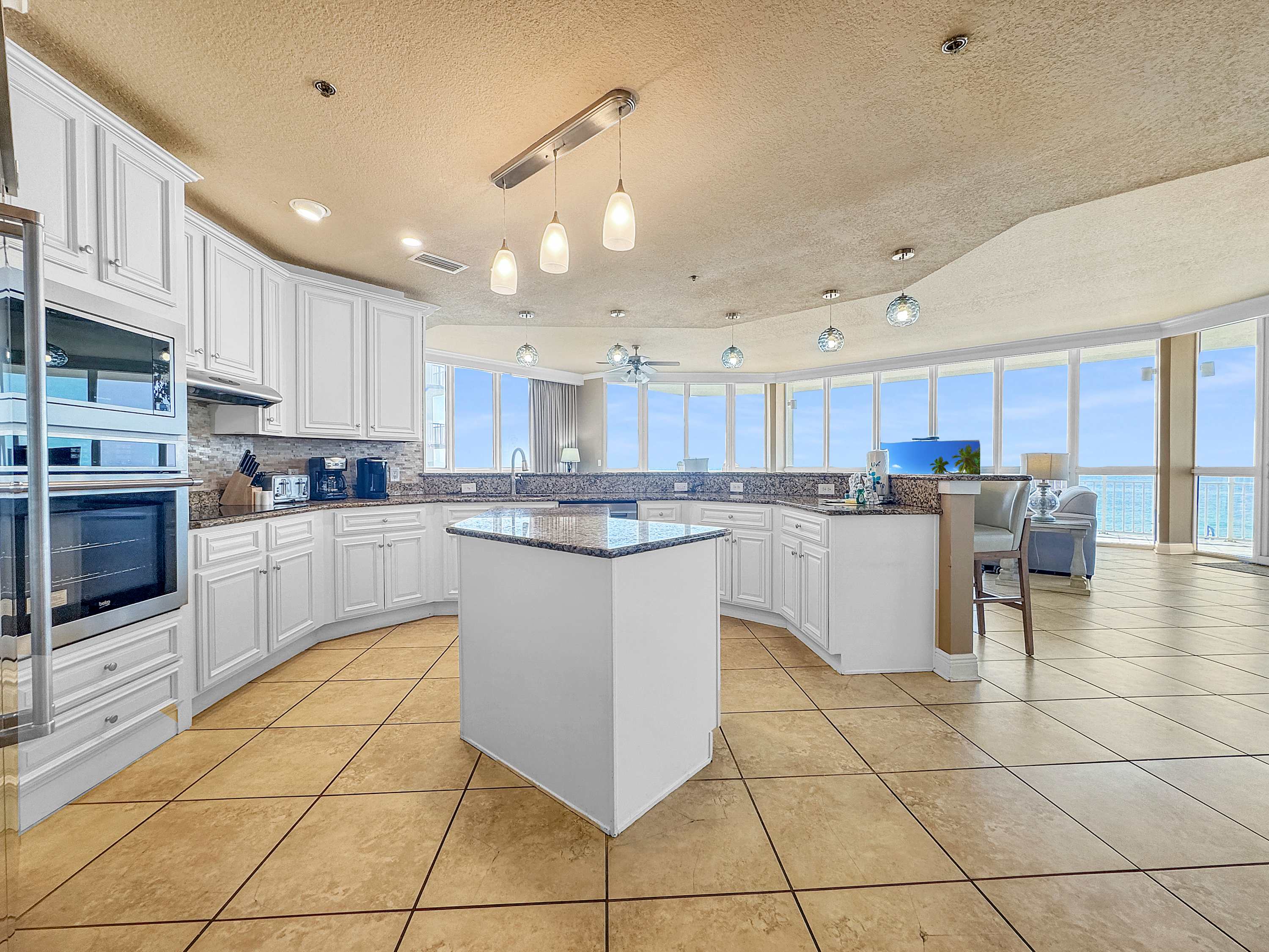 • Floor-to-ceiling windows showcasing the ocean