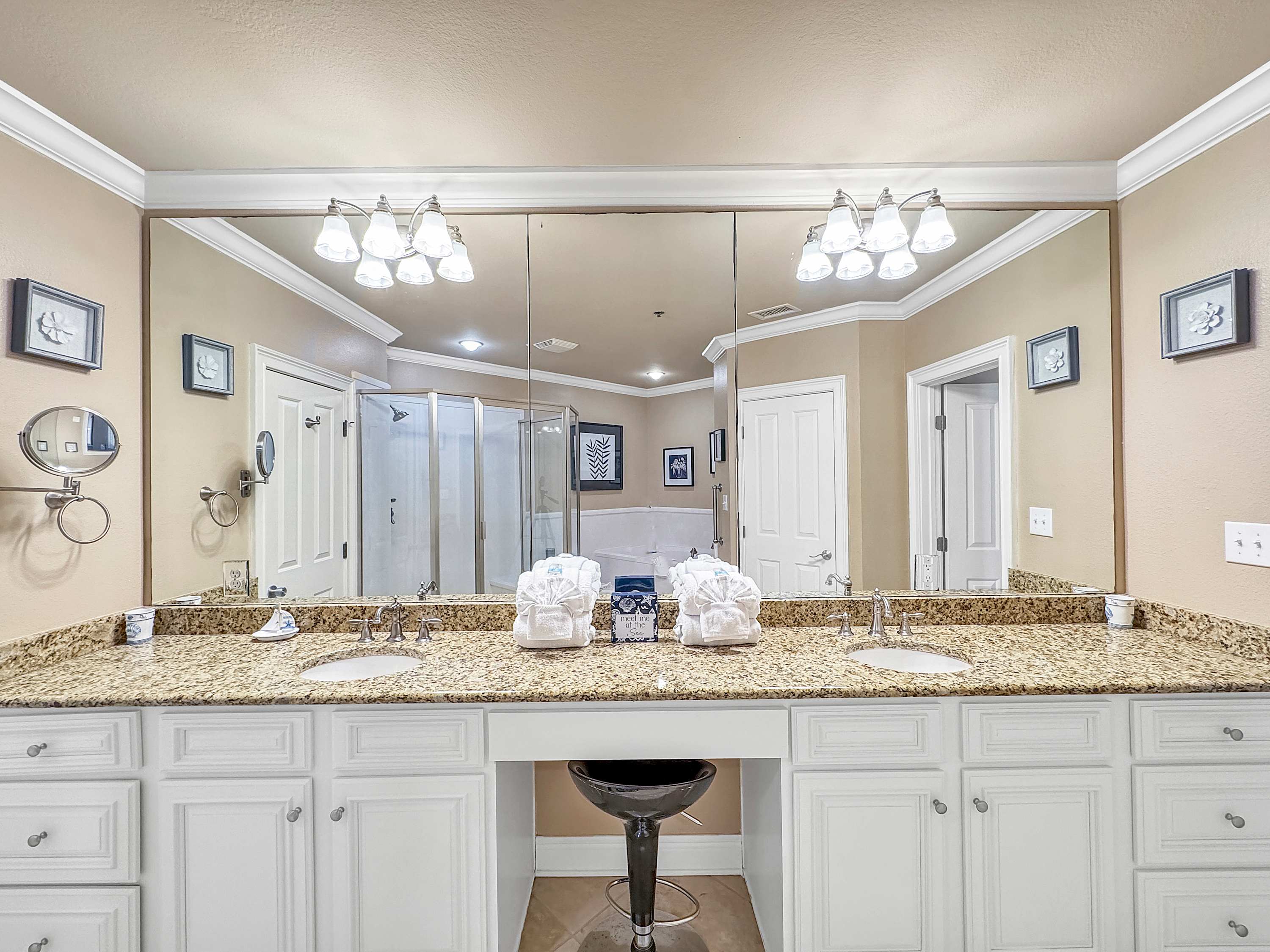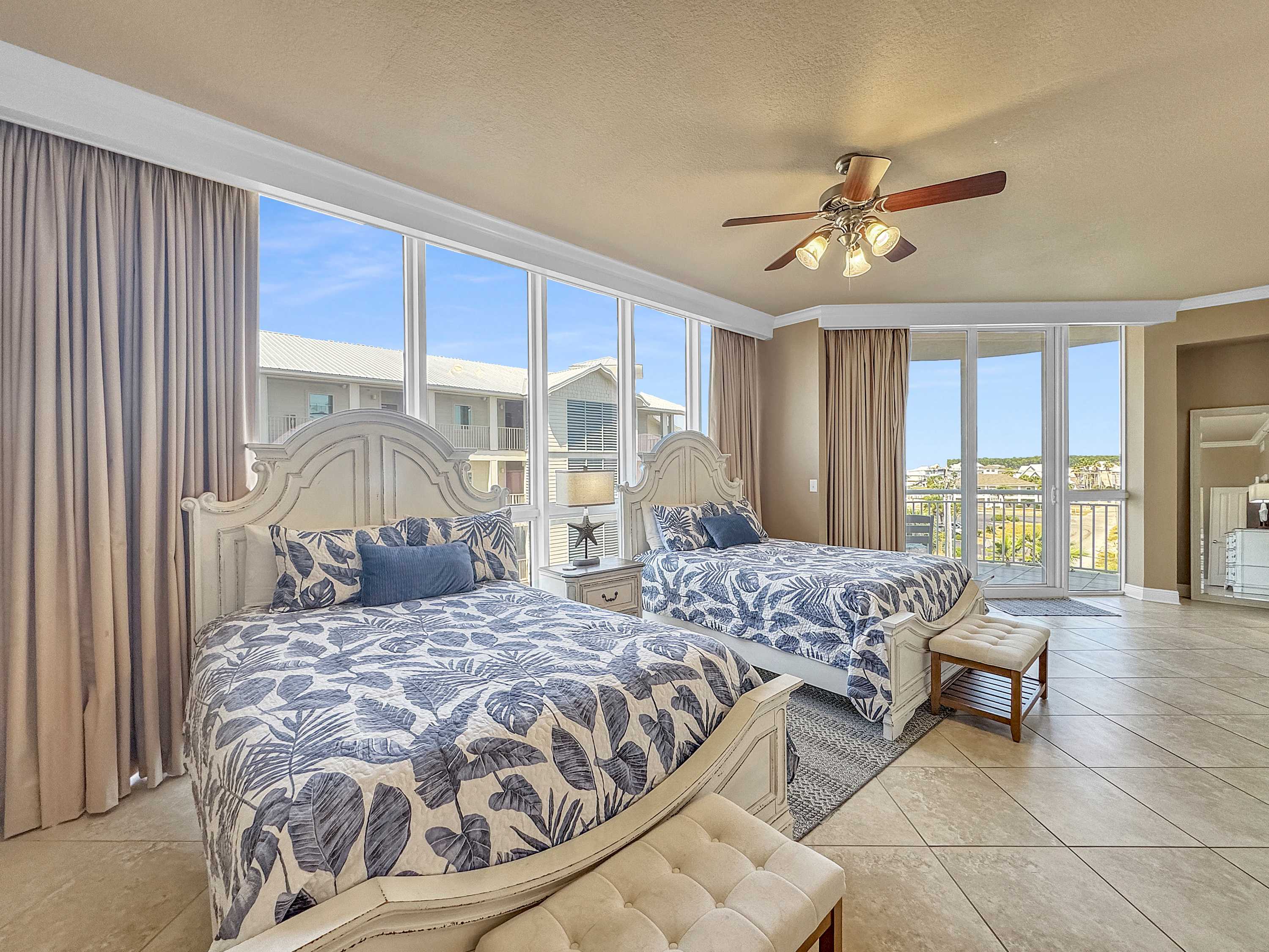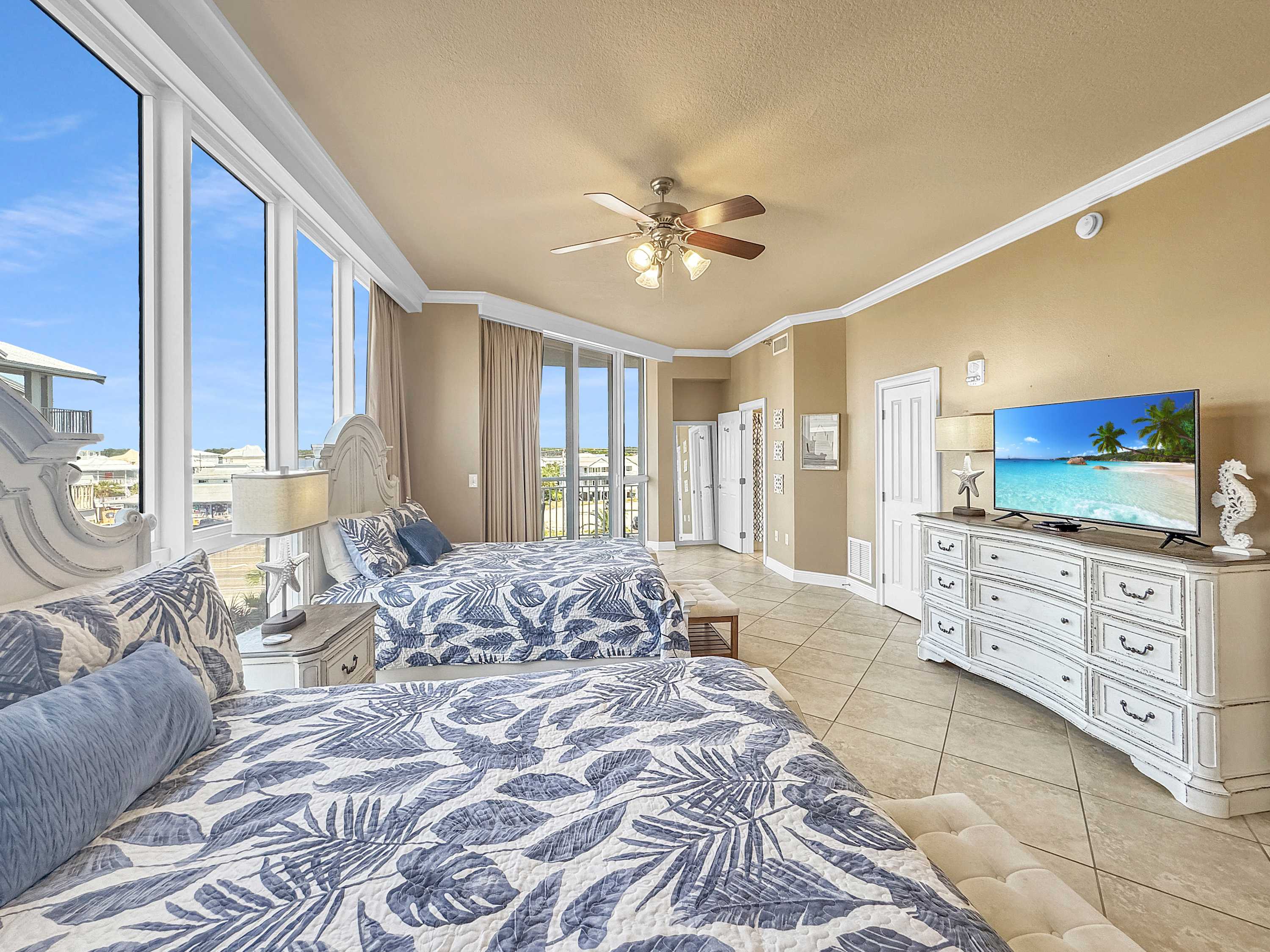 • Bedroom #3: Two queen beds, smart TV, balcony access, ensuite bathroom with shower/tub combo