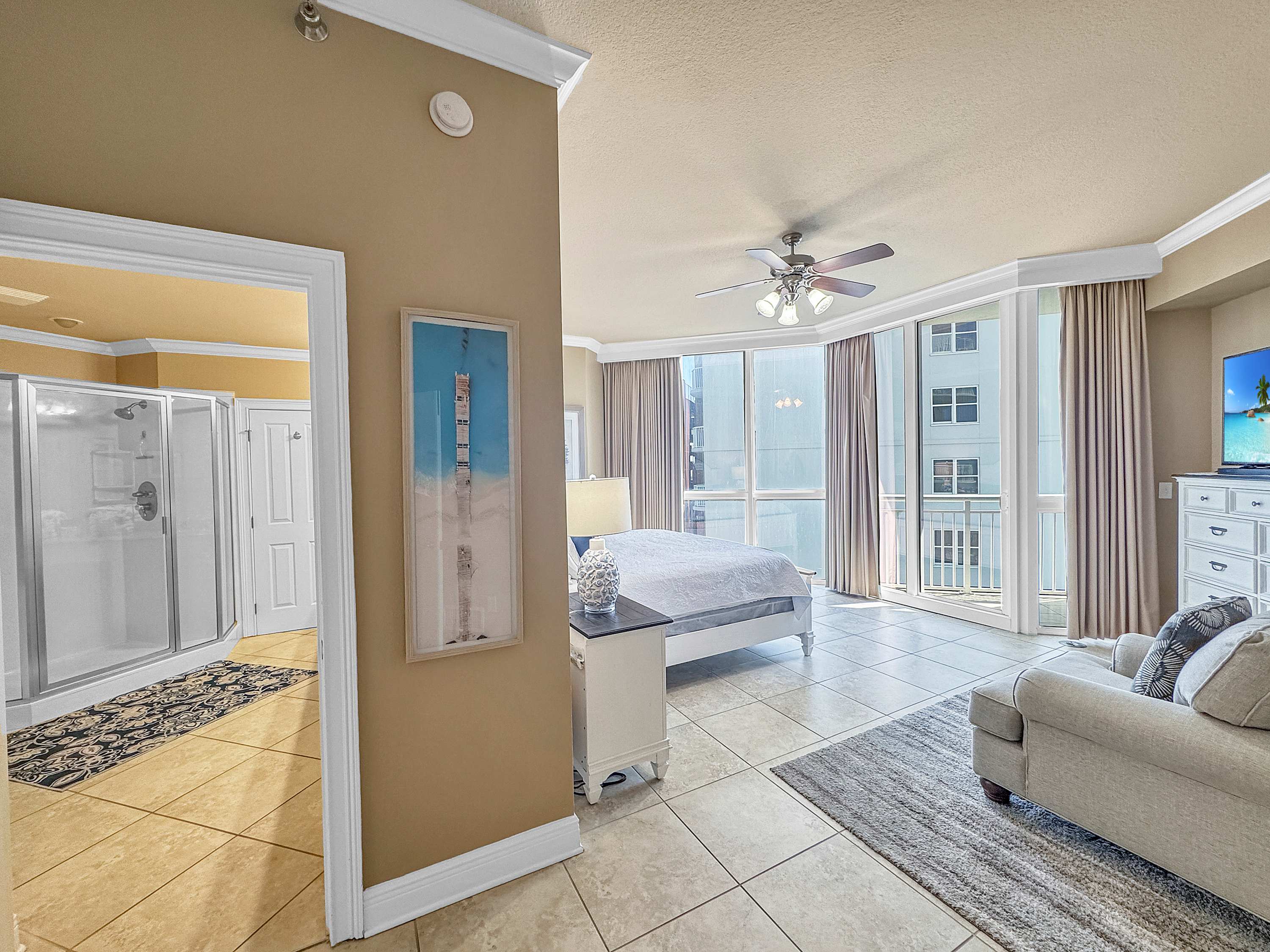 • Bedroom #2: King bed, full-size sleeper sofa, smart TV, balcony access, ensuite bathroom with shower/tub combo