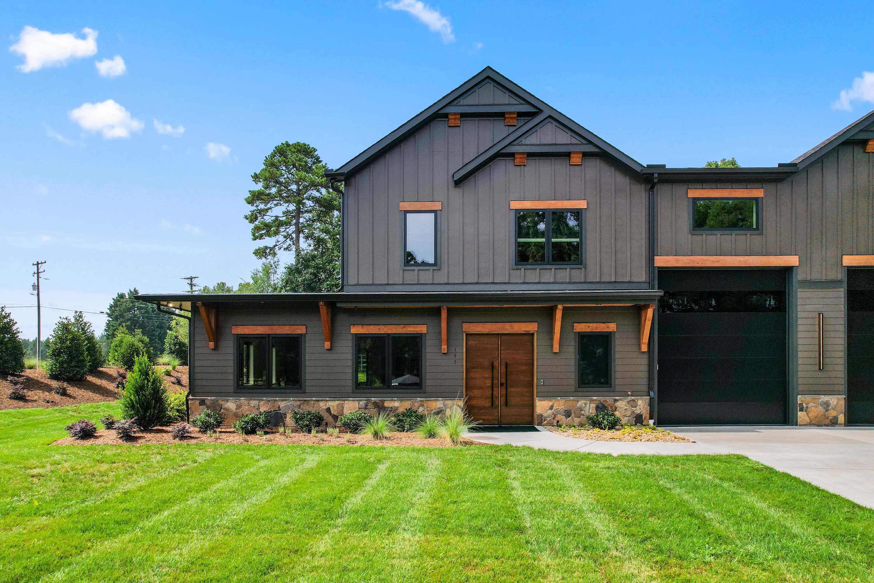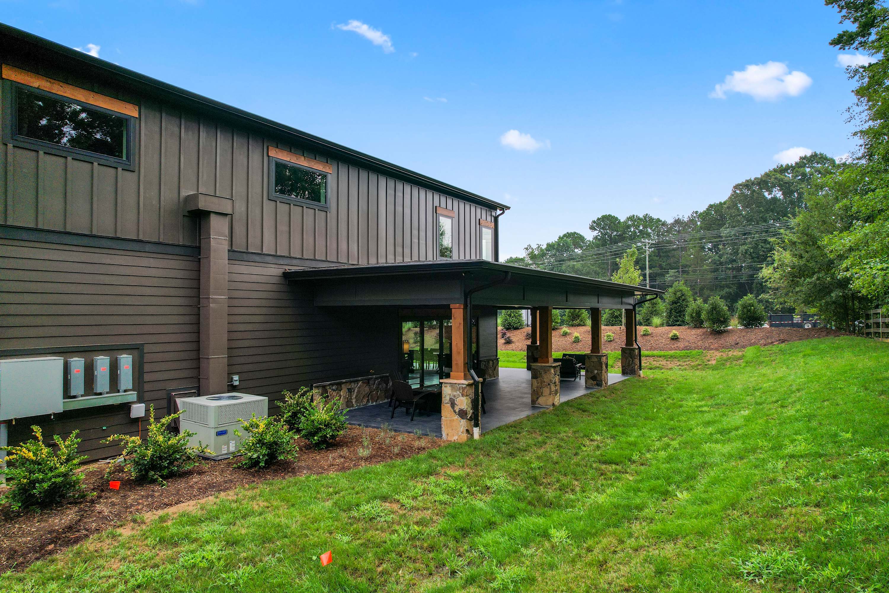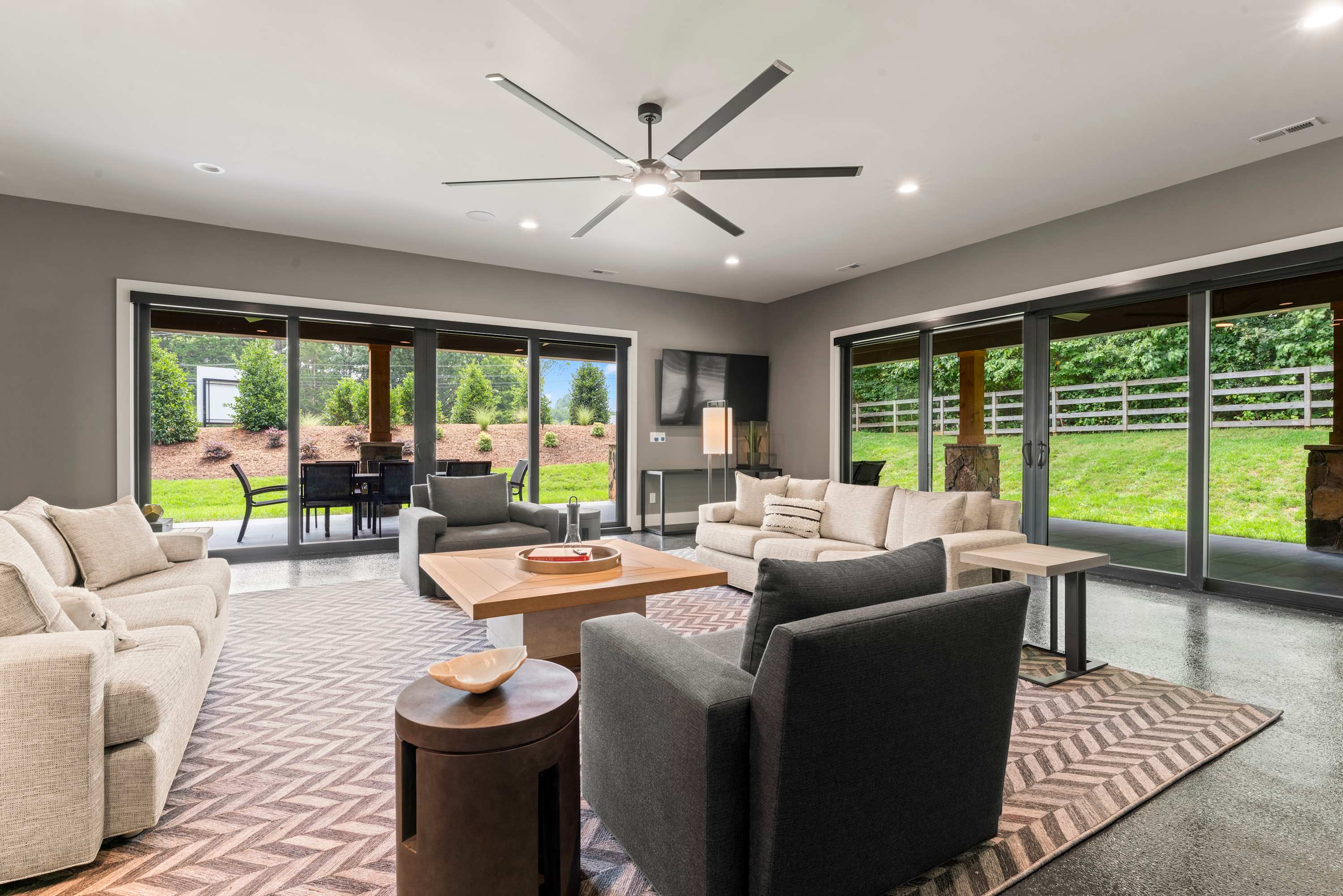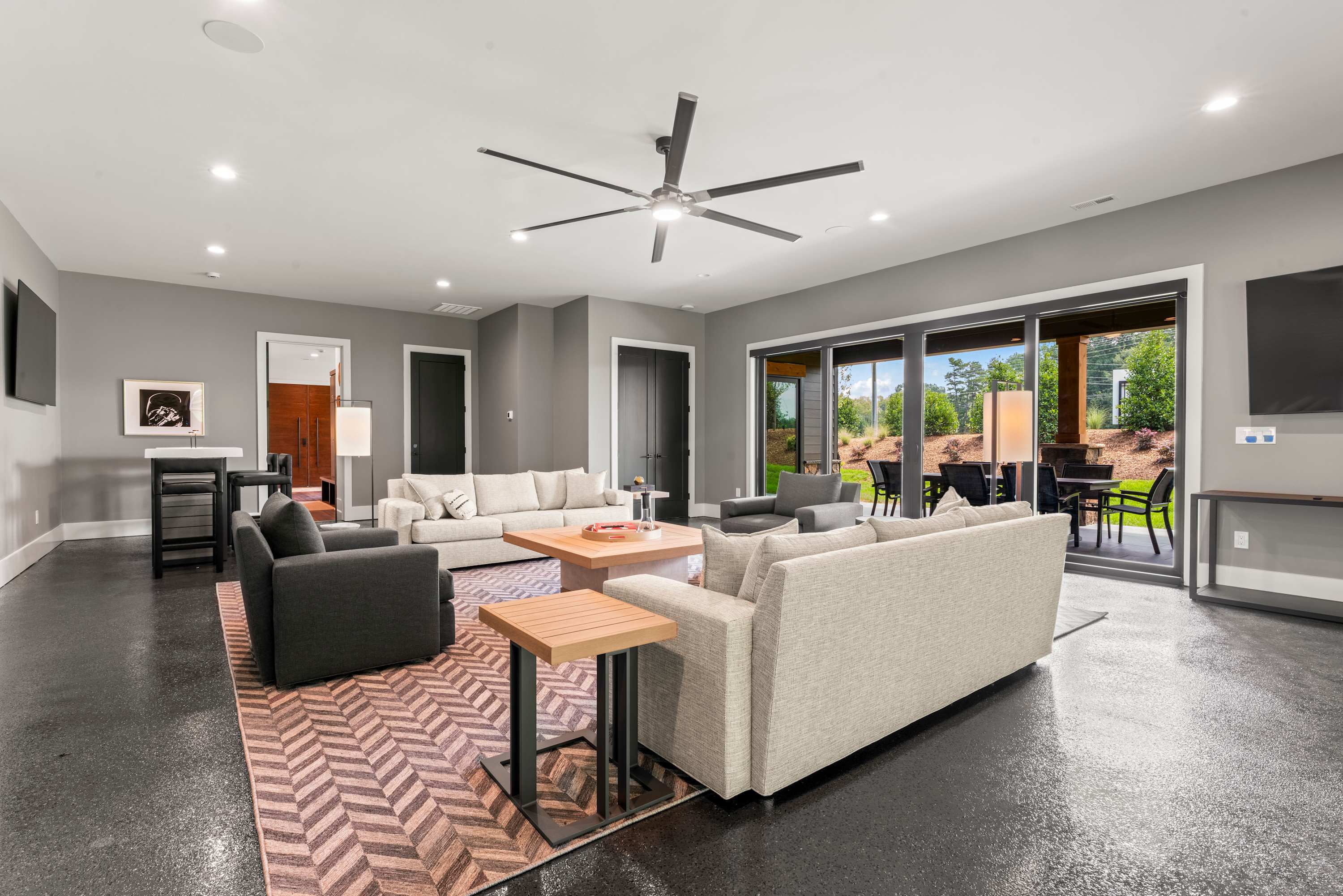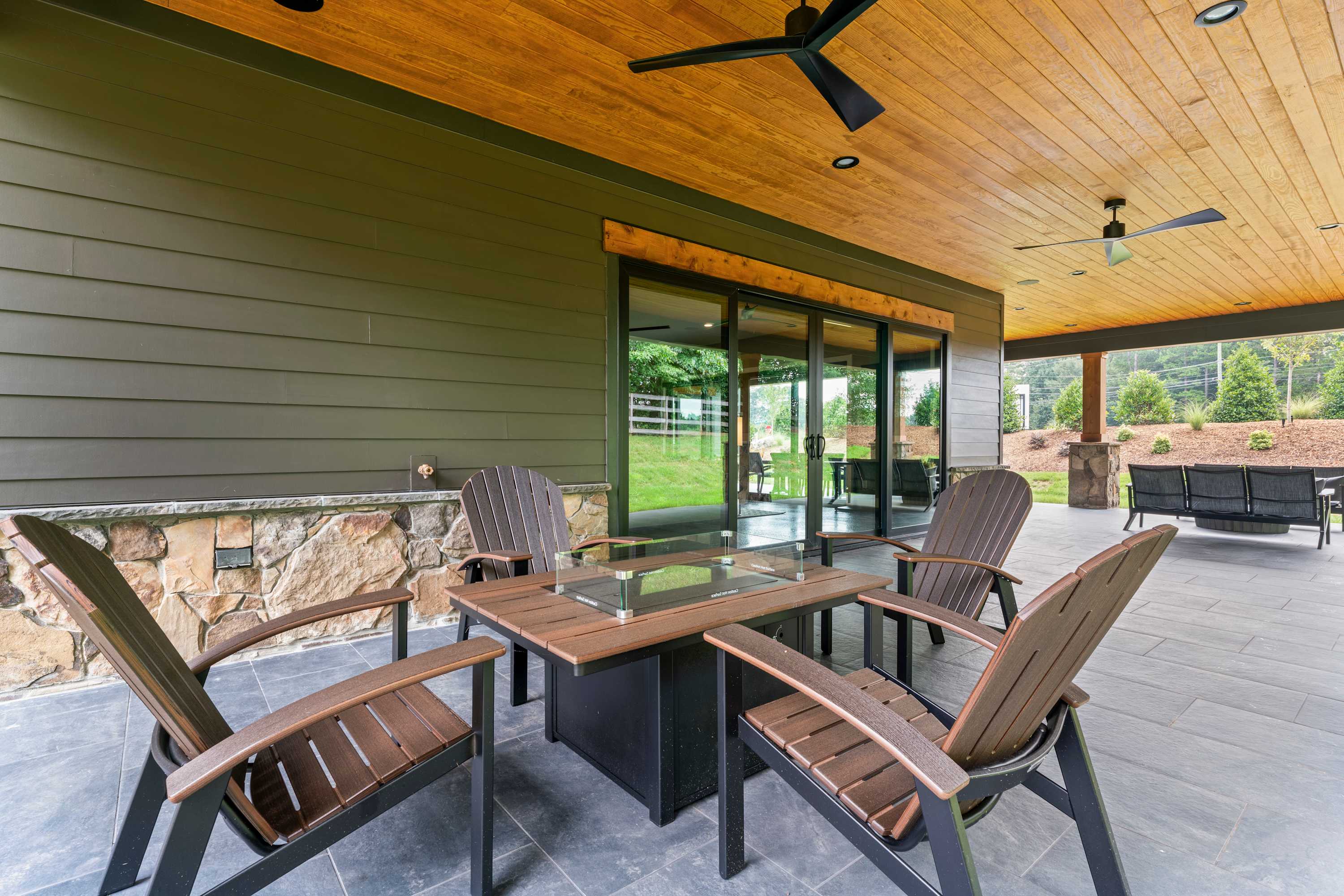 Inside this luxe modern home, every detail is designed for comfort and style. The front sitting area welcomes you with four swivel chairs around a small table—ideal for conversation—alongside a large wraparound couch, smart TV, and a sleek wet bar for evening drinks. The kitchen feels warm and inviting, featuring stainless steel appliances, a hooded vent above the stove, and a spacious island with seating for three. Nearby, the dining area with its round table for four flows seamlessly into the second living room, where a cozy couch, two swivel chairs, and a smart TV invite relaxation. Step outside to the covered patio that wraps around the back and side of the house, offering abundant seating, a dining table for eight, and a firepit—the perfect setting for al fresco meals, laughter with friends, or simply enjoying the peaceful Carolina evenings.