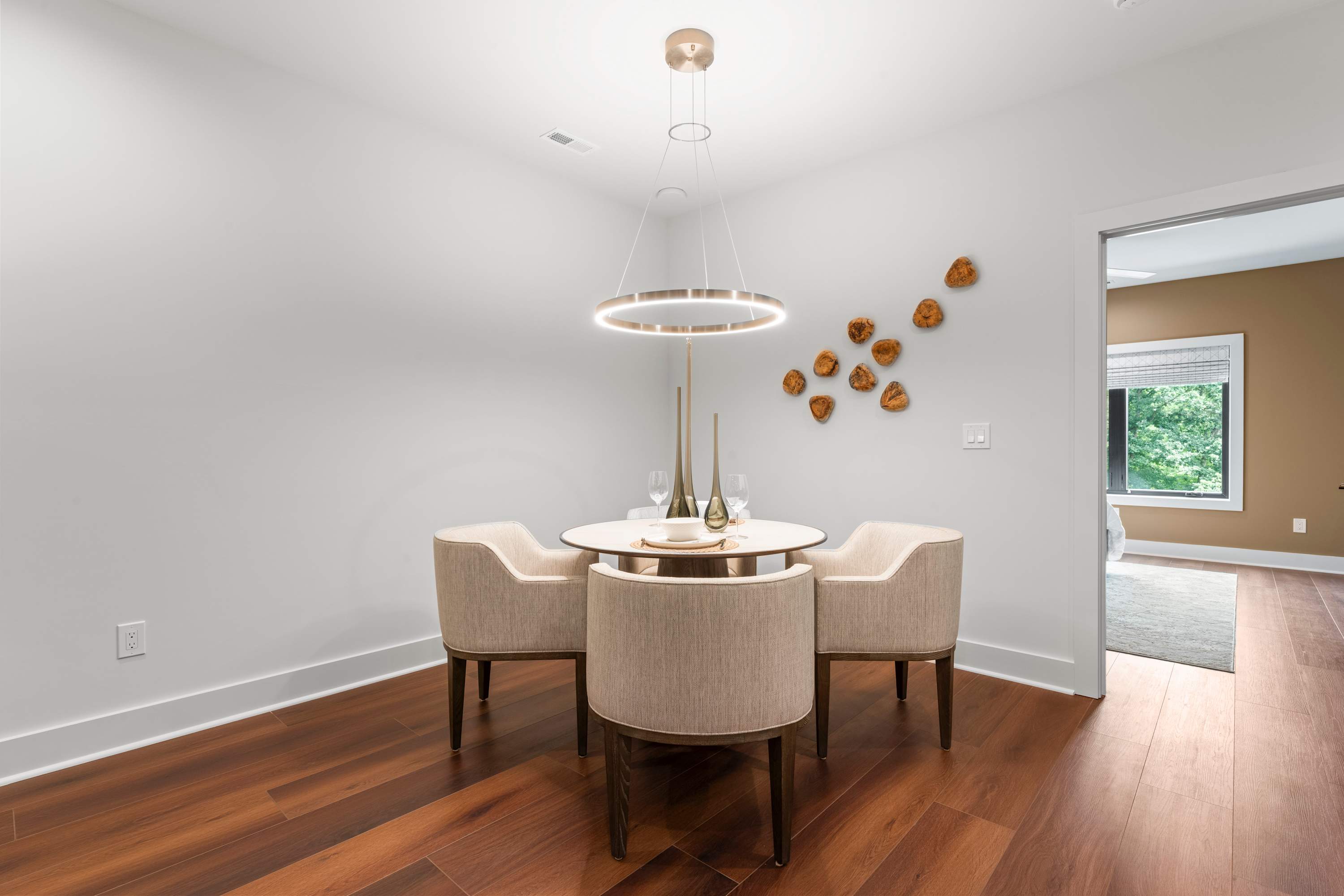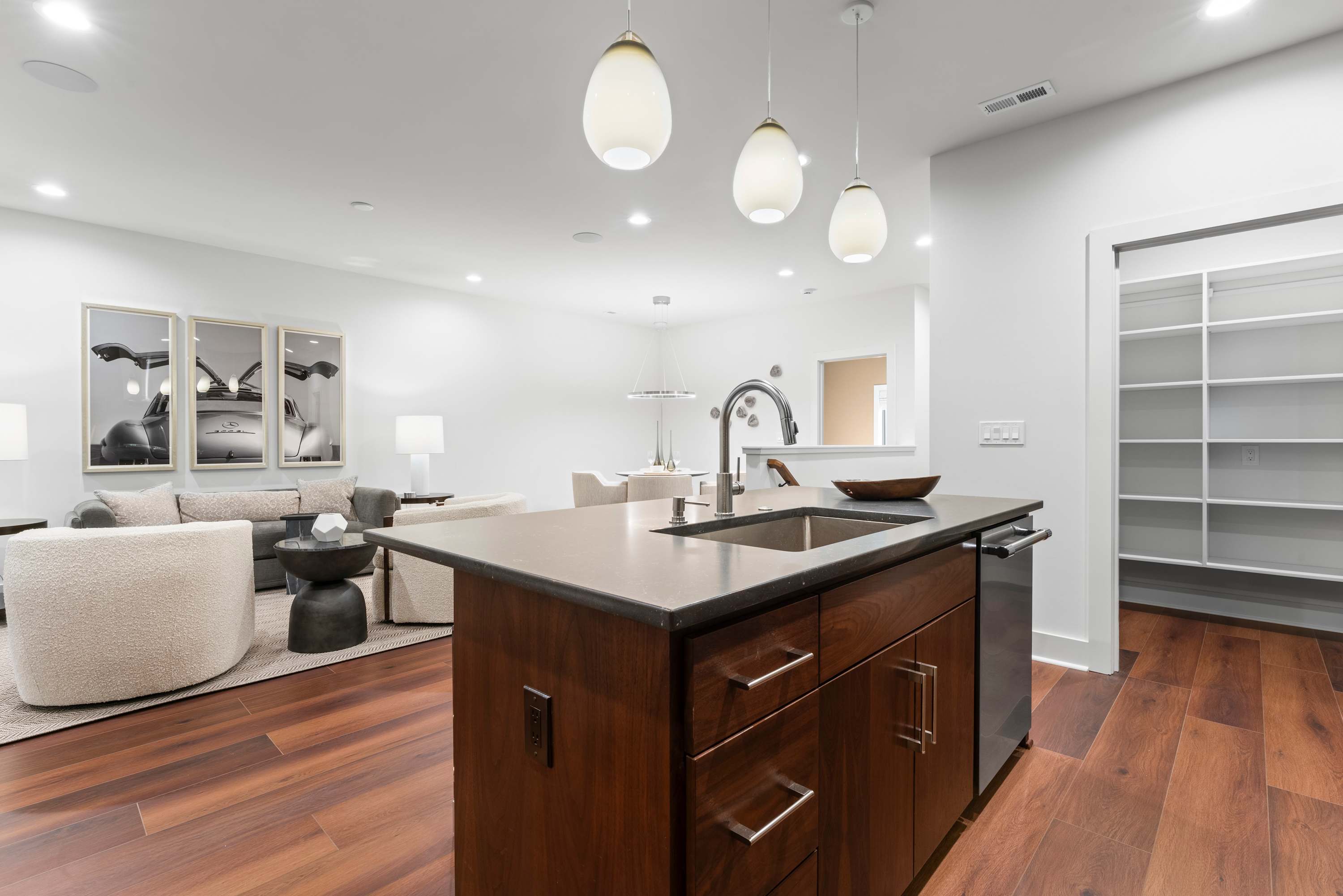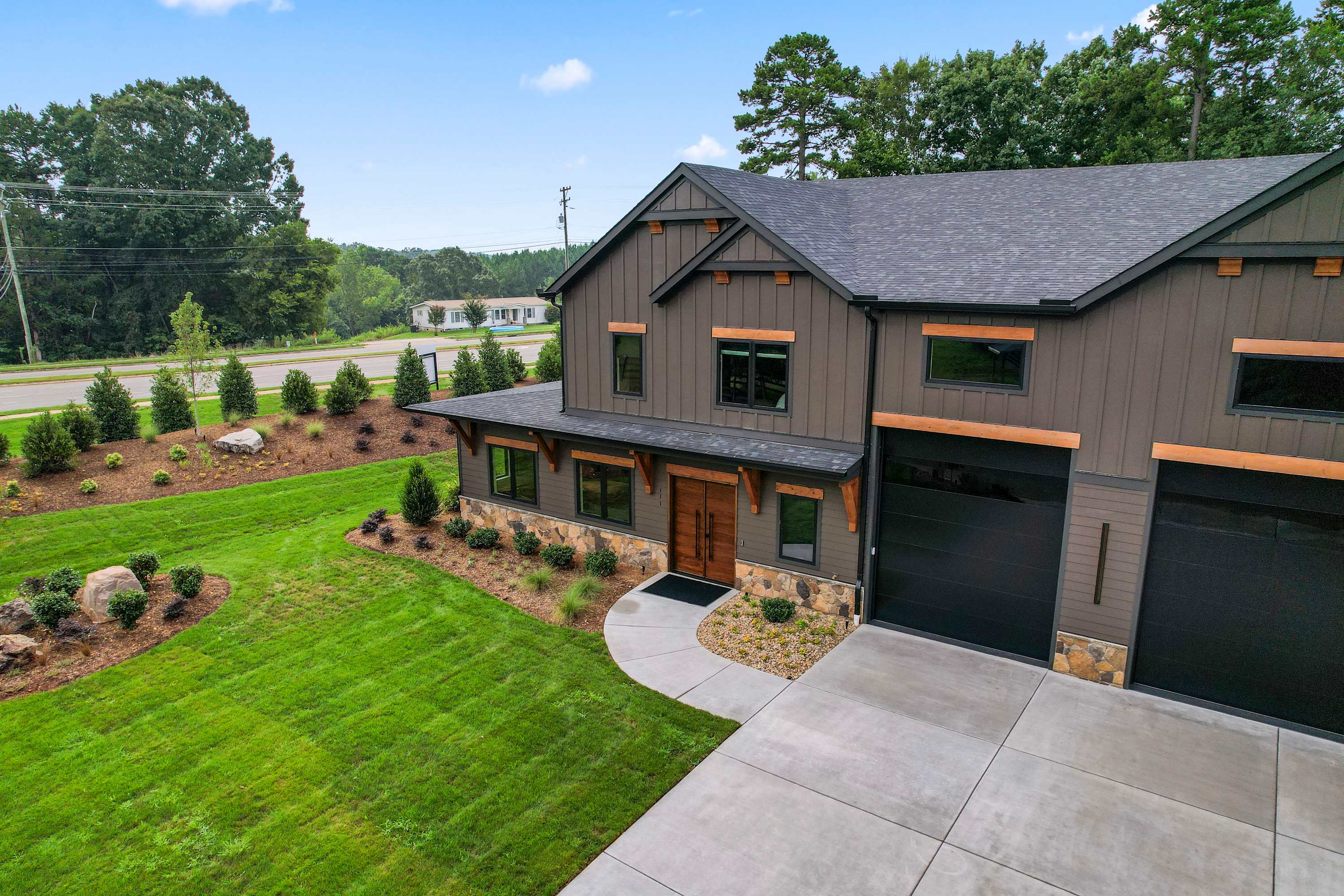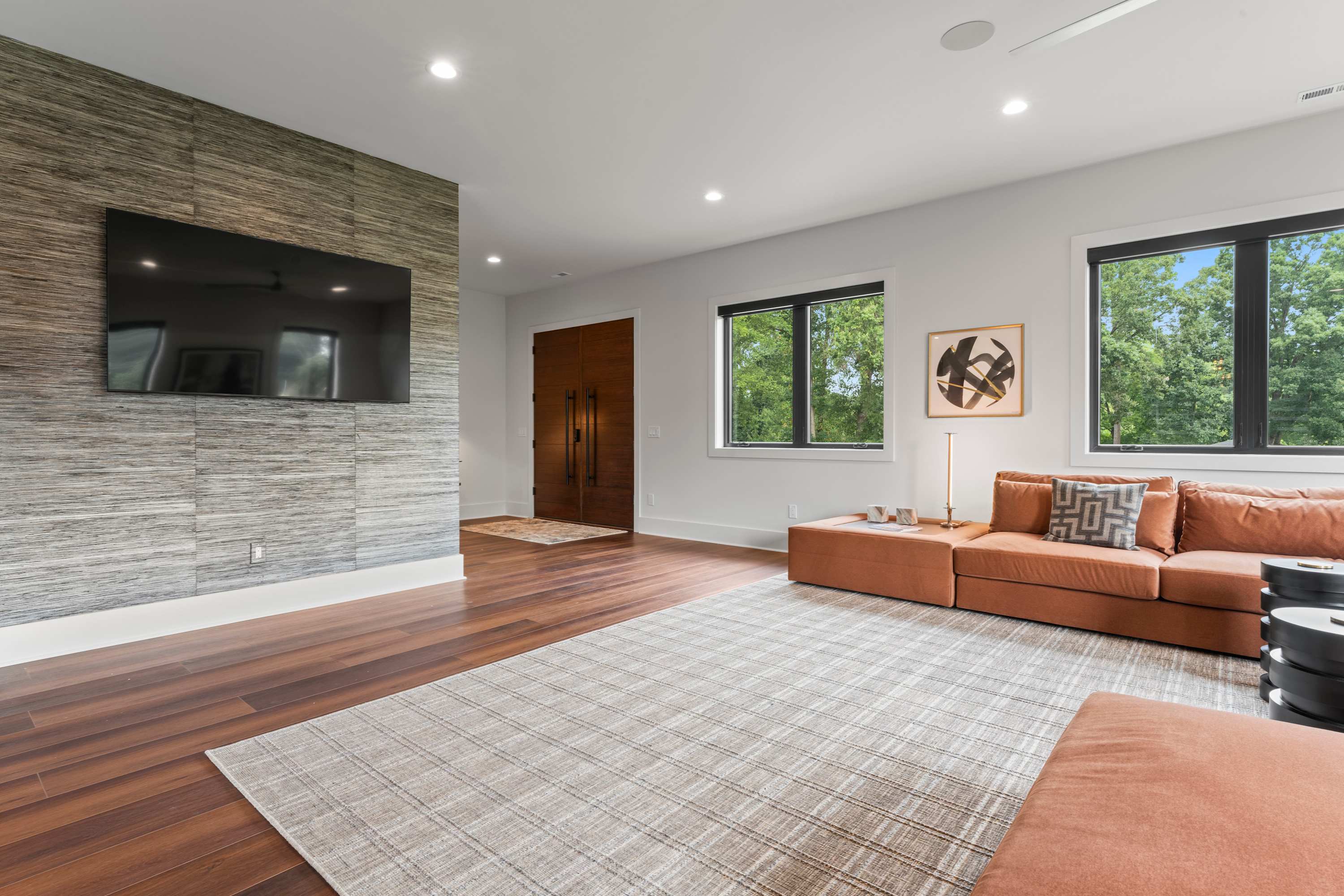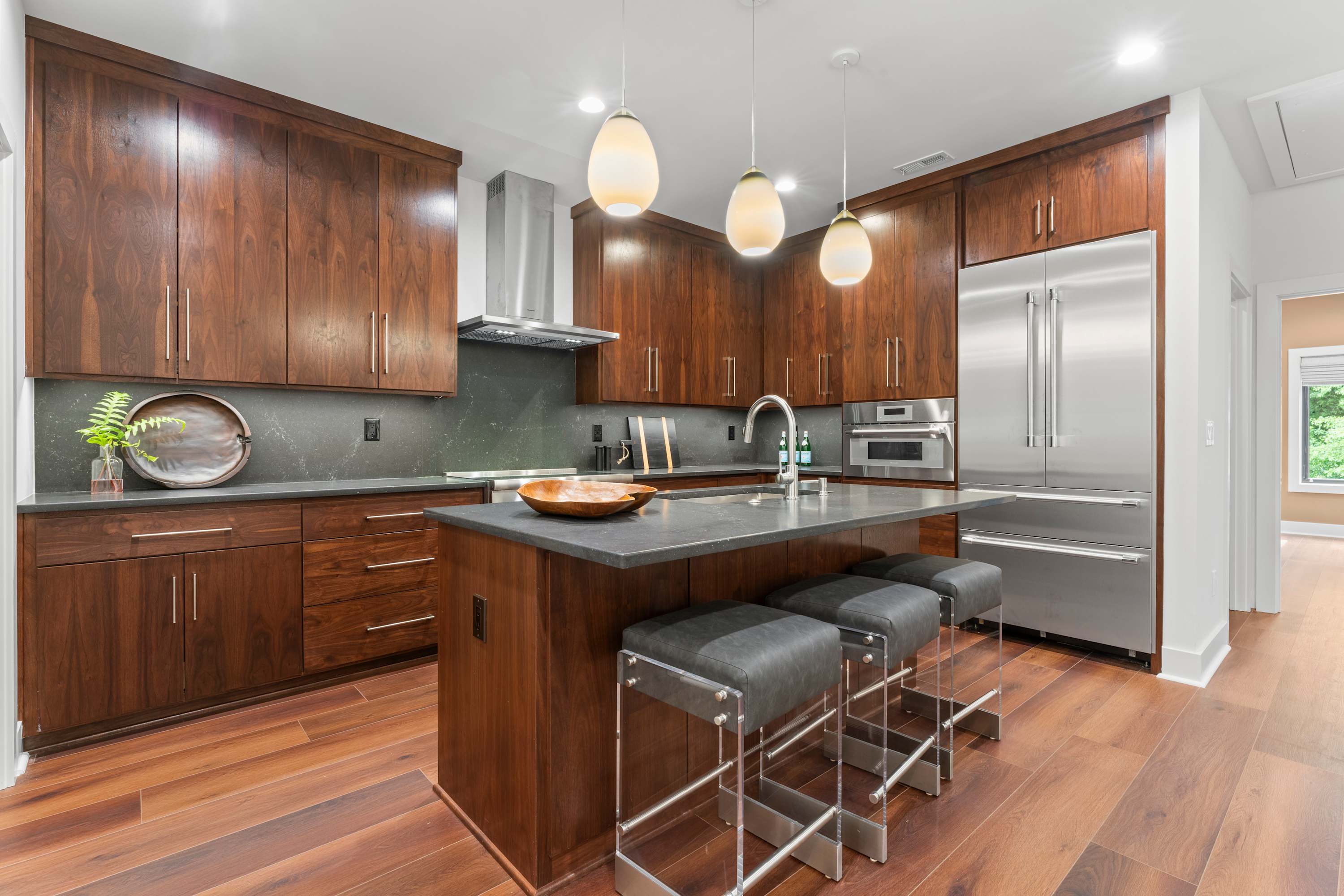 Inside this luxe modern home, every detail is designed for comfort and style. The front sitting area welcomes you with four swivel chairs around a small table—ideal for conversation—alongside a large wraparound couch, smart TV, and a sleek wet bar for evening drinks. The kitchen feels warm and inviting, featuring stainless steel appliances, a hooded vent above the stove, and a spacious island with seating for three. Nearby, the dining area with its round table for four flows seamlessly into the second living room, where a cozy couch, two swivel chairs, and a smart TV invite relaxation. Step outside to the covered patio that wraps around the back and side of the house, offering abundant seating, a dining table for eight, and a firepit—the perfect setting for al fresco meals, laughter with friends, or simply enjoying the peaceful Carolina evenings.