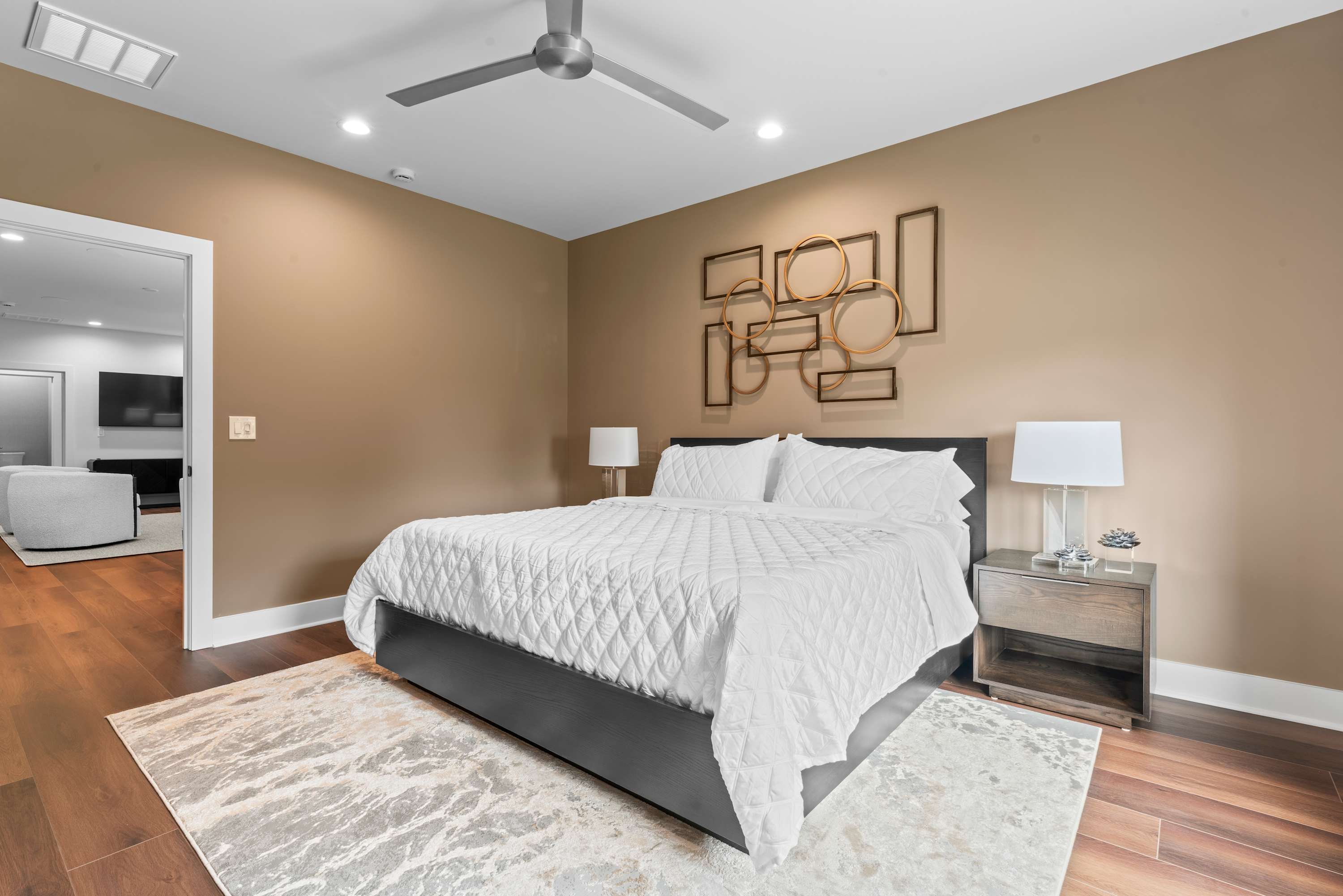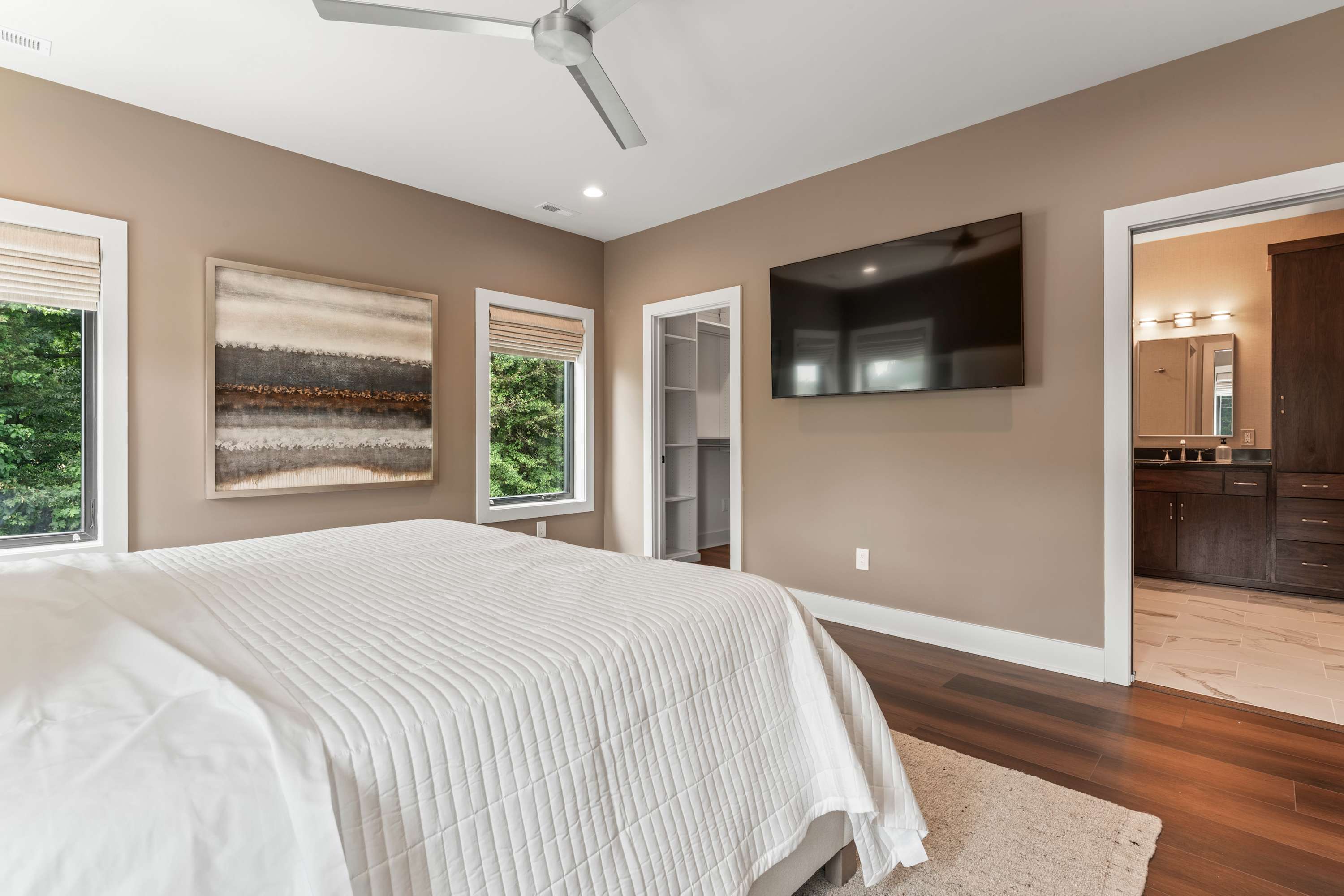 Bedroom #1 includes a king size bed and an ensuite bathroom with a single vanity and a walk-in shower.