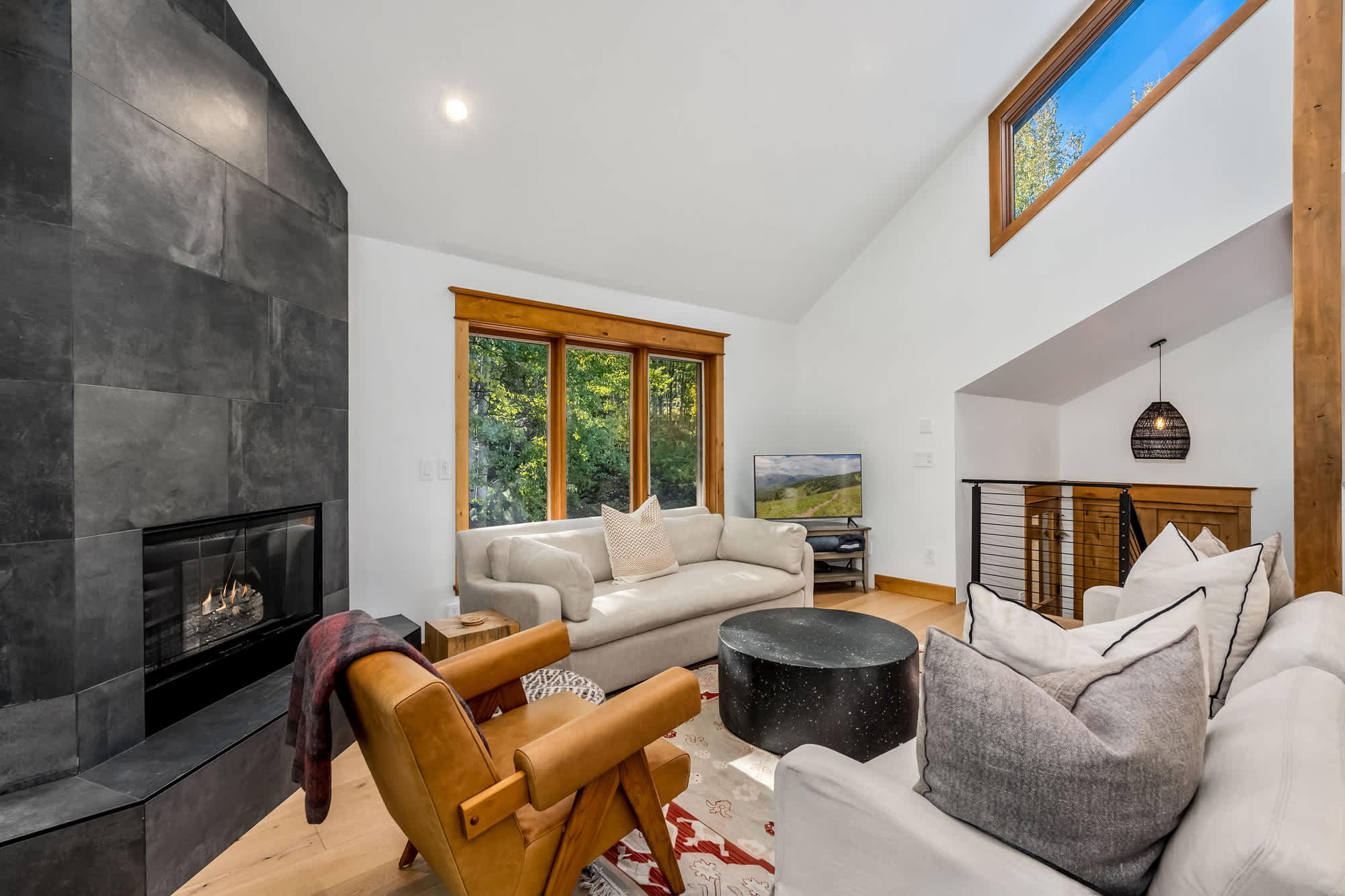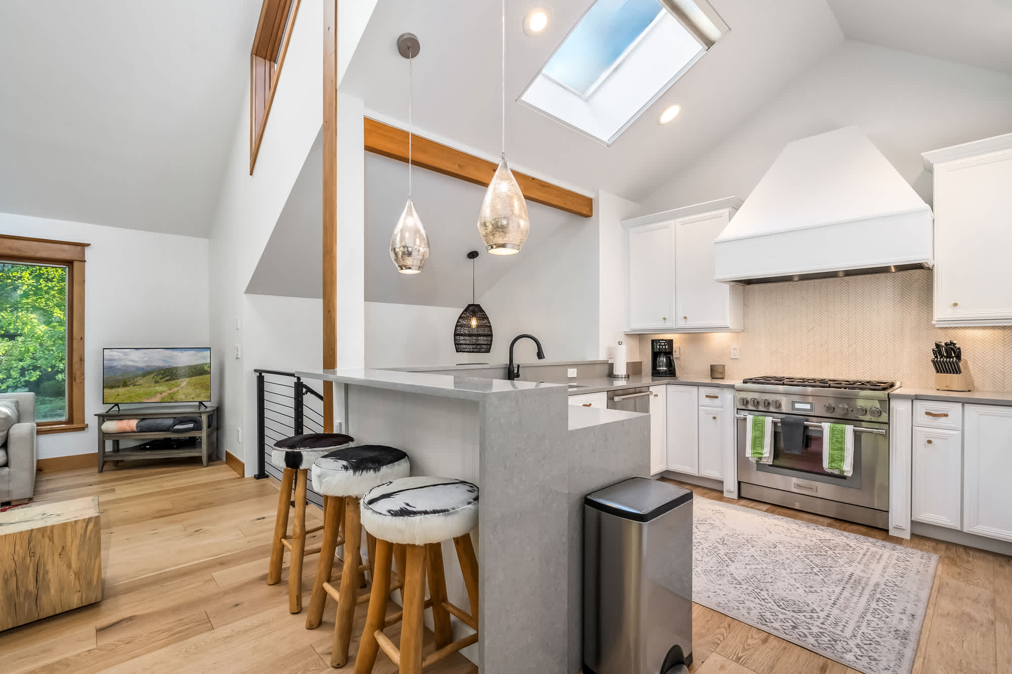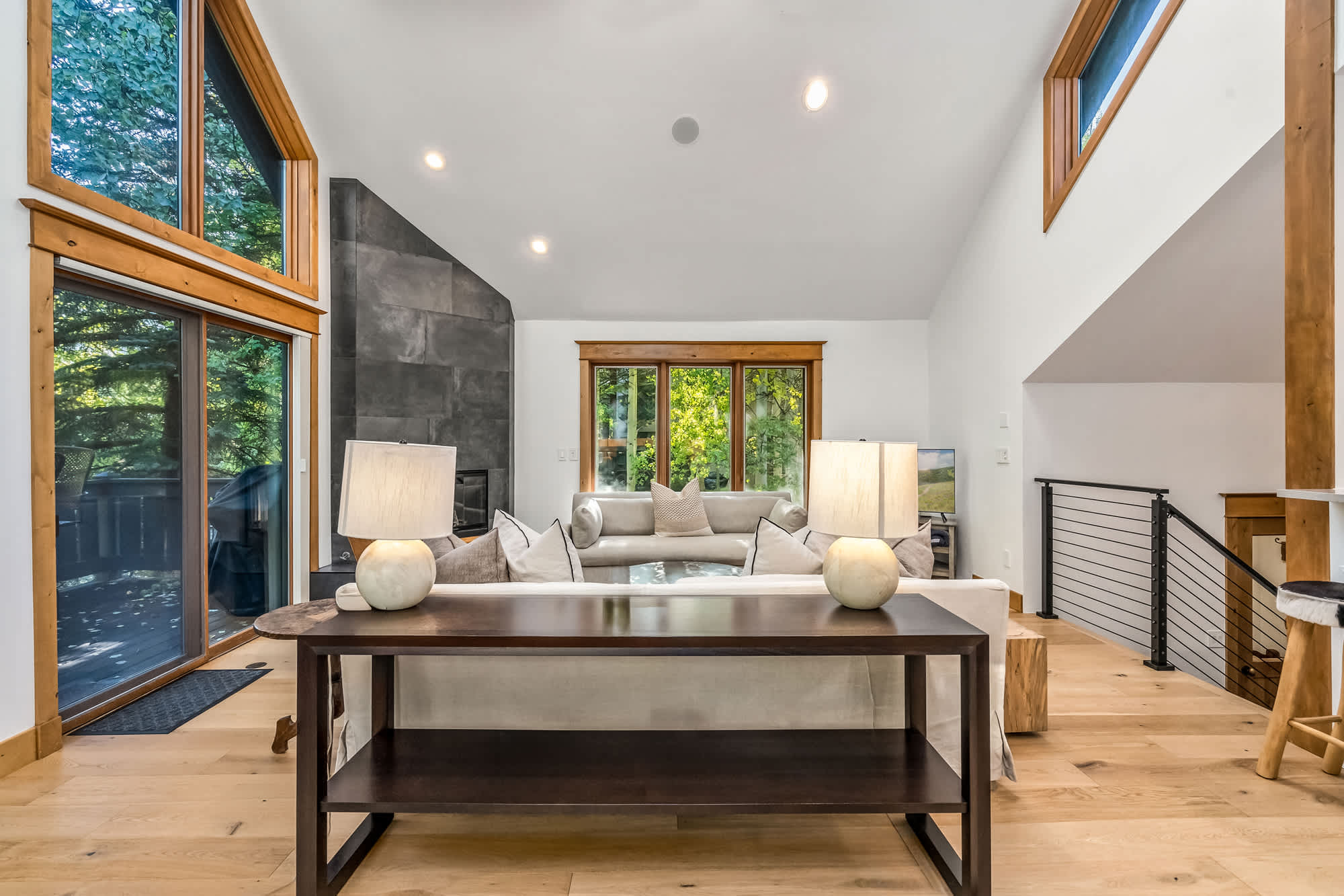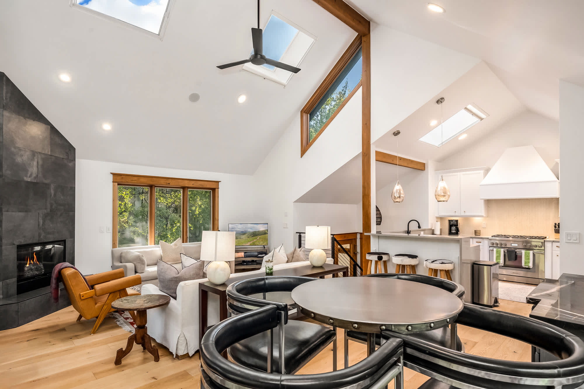 Step inside and you’re greeted by an open floor plan with soaring vaulted ceilings, creating a spacious and inviting environment ideal for gathering together. The living room invites relaxation with two couches, an armchair, a smart TV, and the warmth of an indoor fireplace. The kitchen, complete with stainless steel appliances and counter seating for three, provides plenty of room to whip up home-cooked meals, while the dining area—wrapped in windows—seats six with a view. For casual moments, a highboy pub-style game table with seating for four sits beside a bar area, perfect for sharing drinks or playing cards.
