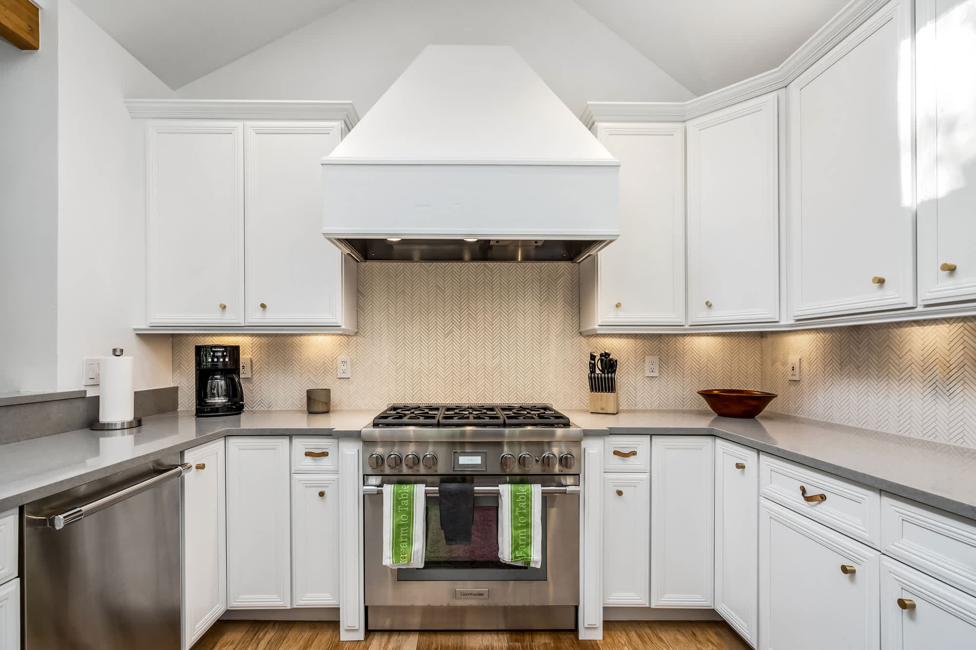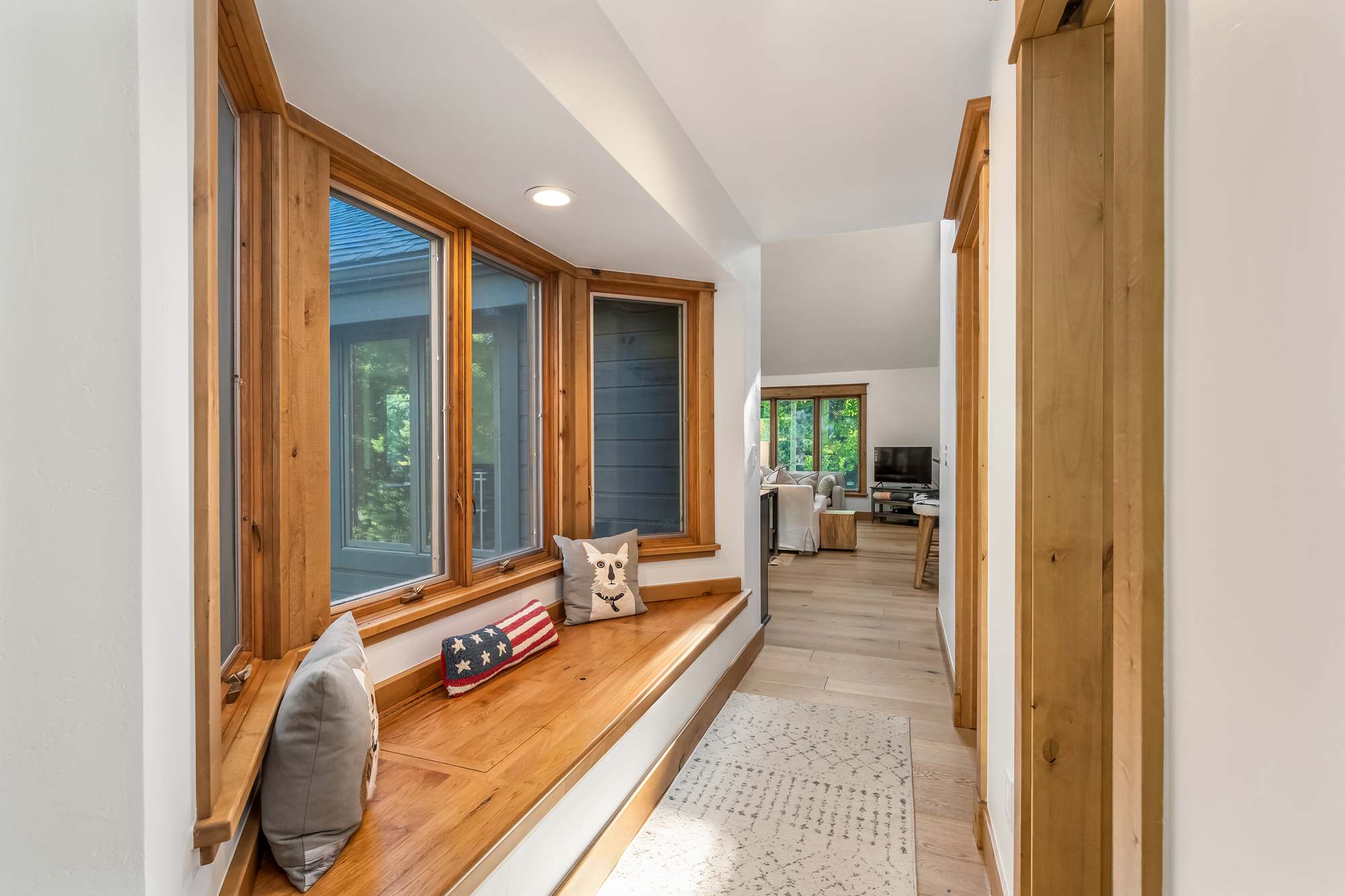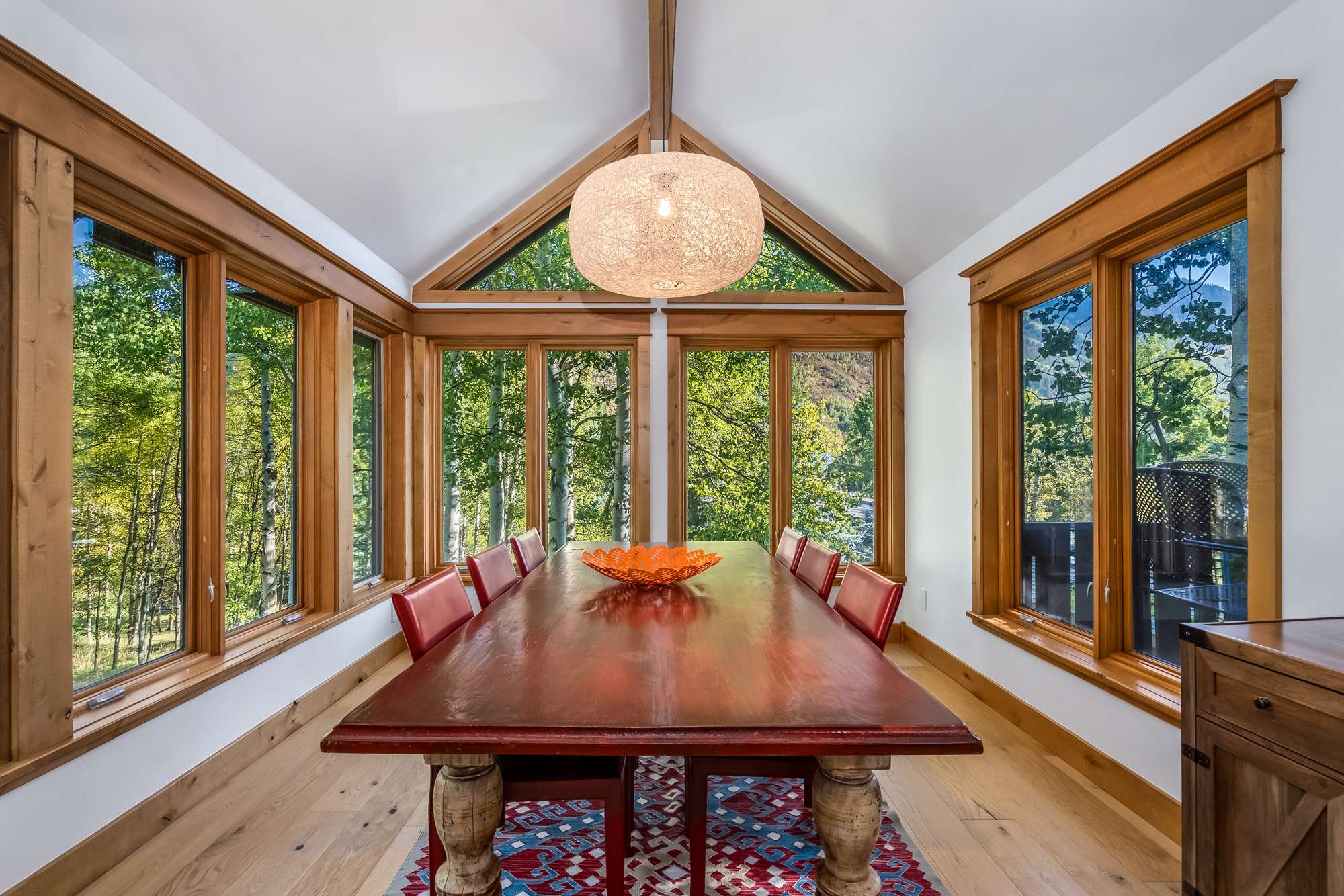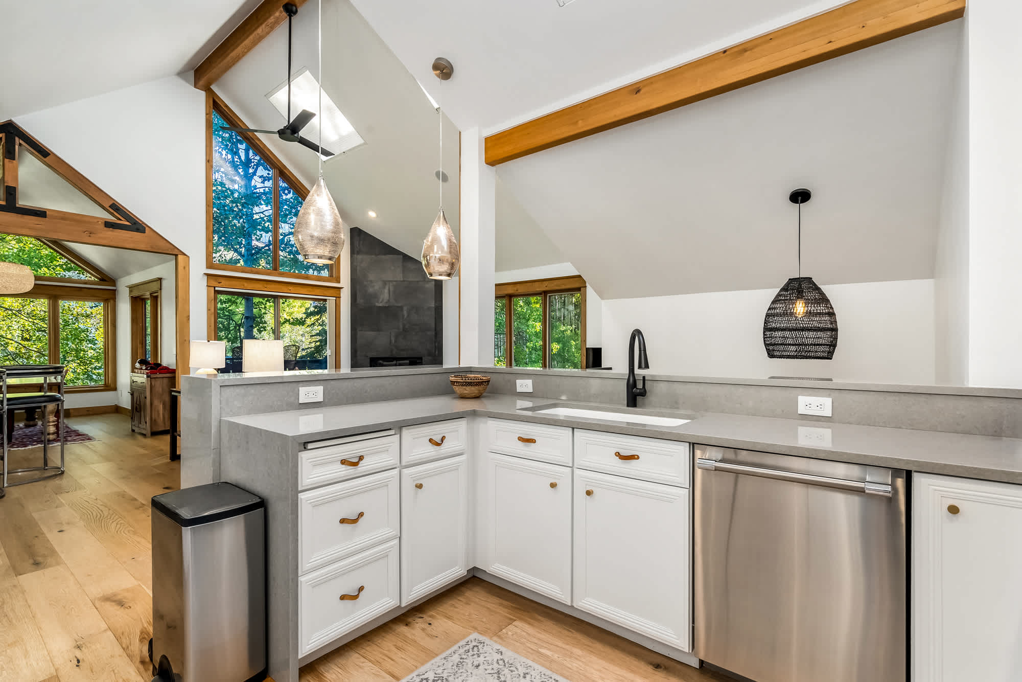 Step inside and you’re greeted by an open floor plan with soaring vaulted ceilings, creating a spacious and inviting environment ideal for gathering together. The living room invites relaxation with two couches, an armchair, a smart TV, and the warmth of an indoor fireplace. The kitchen, complete with stainless steel appliances and counter seating for three, provides plenty of room to whip up home-cooked meals, while the dining area—wrapped in windows—seats six with a view. For casual moments, a highboy pub-style game table with seating for four sits beside a bar area, perfect for sharing drinks or playing cards.