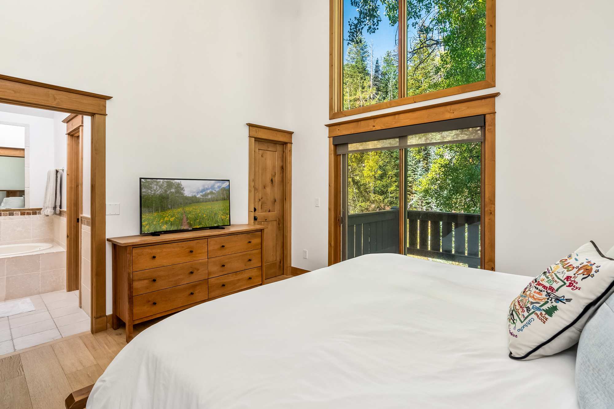 Bedroom #1 includes a king size bed, a smart TV, deck access, and an ensuite bathroom with a dual vanity, a soaking tub, and a walk-in shower.