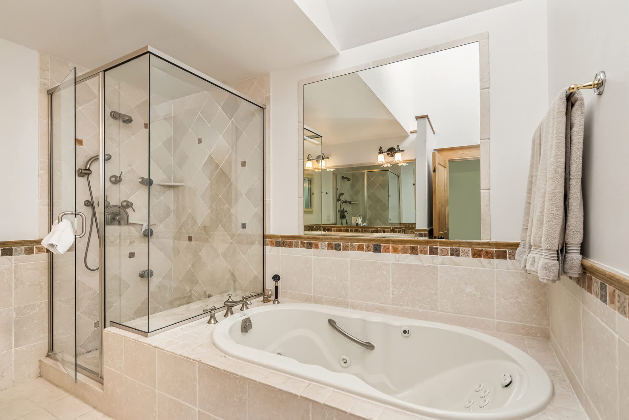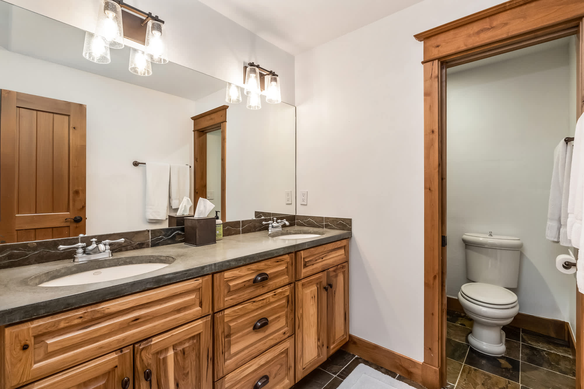 This home comfortably sleeps 10 guests between 4 private bedrooms and a flex room with a queen bed. The home is a split level home, with the entrance/foyer on ground level. The main living floor is a 1/2 flight of steps up to the living room, kitchen, dining room, laundry room, powder room and primary bedroom with en-suite. The lower level is a 1/2 flight of steps down to a rec room. Three bedrooms on the lower level share a full bathroom, and a fourth queen bedroom has an en-suite. The hot tub is accessed from the lower level.