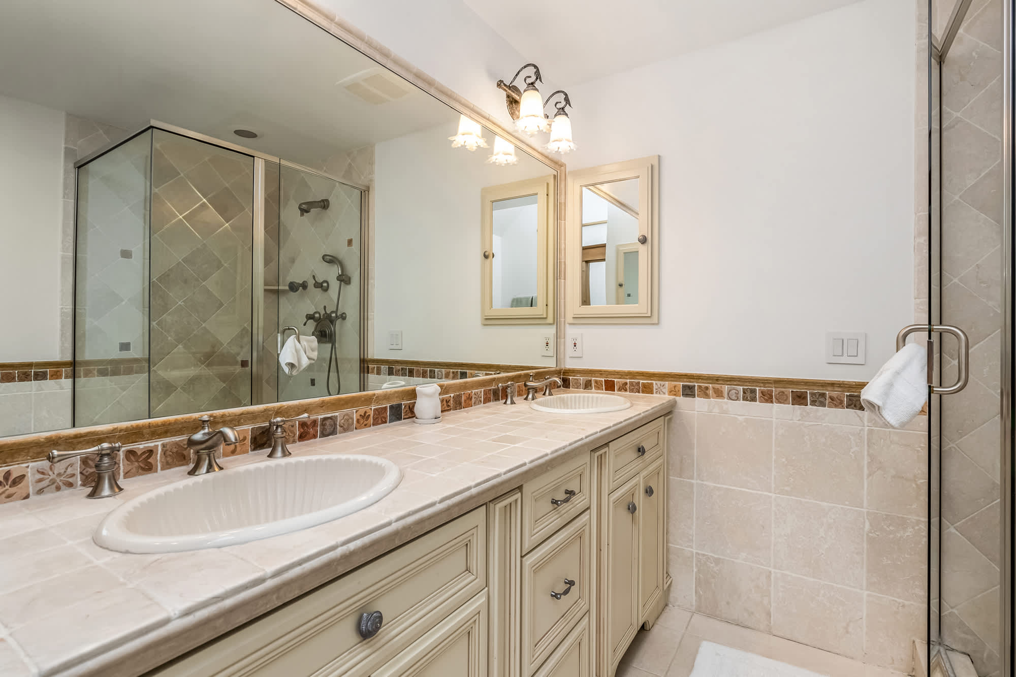 Bedroom #3 includes a queen size bed and an ensuite bathroom with a single vanity and a walk-in shower.