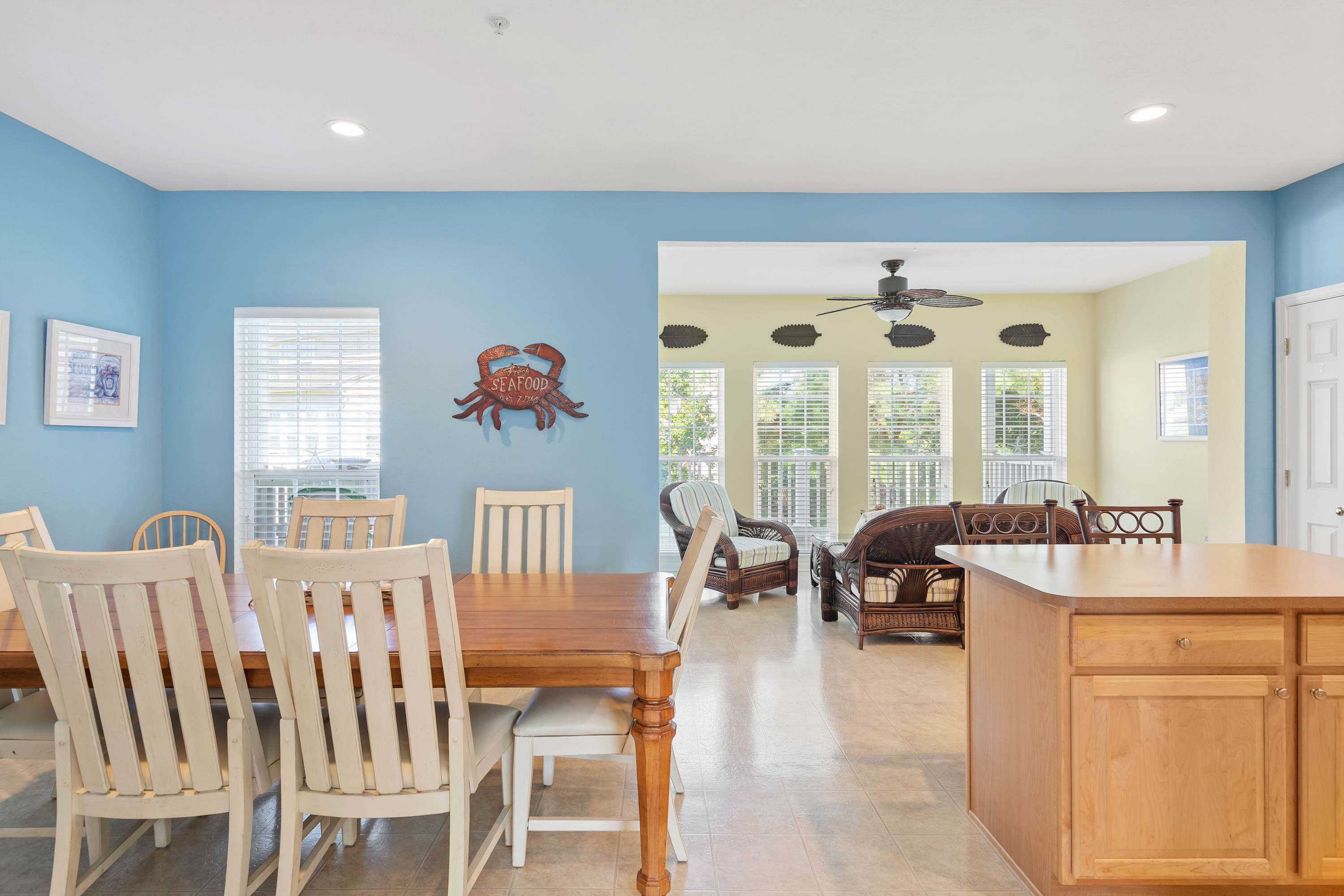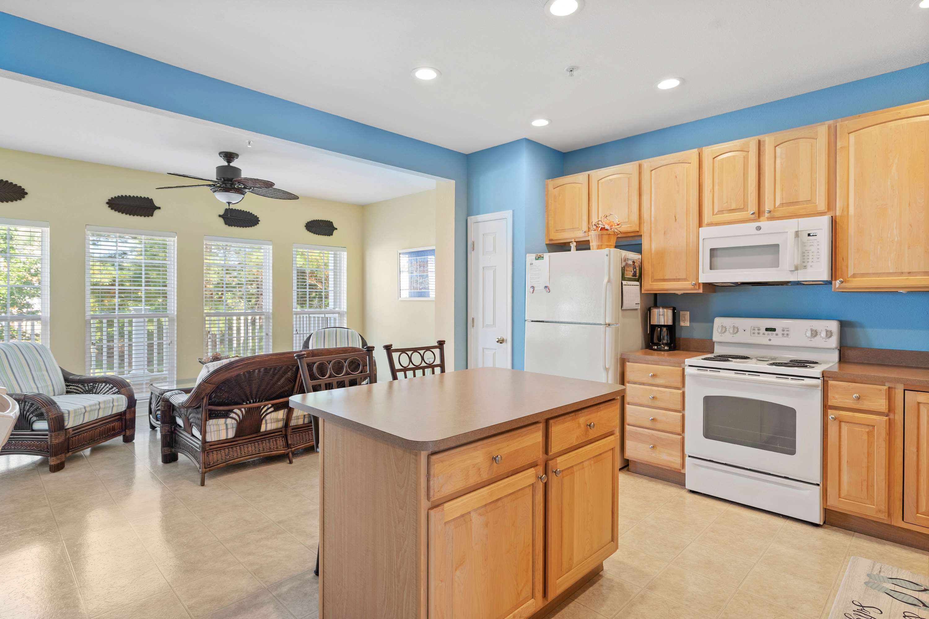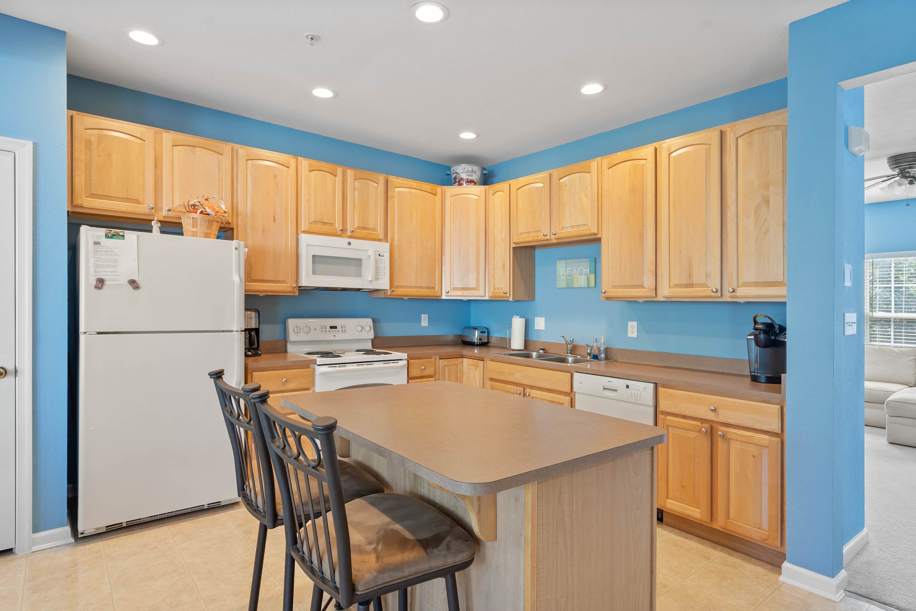 Step inside to the living room, an inviting open space with a spacious sectional and Smart TV—perfect for movie nights or catching up on your favorite shows. Moving into the kitchen, the warm honey cabinetry sets a cozy tone, with both drip and Keurig coffee makers ready to fuel your mornings. Counter seating for two flows into the dining area, where a table for six invites family meals or long conversations over dinner. Off the kitchen, a sunlit sitting room overlooks the wooded backyard and stream, offering a serene spot to sip your coffee or curl up with a book. From here, sliding doors open to a large deck, ideal for lounging or enjoying the fresh air.