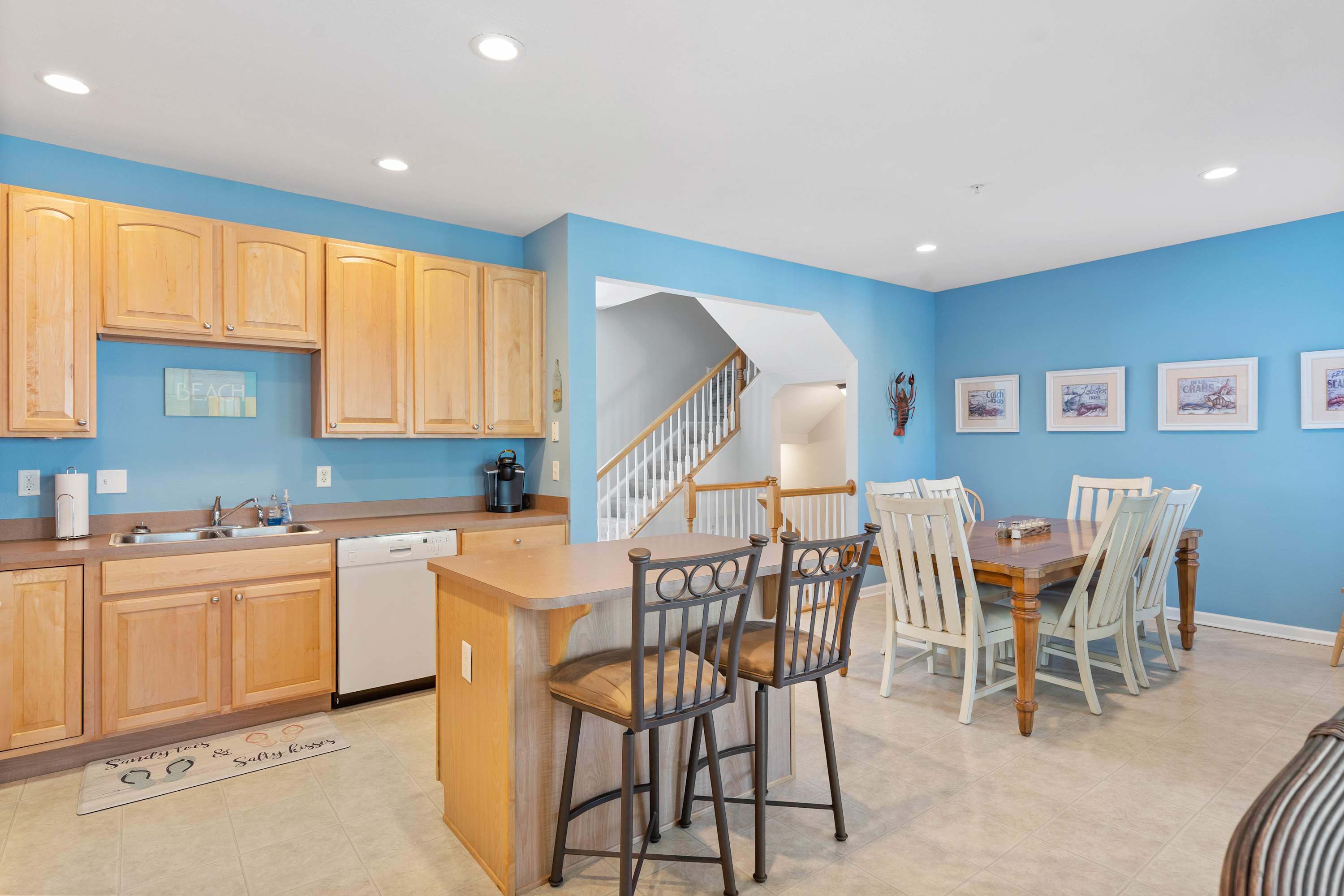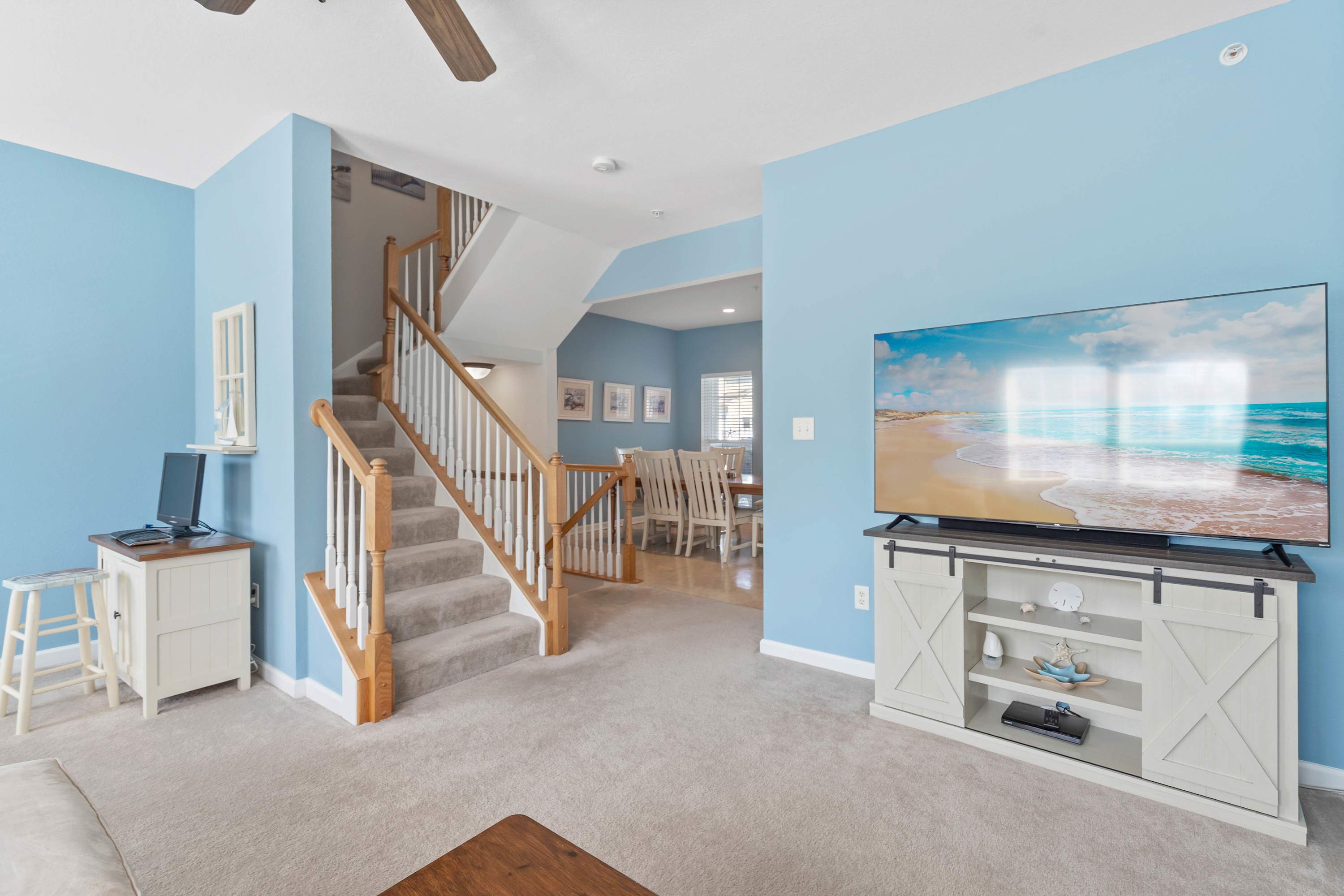 For fun-filled evenings, head to the game room in the basement, where a small basketball shoot, foosball, and air hockey table await. Another Smart TV adds to the entertainment options, making it the perfect hangout space for kids and adults alike. Creekside Getaway offers a thoughtful balance of comfort, relaxation, and entertainment—everything you need for a memorable stay near the Delaware coast.