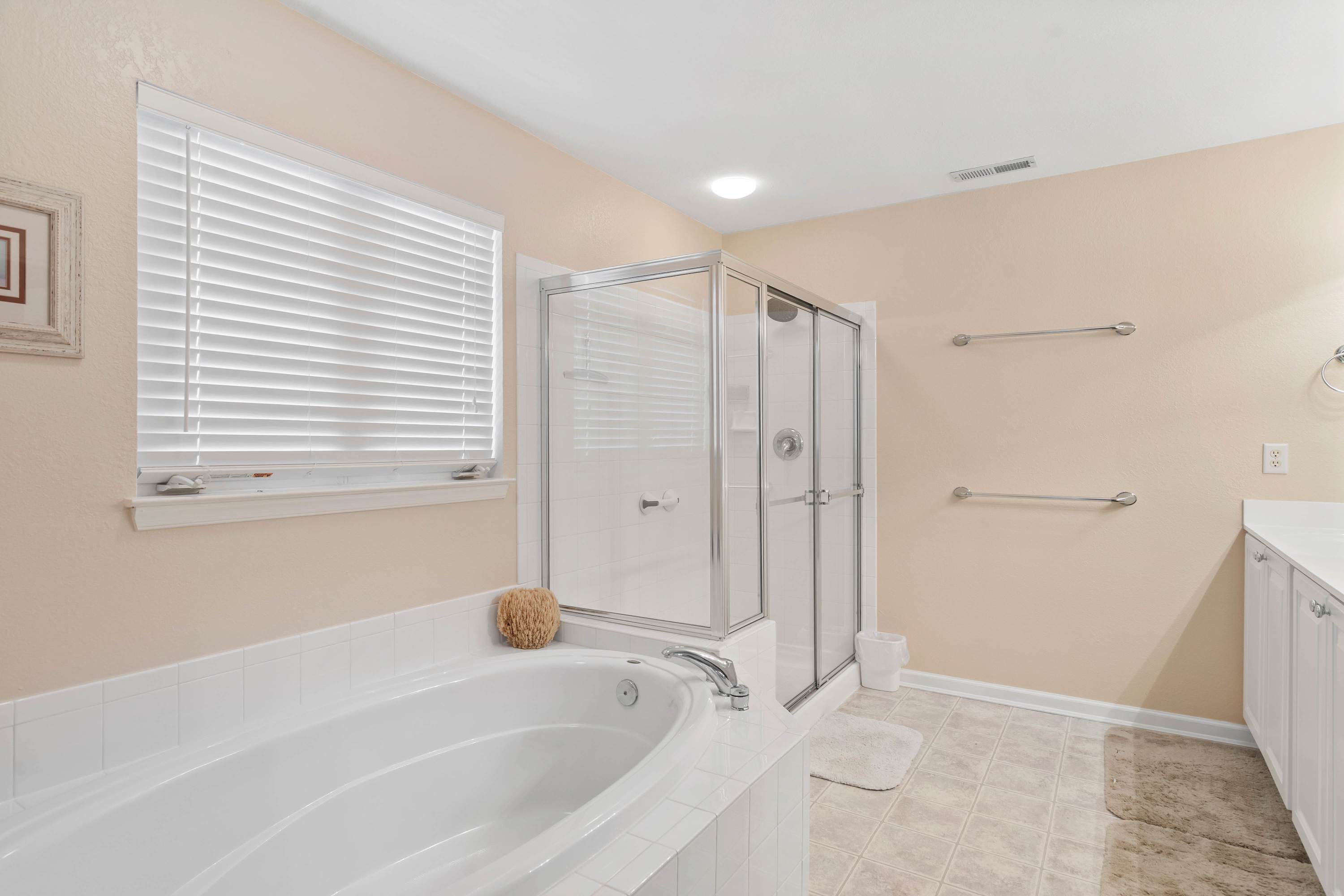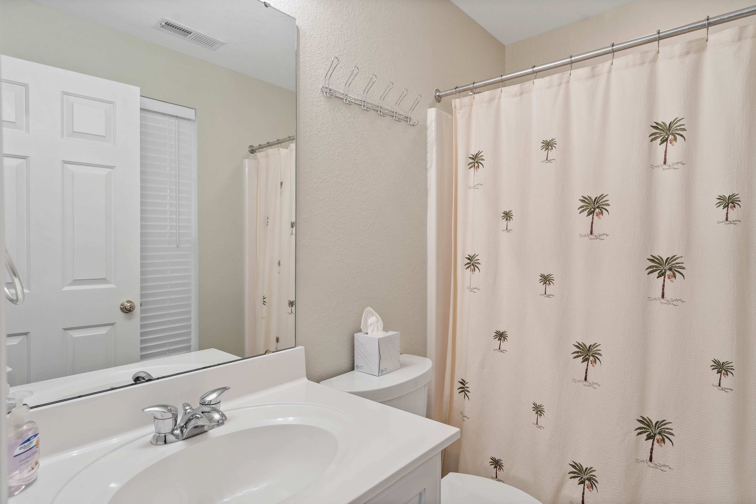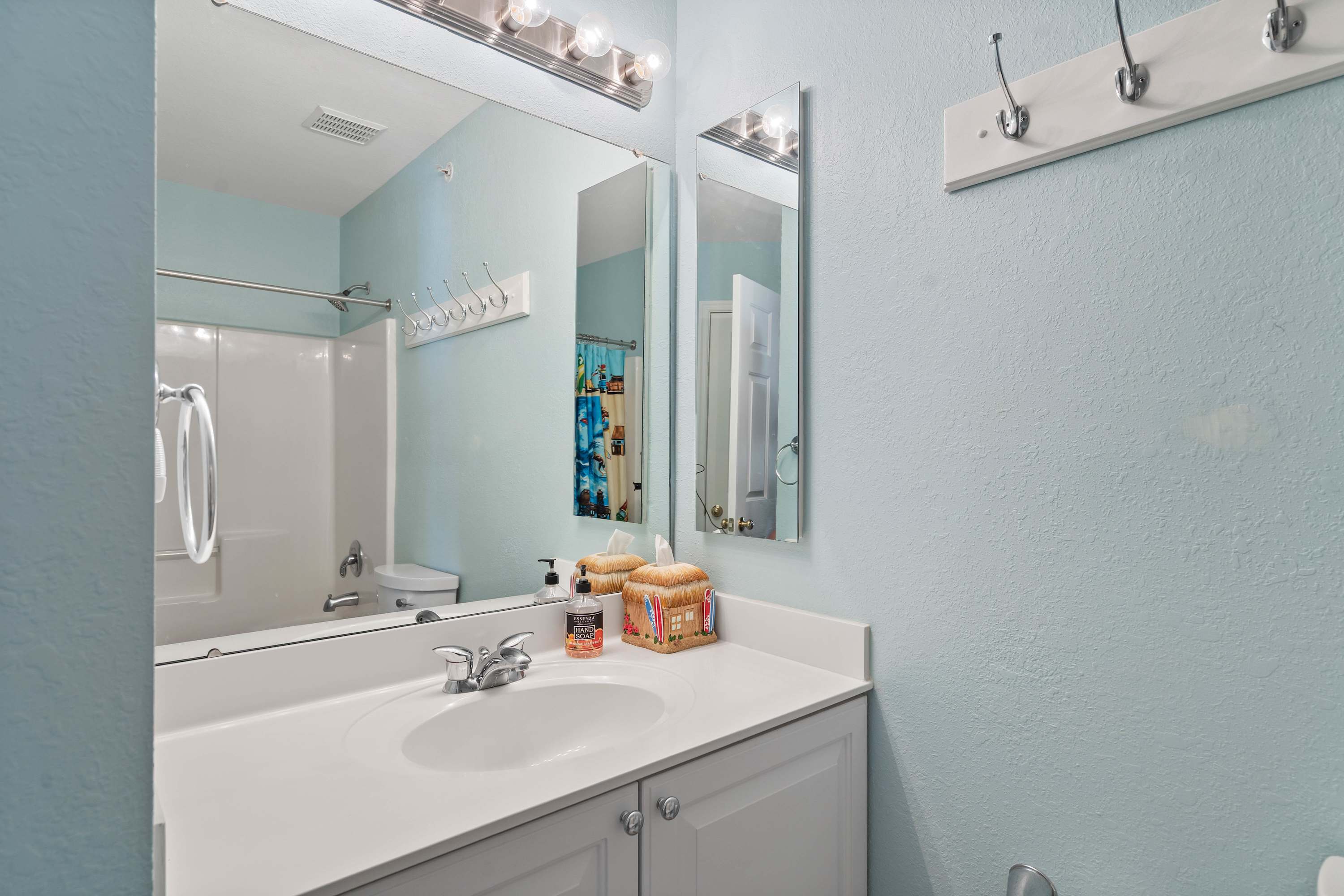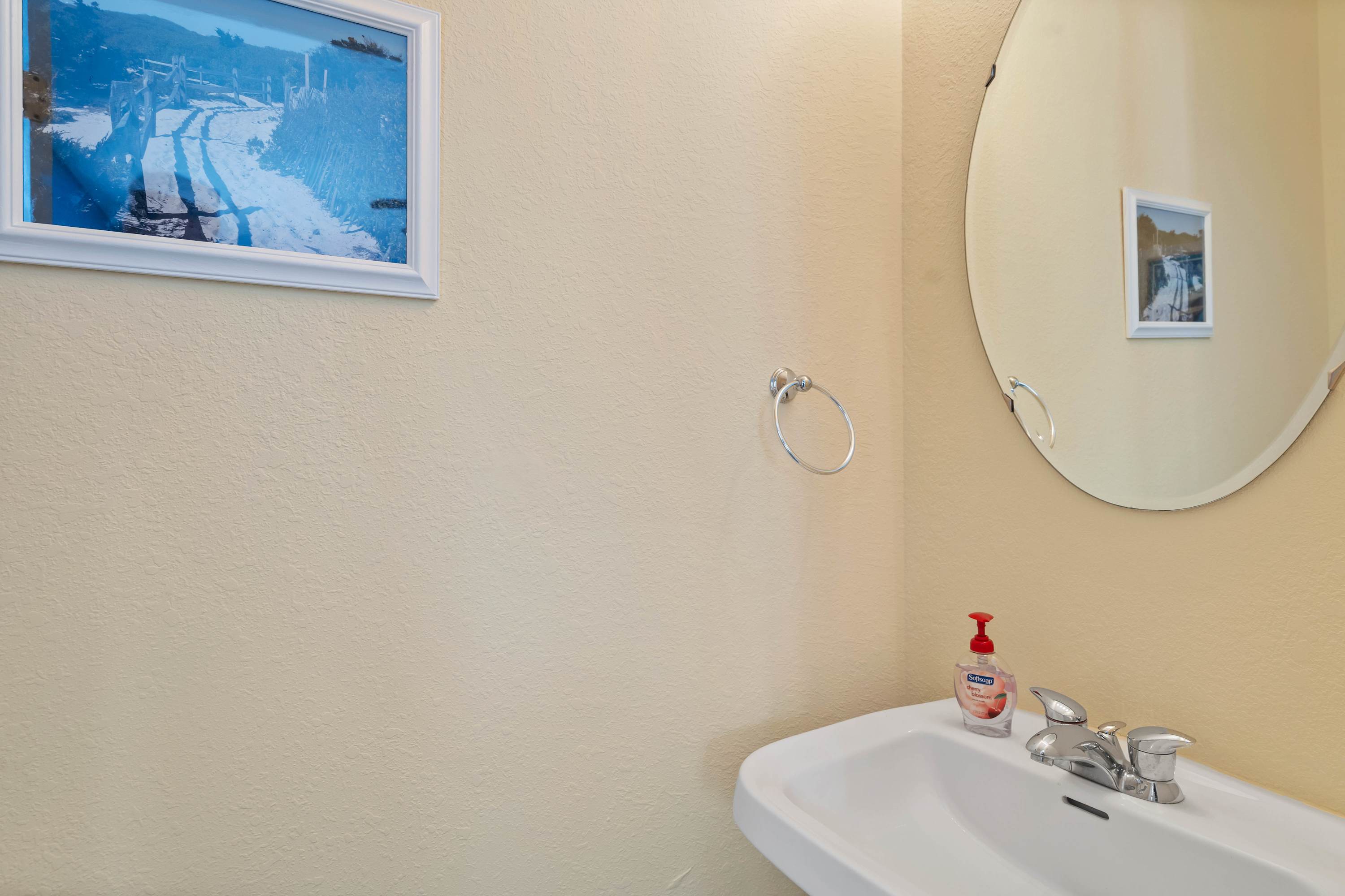 This home also includes a half bathroom with a pedestal sink and 2 additional full bathrooms, both with a single vanity and a shower/tub combo.