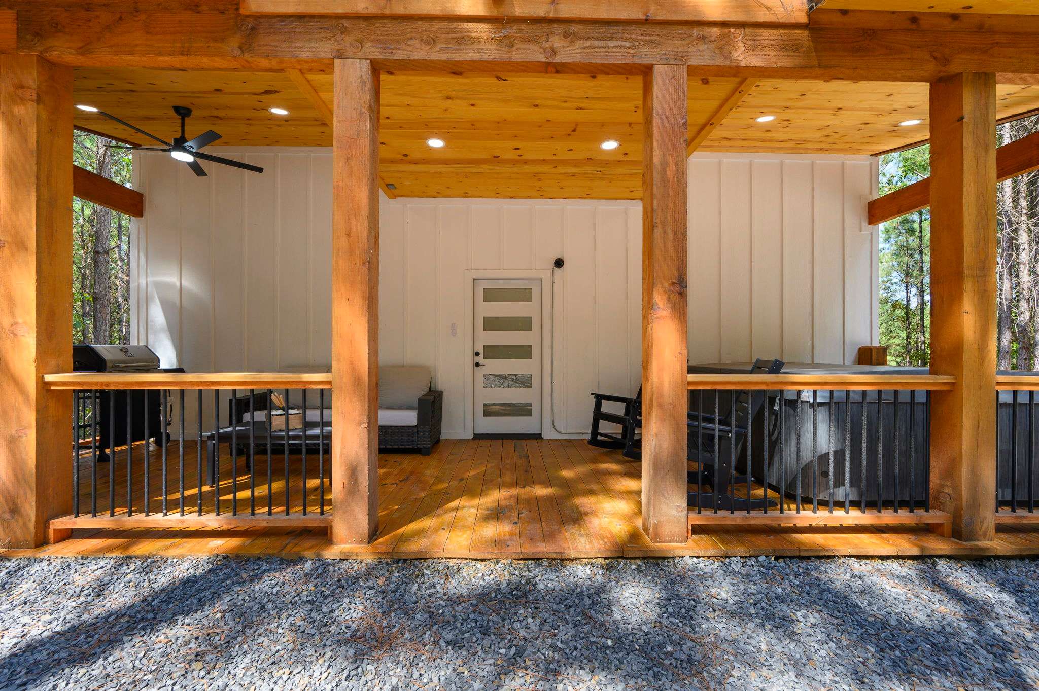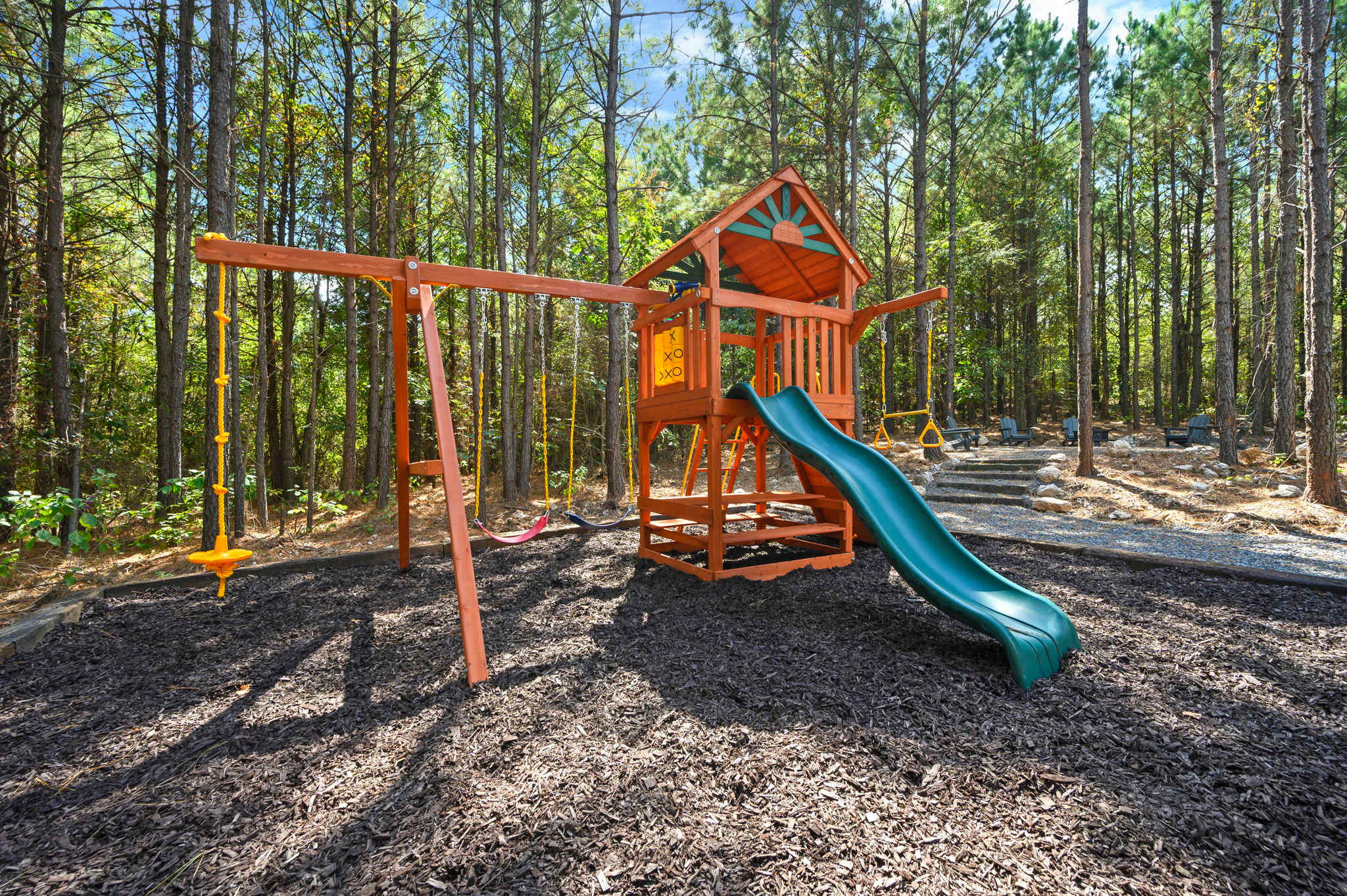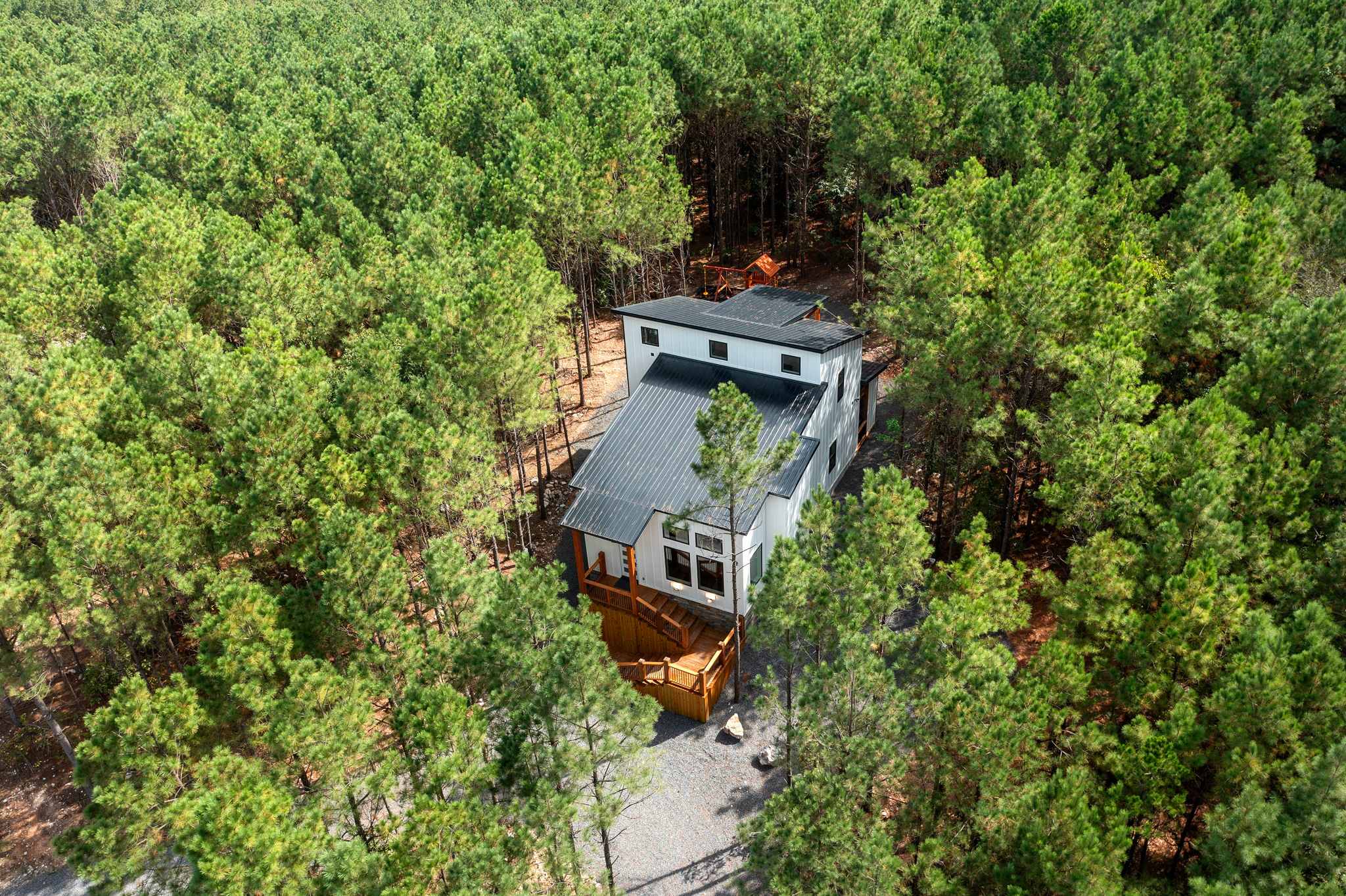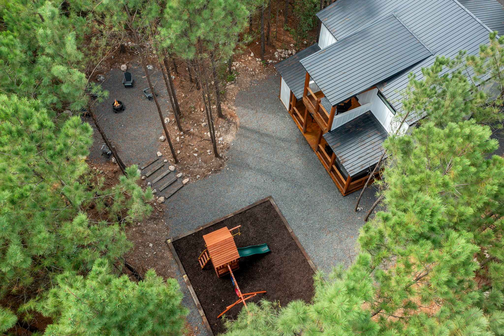As you arrive, step outside and take in the inviting outdoor spaces that make this cabin truly special. The covered lower deck features a cozy fireplace and TV for evenings spent outdoors, along with comfortable seating, a grill for cookouts, and a bubbling hot tub perfect for unwinding. Just beyond, a firepit with seating invites late-night s’mores and stories, while a children’s playset nearby keeps little ones entertained. You can also look forward to private moments on the upper balcony, where seating for two provides a peaceful spot to sip your morning coffee or stargaze at night.