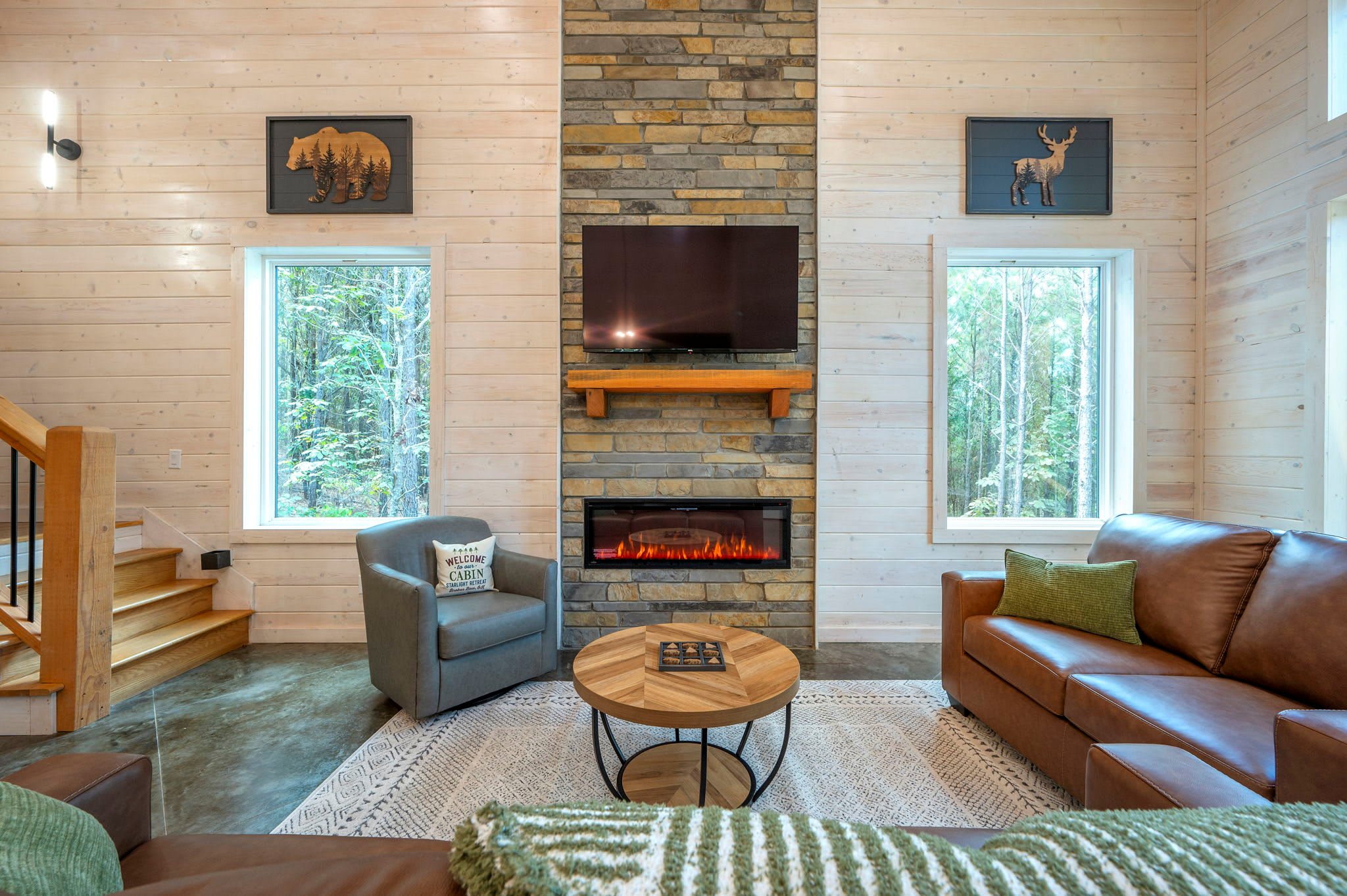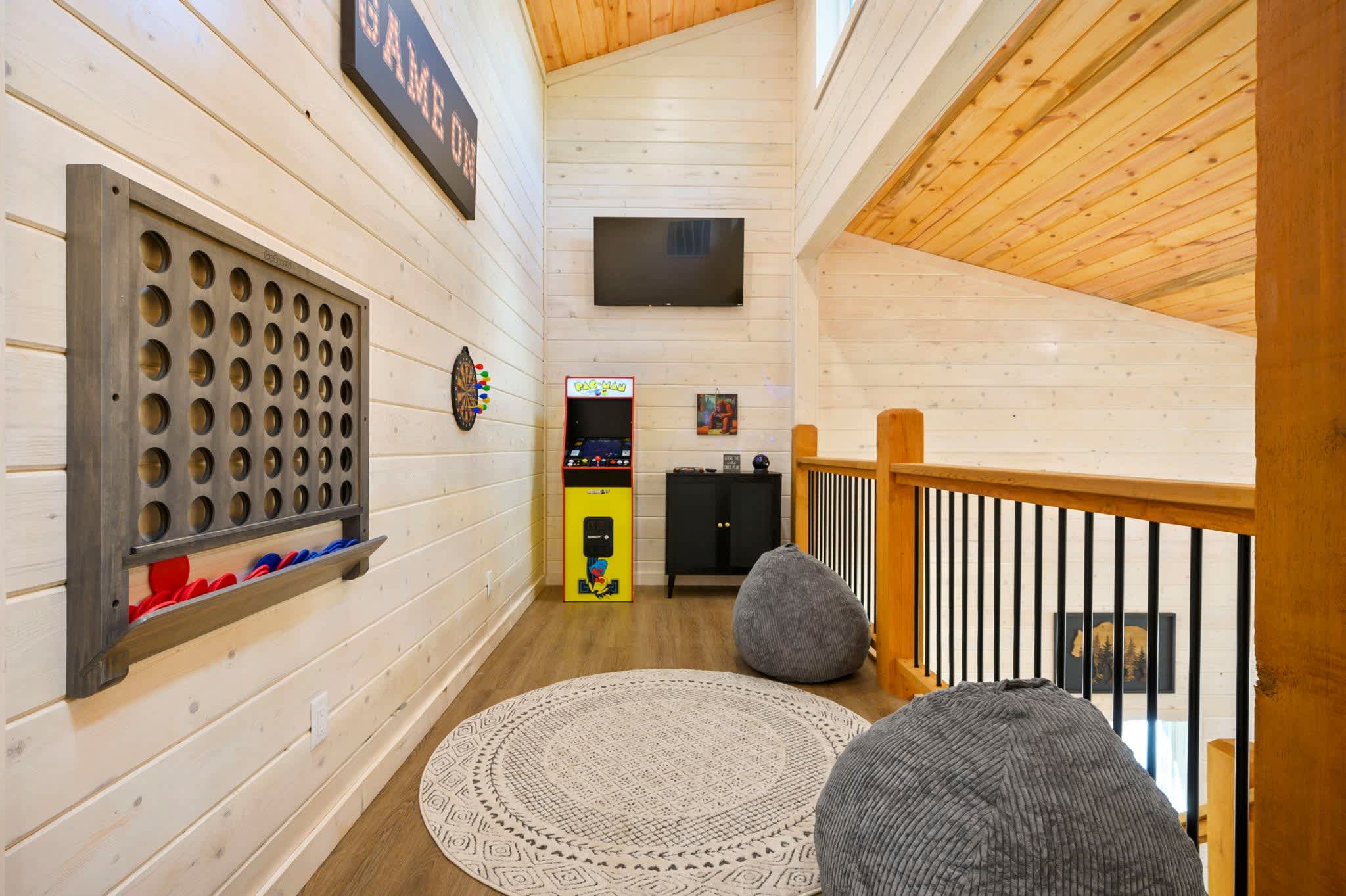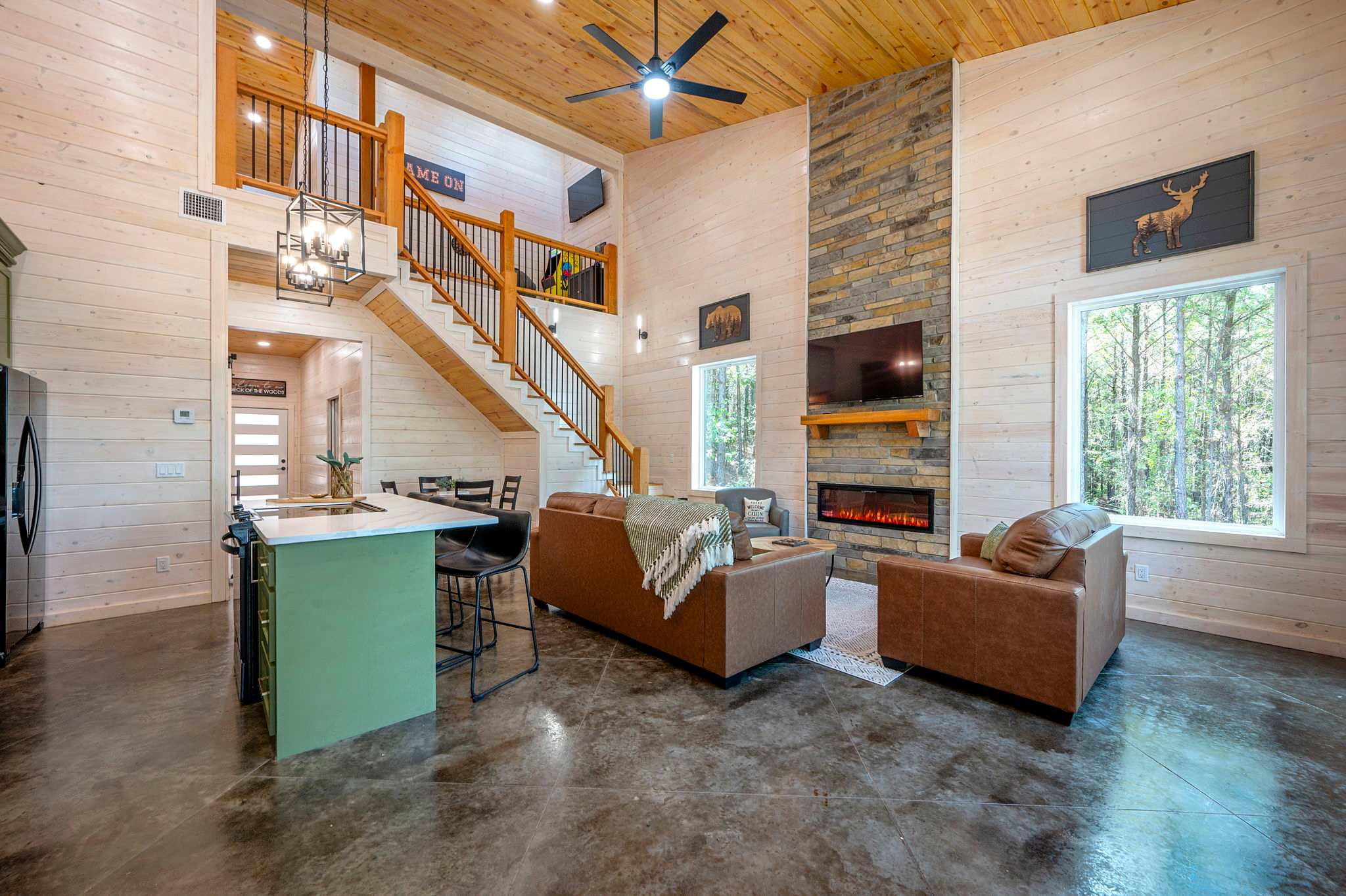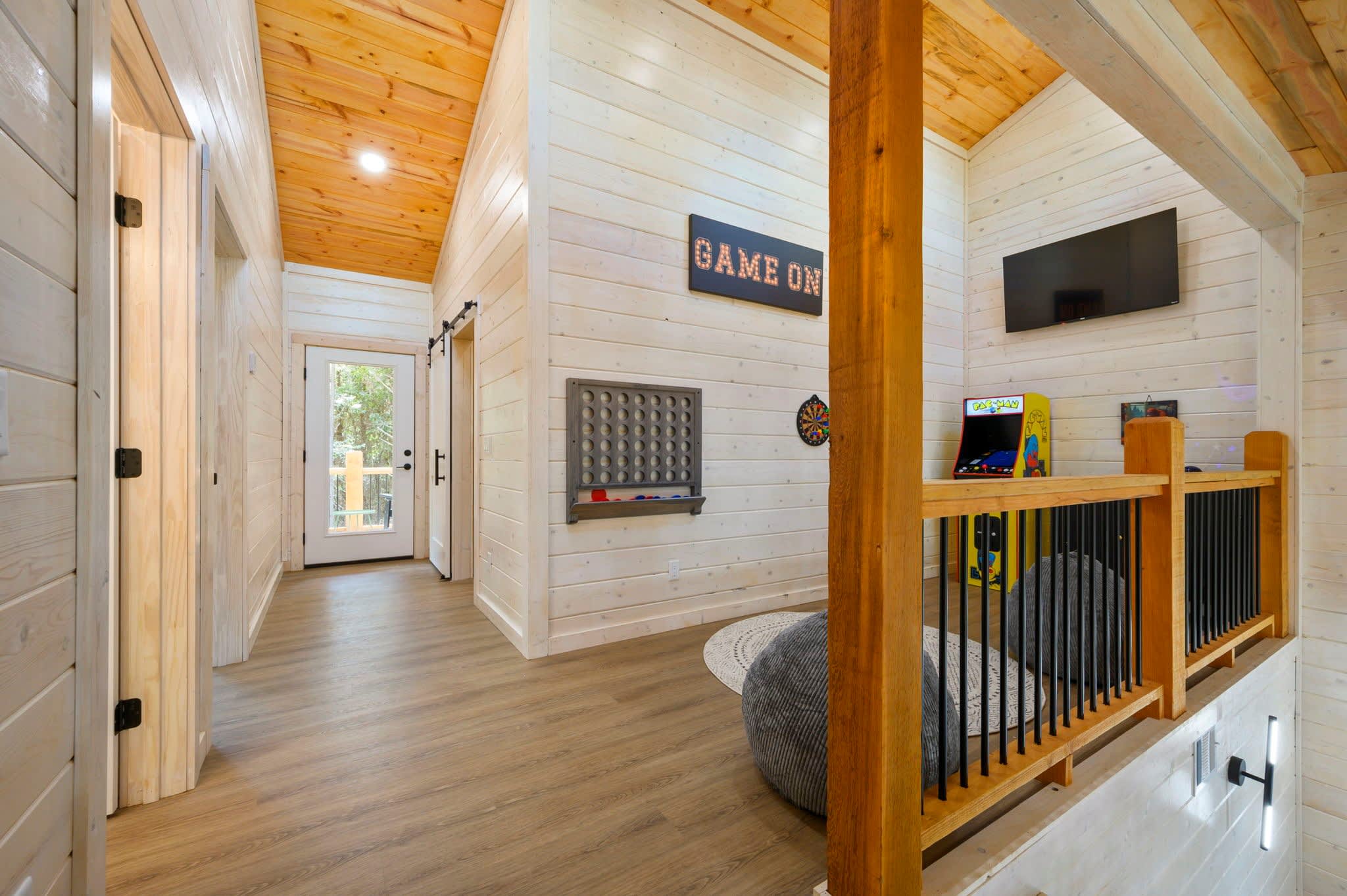 Inside, the modern open-concept design greets you with soaring ceilings, walls of windows that frame the surrounding trees, and a stylish mix of comfort and elegance. The fully equipped kitchen features striking green cabinets, a dual Keurig for both pots and single cups of coffee, and counter seating for four, while the dining table nearby seats four for family meals. The living room is warm and inviting with a plush couch, loveseat, armchair, smart TV, and an electric fireplace for a cozy glow. Entertainment continues in the game room, where you’ll find a Pac-Man arcade machine, large Connect Four, board games, bean bag seating, and another smart TV—perfect for family fun or friendly competition. With its blend of modern style, thoughtful amenities, and forested seclusion, the Starlight Retreat offers the perfect Broken Bow getaway.