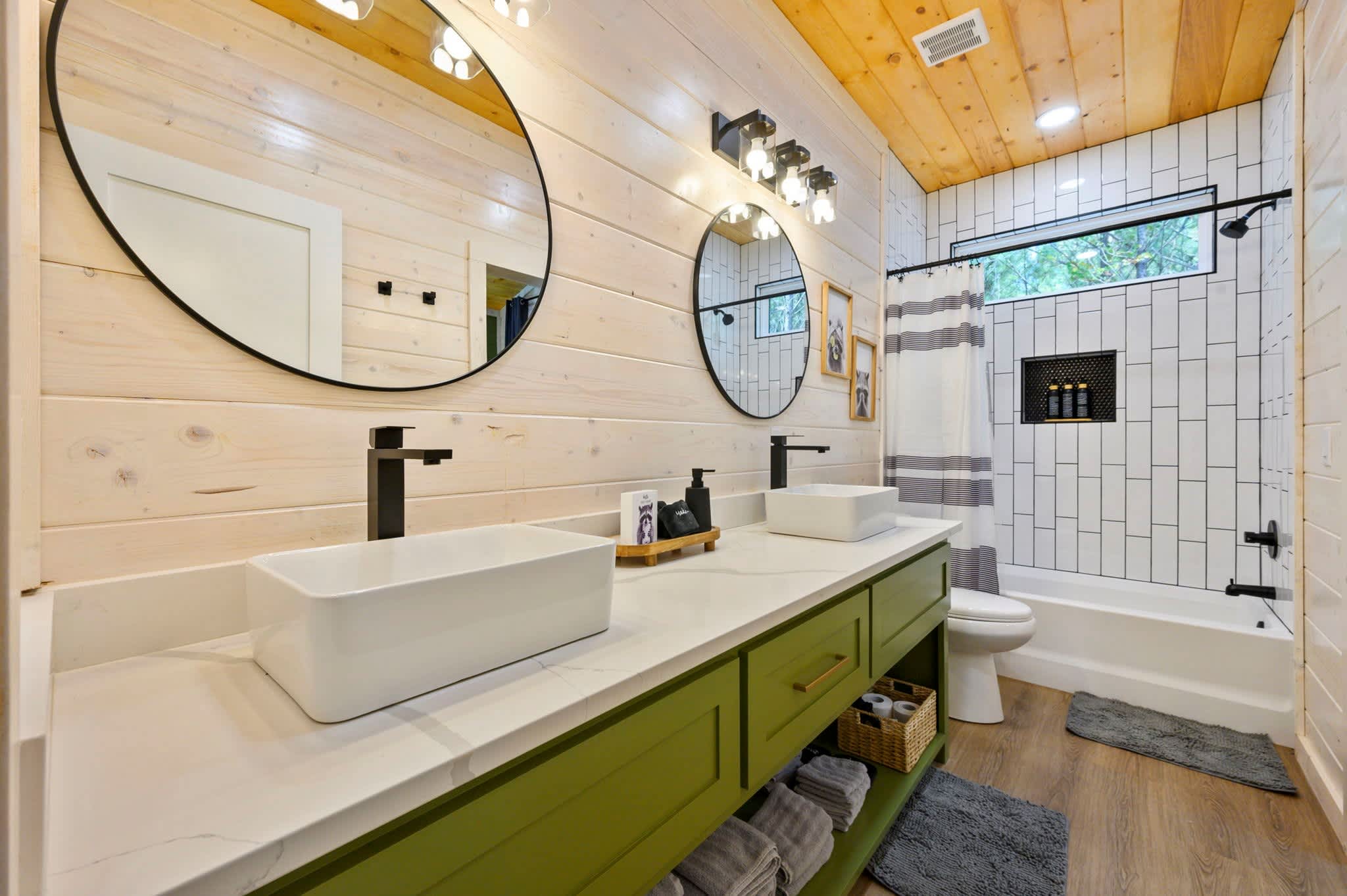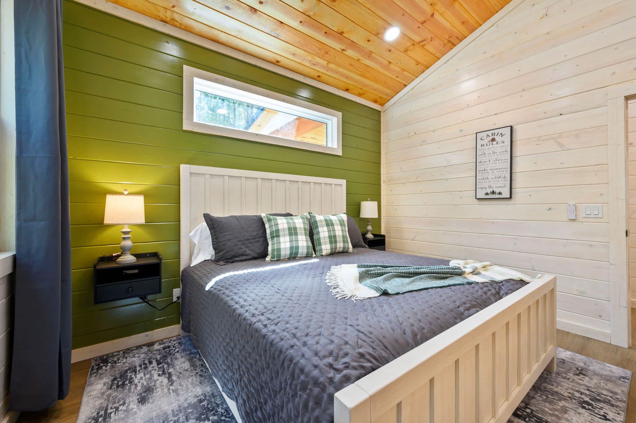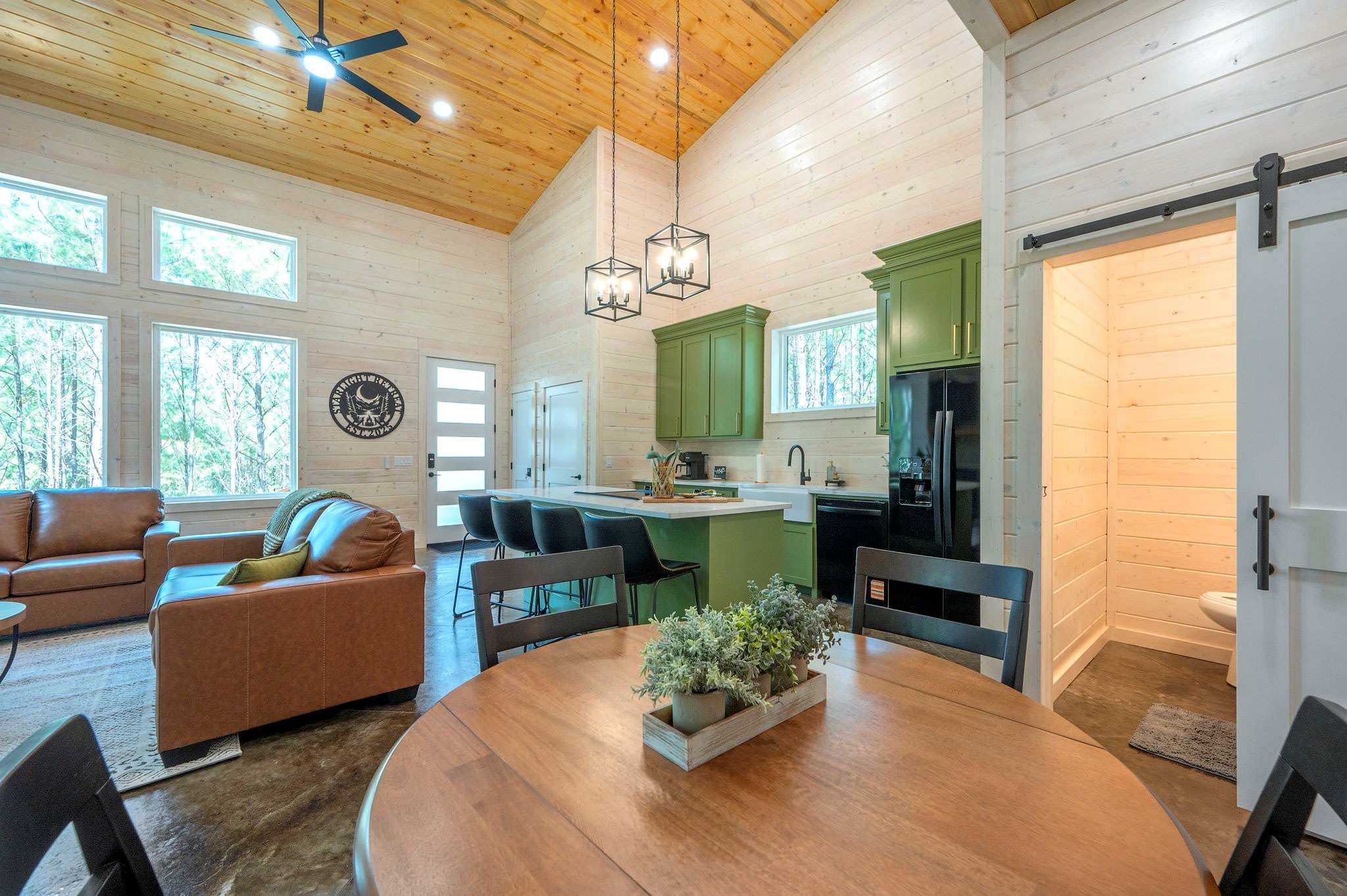 Inside, the modern open-concept design greets you with soaring ceilings, walls of windows that frame the surrounding trees, and a stylish mix of comfort and elegance. The fully equipped kitchen features striking green cabinets, a dual Keurig for both pots and single cups of coffee, and counter seating for four, while the dining table nearby seats four for family meals. The living room is warm and inviting with a plush couch, loveseat, armchair, smart TV, and an electric fireplace for a cozy glow. Entertainment continues in the game room, where you’ll find a Pac-Man arcade machine, large Connect Four, board games, bean bag seating, and another smart TV—perfect for family fun or friendly competition. With its blend of modern style, thoughtful amenities, and forested seclusion, the Starlight Retreat offers the perfect Broken Bow getaway.