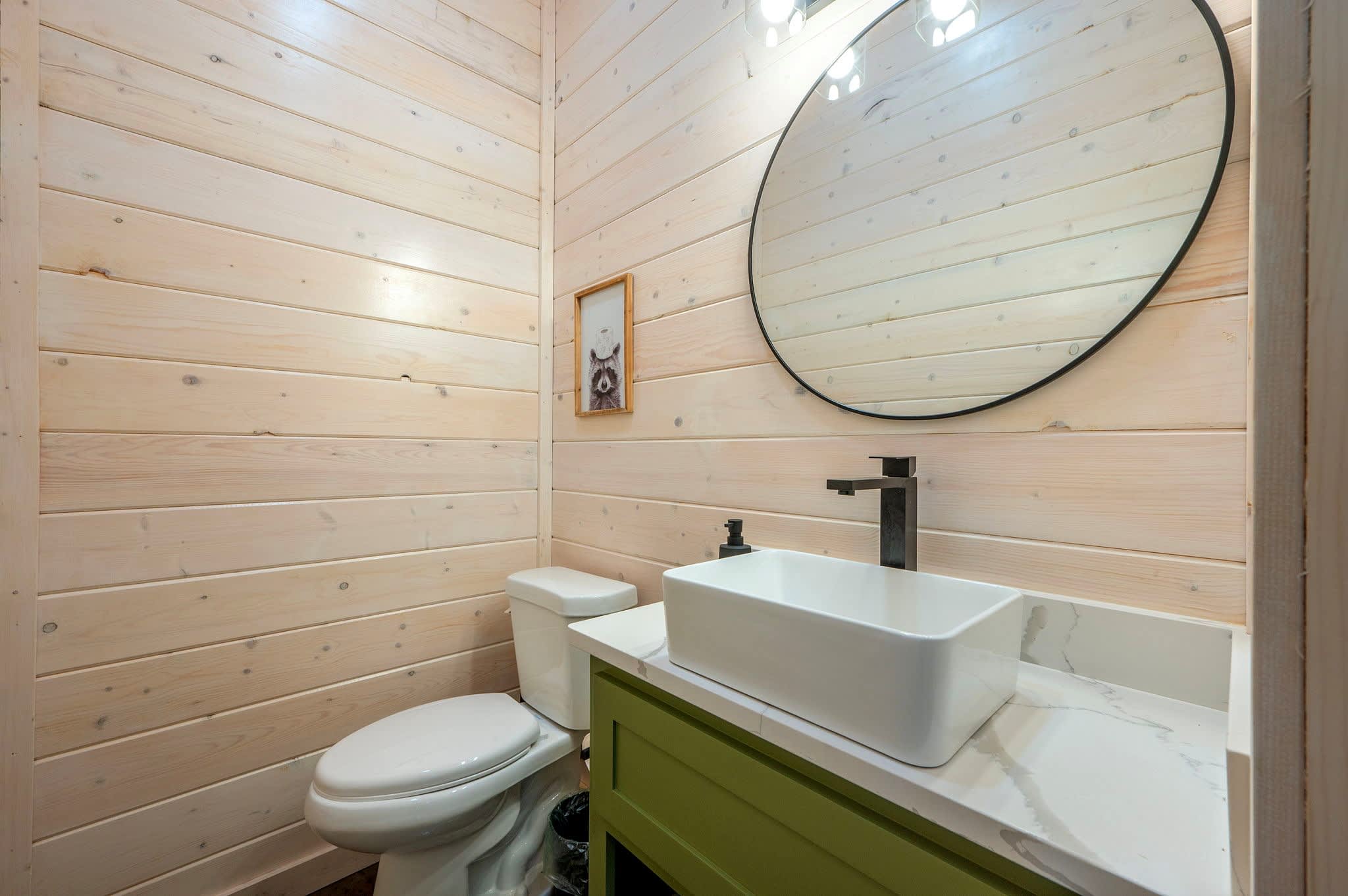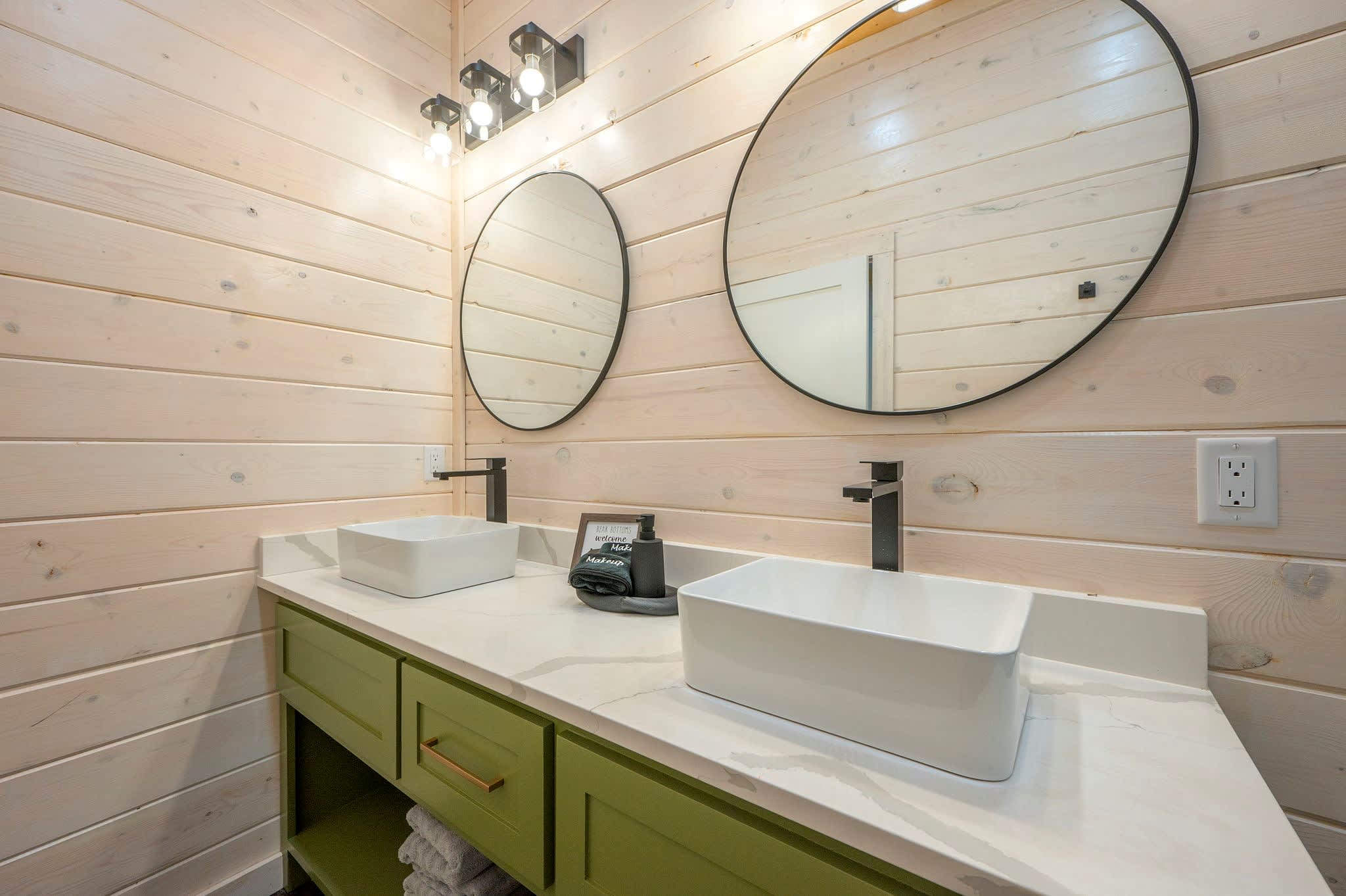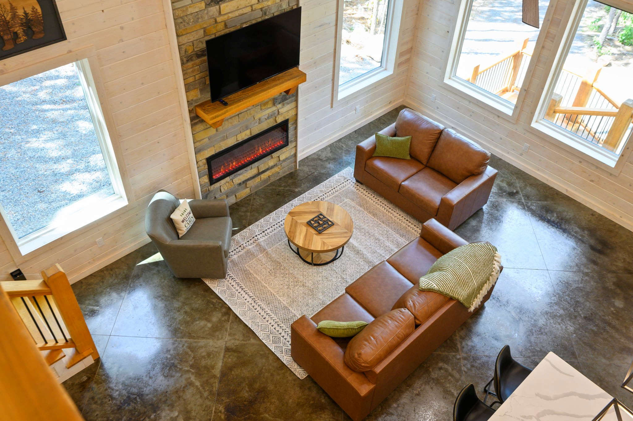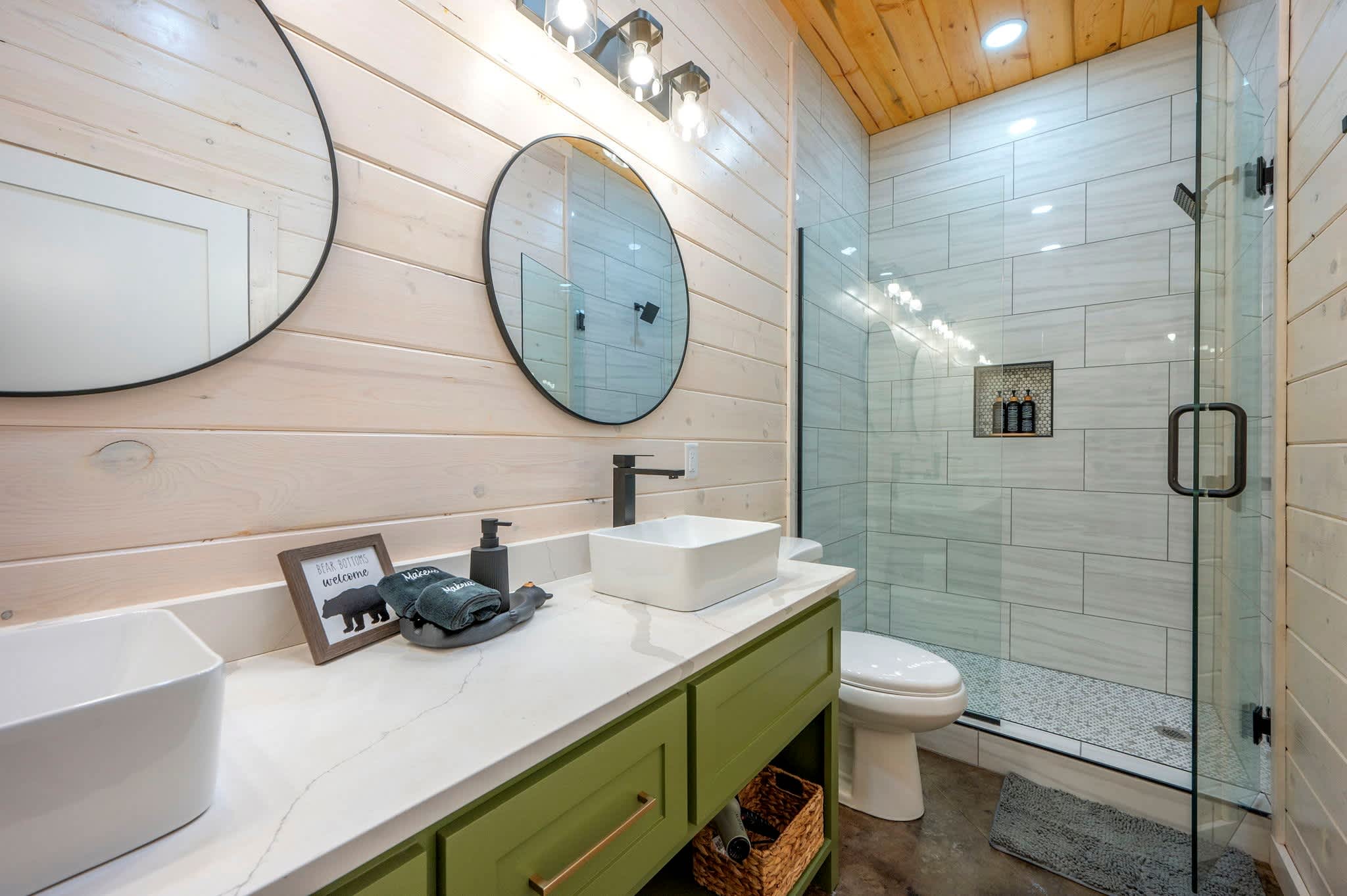 Inside, the modern open-concept design greets you with soaring ceilings, walls of windows that frame the surrounding trees, and a stylish mix of comfort and elegance. The fully equipped kitchen features striking green cabinets, a dual Keurig for both pots and single cups of coffee, and counter seating for four, while the dining table nearby seats four for family meals. The living room is warm and inviting with a plush couch, loveseat, armchair, smart TV, and an electric fireplace for a cozy glow. Entertainment continues in the game room, where you’ll find a Pac-Man arcade machine, large Connect Four, board games, bean bag seating, and another smart TV—perfect for family fun or friendly competition. With its blend of modern style, thoughtful amenities, and forested seclusion, the Starlight Retreat offers the perfect Broken Bow getaway.