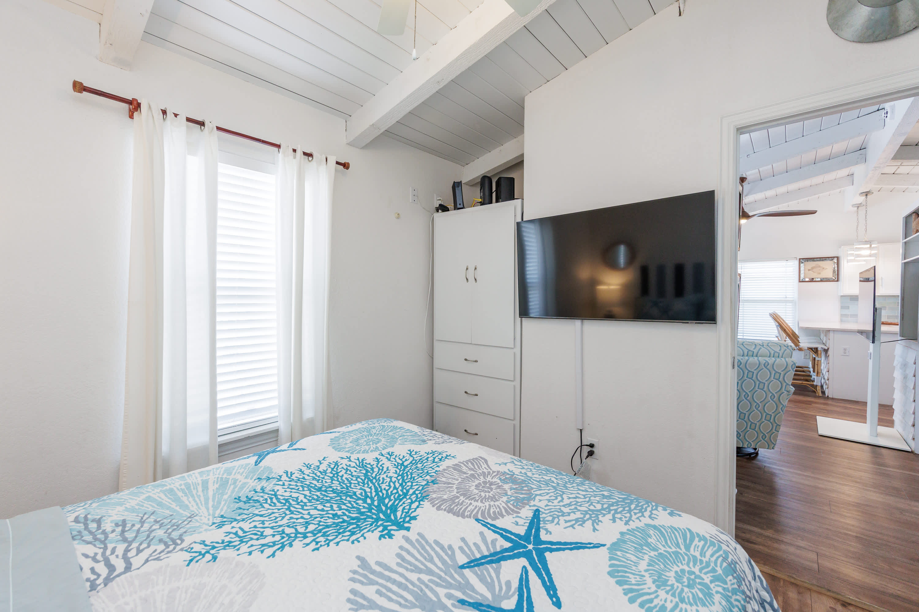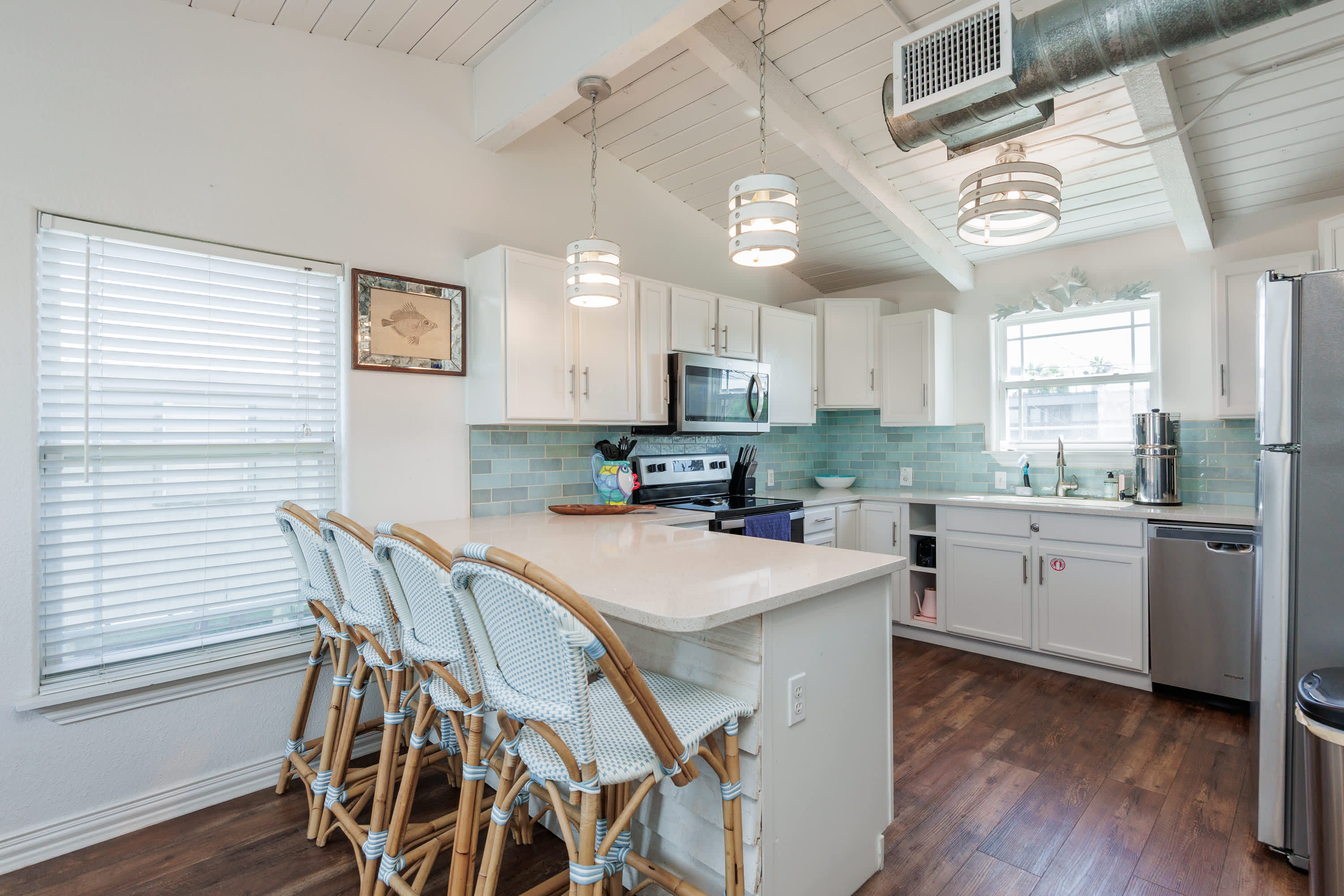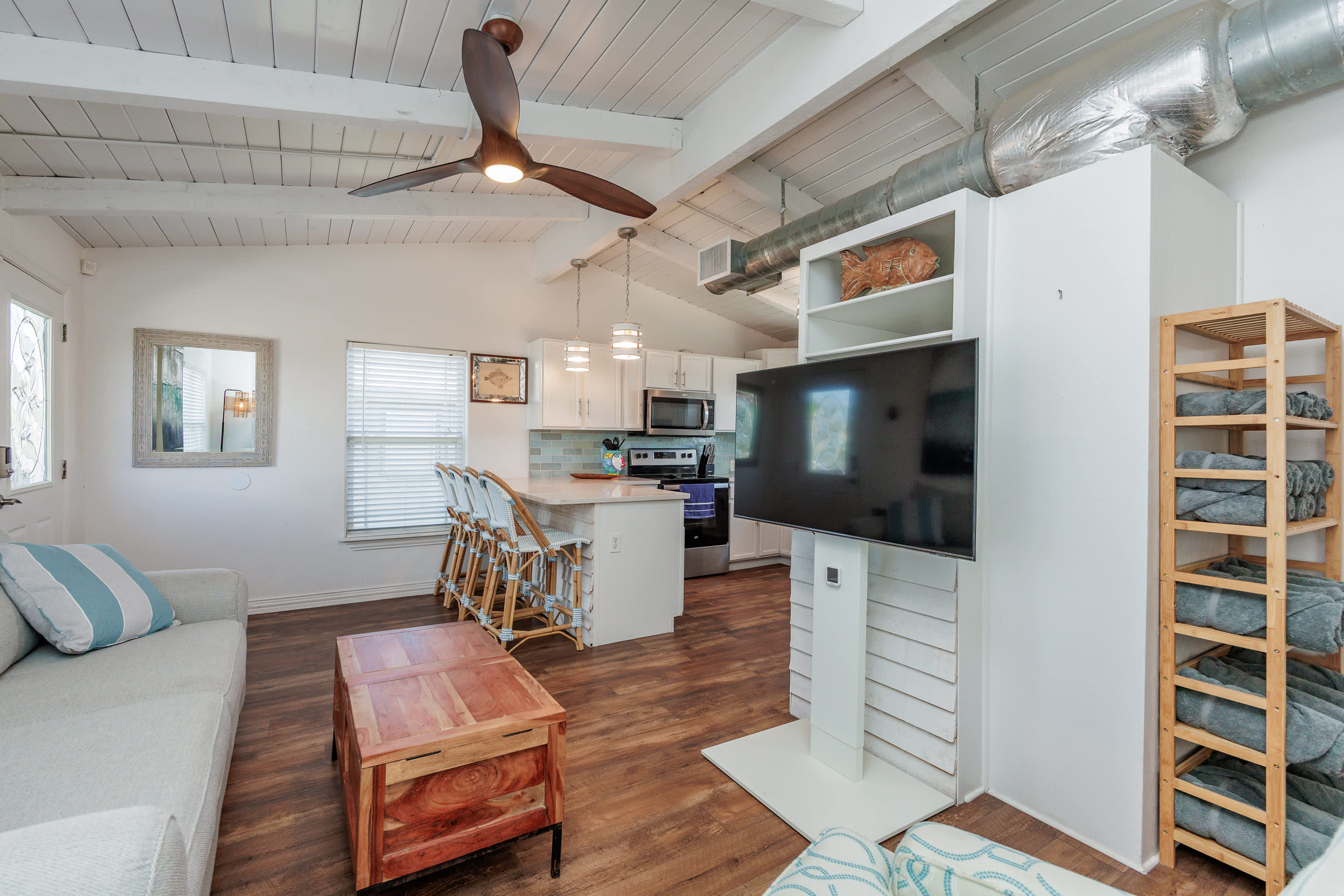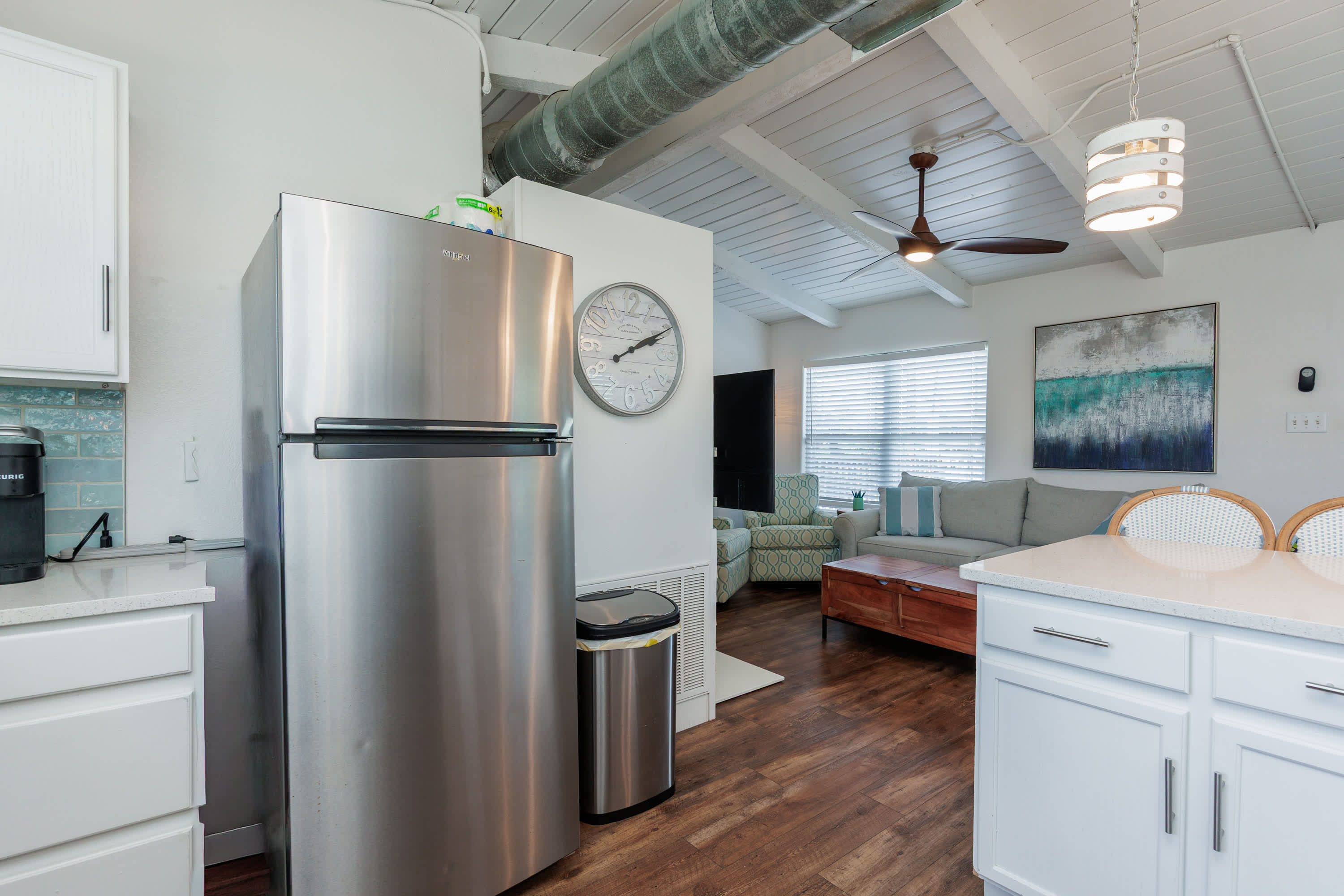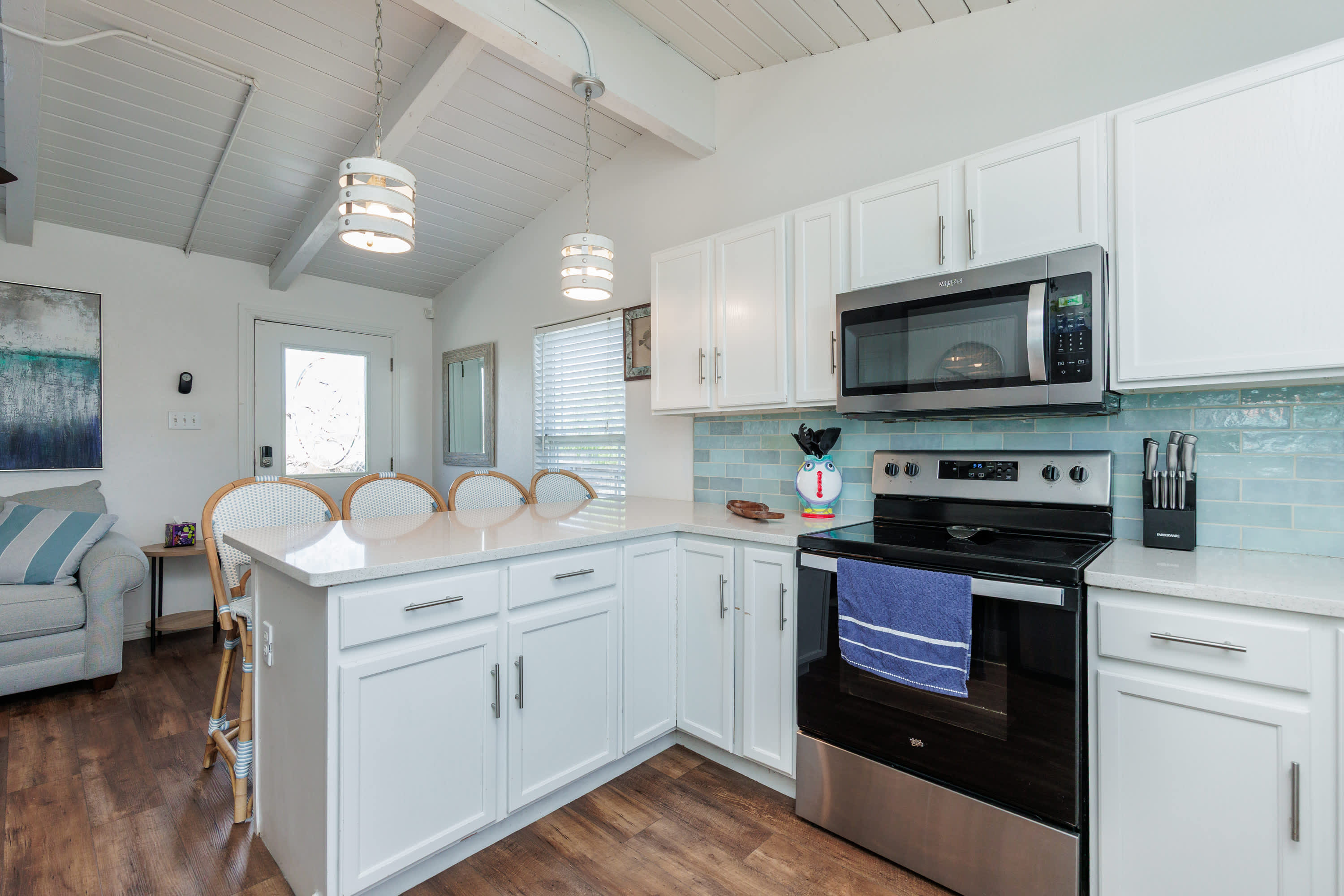 Inside, the home welcomes you with a bright and inviting living room, complete with a smart TV, a plush couch, and two cozy armchairs perfect for movie nights or relaxing after a day in the sun. The open kitchen flows seamlessly into the space, featuring stainless steel appliances, a Keurig for your morning coffee, and counter seating for four where everyone can gather around while meals are prepared. Step outside to the upper deck, to look out over the pool and enjoy meals outside with the sea breeze as your backdrop. From there, stairs lead down to the patio, where your private pool awaits—an ideal spot to cool off, lounge, and soak in the Port Aransas sunshine. Someday Isle is designed for easy relaxation and unforgettable coastal memories.