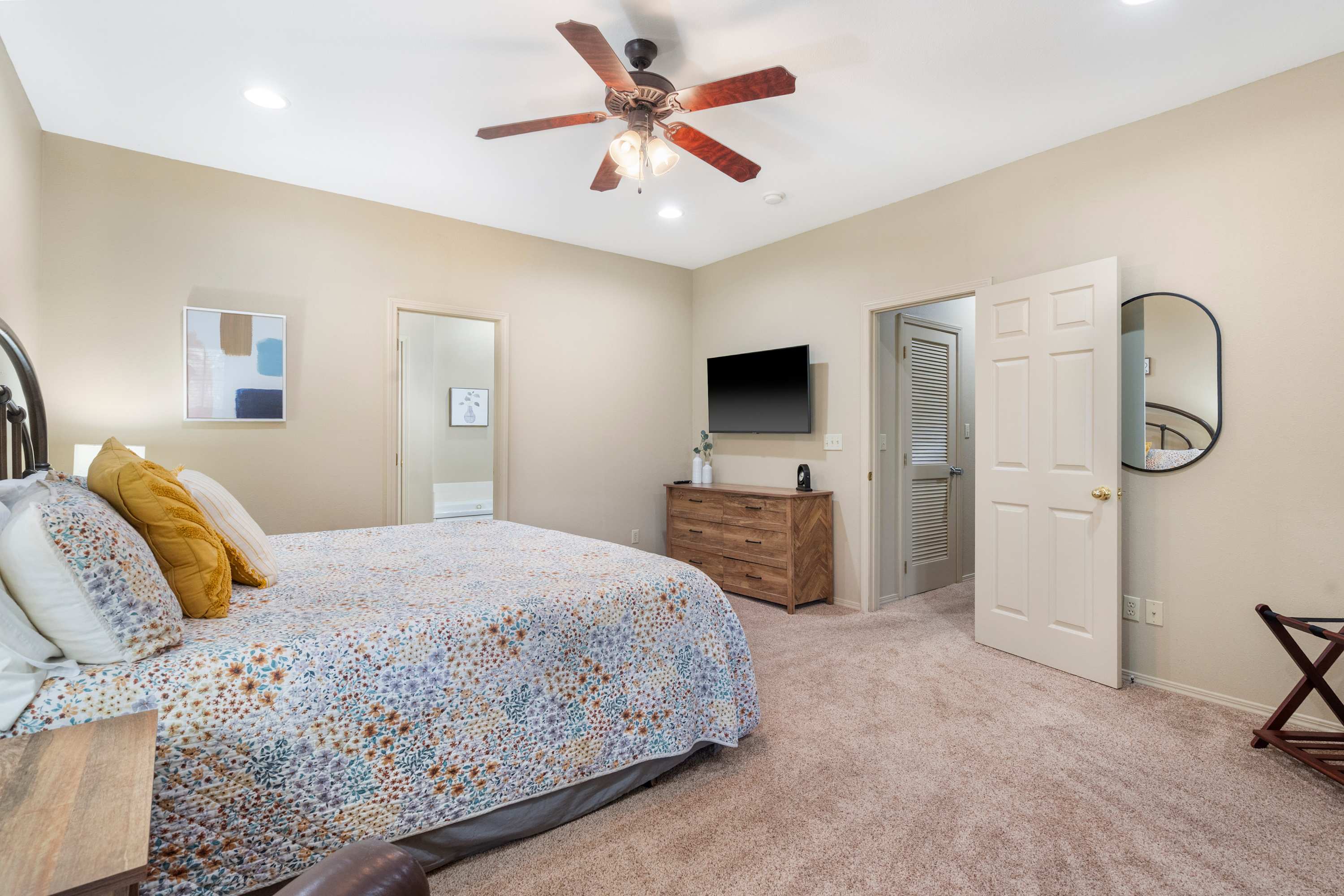 Bedroom #2 includes a queen-size bed, smart TV, and an ensuite bathroom with a single vanity and a shower/tub combo.
