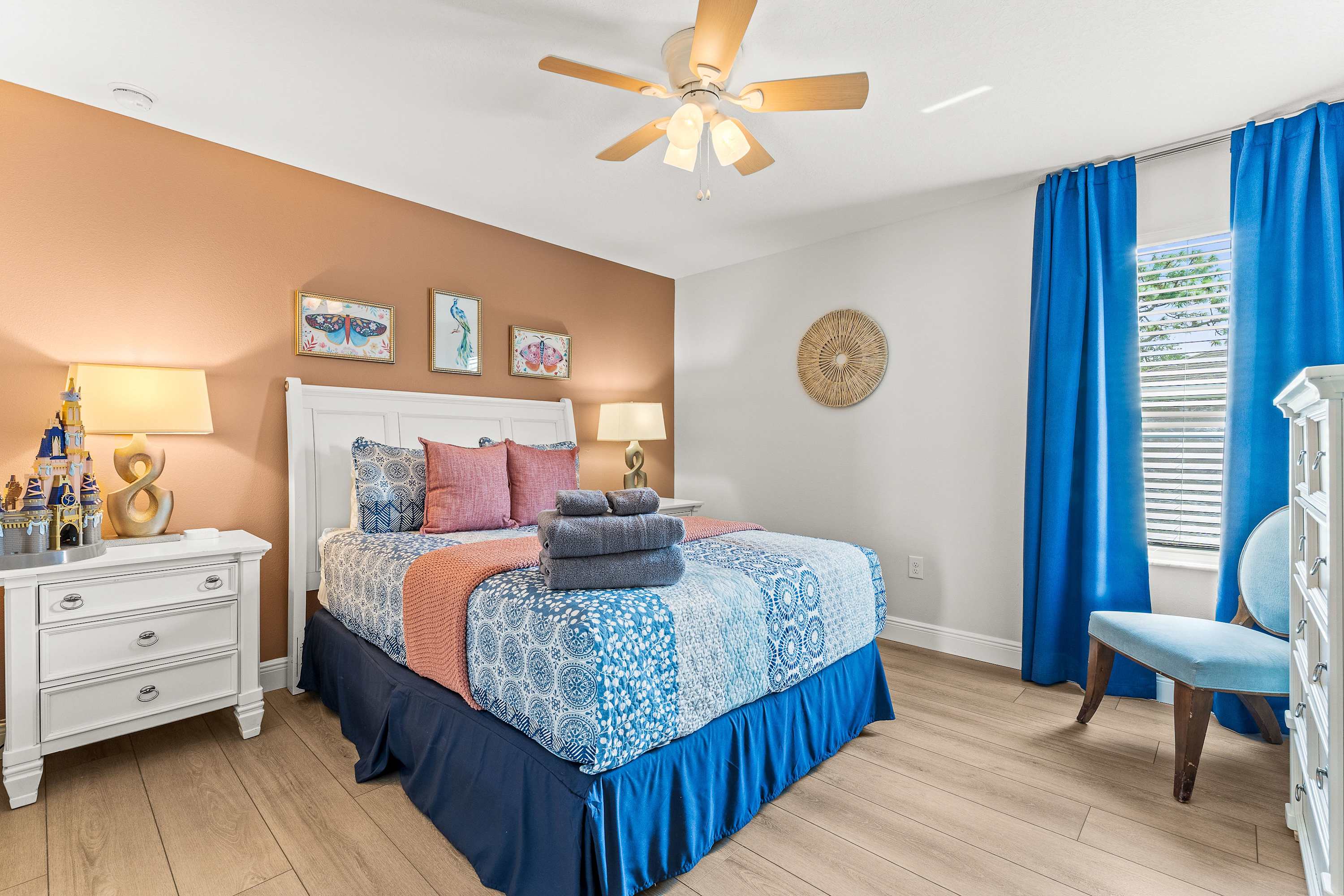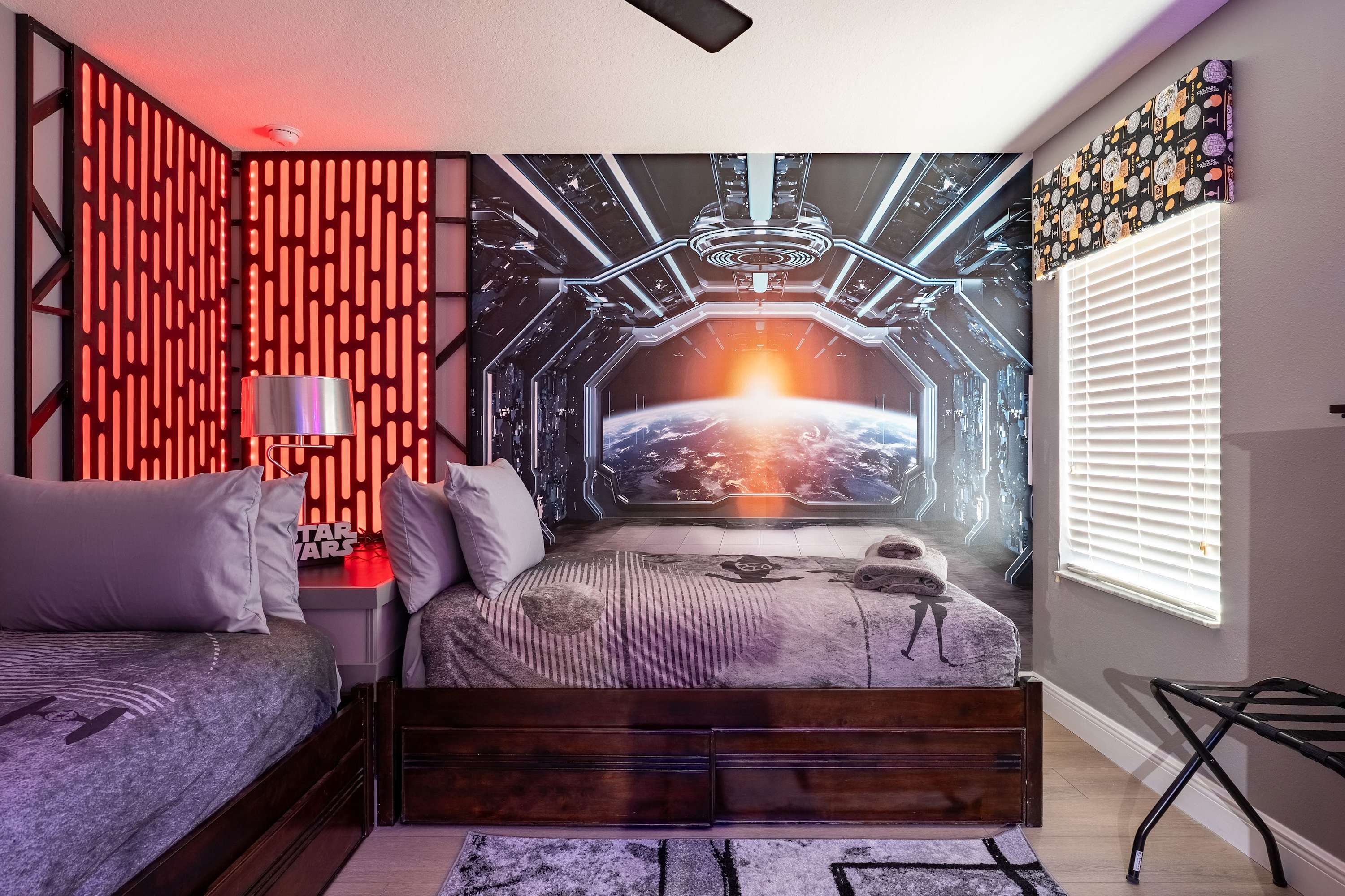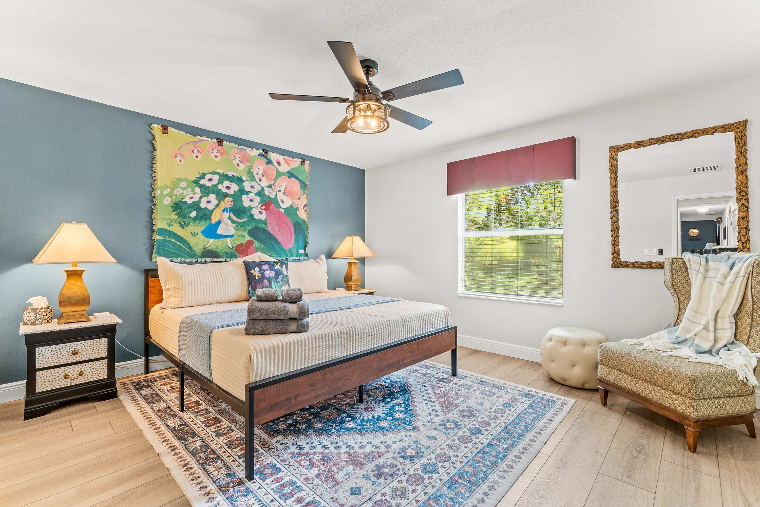 Bedroom #5 is Alice in Wonderland themed and includes a king size bed and a smart TV.