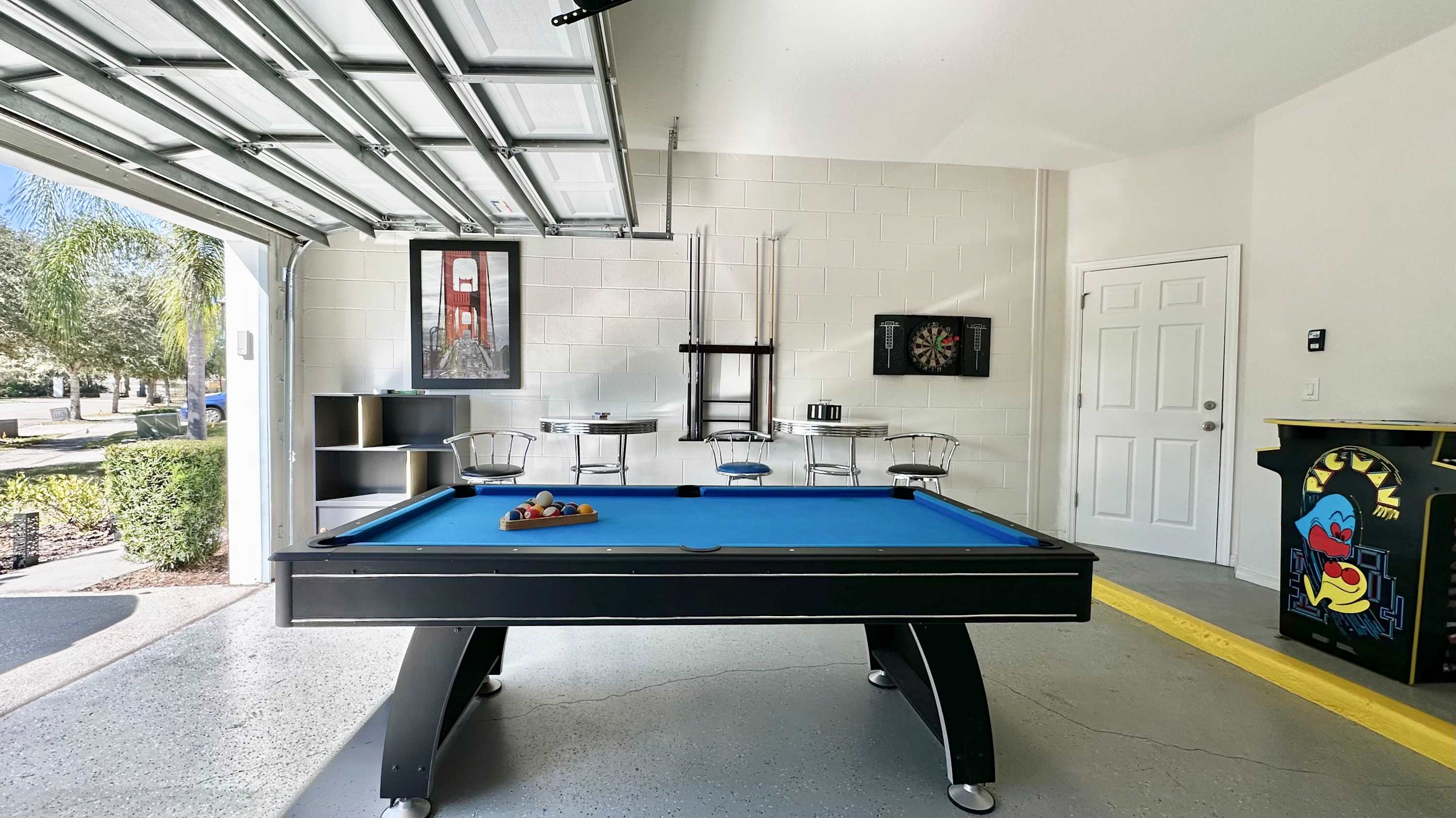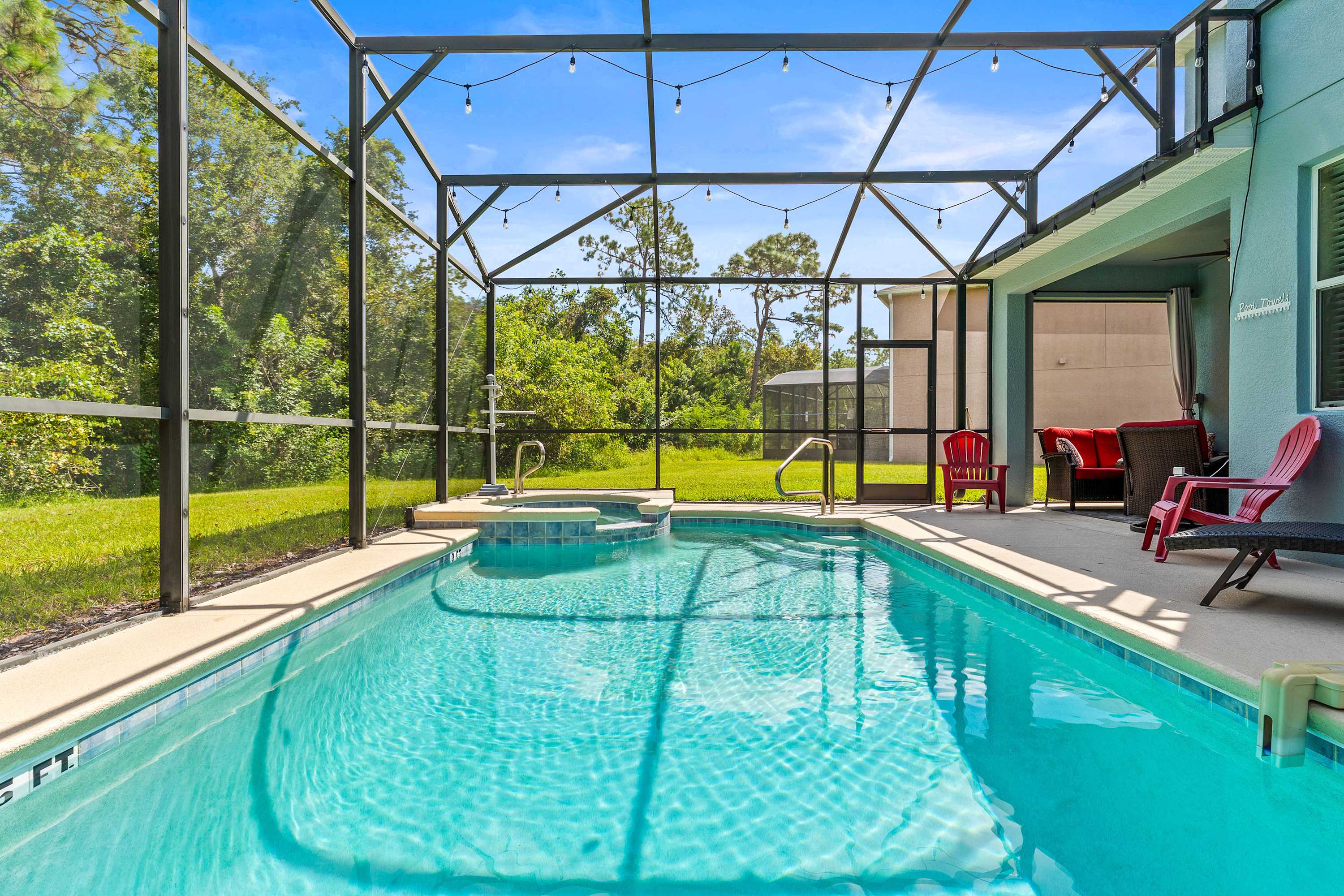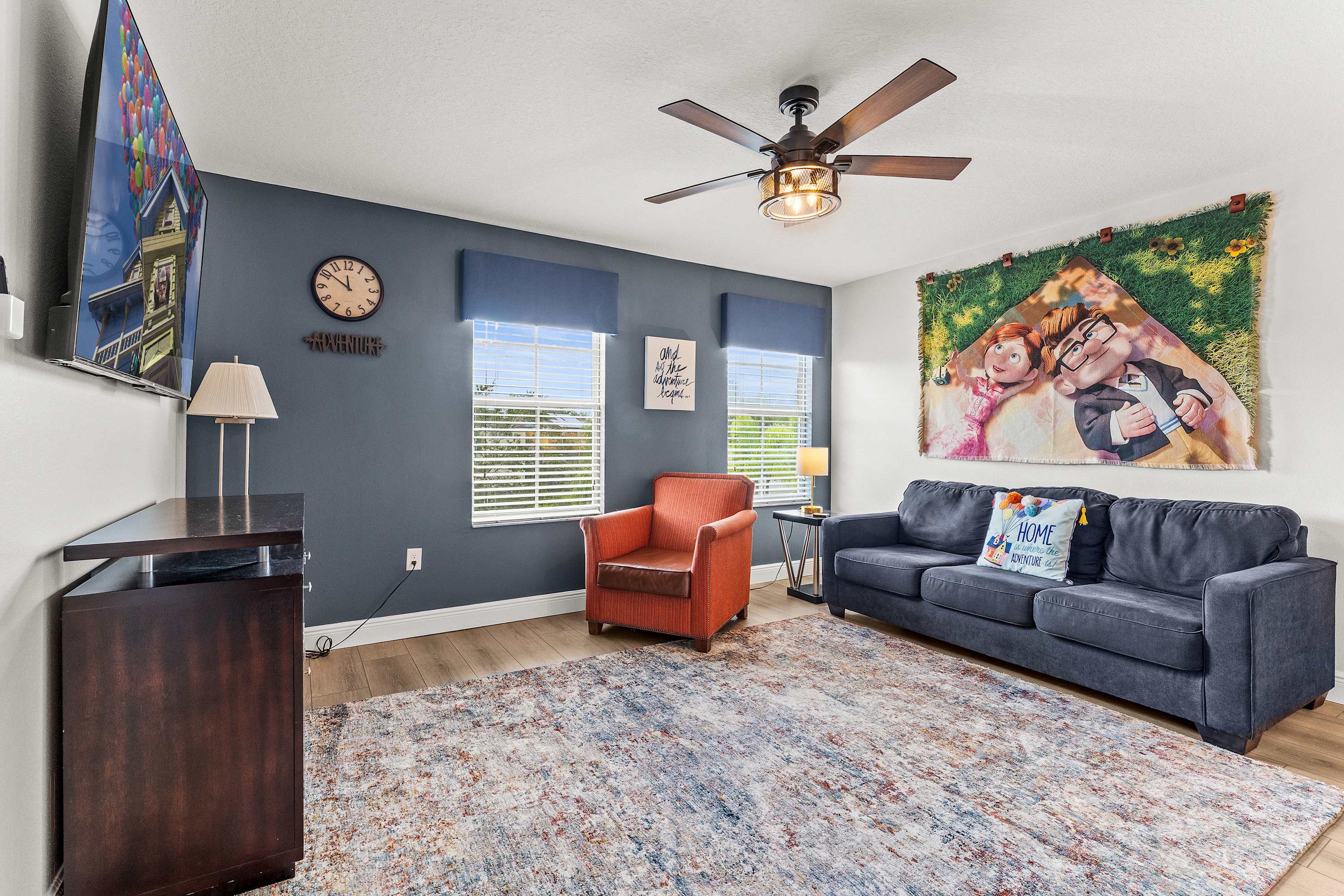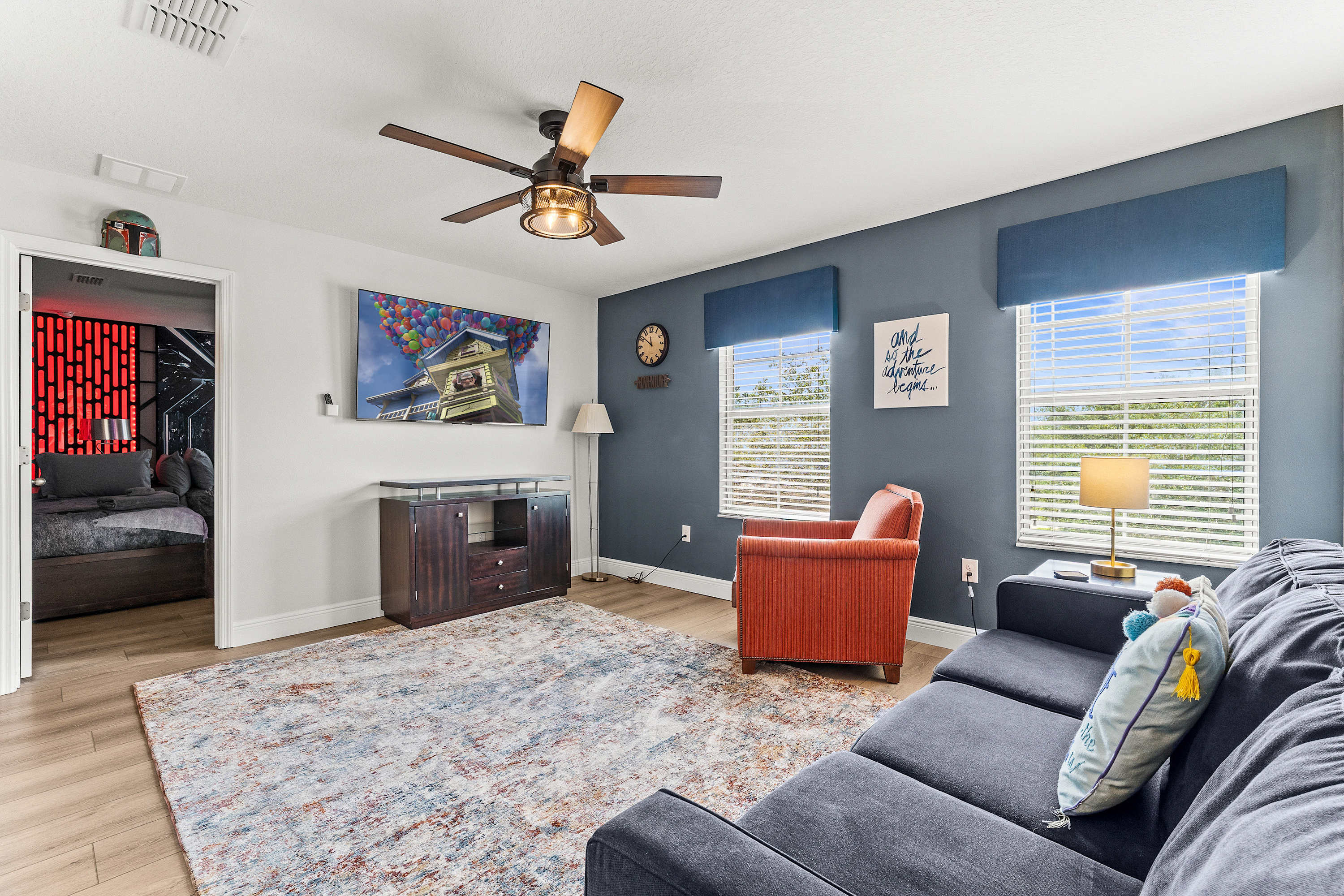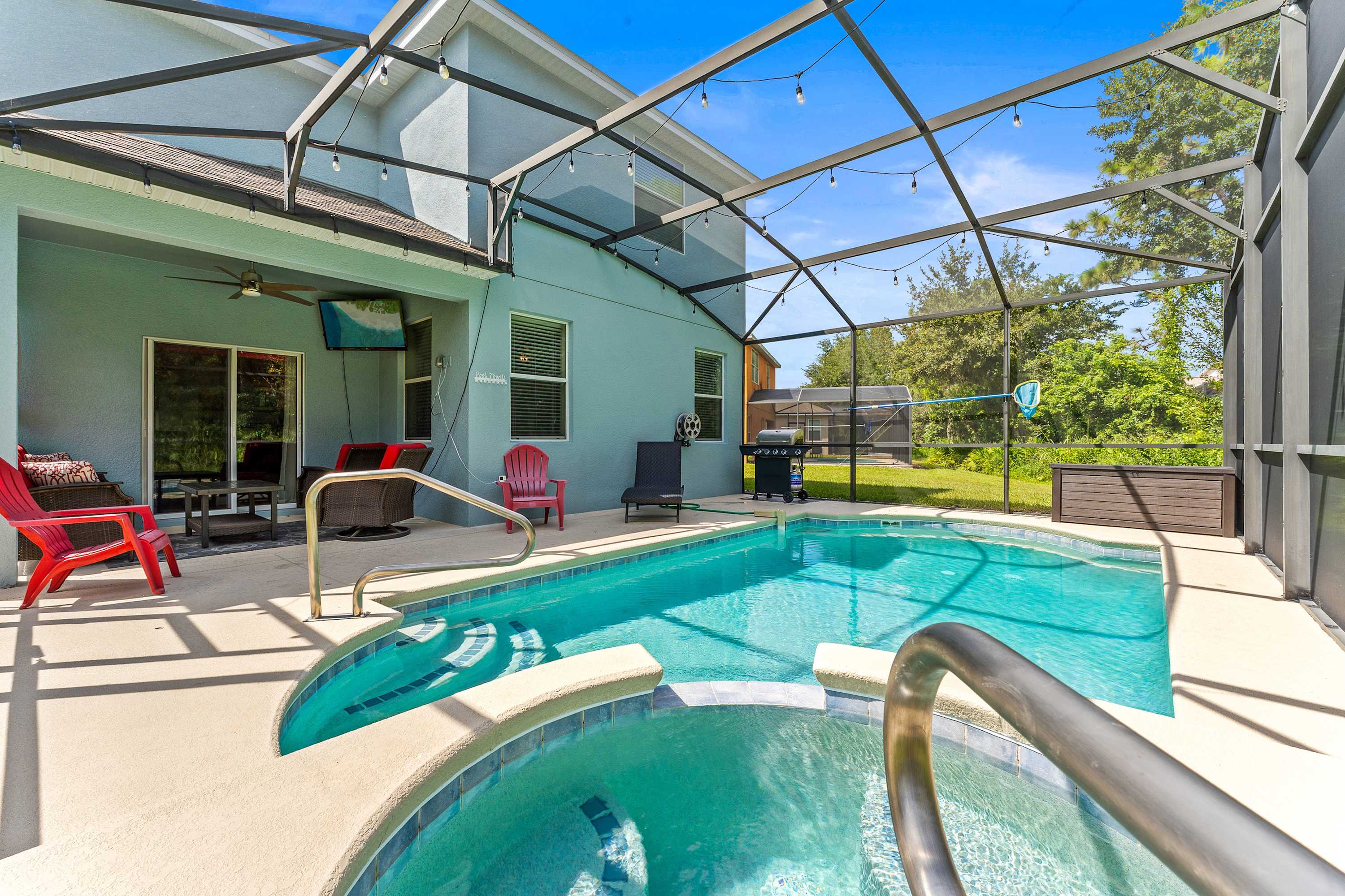 Step through to the lanai, where a private pool and bubbling hot tub overlook lush greenery—your own secluded escape. Loungers and a shaded sitting area create the perfect spot for sunbathing or unwinding under the stars. The fun continues in the game room, featuring a pool table, darts, Connect 4, and bar seating for four, A Pac-Man Arcade game, all kept cool by air conditioning. Upstairs, the loft transforms movie night into an experience, complete with a mini fridge, popcorn station, and “Up”-themed décor. A built-in buffet and cozy sofa make it a favorite gathering spot for guests of all ages.