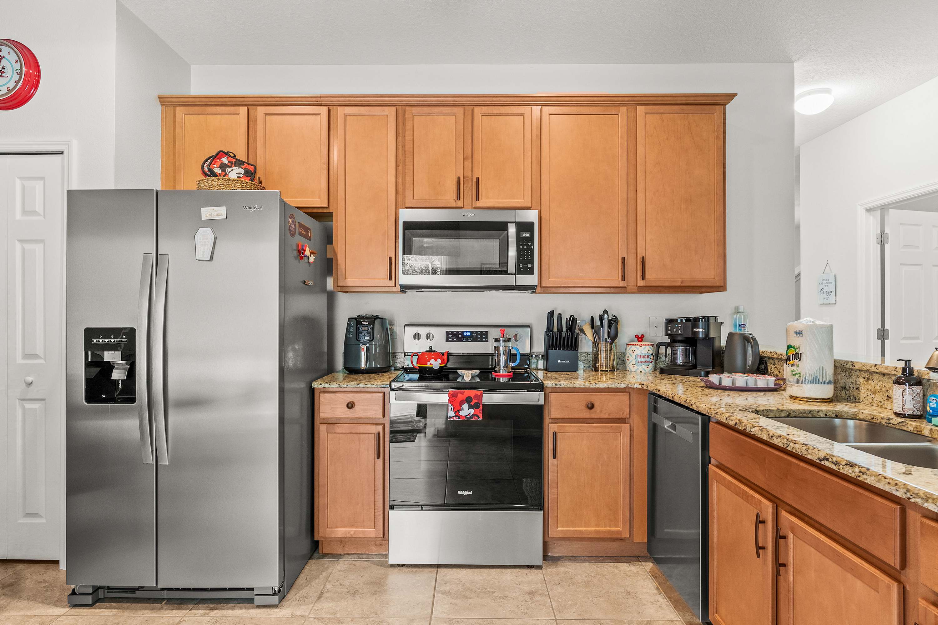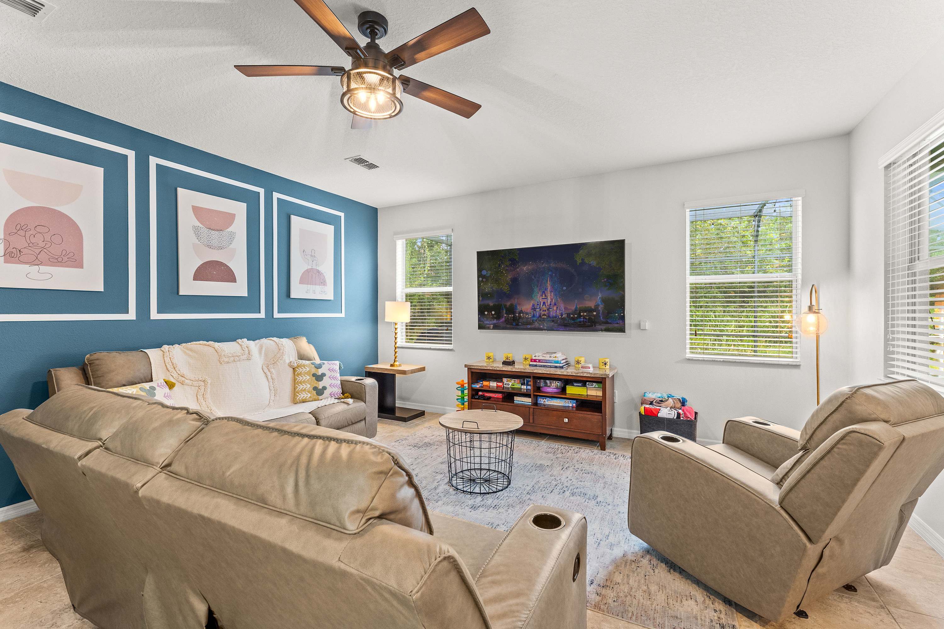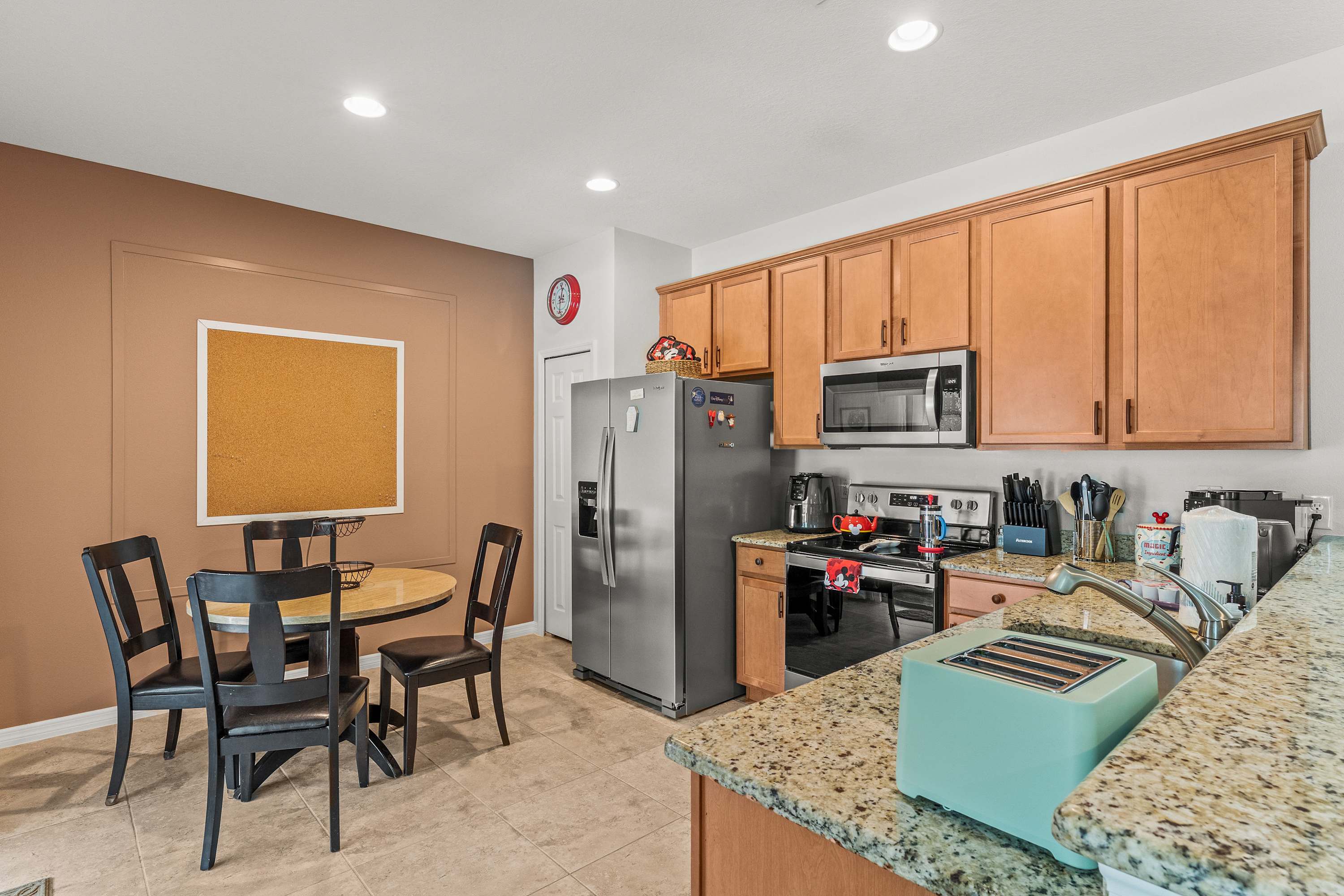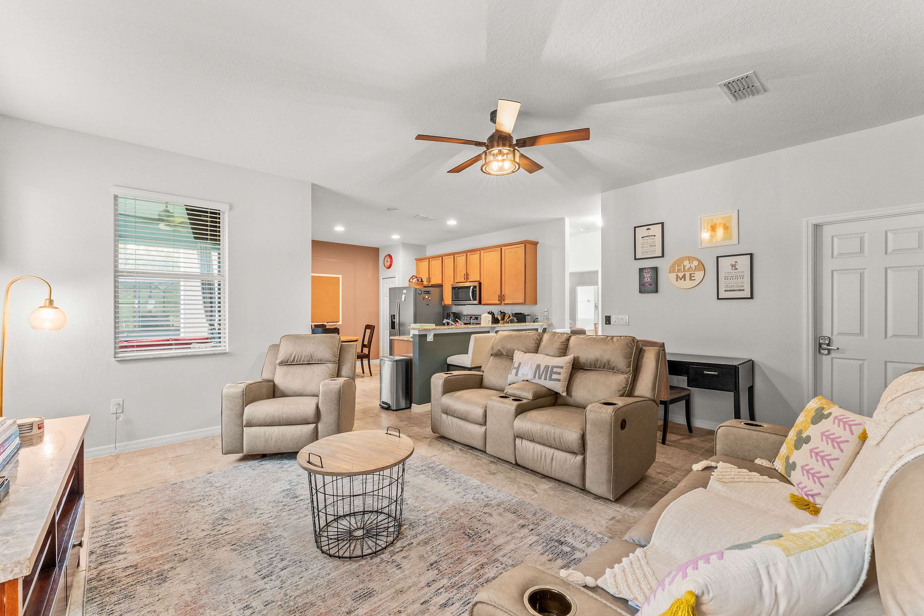 Step inside this thoughtfully designed home and feel an instant sense of vacation ease. The living room welcomes you with plush recliner sofas, an armchair, and a smart TV perfect for movie nights. Modern Disney artwork adds a playful touch, while a cozy desk area makes it easy to balance a bit of work with play. The kitchen gleams with stainless steel appliances, granite countertops, and an in-demand drip coffee maker, making it a dream for preparing meals or morning coffee. Gather at the kitchen nook table for four with peaceful views of the pool, or host a dinner at the dining table that comfortably seats eight.