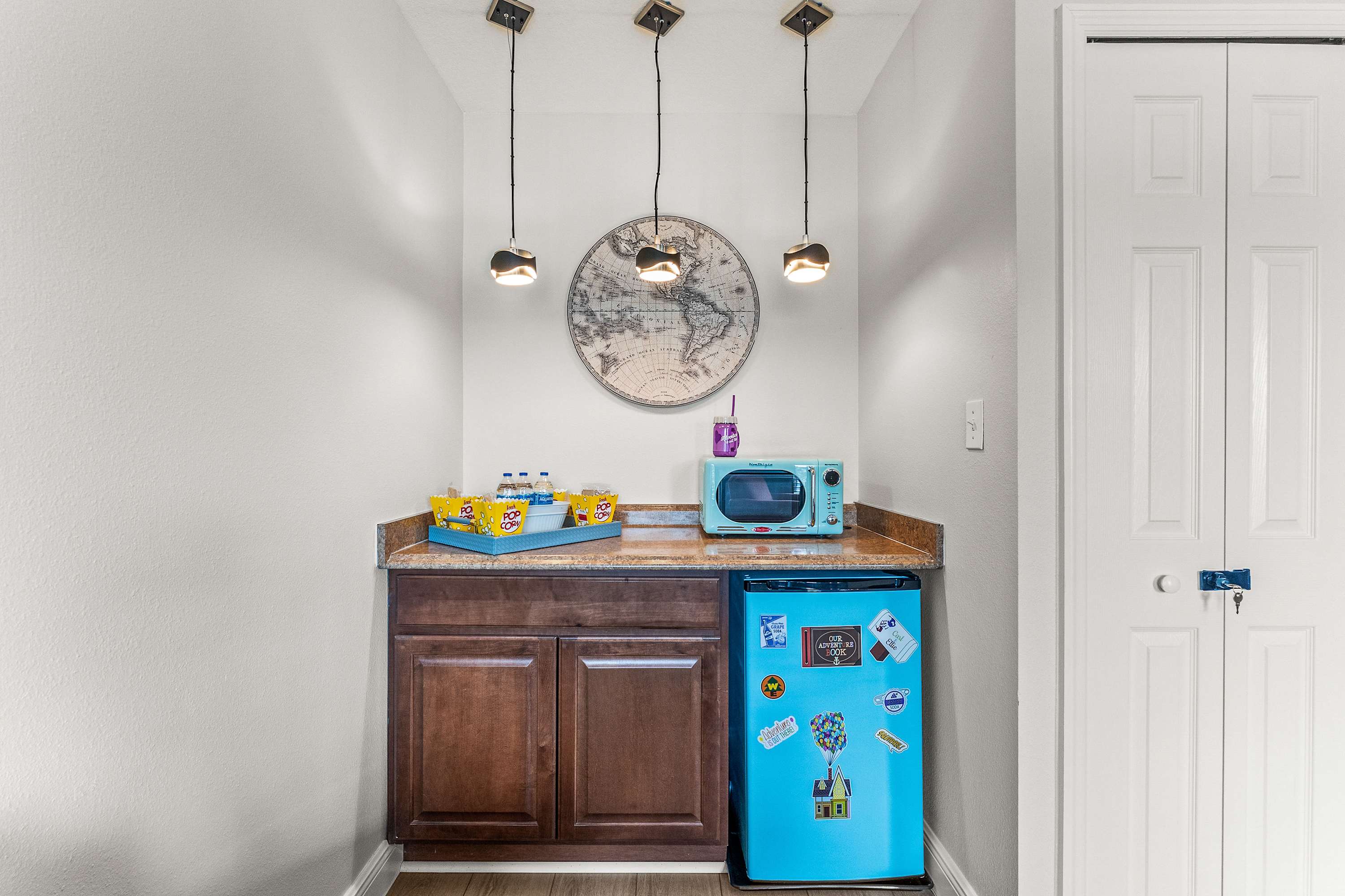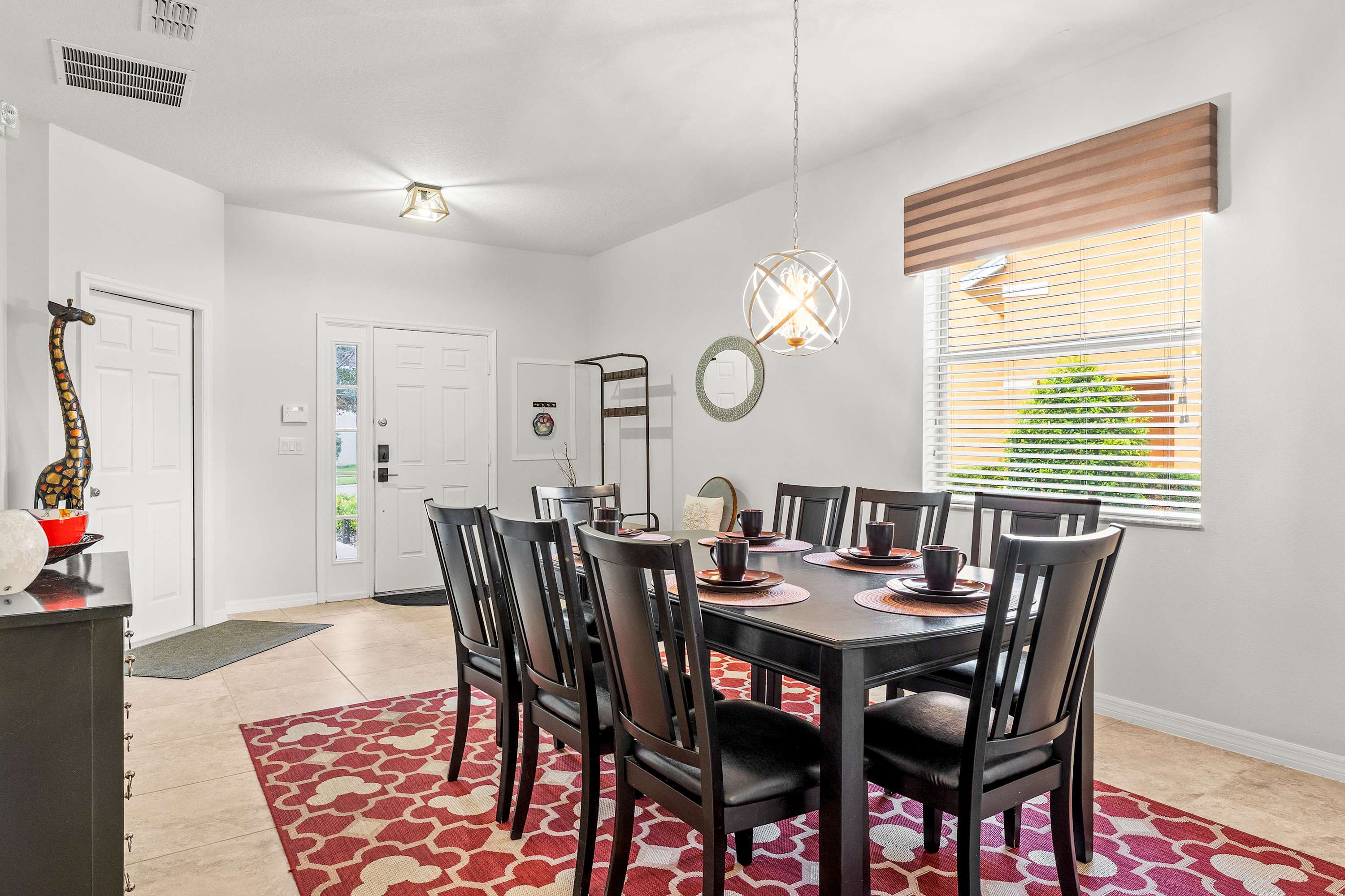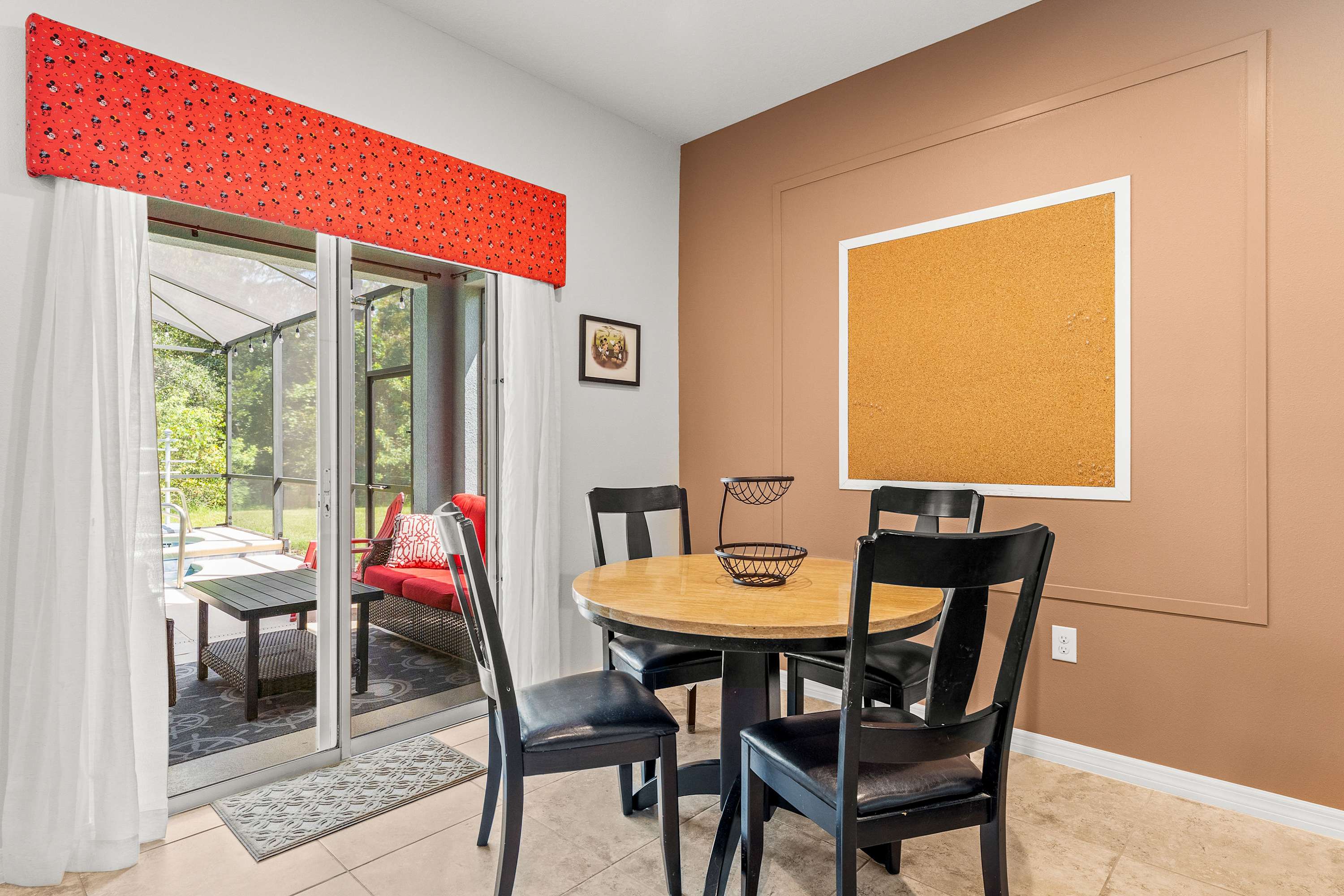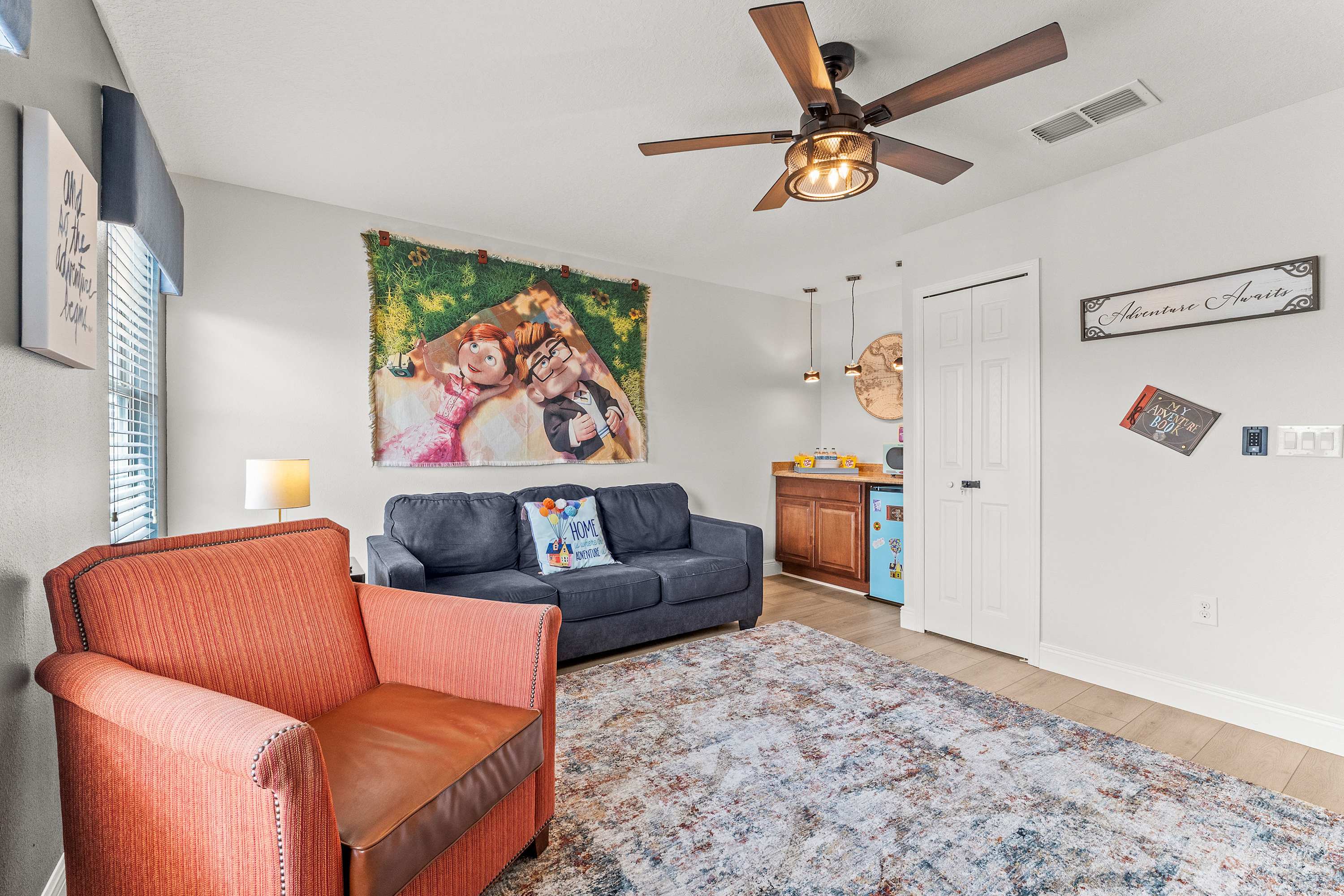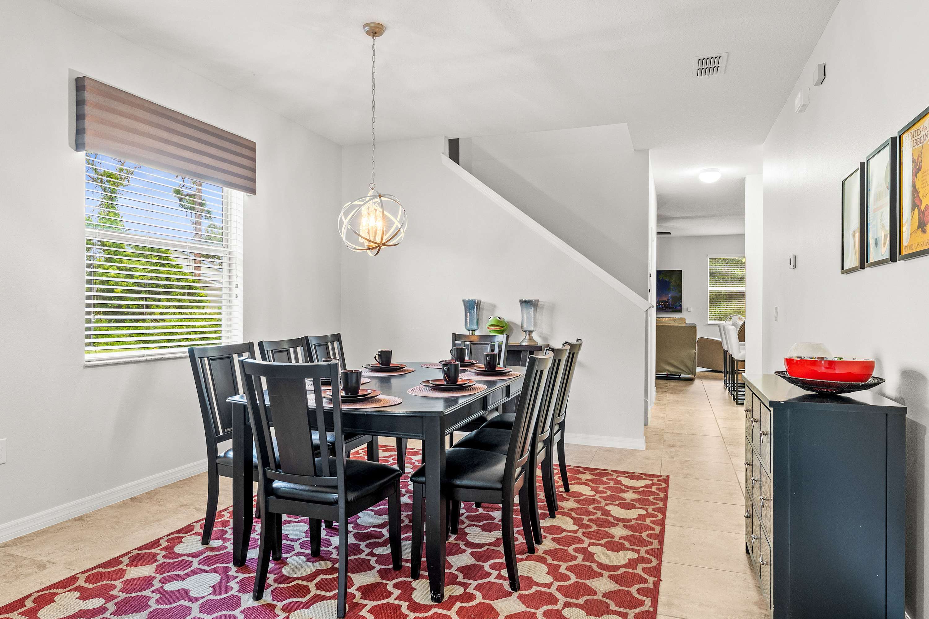 Step inside this thoughtfully designed home and feel an instant sense of vacation ease. The living room welcomes you with plush recliner sofas, an armchair, and a smart TV perfect for movie nights. Modern Disney artwork adds a playful touch, while a cozy desk area makes it easy to balance a bit of work with play. The kitchen gleams with stainless steel appliances, granite countertops, and an in-demand drip coffee maker, making it a dream for preparing meals or morning coffee. Gather at the kitchen nook table for four with peaceful views of the pool, or host a dinner at the dining table that comfortably seats eight.