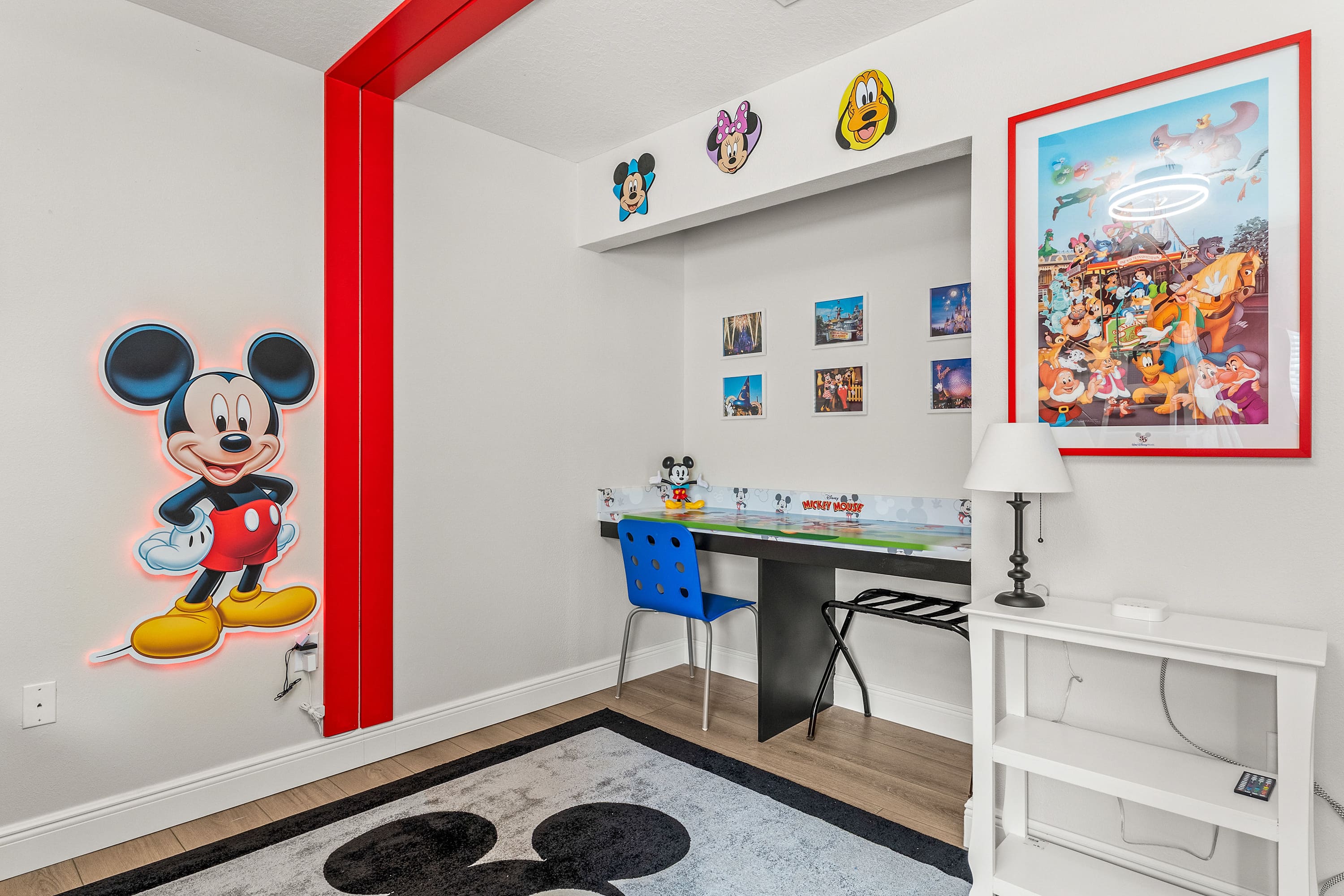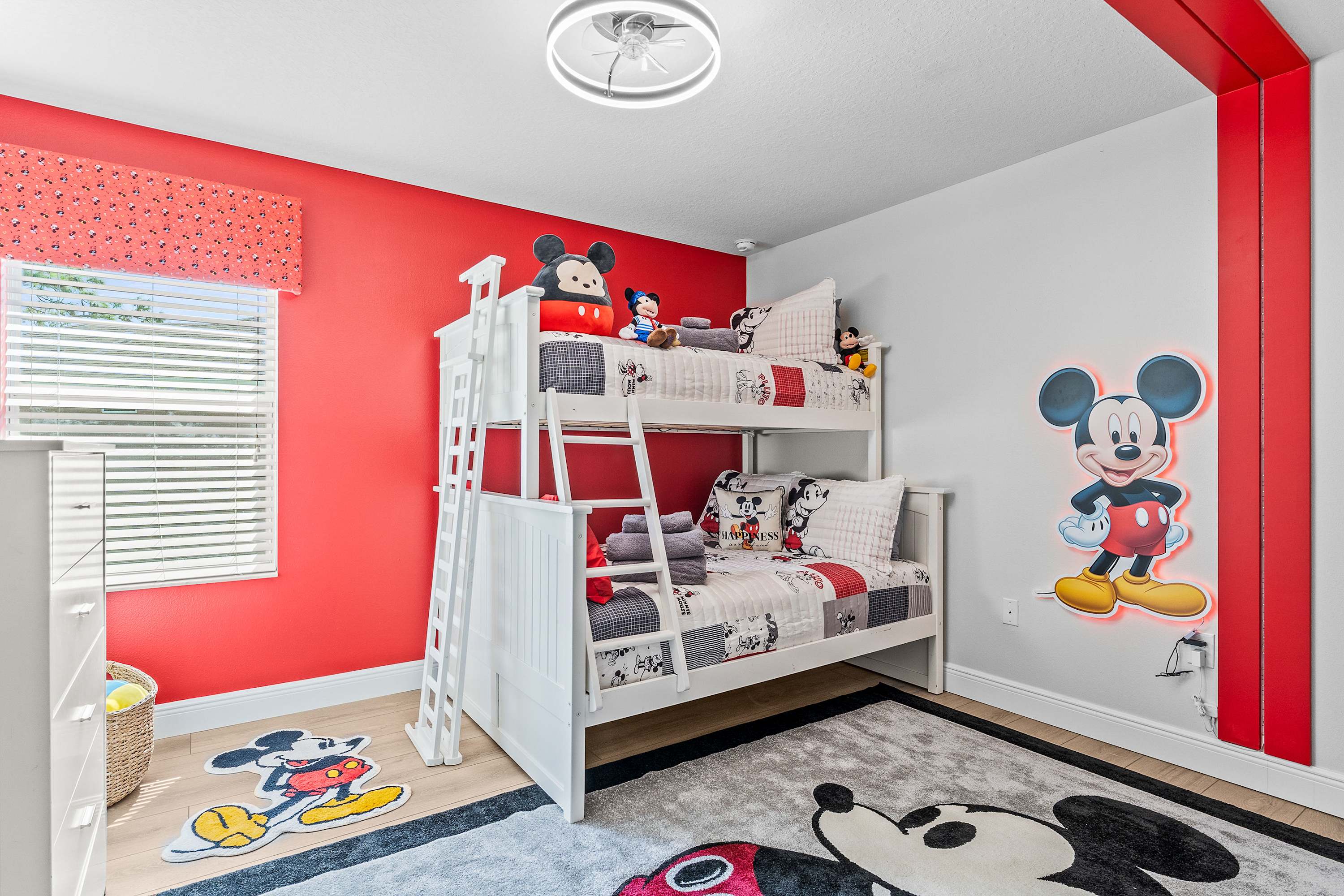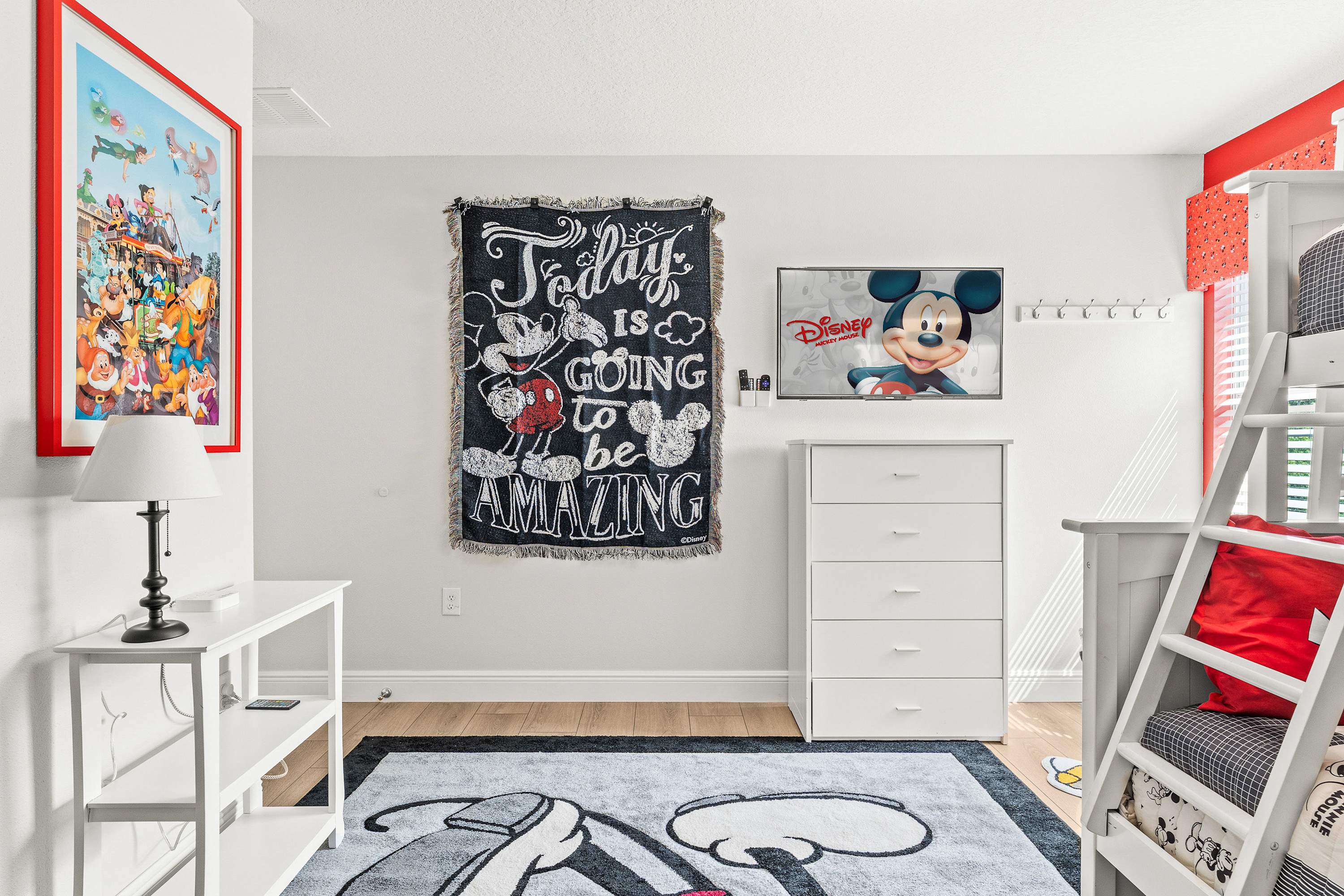 Bedroom #3 is Mickey Mouse themed twin-over-full bunk beds, a smart TV, and a built-in desk.