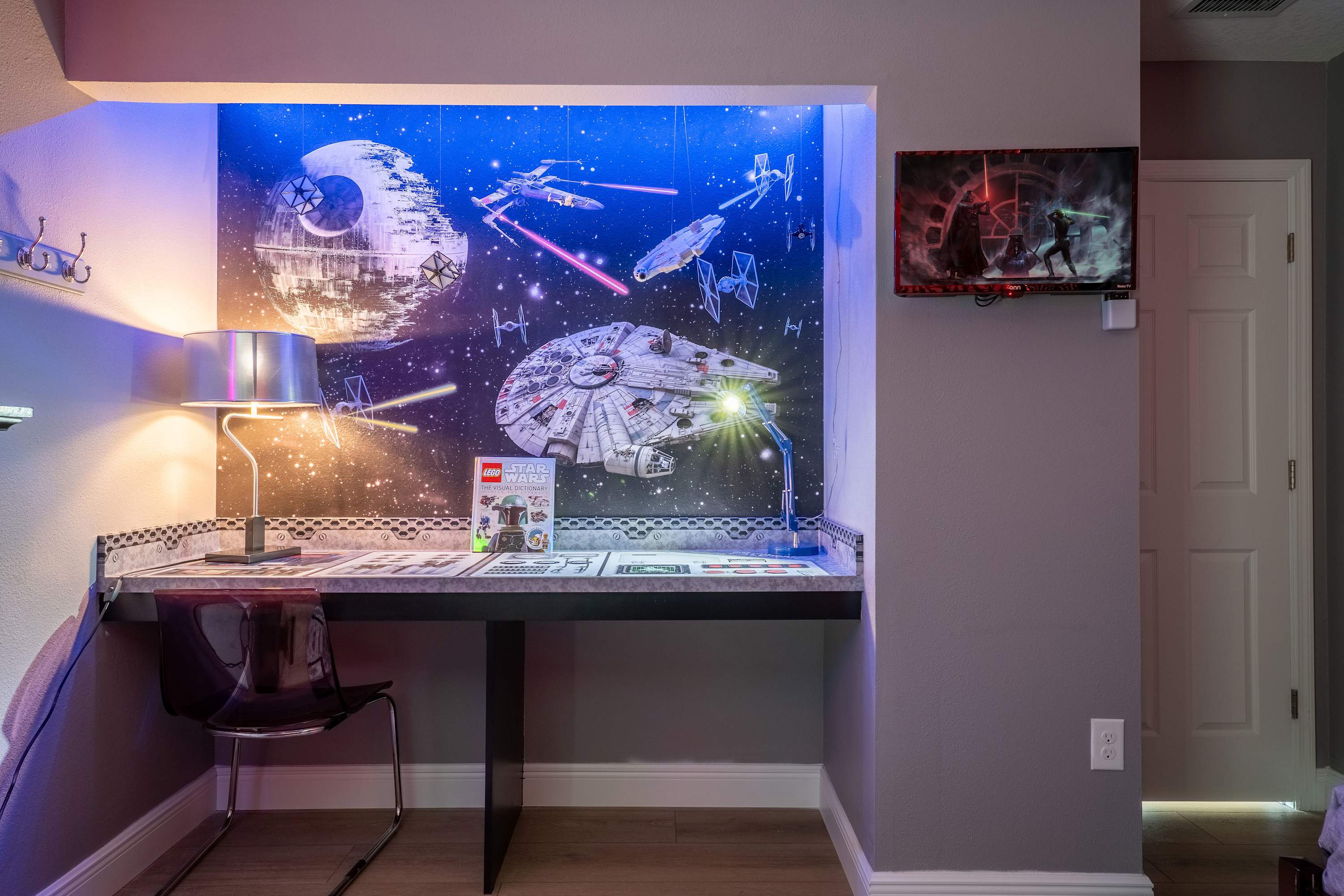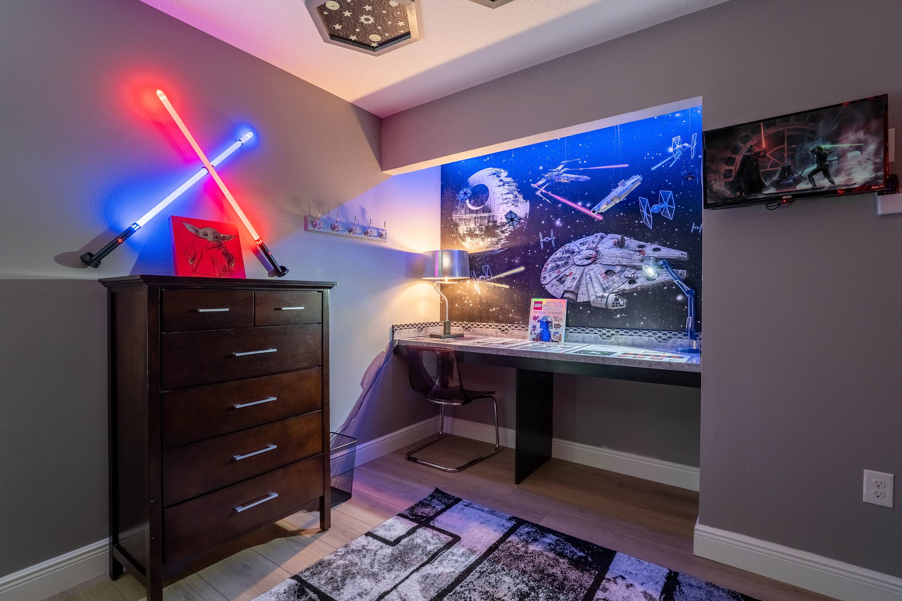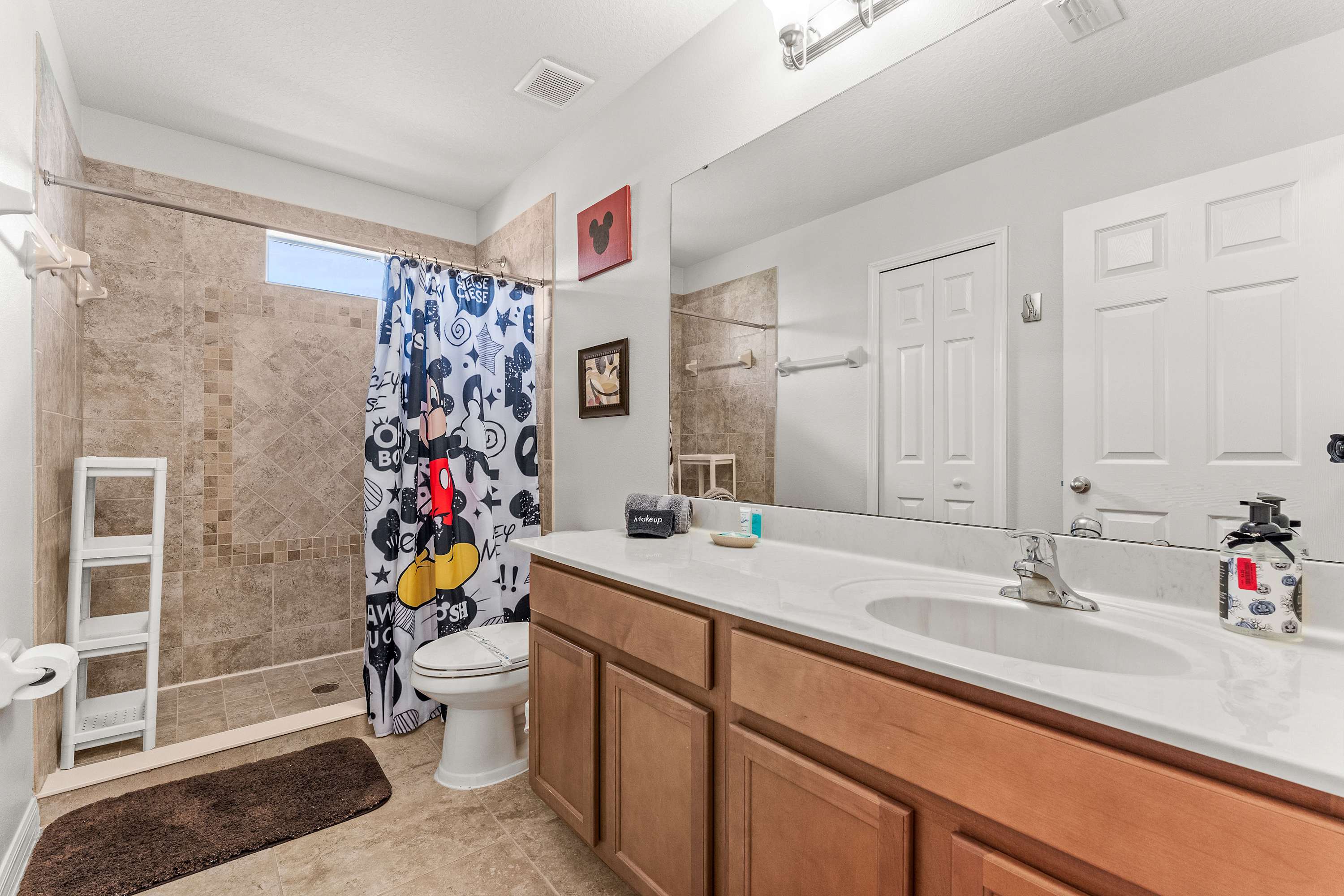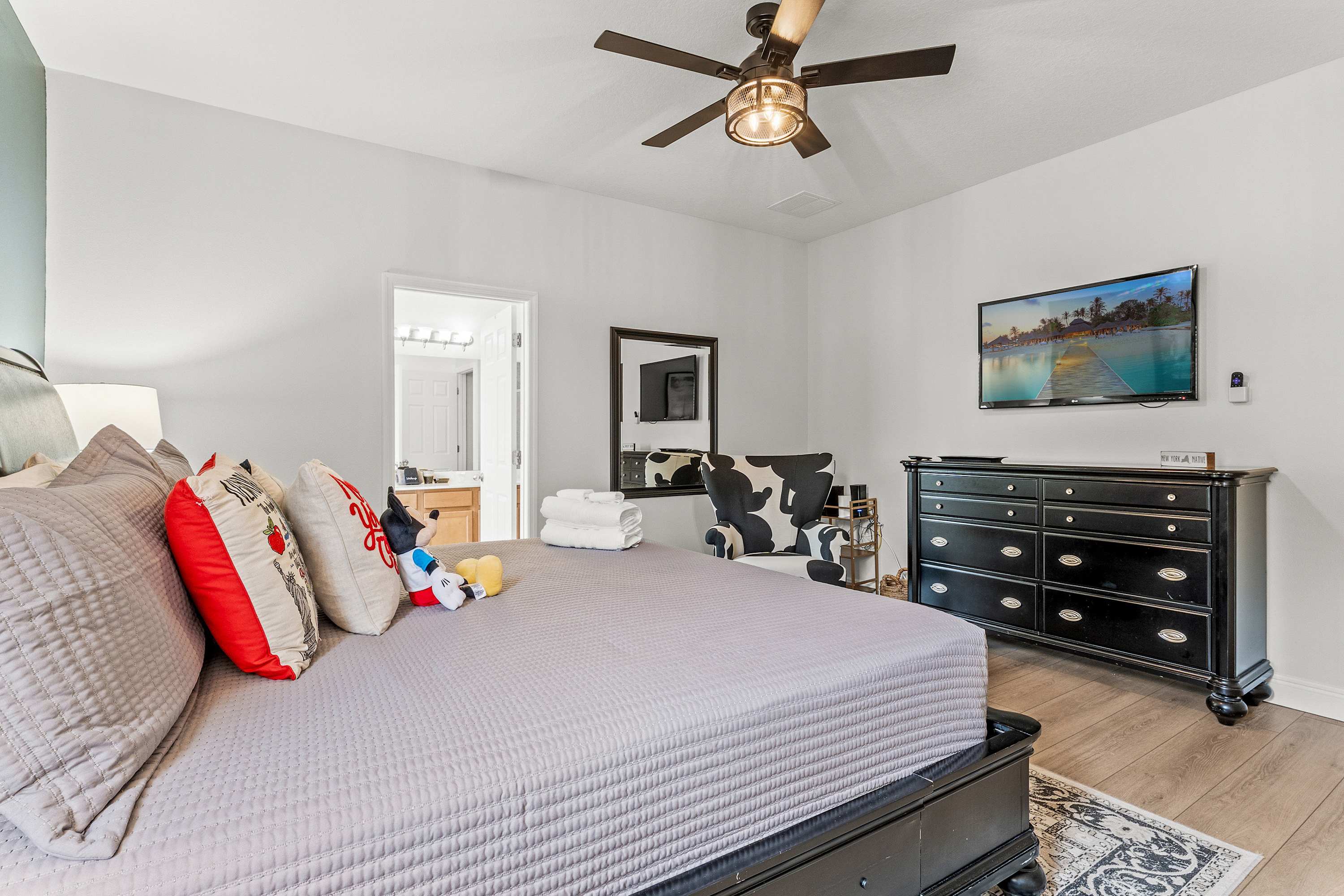 Bedroom #3 is Mickey Mouse themed twin-over-full bunk beds, a smart TV, and a built-in desk.