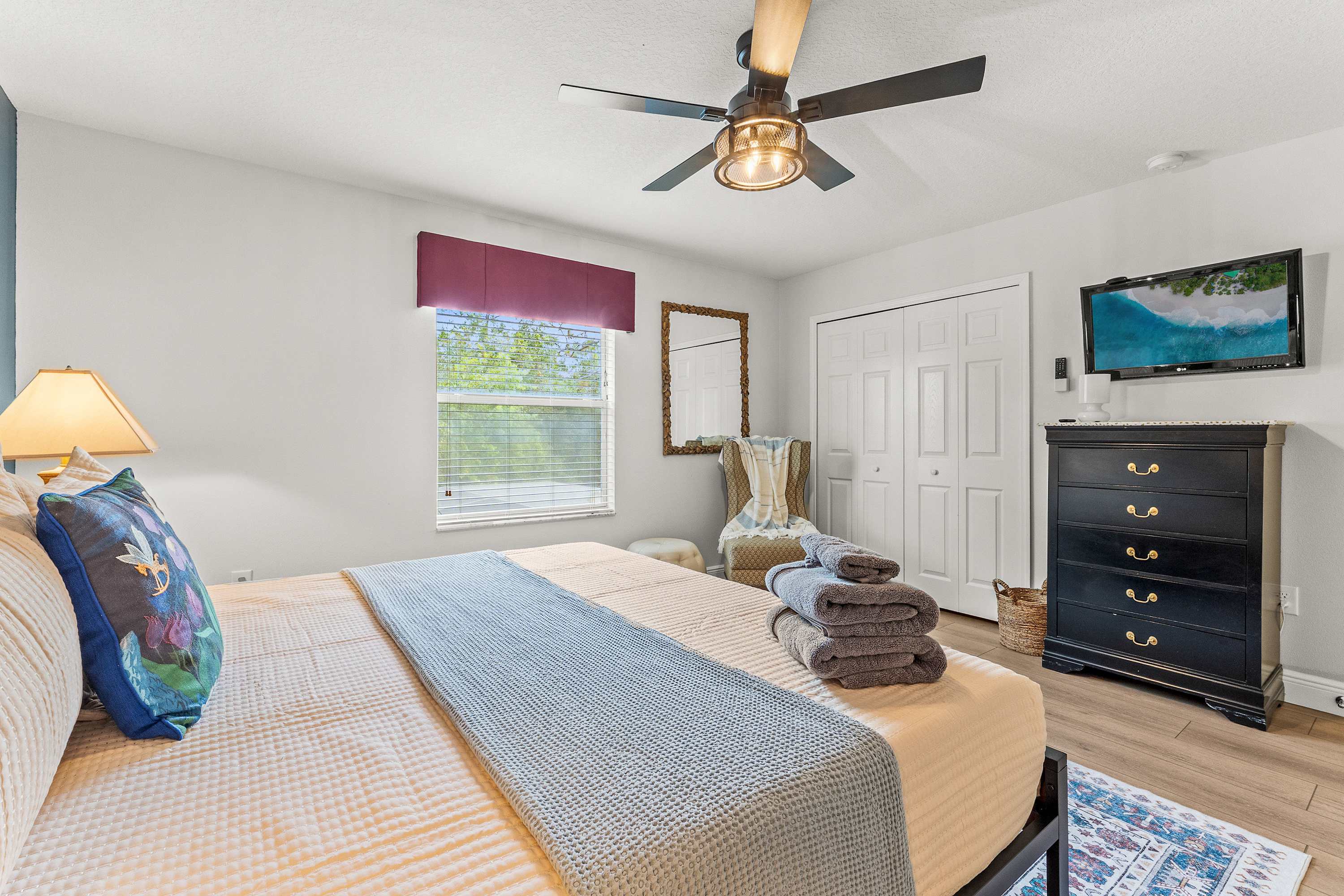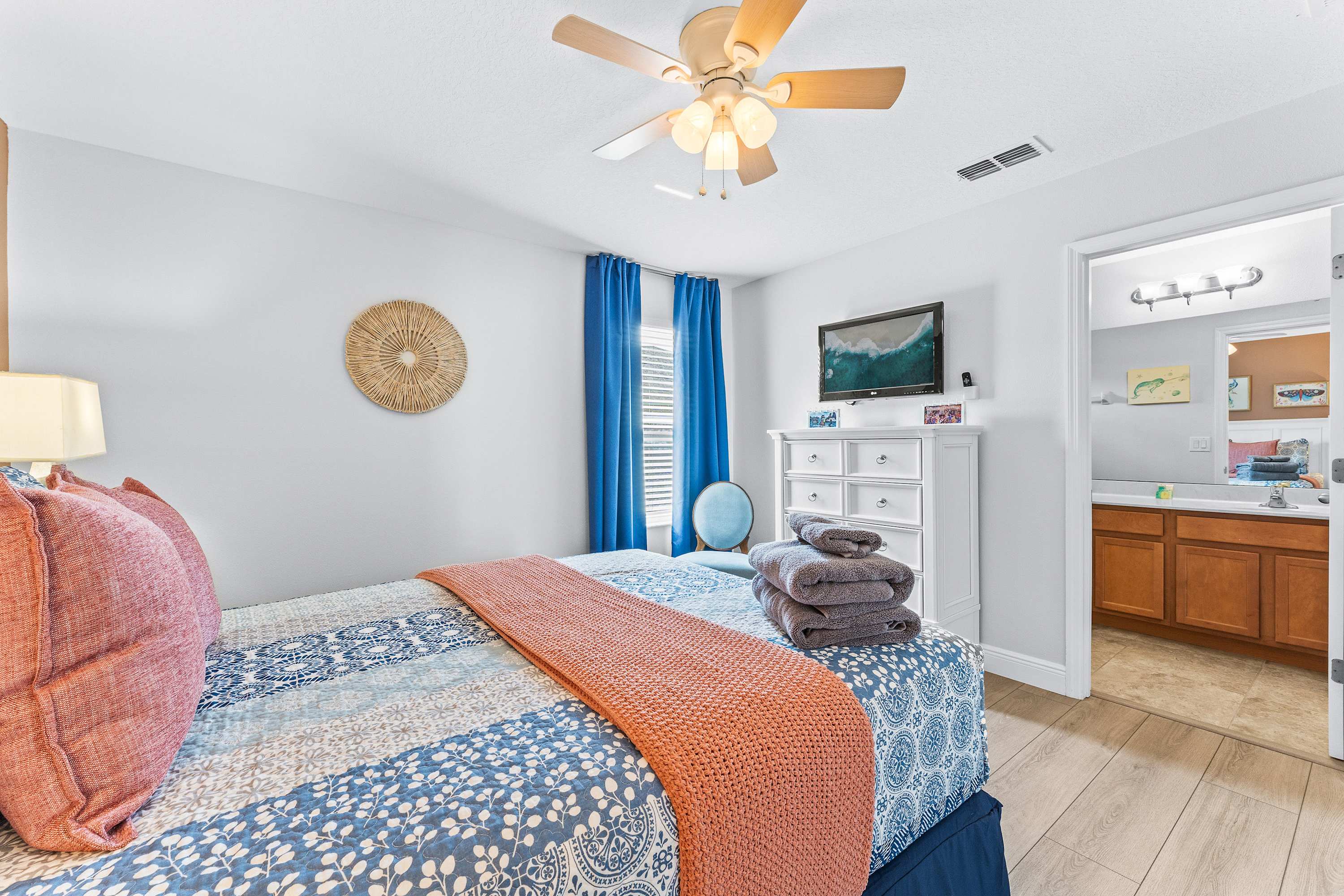 Bedroom #4 includes a queen size bed, a smart TV, and an ensuite bathroom with an oversized single vanity and a shower/tub combo.