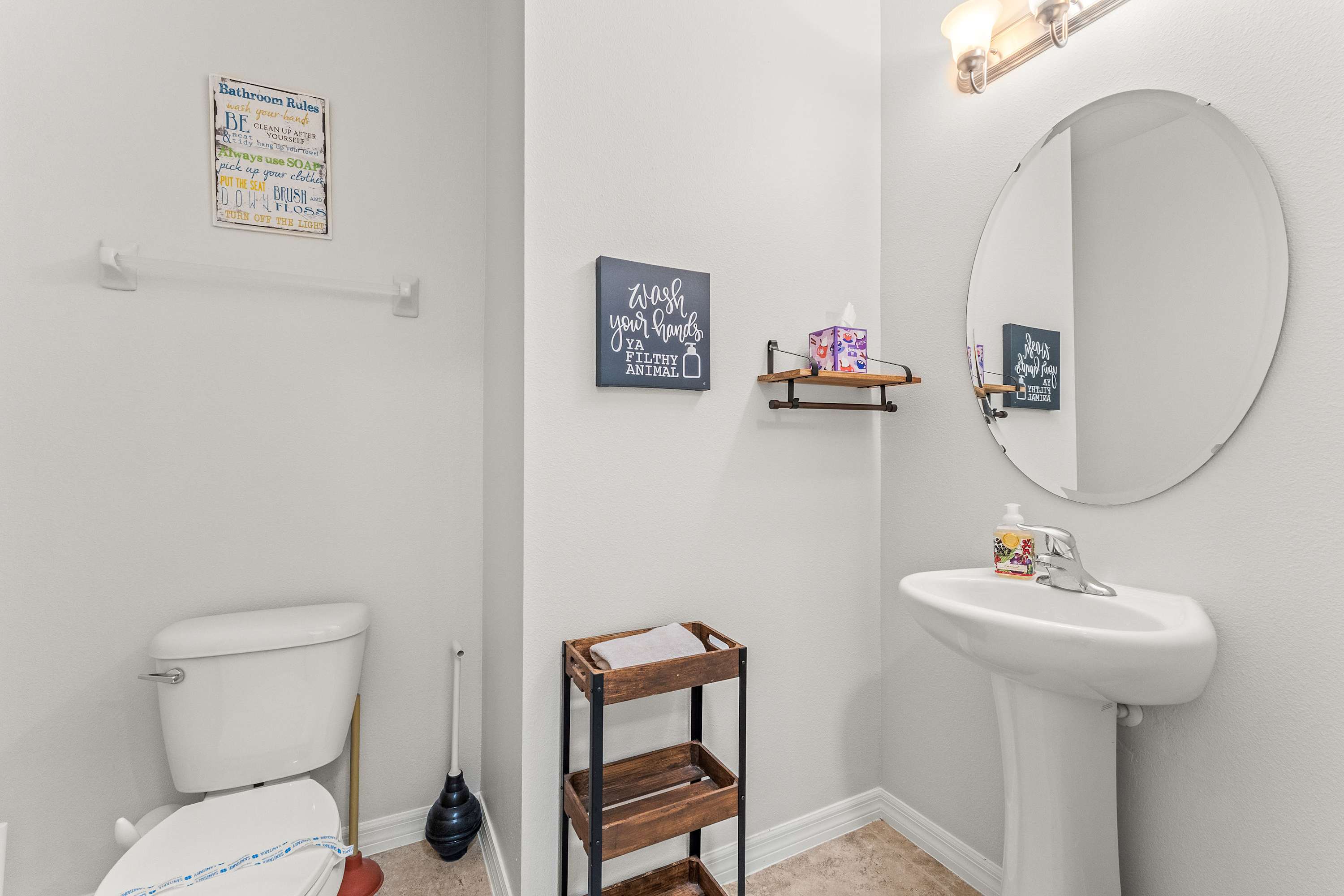 This home also includes a half bathroom with a pedestal sink as well as 3 additional full guest bathrooms; two with single vanities and walk-in showers, and one with a single vanity and a shower/tub combo.