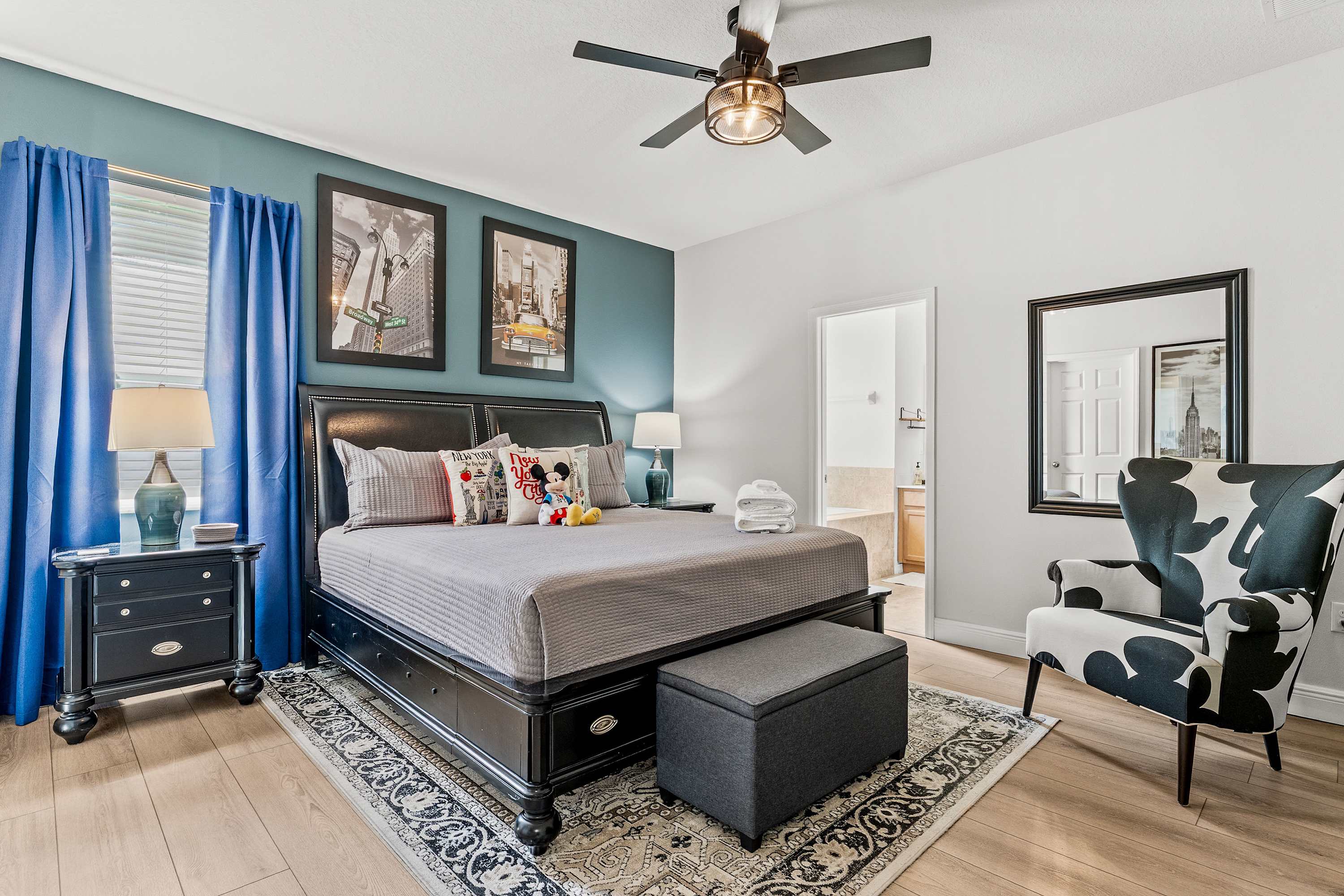 Bedroom #1 includes a king size bed, a sitting chair, a smart TV, and an ensuite bathroom with a dual vanity, a soaking tub, and a walk-in shower.