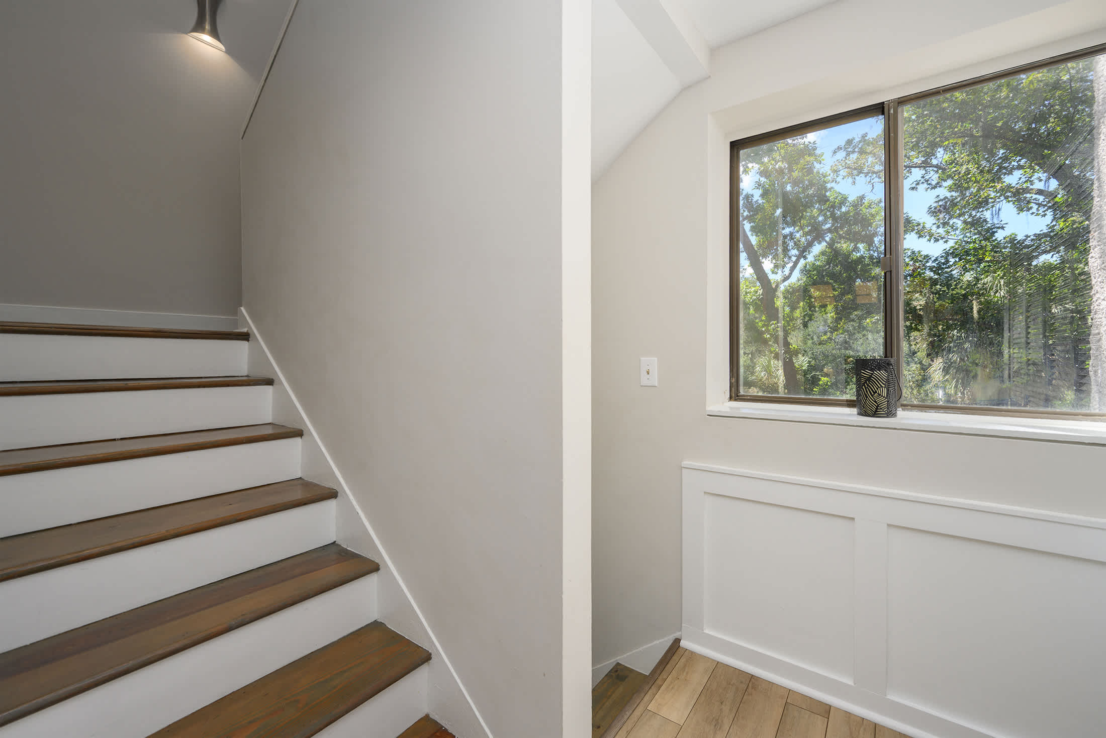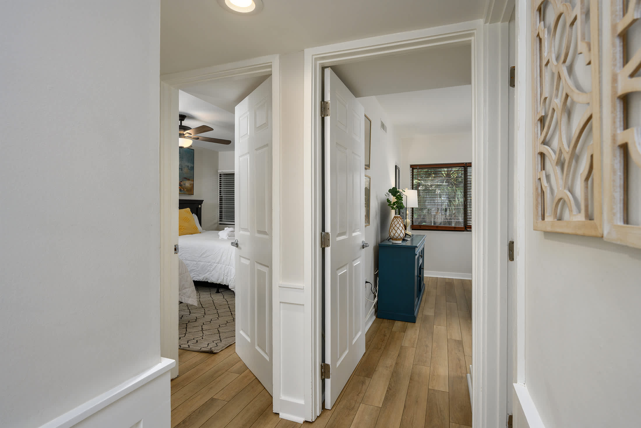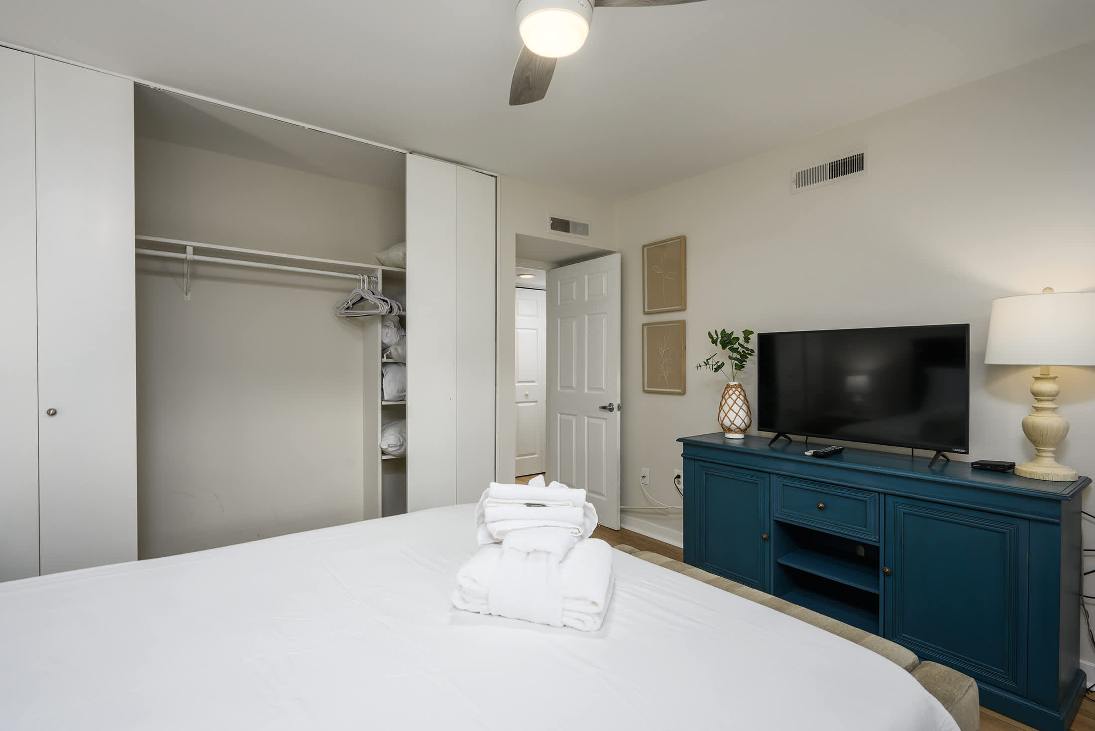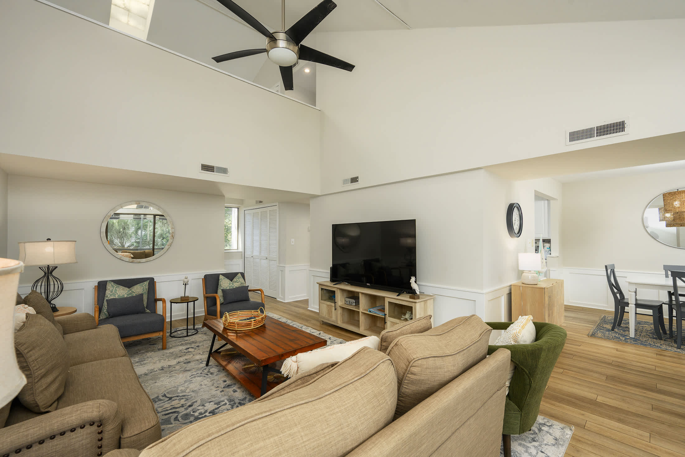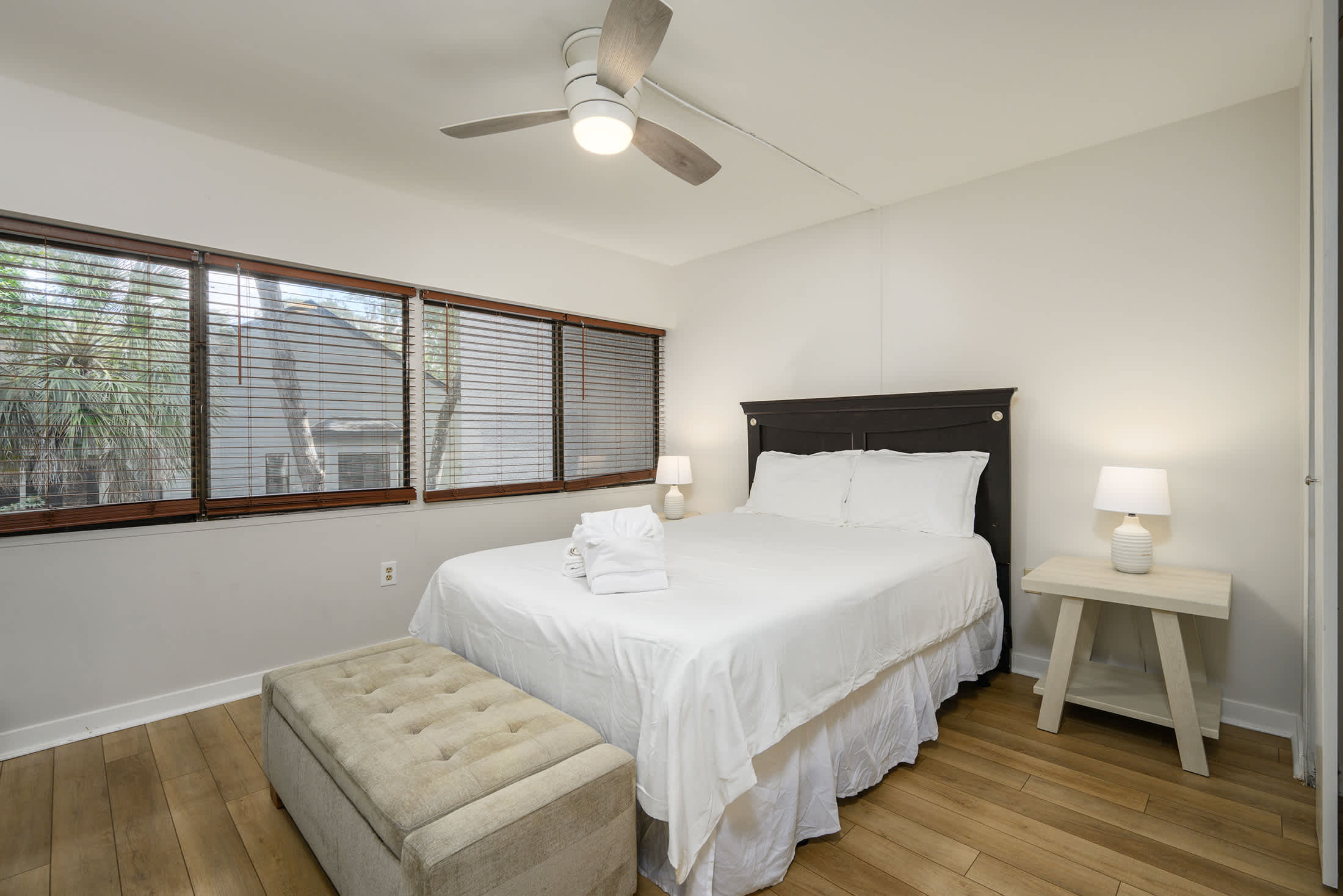 On the second level, gather for movies or board games, enjoy meals together, and step out to the outdoor seating to relax in the island air. Each bedroom features a Smart TV, and there’s a laptop-friendly workspace if you need to check in with the office. When it’s time to cool off, head to the community outdoor pool. In-unit laundry makes longer stays a breeze, and on-site parking keeps arrivals simple.